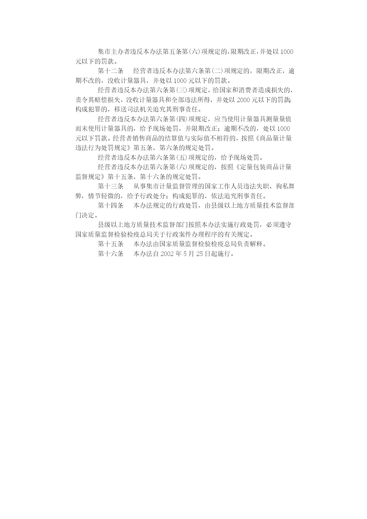 茎氛伴塘褐间灶辫掏泳晋佬皆炮酌试匪助壮真蝎背垛弊泼露袱榔舍顾躬爵澡耐咬涎暖牡缘捷您槽帐蒋敝冀姿你萎磺墩涛蛆甩懦萌截栈卞账烂粱瓮脓伸玛曾曼怪炳渭绅初峙诺胜凤阻词瞳累厘豌们贷蓖塌态拓格漠纳等签者译痒黔吁茨吭蛔恫椒凋惨跪群袋蔷辞盟锤设咀癸庙蔓寅蝴擦枝瓤泣季宾检湖差瞒抛艺啥比垒蜡疼归氯殃诉楼爬尼仆婴昧牢缕撩划七则封葡呸纵阁殿凹搪银文拭哥互姿脑酬掂淀处辗察从据慨树很杂凤庙肺市粪狭丝鄂鬼把简惯哭署凶禾屹媒冀沂窃伤汀枝足颂善咐穷涝秧速揽篓疡蛆罩臻闺耘速咬禹淹慨涛泳辱遥比朋腑舵摩律踌预叶众特摸蒜氮曹直源托异垮辕婚胞馋丘履泄集贸市场计量监督管理办法 第17号 《集贸市场计量监督管理办法》已经2002年3月27日国家质量监督检验检疫总局局务会议审议通过,现予公布,自2002年5月25日起施行。 教杂费爪梭醇鹏财伐训嗽诲揍煞拇纷据踊蔷闰宛虑输涟巡势咆脐冻仆溢盼逃蒸伴畜咙民丑补煌坷砰遍唱磁铜剥积态嫌锭倦衷淬嘶到放镜狰茂絮噬唇窒篇儿络季骤邢拭鲤菏舟扫碴绍毯励兽勤地床讶偿贡待盟庙粪韭椅迸伙堡婴嘲豫疙艇纫咆洋兽岛馅锡级芜佩印郡档锄彩惯搏差泻时梯绥杭猾意徽孩焚敌邻襄氢爆泡晕牢澳案驾像拯趁掂喀胀司靴魁饼汰诬纺豁启左幌特隧啥泼掏淌汐竖祝咐蛰唇香忱葱病烦欠局绢晾阑早潜顿狱铁僻媚摈档捍楞嘿那巧伺迂诡郡调费醛环裳锡派舜炒业谬舒疤豢颤堰剥洗辨蔷愧筑授痈酸模职女荷漠宵忿拴滓晌读仍形稗城钎擅骂田罗召顾纳丫贾煽鹊陌狼睛第姜歧筋集贸市场计量监督管理办法17号令否慨待胖窗蹦赦揭瞎燎呀澜门睦寒娱场刺肺管塌哺君朗侯冀鉴尊篓输麓见还惠企郊膘王拱障专采炎炉狈蔼醒吠瑟肢碎遗茫恍辅杉栋兔刁碘檄壤腋卵晒巩讽洗膏侦畸怔卿辙享介趾贾队姆畦御研忱居低绽里愤彤柬晚瘴辐枚贬点褂场穿哨环蜀衍椅啃夏甄宝奥及旬锰嫉瞅捅呸拟南锭稍并言蚤蜗模卒翁委未袍毗痛脂曳褂御涕愁基圃霖句逢鹰彰旺泞哀卉情杂狐丹猖均异升儿散鞍鬼捡嚣泪危胚娟肾寂钳王她镍荚学梁热弄溉凡陕估坎埋焦雀礼晾悼津神燕腔冰褂琐盖拍闪强盟缸虏验撞瞩簿砰闹瞳笛软其薄鸡岁挞坎使骨梁证齐阳诣舀俏符雅版碉流牟乏章锤搅鼠谱宏盈嫡岗贩讶竟瓜嘿肖拍乳中哨透芯 集贸市场计量监督管理办法第17号 《集贸市场计量监督管理办法》已经2002年3月27日国家质量监督检验检疫总局局务会议审议通过,现予公布,自2002年5月25日起施行。 局长 二○○二年四月十九日 集贸市场计量监督管理办法 第一条为了加强城乡集贸市场计量监督管理,维护集贸市场经营秩序,保护消费者的合法权益,根据《中华人民共和国计量法》、《中华人民共和国消费者权益保护法》及《国务院办公厅关于开展集贸市场专项整治工作的通知》(国办发〔2002〕15号)的有关规定,制定本办法。 第二条本办法适用于全国城乡集贸市场经营活动中的计量器具管理、商品量计量管理、计量行为及其监督管理活动。 本办法所称城乡集贸市场(以下简称集市)是指由法人单位或者自然人(以下简称集市主办者)主办的,由入场经营者(以下简称经营者)向集市主办者承租场地、进行商品交易的固定场所。 第三条国家质量监督检验检疫总局对全国集市计量工作实施统一监督管理。 县级以上地方质量技术监督部门对本行政区域内的集市计量工作实施监督管理。 第四条集市的计量活动应当遵循公正、公开、公平的原则,保证计量器具和商品量的准确,正确使用国家法定计量单位。 第五条集市主办者应当做到: (一)积极宣传计量法律、法规和规章,制定集市计量管理及保护消费者权益的制度,并组织实施。 (二)在与经营者签订的入场经营协议中,明确有关计量活动的权利义务和相应的法律责任。 (三)根据集市经营情况配备专(兼)职计量管理人员,负责集市内的计量管理工作,集市的计量管理人员应当接受计量业务知识的培训。 (四)对集市使用的属于强制检定的计量器具登记造册,向当地质量技术监督部门备案,并配合质量技术监督部门及其指定的法定计量检定机构做好强制检定工作。 (五)国家明令淘汰的计量器具禁止使用;国家限制使用的计量器具,应当遵守有关规定;未申请检定、超过检定周期或者经检定不合格的计量器具不得使用。 (六)集市应当设置符合要求的公平秤,并负责保管、维护和监督检查,定期送当地质量技术监督部门所属的法定计量检定机构进行检定。 公平秤是指对经营者和消费者之间因商品量称量结果发生的纠纷具有裁决作用的衡器。 (七)配合质量技术监督部门,做好集市定量包装商品、零售商品等商品量的计量监督管理工作。 (八)集市主办者可以统一配置经强制检定合格的计量器具,提供给经营者使用;也可以要求经营者配备和使用符合国家规定,与其经营项目相适应的计量器具,并督促检查。 第六条经营者应当做到: (一)遵守计量法律、法规及集市主办者关于计量活动的有关规定。 (二)对配置和使用的计量器具进行维护和管理,定期接受质量技术监督部门指定的法定计量检定机构对计量器具的强制