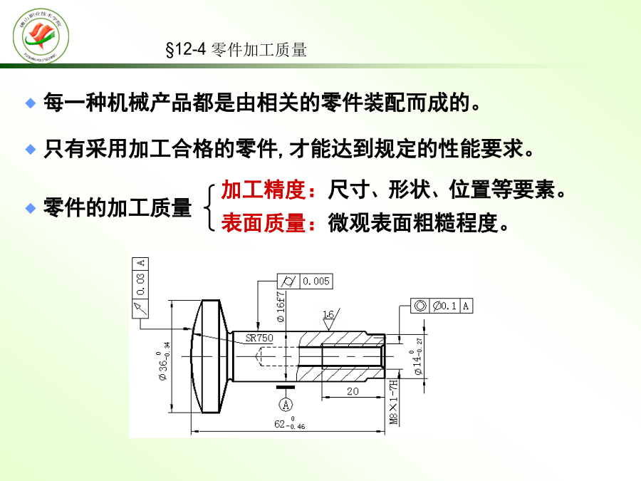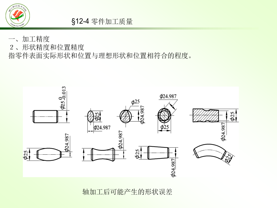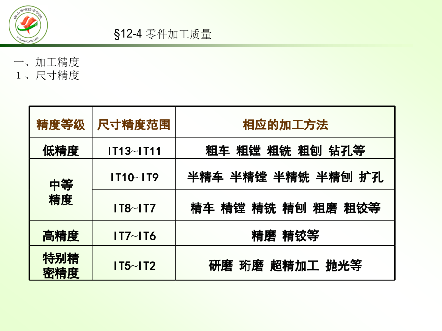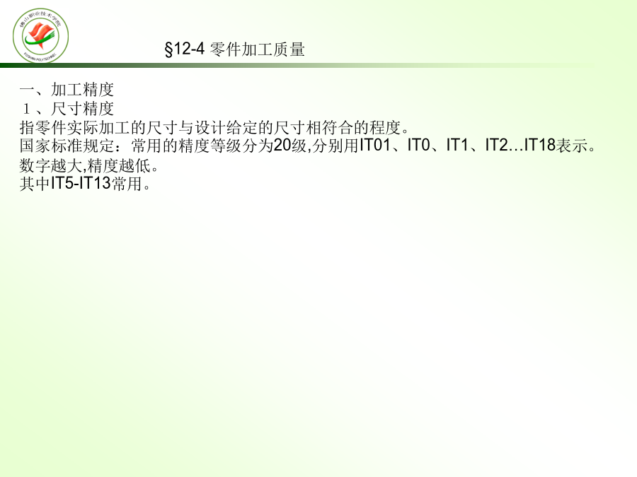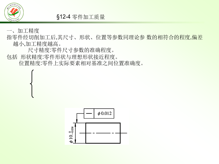 §12-4零件加工质量§12-4零件加工质量§12-4零件加工质量精度等级一、加工精度 2、形状精度和位置精度 指零件表面实际形状和位置与理想形状和位置相符合的程度。一、加工精度 2、形状精度和位置精度一、加工精度 2、形状精度和位置精度 形位公差等级分为1~12级,1级最高。 如果一般机床加工时能保证形位公差要求,则在图样上不必标出,一般也不检查。 选择形位公差时,在满足零件功能要求的条件下,应考虑选择最经济的等级。二、表面粗糙度 零件微观表面高低不平的程度。 产生的原因: 切削时刀具与工件相对运动产生的磨擦。 机床、刀具和工件在加工时的振动。 切削时从零件表面撕裂的切屑产生的痕迹。 加工时零件表面发生塑性变形。二、表面粗糙度 1、表面粗糙度的评定参数 常用的是轮廓算术平均偏差Ra二、表面粗糙度 2、表面粗糙度的标注方法 用去除材料的方法获得的表面。(车、铣、刨、磨) 用不去除材料的方法获得的表面。(铸件、锻件、型材)三、各种加工方法与精度等级、表面粗糙度的关系§12-5金属切削机床的分类与型号§12-5金属切削机床的分类与型号§12-5金属切削机床的分类与型号§12-5金属切削机床的分类与型号§12-5金属切削机床的分类与型号二、机床型号的编制方法 1、机床的类别代号 用该类机床名称汉语拼音的第一个字母(大写)表示。二、机床型号的编制方法 2、机床的特性代号 用汉语拼音字母表示。 ①通用特性代号:在类别代号之后加上相应的特性代号。 ②结构特性代号:为了区别主参数相同而结构不同的机床。二、机床型号的编制方法 3、机床的组别、系别代号 用两为阿拉伯数字表示,前一位表示组别,后一位表示系别。 每类机床分10组(从0~9组),每组又分10系(从0~9型)。二、机床型号的编制方法 3、机床的组别、系别代号组别 类别二、机床型号的编制方法 4、机床主参数和第二主参数 用阿拉伯数字表示,常用折算值(1/10or1/100or1/1)来表示。 ①机床主参数:代表机床规格的大小。 ②第二主参数:指主轴数、最大跨距、最大工件长度、工作台工作面长度等。常用机床主参数和第二主参数二、机床型号的编制方法 5、机床重大改进序号 用字母“A、B、C…”表示,附机床型号末尾,以示区别。XQ6125B