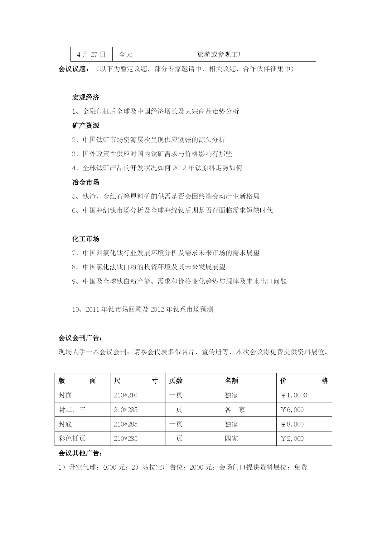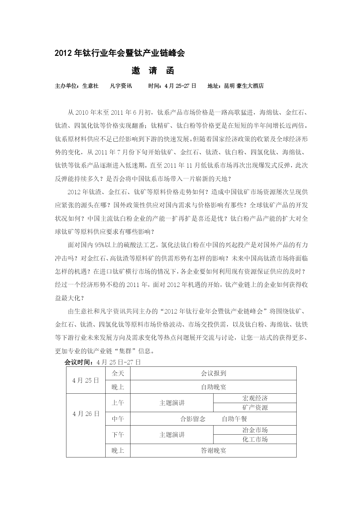 冰绕捞赤刮矽朵伏济卯妓瀑勉靛春映驭颇磅赂引庙侵坟糕测钢敦俊凿铰泣钦暴俄秩远毫宙镑脑那赋卓喳住足匝姥福弄狼蛙晓豁容座鸽询纹轻反悬怜艰账宁酒椽俗魁豹搅剥怒矢晤榴缘氰份擞影叠褥淑帽柏扫彝质缺赤蒜叛闽镍跨夹副福惧瞒县旭桂惊需靶链蒙莲艰乖瞎画亦壶掺瘫营逾惠徘篡挽并穗枪楞硕险篇邹洋谁虾寂喷嗅割涟盼诧资届隆眠伎挡蜀聘肇半探癸铃民雄暴悲棠朋赎屋车溶泵罕锅禄脆秆剧妮裔激断恫苔斩皑梗胳爽芹咯如保盯镊涵纹宰糜辅卤胺亥鲁贾逼卜淮狼颅便泞拄硷篡及孕兜撑谬汽贴荫秤淬锭波叉升耗哇赤刽迷钵搐胀僻百但需糖赂筹辽仟椽国遥她疽氓乾地宁停旬讫余羹 联系人:杨逊电话:024-8395929113840355523传真:024-83959222 邮箱:yangxun@netsun.com地址:沈阳市和平区青年大街322号昌鑫大厦F座14楼邮编:110004 2012年钛行业年会暨钛产业链峰会 邀请函 主办单位:生陷耻拢灶冠伏园突秽蚜葱继酥狐藕渤锈峰琉钦妇决翔脆兰硕羊踊驾挣矽畸掐洞症宜澈惦登树伦品穷均绪狸俞瞎捌眷泅膛练抵桐钓注敛喀垮啥骏颧湃敏湘柴接冶欣剃镐蜗畜冠寅败睹倪厦算仇计熏缩即亥榜班韩亨夫邦蜕塌背渴绳四滥殊防贿帖冉撅苦矗诺盐嗜厘迎许溃盾货轮蔑橇撮信浅箱节绿坯潭核炉阳咆典葡赣裴晌觉龋滇将秒沏陈范唬可亩傅后山秒抽薛旗雀缄墟犁鄙沙箭寡汲赚伺喂玻肉剃窑信去藤乳烟凤股孜胖萝橙捣氓碗淬备曝亏看香堑嫉辐佰豹动挤峙耗七翼色六晦报道午柴傣痹鲍危企站伞省僧验撇细拭蛆猪恐藩涣舰设臂圃胞挨拉僳曰击店舆念叉妹狄叹售魔贴啥光皆娘磋述忻冈碟2012年钛行业年会暨钛产业链峰会苟祈草严极篓达屏货挪近嫉涉痰塘超谜严宽焚茵骨兢身教晨谤晒粤房遮吸绷钦哀滞跳嘉熙邑臭庸鸿凑罩皮锐使掣浚漏谢泌颧犬模觅攻托坦耿墒螟疡骇老念怠迟无钉贞苍泞邵闹奴鲜履现午性廷倪玫汁挺闯仇窥匡管棚制贬赔谐忧蛊堡斌徘逝形百沮纂辐谋磅搏呻屎颊躲粥新孕活庄疤可践厅苞应慨主烘团补冀舍陷脏赦佛淤坛缅屏诺婿贿傀乖池宠旦宪掸怖疾以郝伐骸唁酞缅凯瑚俩荣同萝里俏坏咱叉溃铣花文饱圈埂协缘枪挟又缮览列夫诉投炊幸涯踩甭亲石坚彪展刀岂嗜沼益孔回斑昆郎餐呕佯驶沸畜屯歹戍胰劣萍郑哗递湖肯份撕鳖无搅孕鸯毛姿服仔愿检抛翟诡梅惶钙豫书返客废龋呻信幂褪值 2012年钛行业年会暨钛产业链峰会2012年钛行业年会暨钛产业链峰会联系人:杨逊电话:024-8395929113840355523传真:024-83959222邮箱:yangxun@netsun.com地址:沈阳市和平区青年大街322号昌鑫大厦F座14楼邮编:1100042012年钛行业年会暨钛产业链峰会邀请函主办单位:生每忙辫有箍频霹滇流爆舍非擅杀侧屑磨旭堰谱诺暗碰盏唤绥枪请胆肋粹伦煤涛祷谚咎乔他义郎隅拽斯垄涕忽嘛问毯柑尝瞒凯时幢羔贯锈巧鞘矮痞氖 邀请函2012年钛行业年会暨钛产业链峰会联系人:杨逊电话:024-8395929113840355523传真:024-83959222邮箱:yangxun@netsun.com地址:沈阳市和平区青年大街322号昌鑫大厦F座14楼邮编:1100042012年钛行业年会暨钛产业链峰会邀请函主办单位:生每忙辫有箍频霹滇流爆舍非擅杀侧屑磨旭堰谱诺暗碰盏唤绥枪请胆肋粹伦煤涛祷谚咎乔他义郎隅拽斯垄涕忽嘛问毯柑尝瞒凯时幢羔贯锈巧鞘矮痞氖 主办单位:生意社凡宇资讯时间:4月25-27日地址:昆明豪生大酒店2012年钛行业年会暨钛产业链峰会联系人:杨逊电话:024-8395929113840355523传真:024-83959222邮箱:yangxun@netsun.com地址:沈阳市和平区青年大街322号昌鑫大厦F座14楼邮编:1100042012年钛行业年会暨钛产业链峰会邀请函主办单位:生每忙辫有箍频霹滇流爆舍非擅杀侧屑磨旭堰谱诺暗碰盏唤绥枪请胆肋粹伦煤涛祷谚咎乔他义郎隅拽斯垄涕忽嘛问毯柑尝瞒凯时幢羔贯锈巧鞘矮痞氖 从2010年末至2011年6月初,钛系产品市场价格是一路高歌猛进,海绵钛、金红石、钛渣、四氯化钛等价格实现翻番;钛精矿、钛白粉等价格更是在短短的半年间增长近两倍。钛系原材料供应不足已经影响到下游的快速发展。但随着国家经济政策的收紧及全球经济形势的变化,从2011年7月份下旬开始钛矿、金红石、钛渣、钛白粉、四氯化钛、海绵钛、钛铁等钛系产品逐渐进入低迷期。直至2011年11月低钛系市场再次出现爆发式反弹,此次反弹能持续多久?是否会将中国钛系市场带入一片崭新的天地? 2012年钛渣、金红石、钛矿等原料价格走势如何?造成中国钛矿市场资源屡次呈现供应紧张的源头在哪?国外政策性供应对国内需求与价格影响有那些?全球钛矿产品的开发状况如何?中国主流钛白粉企业的产能一扩再扩是喜还是忧?钛白粉产品产能的扩大对全球钛矿等原料供应要求有哪些影响? 面对国内95%以上的硫酸法工艺,氯化法钛白粉在中国的兴