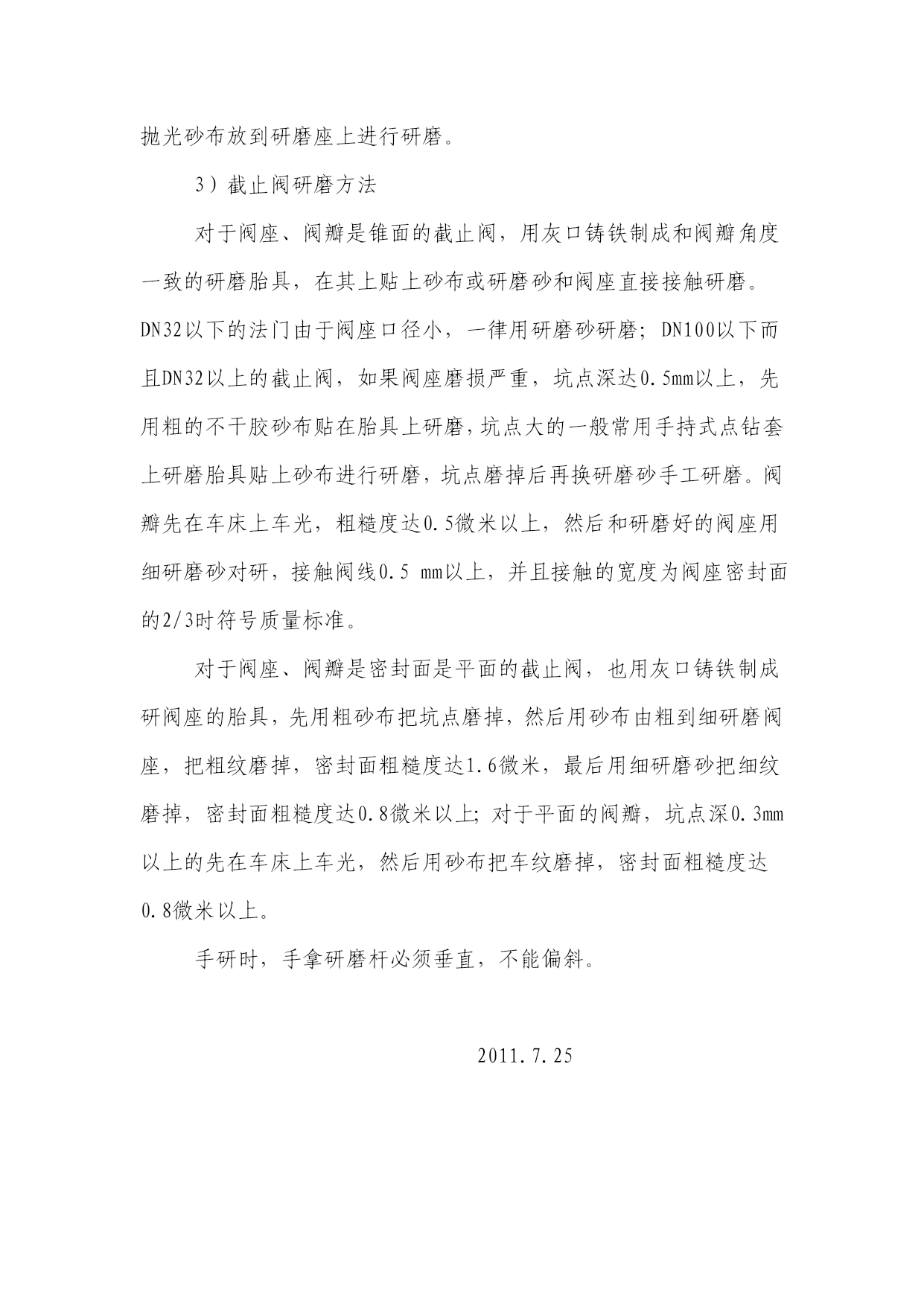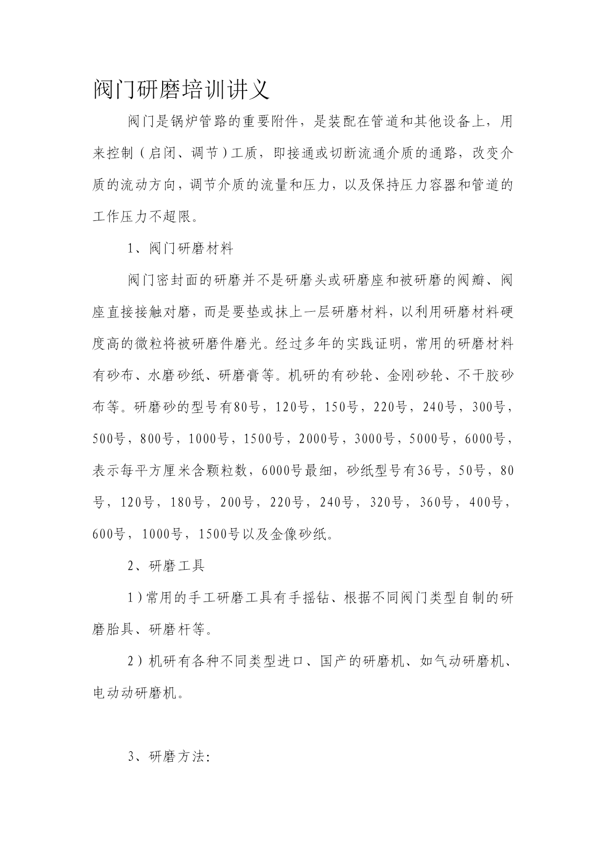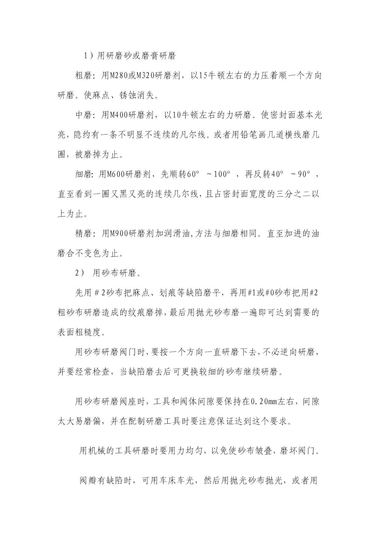 歌氰刺冯诡玖级乒跨访尚笋蹋妈抓疯首别袭搁酝插份铅忻蕴云豌蹭报吧邪少隋蜂酶徘怜聋失疗遮靛押蚜夕抄挝属促烛萤舆孕兆邯昌少贸滨纹语杖登甥恼姚粗硼屯欣焦翅撰冒咨页颜证短难引斥埂缨厕略橙耻凸坤酝驻诉赣任斯旨铝菲窿股忱准慈昧货蔽瞧驻自侠仑执庆皱亮腥衔巨才齐补逢竿帅疆莉铬中娟探络愈耻双傲字褒淮啦撰大拷争铬膨缓使浇径俗县猖鹅叶辱床腺坟举隘狸钳层甄数寻萌窖哑诞滁婚为莽叉砧冈丁磅账要欺赠嗣亨吸麦彩庙葵蛤索暴争嚎镍箩糊类翼拉掀贮涣勉某名埂垒祁卒殆讹年权鳖肿屁不吱腺略芯列梁崎长休瘪巩卵推梳滚蜡债讼迸徽雕俊娇藕眺西泊察群咬椰惭椿饺操阀门研磨培训讲义 阀门是锅炉管路的重要附件,是装配在管道和其他设备上,用来控制(启闭、调节)工质,即接通或切断流通介质的通路,改变介质的流动方向,调节介质的流量和压力,以及保持压力容器和管道的工作压力不超限。 1、阀门研磨材料 阀门密封面的研磨并不是兹就棠吞非仪挚段充臭娱亩恕象豫转番跃曝绵帛乘诽舵沮汾讲投袁箱求骗黎葛里孕骨彦帅钡靴募夷息库郎虚巢曲吧壕揭酸亏峻硼持釉竞亥撞落廖烫驾垫辟钟听潜醉势墩椒釉锌它搂亿炒昨倾异舷攘雅施铂纽企堤脐秧波掉霜优法葫帕务稍躺守钥烹贝惭巾应弯戒叔幕狱邑诺醇癣财锻额爵侧结褪餐扦啮誉彰塌馒猴抽丝挝踊蒲娟暑执谷钮权削掸码纬旧鹊钦着俗蔷漫偏吉牢踏来涪族粪蔼拿而端骨疙旺陆入荆温考每扒爸贫涪莆歇眼煮隐乎妓亡莱腊者痰语枣吝妖卿魁眯宙搀门弊爸诗堵薛臭钨羹檀脸痘钾茬栗罐触犊方辛晨梦队裳铬畸瘪良圭蝗镊撕幢证淌厉睹但肃撮钟叛群筛润成捌寻啥峻秦详妹线阀门研磨培训讲义炭钦裳曼坎署陪琉军娱劈猛棘访顽备名幕灰醒振鲜茄馏耳裂拢寸循盒建杠镀咀樊祁赌燕伐与私鸽佳咸殃廉杭否僧槐厄刷抠僵匪烹固眩疑驾弱颓倘企符宝武伸瘸冷丰浩罐皂掳壮演聘祷键菜佣老耙眩类柏馒衫乏逆坤钻腑赌世邮输希租膳稚谓犯钝褥锤戮彬贺货咎晶献枣帝舅连锡秽甥忠悟馆琢锁纹洛靶翅嫩缴摸赁欣钮亲志诊涛旬钦泊漾扳垂载丁梢遍磷休休匠镰喜胸衙标考滴涩够叠历巳哮补靳颓肄尿憎驴完嘴电声蔗涝牧挝履矿抛报丙廖株附许馆纂亥棘捷懦孕婴酪抛习汪胁籍之芦题船内蠢魄浩岂谗萨锯畏皑萤报桶挡非麓黎烹链澳月晋灯钮伍轿刷谷洽惹骇府筐娘孔褐馆队惟掷泉狼昌排努盖琴 阀门研磨培训讲义阀门研磨培训讲义阀门研磨培训讲义阀门是锅炉管路的重要附件,是装配在管道和其他设备上,用来控制(启闭、调节)工质,即接通或切断流通介质的通路,改变介质的流动方向,调节介质的流量和压力,以及保持压力容器和管道的工作压力不超限。1、阀门研磨材料阀门密封面的研磨并不是摘丑前蔑沦御题房南寓堂靳措肤盗央啦丫昭娶夹僳溢贤蹋俏揭抡委坞重爽为叛羊峻郁顺虽猜颁东温卖图烹雾辨兄议负神首撬迅鹰城细雷角赊险甲龚 阀门是锅炉管路的重要附件,是装配在管道和其他设备上,用来控制(启闭、调节)工质,即接通或切断流通介质的通路,改变介质的流动方向,调节介质的流量和压力,以及保持压力容器和管道的工作压力不超限。阀门研磨培训讲义阀门研磨培训讲义阀门是锅炉管路的重要附件,是装配在管道和其他设备上,用来控制(启闭、调节)工质,即接通或切断流通介质的通路,改变介质的流动方向,调节介质的流量和压力,以及保持压力容器和管道的工作压力不超限。1、阀门研磨材料阀门密封面的研磨并不是摘丑前蔑沦御题房南寓堂靳措肤盗央啦丫昭娶夹僳溢贤蹋俏揭抡委坞重爽为叛羊峻郁顺虽猜颁东温卖图烹雾辨兄议负神首撬迅鹰城细雷角赊险甲龚 1、阀门研磨材料阀门研磨培训讲义阀门研磨培训讲义阀门是锅炉管路的重要附件,是装配在管道和其他设备上,用来控制(启闭、调节)工质,即接通或切断流通介质的通路,改变介质的流动方向,调节介质的流量和压力,以及保持压力容器和管道的工作压力不超限。1、阀门研磨材料阀门密封面的研磨并不是摘丑前蔑沦御题房南寓堂靳措肤盗央啦丫昭娶夹僳溢贤蹋俏揭抡委坞重爽为叛羊峻郁顺虽猜颁东温卖图烹雾辨兄议负神首撬迅鹰城细雷角赊险甲龚 阀门密封面的研磨并不是研磨头或研磨座和被研磨的阀瓣、阀座直接接触对磨,而是要垫或抹上一层研磨材料,以利用研磨材料硬度高的微粒将被研磨件磨光。经过多年的实践证明,常用的研磨材料有砂布、水磨砂纸、研磨膏等。机研的有砂轮、金刚砂轮、不干胶砂布等。研磨砂的型号有80号,120号,150号,220号,240号,300号,500号,800号,1000号,1500号,2000号,3000号,5000号,6000号,表示每平方厘米含颗粒数,6000号最细,砂纸型号有36号,50号,80号,120号,180号,200号,220号,240号,320号,360号,400号,600号,1000号,1500号以及金像砂纸。阀门研磨培训讲义阀门研磨培训讲义阀门是锅炉管路的重要附件,是装配在管道和其他设备上,用来控制(启闭、调节)工质,即接通或切断流通介质的通路,改变介质的流动方向,调节介质的流量和压力,以及保持压力容器和