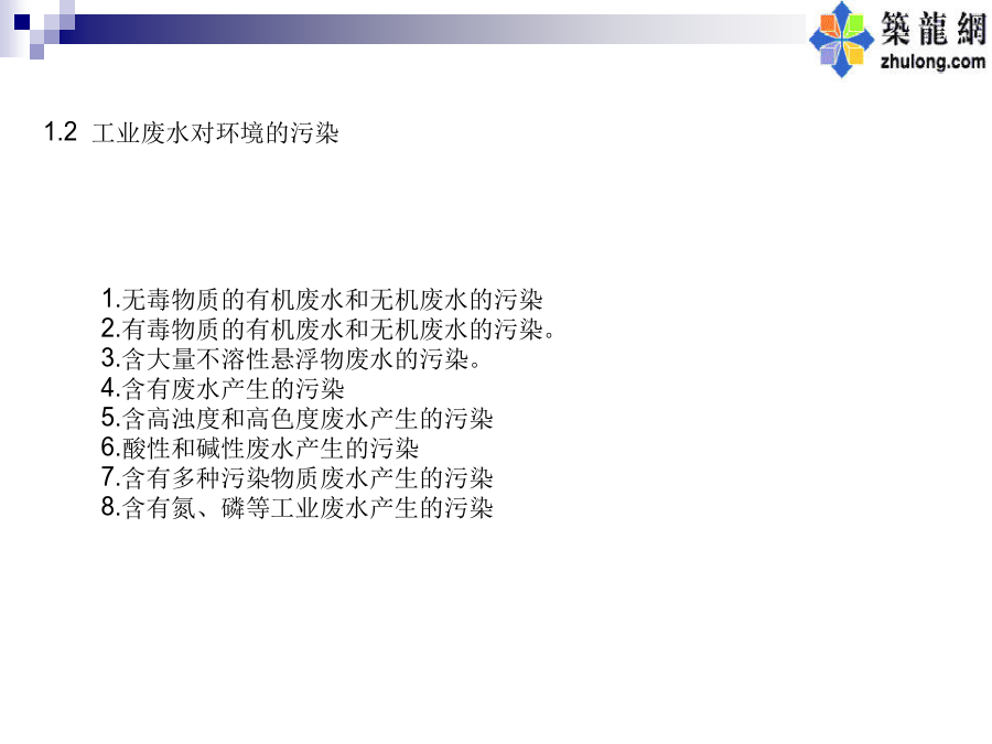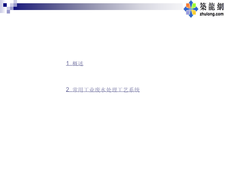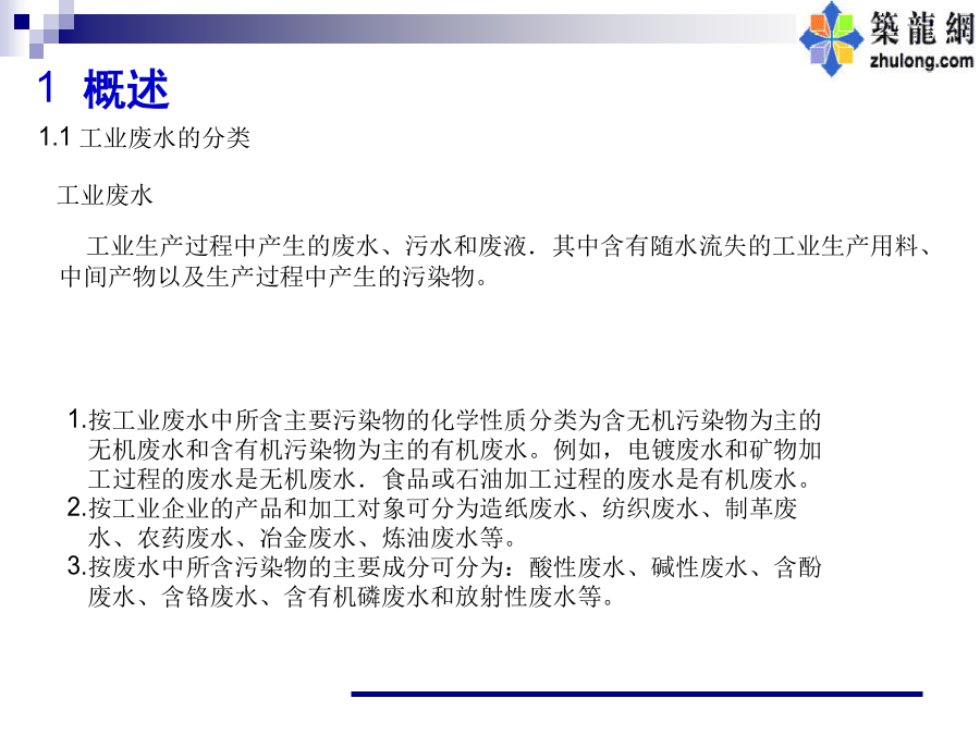 工业废水处理的工艺系统1概述此外也有从废水处理的难易度和废水的危害性出发,将废水中主要污染物归纳为三类: 第一类为废热,主要来自冷却水,冷却水可以回用; 第二类为常规污染物,即无明显毒性而又易于生物降解的物质,包括 生物可降解的有机物,可作为生物营养素的化合物,以及悬 浮固体等; 第三类为有毒污染物,即含有毒性而又不易生物降解的物质,包括重 金属、有毒化合物和不易被生物降解的有机化合物等。 实际上,一种工业可以排出几种不同性质的废水,而一种废水又会有不同的污染物和不同的污染效应。例如染料工厂既排出酸性废水,又排出碱性废水。纺织印染废水,由于织物和染料的不同,其中的污染物和污染效应就会有很大差别。即便是一套生产装置排出的废水,也可能同时含有几种污染物。如炼油厂的蒸馏、裂化、焦化、叠合等装置的塔顶油品蒸气凝结水中,含有酚、油、硫化物。在不同的工业企业,虽然产品、原料和加工过程截然不同,也可能排出性质类似的废水。如炼油厂、化工厂和炼焦煤气厂等,可能均有含油、含酚废水排出。1.3控制工业污染源的基本途径1.4废水处理方法及选择三、容积计算离心分离3.压力式旋流分离机 用于分离比重较大的悬浮物,设备由钢板制成,上部为直径D的园筒,下部为锥形体,污水沿着设备切线方向进入,在离心力作用下,水中悬浮物被甩向四周,并在重力作用下,下沉至底部排走。 分析: 1段:水流的水平速度沿半径增大,在四周处最大,颗粒在离心力作用 下,甩向四周,此区为加速区。 2段:水平速度沿半径增大后减小,在1/2R处,V最大,分离出的颗 粒沿四周下滑,此区为分离区。 3段:水平速度为零,颗粒在重力作用 下沉淀浓缩,此区为沉淀区。 优点:体积小,单位容积处理能力高, 用料少易安装。 缺点:四壁易磨损,需动力。其中:m、m0-分别为颗粒和污水的质量。 v-旋转圆周或速度。 r-旋转半径。 n-转速。过滤三、滤池3.截留杂质规律 从接触絮凝作用考虑,杂质与滤料接触,被滤料表面分子间力吸附絮凝,同时水力冲刷可使絮凝杂质脱落向下层移动,被下层滤料截留。 在过滤周期将终止时,表层滤料最细,吸附表面张力最大,截留的杂质最多,表层孔隙逐渐被杂质阻塞,尽管下层滤料还未发挥应有作用,但周期已终止,导致出现双层滤料,表层的滤料粒径大一些,截留的杂质多一些。 4.构造-污水滤料和给水滤料有许多相同之处,与给水滤料的不同之处如下: (1)滤料粒径大,强度高,耐腐蚀,成本低。 (2)抗冲击性负荷,出现双层滤料。 (3)运行周期长。 (4)运行方式分为正向流和反向流。四、电化学滤料滤池3.腐蚀电化学反应,在它的表面有电流流动,由于腐蚀原电池的作用,在电位较低的铁阳极上,金属铁失去电子变成铁离子进入溶液,电子流向阴极,在碳阴极附近,流来的电子被溶液中能够吸收电子的物质所接受,生成以氢氧根形式出现的阴离子,中和金属离子,形成一种内部电解反应。电极反应阴极新生成的H2能与污水中的许多污染组份发生氧化还原作用,阳极生成的Fe2+是良好的絮凝剂,能够捕集、裹挟污水中的污染物共沉。 4.应用——采用铁屑和活性炭组成电池,由于电极电位不同,形成一组短路的电池,铁阳极失去电子生成Fe2+进入水中,电子流向阴极,在炭表面H+得到电子还原成H2,水中Fe2+与OH-结合形成Fe(OH)2絮凝体,电池不断反应,滤池强化工作作用。 5.例如,将铁屑和碳粒浸没在ξ—电位为30mv的污水溶液中,铁屑和碳粒的电位差为1.2伏,粒料间的分离距离为0.1cm,可以得到5×10-3cm/s的分离速度,从理论上计算20s就完成沉积过程。 6.特点:1)具有普通滤池的功能,2)具有原电池的电化学反应。3)起到电解反应的电氧化和电絮凝。 可截留污水中微小的悬浮颗粒,滤布采用尼龙布和金属网,孔隙小于100μ,悬浮物去除率75-90%,滤后水中悬浮物小于5mg/L。化学沉淀法1、同名离子效应-当沉淀溶解平衡后,如果向溶液中加入含有某一离子的试剂,则沉淀溶解度减少向沉淀方向移动 2、盐效应-在有强电解质存在状况下,溶解度随强电解质浓度的增大而增加,反应向溶解方向转移。 3、酸效应-溶液的PH值可影响沉淀物的溶解度,称为酸效应。 4、络合效应-若溶液中存在可能与离子生成可溶性络合物的络合剂,则反应向相方向进行,沉淀溶解,甚至不发生沉淀。 六.三种沉淀法由上式可知,金属离子在水中溶解度与LMS和PH值有关2.氢氧化物沉淀法:(3)将重金属离子的溶解度与PH值关系绘成曲线,从曲线中可以得 到,重金属离子的浓度值。 应用-采用氢氧化法处理污水,PH值是一个重要因素,处理污水 中的Fe2+离子时,PH值大于9则可完全沉淀,而处理污水中AL3+ 离子时,PH值严格为5.5,否则AL(OH)沉淀物又会溶解。 (4)如用氢氧化物沉淀法处理含镉废水,一般pH值应