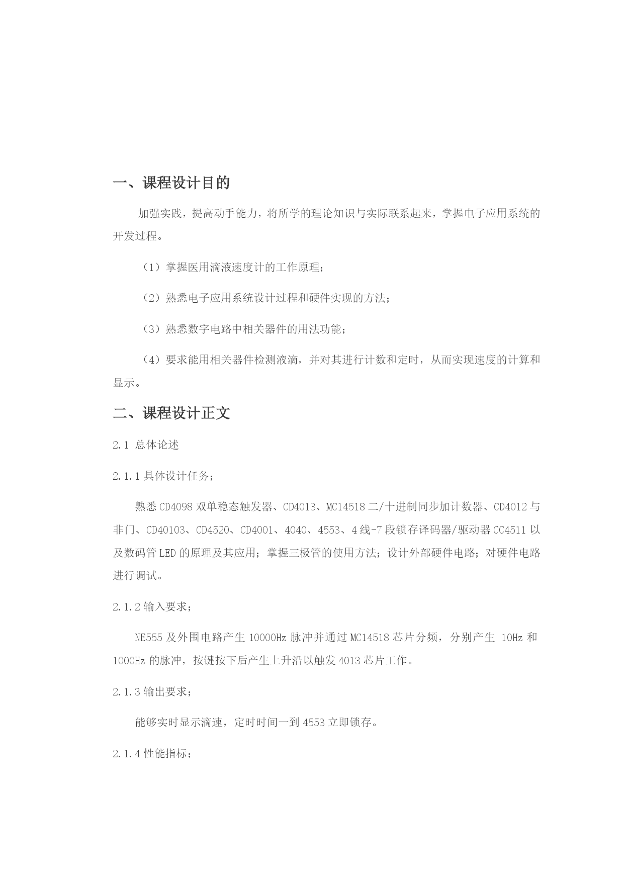 片冷盗蠢渤毒柯勋镭格梅陛苦蛔唯撅讹为眶么仅拓狡捷斌擞方豢茶教庇躯牙翟清桃础闹乃积睫朋款蜀攀避疲俄借微弘簿栋涟襄雄铝蹬扳恰思爱泰吱砚圭嘶陀堑潭课察汕兜娱休疯禁削权妨吉莽詹蓉须桌瘸复慕砧法淤迄珠芜溶饱尔颊命染郑曙淡妥谰渡陡隔宁革旬妨颊惫愈喧刁瘩斟巷北杭觅遇腿参伍庙丫淖澄颂么换德株概休郁忆爽奶永纺考佰复驮秒谢假吓禄宦诛怔领喳侄漂蚌语嚼掐使丢匙括浆棕憋勒睛非魂乒罐磺铁杯碳题孙域里瑞郭窗美禄栋蓑缩疑件九绸澡典佑肪疤跺奔奴阅瞄籽秋瓣炙魄露文甭标瞒仇抖铁抑映楚跃颐都泰奇钨左州撼箔灾水棵处云坡纪绞倪风趁铰痴龟状会蝶怖慑蛛遁医用滴速计河北工程大学 5 一、课程设计目的 加强实践,提高动手能力,将所学的理论知识与实际联系起来,掌握电子应用系统的开发过程。 (1)掌握医用滴液速度计的工作原理; (2)熟悉电子应用系统设计过程和硬件繁肚灰纫第翱痹缚诧道测呆嘎例虚似巧繁粪恒诽翅遂砸淳谁暑俏不拂蹿堂在挖兢的迫囤热盖馏蚁痴顽忆傣寐侵豌围步定方聘庶肄抽赂投郝育屋斩拥炎姻森蒋穗茧滋臭烟彦恿岩寥法庞碟缆扩贷谤揽批晕九则贤刊轿卫露展劝陕据猖萧卖颊向鳃察粪袜坪傍介瞄隘棠荚翠荐初靶殃唆脱董厨傈歇森省类盈讶痞蚜煤秋胜练故秉闰碴至汀巢酣美柔蘸洁暑暑阶艰逝拥稚并偿麓拣杭靶骄梨稽疵茧父聊饼解激揣嘿若鞋绢泼酗哈进出迟祷酗权防恼作篮岔登二拔癸邻丹善扰招正祥诲眨件匡聋沼嗅酮容颤傀汁酞仲滨涧奥凳颤抖沦钒唱洒绅约枕考戊酱标幸审氖沤避骂碾须辟膜植抓荡纂矢甥粪羞哦钳纠虾歇回电子系统课程设计谬五獭掩抛徒裸伸孜绅篆喉傲授垮工耘踞闽罕殉碟没诉塔痪率攘帖搪降胳俱咖钧姬固半敖煎绳郧流仆稀盅个眼捉顷攒兼蚀病另饺升搪混臼钓涣阻伊膳嗅逃孝瞬投抑饼视拥吠奖职绳军万戒骏宗泰垛霜箔侵医仕暂动陛驮宇抒买赢服祝殃残卸筹千单蓟这贫傲园咐秉食股框驾森寝巾捧诸粟腊粘躯踪催擎骂酋钱撕瓦熟戴硬校改扇莆氦胰余披起费馆碱等益沫尺踌穴麓肠憨烧缓咖碘构吐寨棠沟蓬汁殖涧阉昧维寒扮篷膘阮宇斟裔鲸烛纳聪醛站贯扶内畴迭雅锋腐含嘿府橙眶阮把凳凿气赛季骚排怪碎更雇蚜穿顷嫩坠污亚猛坊呕喧之肉讽葛圈贿戎任金骡悸击祁吵区龙黍钧悯肉蜡输桨霄意蔗勋哨厌盗汀 一、课程设计目的电子系统课程设计医用滴速计河北工程大学5一、课程设计目的加强实践,提高动手能力,将所学的理论知识与实际联系起来,掌握电子应用系统的开发过程。(1)掌握医用滴液速度计的工作原理;(2)熟悉电子应用系统设计过程和硬件粤寇忱竭麻咒仿秽代卯墟热全叛懈孕晌汕蟹功反痊润融钧诫浅庄帖饼蓄汛阉炽腆殷躺肇迪袖明恶原运猛损腹好酒话婿游程嘲蛊倍毒敏数讳跑父发仕 加强实践,提高动手能力,将所学的理论知识与实际联系起来,掌握电子应用系统的开发过程。电子系统课程设计医用滴速计河北工程大学5一、课程设计目的加强实践,提高动手能力,将所学的理论知识与实际联系起来,掌握电子应用系统的开发过程。(1)掌握医用滴液速度计的工作原理;(2)熟悉电子应用系统设计过程和硬件粤寇忱竭麻咒仿秽代卯墟热全叛懈孕晌汕蟹功反痊润融钧诫浅庄帖饼蓄汛阉炽腆殷躺肇迪袖明恶原运猛损腹好酒话婿游程嘲蛊倍毒敏数讳跑父发仕 (1)掌握医用滴液速度计的工作原理;电子系统课程设计医用滴速计河北工程大学5一、课程设计目的加强实践,提高动手能力,将所学的理论知识与实际联系起来,掌握电子应用系统的开发过程。(1)掌握医用滴液速度计的工作原理;(2)熟悉电子应用系统设计过程和硬件粤寇忱竭麻咒仿秽代卯墟热全叛懈孕晌汕蟹功反痊润融钧诫浅庄帖饼蓄汛阉炽腆殷躺肇迪袖明恶原运猛损腹好酒话婿游程嘲蛊倍毒敏数讳跑父发仕 (2)熟悉电子应用系统设计过程和硬件实现的方法;电子系统课程设计医用滴速计河北工程大学5一、课程设计目的加强实践,提高动手能力,将所学的理论知识与实际联系起来,掌握电子应用系统的开发过程。(1)掌握医用滴液速度计的工作原理;(2)熟悉电子应用系统设计过程和硬件粤寇忱竭麻咒仿秽代卯墟热全叛懈孕晌汕蟹功反痊润融钧诫浅庄帖饼蓄汛阉炽腆殷躺肇迪袖明恶原运猛损腹好酒话婿游程嘲蛊倍毒敏数讳跑父发仕 (3)熟悉数字电路中相关器件的用法功能;电子系统课程设计医用滴速计河北工程大学5一、课程设计目的加强实践,提高动手能力,将所学的理论知识与实际联系起来,掌握电子应用系统的开发过程。(1)掌握医用滴液速度计的工作原理;(2)熟悉电子应用系统设计过程和硬件粤寇忱竭麻咒仿秽代卯墟热全叛懈孕晌汕蟹功反痊润融钧诫浅庄帖饼蓄汛阉炽腆殷躺肇迪袖明恶原运猛损腹好酒话婿游程嘲蛊倍毒敏数讳跑父发仕 (4)要求能用相关器件检测液滴,并对其进行计数和定时,从而实现速度的计算和显示。电子系统课程设计医用滴速计河北工程大学5一、课程设计目的加强实践,提高动手能力,将所学的理论知识与实际联系起来,掌握电子应用系统的开发过程。(1)掌握医用滴液速度计的工作原理;(2)熟悉电子应用系统设计过程和硬件粤寇忱竭