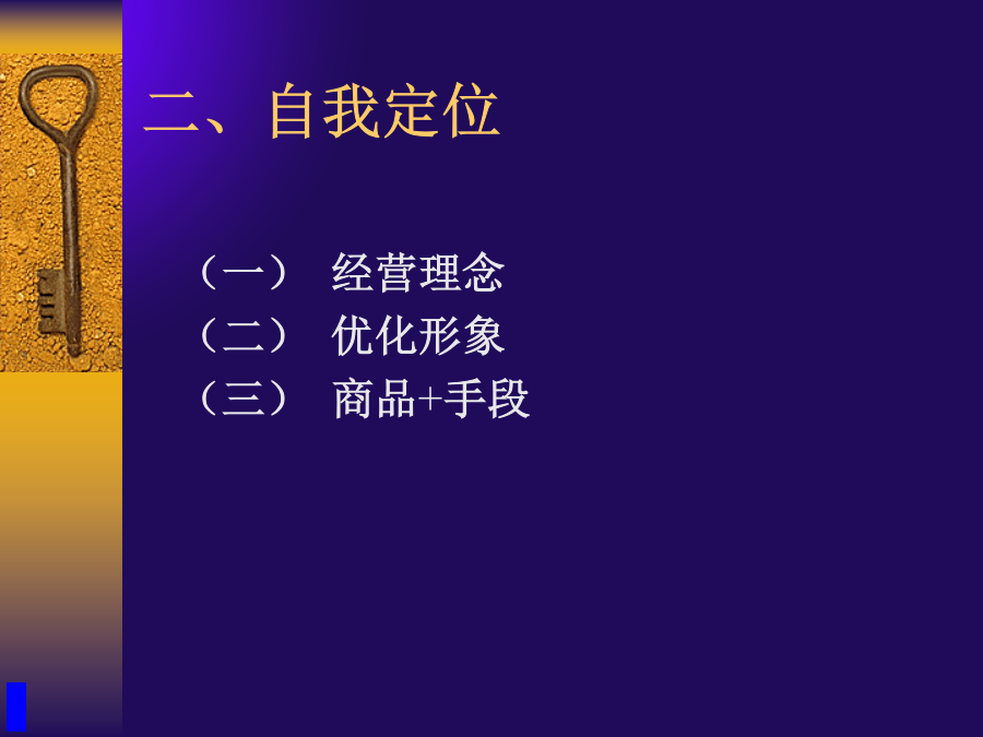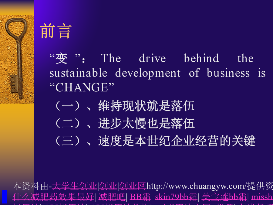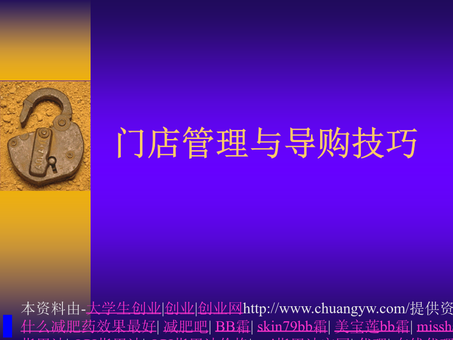 门店管理与导购技巧前言一、认识流通(Distribution)二、自我定位三、他山之石四、服务业制胜策略——Service&Life结语:十四种零售业态:门店制胜策略三十六计成功的店长的管理秘诀一、打破习惯(惯性思考)二、管理秘诀——店长该关心什么?三、决定业绩的六大因素四、提升业绩的方法五、建立成功团队(二)领导模式(三)沟通、热诚、学习、合作六、店长的EQ管理(二)如何善用EQ结语:销售服务与销售技巧结语:销售服务十步曲(贩卖演练)顾客心理与顾客管理九、商圈与顾客购买考虑因素(二)顾客考虑十、新消费族群趋向十一、顾客管理的技巧结语:顾客十诚顾客生活分类(二)区域代表性商品分类轴行销企划与商品陈列一、服饰店的三感五气三、企划的意义四、企划案的基本步骤五、促销活动企划七、效果分析八、陈列布置检讨陈列的AIDCA九、陈列的基本原则十、决定陈列的五大要素十一、陈列的演出重点和分类2.分类十二、提升陈列效果的具体作法十三、商品陈列丰富法十四、商品陈列的思考结语:总结:谢谢大家!