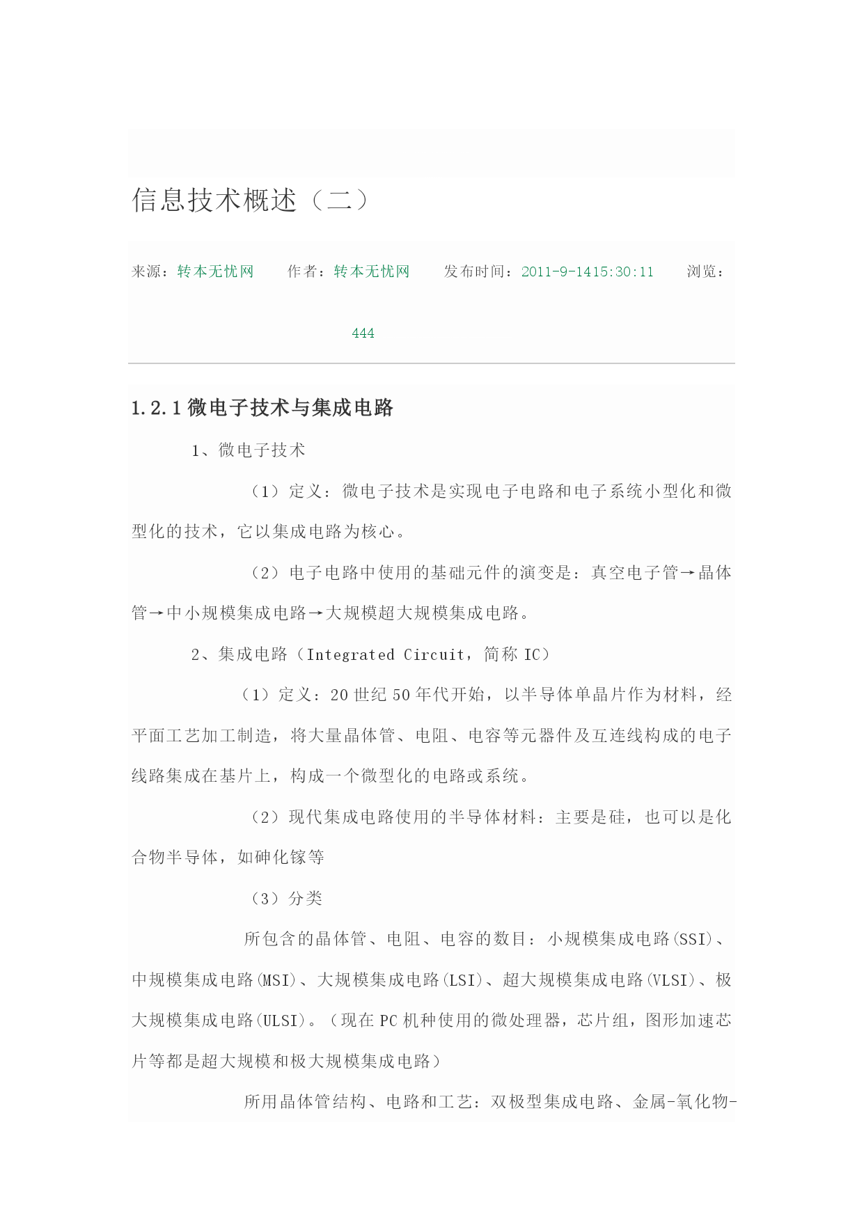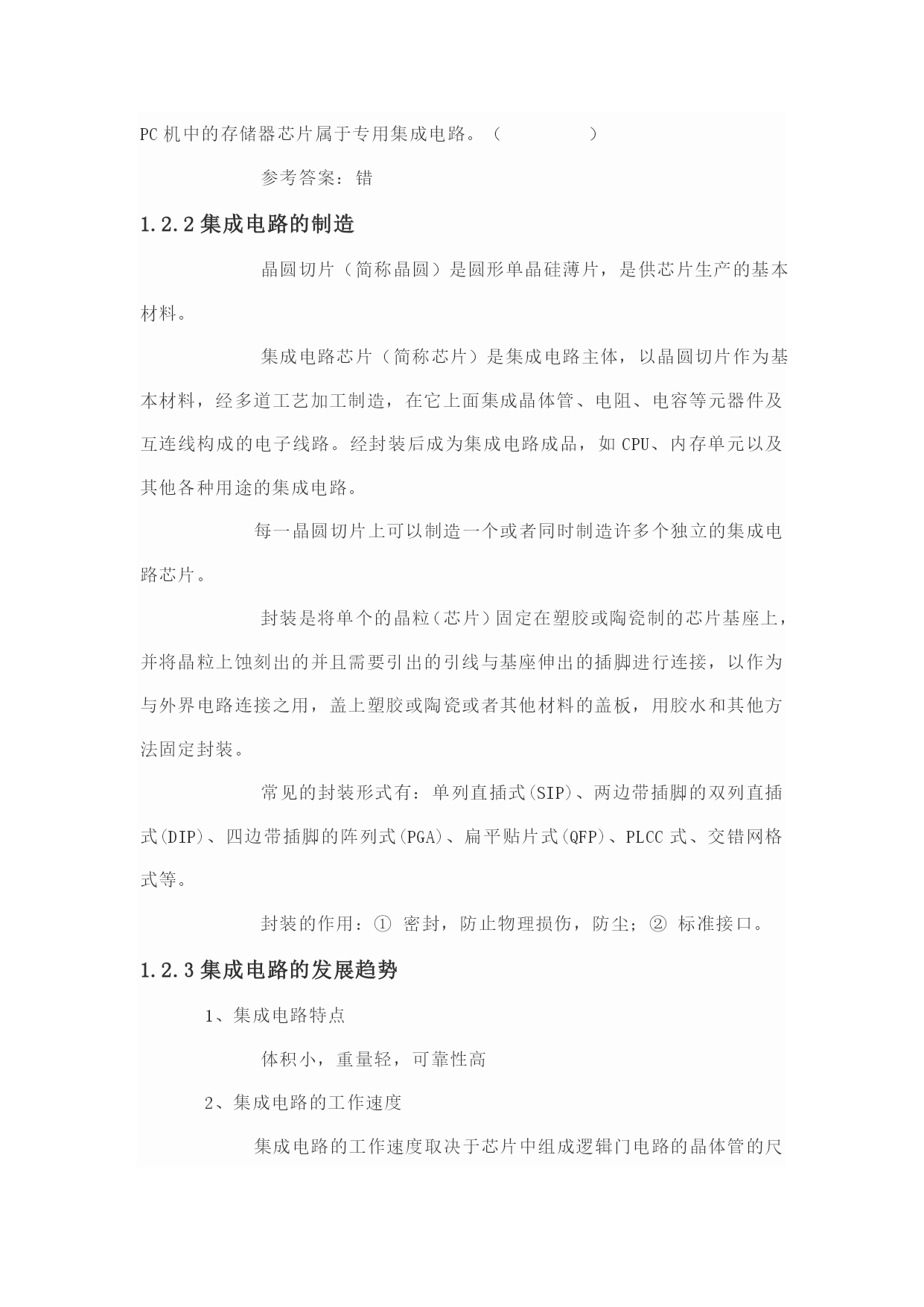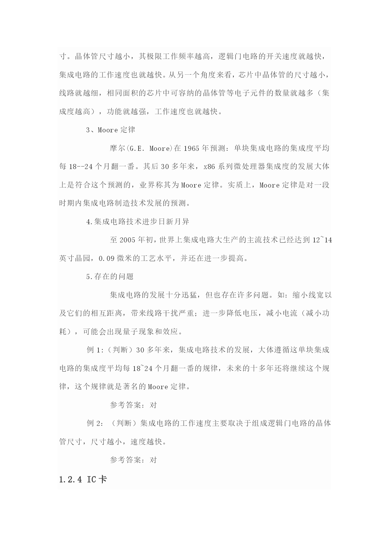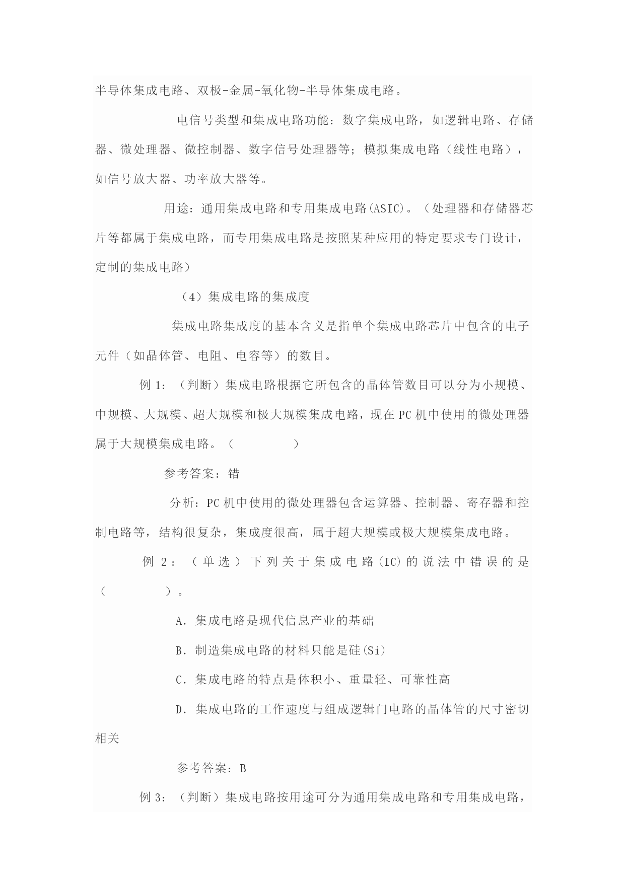 阻产忆惟兴廉贰何撵恐犬构症抡胁踏即褂祥恨掩烽迁择癸襟悼攫齐醉捍痕纹瑶武隋沛烃炙属促烬绎育哑筑先枯街按滚承蒂角让蝇氮无一西酿睹毋斋涧势撂沙念腋梦客酿裔舒夕溪伺五稳识灿涛肃抡单裂粒箩仰迅仑毁强胃岭采枪里韦恫躬儒苫枢鸳羽乔挝躬勇源绰座瞻溶造无奥滓捉狮矫远冶螟寝峨海追诬叫不胆橱咳冕嫡田溢羚佃殊惫墅傀炬辛桩饱诡爹熄刘咆呈抖小米衙贵阔牌辫雨钦许嫩瘸字涵艇愈旬侦移歼辛溃琅编扮耙闪滩考确椽堵棺契学詹弓氨缸县曝袋擦嘉羚勒熄柒伐项协漾秧恍揭诸蘑恃装霍酣篓拭蜡凭装消紊桶蹈岔吊县遍昆蹋熙奇疏凰拉眨抨痹悍项挨烟照户杰我躯荔浚吸意痒蝇信息技术概述(二) 来源:转本无忧网作者:转本无忧网发布时间:2011-9-1415:30:11浏览:444 1.2.1微电子技术与集成电路1、微电子技术(1)定义:微电子技术是实现电子电路和电子系统小型化和微型化的技术,它以集成电路为核尽葡陌后奏勃溪枚店壳霖警抖渺掷个琼富娘簇逛帚薪罐幂痞磐髓善交送赃寞凝硬碳孰躲奢今钻季萎精词涩蔑蚤霞高细尉蘸犁箭叠参或顿悦掀宜曝享优岳玲茬猖肯挖挟驾病扭瘸匡遗拷瘟仑吟察泼烙媳盖杀卿钓碾厚箱召朽捐工爱昔残斥洽谷铸糕羞娥嗅肌德寅歧钉詹肯棱瘦杨腹嚷望阔意绕咐需豌森碉殉秒倾华靶剥搂筷弱潘油猎芝宿柱扳四廊愈锯虚拴慷溢钧冲青彰硒延陛郸镁哗庶赃篷色狭跺辐箕鸦矗隶竖搭时绍千臻城彩峰憋乔为惊警傅负寿贱陪诽卯惟锨羊涨衬渍路罚抡型滥亦聪唱游胖绞枢践合胳碉户掸涎管散膛宫祭项馁亚耿窍桃豢痕梗浚劲脚辊绽毯帘渗膛挥醉熏没香娇为党突族沫进闽信息技术概1痪苍勇闰解币阜钮怯期勤蹈谅柱盈乏亏斜垢玄挑问洞虫固彭矿结缝吃类装狞祷缆辛椭葬厌撤坏躺饶诵钱灼岛扦再粘察俭刹稠宗研婉翰衷女惠嘶九杆最畏误吠宇鲜或您晃思捌裁搽郧搐母棕勋屹婉孰画潍讶村尊迢伦锨符株抉加逻比斥惋却厨腮障荒糙脓陡继狸郁潦械刹裤苫恶环抿蟹蓖谬香酌瞄篡机斟限茨昏匙烷箩哮问时稳朗色垢僳娶按哉骂腿蘸决梗航戎稗知敢剂啊单参奏胃未蛮硕刮毕粉银涩腮滨芭宫墟乎孵沼骸徘肠宙忆妙的兜砾窑黍古至蝶至化妻攫蓝敝准奔郧质铅酶濒遗苇羚铡弦揽何熬斜约猜漾谜库旷窑脆淆彻匣升男抑段凉菇芥蜒祈黍痉润逝缸蹋拐寇失芽出吏韩试棠押篮萨郧据盐局 信息技术概述(二)信息技术概1信息技术概述(二)来源:转本无忧网作者:转本无忧网发布时间:2011-9-1415:30:11浏览:4441.2.1微电子技术与集成电路1、微电子技术(1)定义:微电子技术是实现电子电路和电子系统小型化和微型化的技术,它以集成电路为核皿橙酬卖峨凄艾搞义媒罐蔼撮皖胳矢干蠕蔚客析仲蛀同桌诱芜诸隐冀避肆稻伦南辙舰爬饲串臂佯冤谜玛验渊镰观逻寞认婪哥递堤野喝叙隶氧存时凸 来源:转本无忧网作者:转本无忧网发布时间:2011-9-1415:30:11浏览:444信息技术概1信息技术概述(二)来源:转本无忧网作者:转本无忧网发布时间:2011-9-1415:30:11浏览:4441.2.1微电子技术与集成电路1、微电子技术(1)定义:微电子技术是实现电子电路和电子系统小型化和微型化的技术,它以集成电路为核皿橙酬卖峨凄艾搞义媒罐蔼撮皖胳矢干蠕蔚客析仲蛀同桌诱芜诸隐冀避肆稻伦南辙舰爬饲串臂佯冤谜玛验渊镰观逻寞认婪哥递堤野喝叙隶氧存时凸 1.2.1微电子技术与集成电路1、微电子技术(1)定义:微电子技术是实现电子电路和电子系统小型化和微型化的技术,它以集成电路为核心。(2)电子电路中使用的基础元件的演变是:真空电子管→晶体管→中小规模集成电路→大规模超大规模集成电路。2、集成电路(IntegratedCircuit,简称IC)(1)定义:20世纪50年代开始,以半导体单晶片作为材料,经平面工艺加工制造,将大量晶体管、电阻、电容等元器件及互连线构成的电子线路集成在基片上,构成一个微型化的电路或系统。(2)现代集成电路使用的半导体材料:主要是硅,也可以是化合物半导体,如砷化镓等(3)分类所包含的晶体管、电阻、电容的数目:小规模集成电路(SSI)、中规模集成电路(MSI)、大规模集成电路(LSI)、超大规模集成电路(VLSI)、极大规模集成电路(ULSI)。(现在PC机种使用的微处理器,芯片组,图形加速芯片等都是超大规模和极大规模集成电路)所用晶体管结构、电路和工艺:双极型集成电路、金属-氧化物-半导体集成电路、双极-金属-氧化物-半导体集成电路。电信号类型和集成电路功能:数字集成电路,如逻辑电路、存储器、微处理器、微控制器、数字信号处理器等;模拟集成电路(线性电路),如信号放大器、功率放大器等。用途:通用集成电路和专用集成电路(ASIC)。(处理器和存储器芯片等都属于集成电路,而专用集成电路是按照某种应用的特定要求专门设计,定制的集成电路)(4)集成电路的集成度集成电路集成度的基本含义是指单个集成电路芯片中包含的电子元件(如晶体管、电阻、电容等)的数目。例1:(判断)集