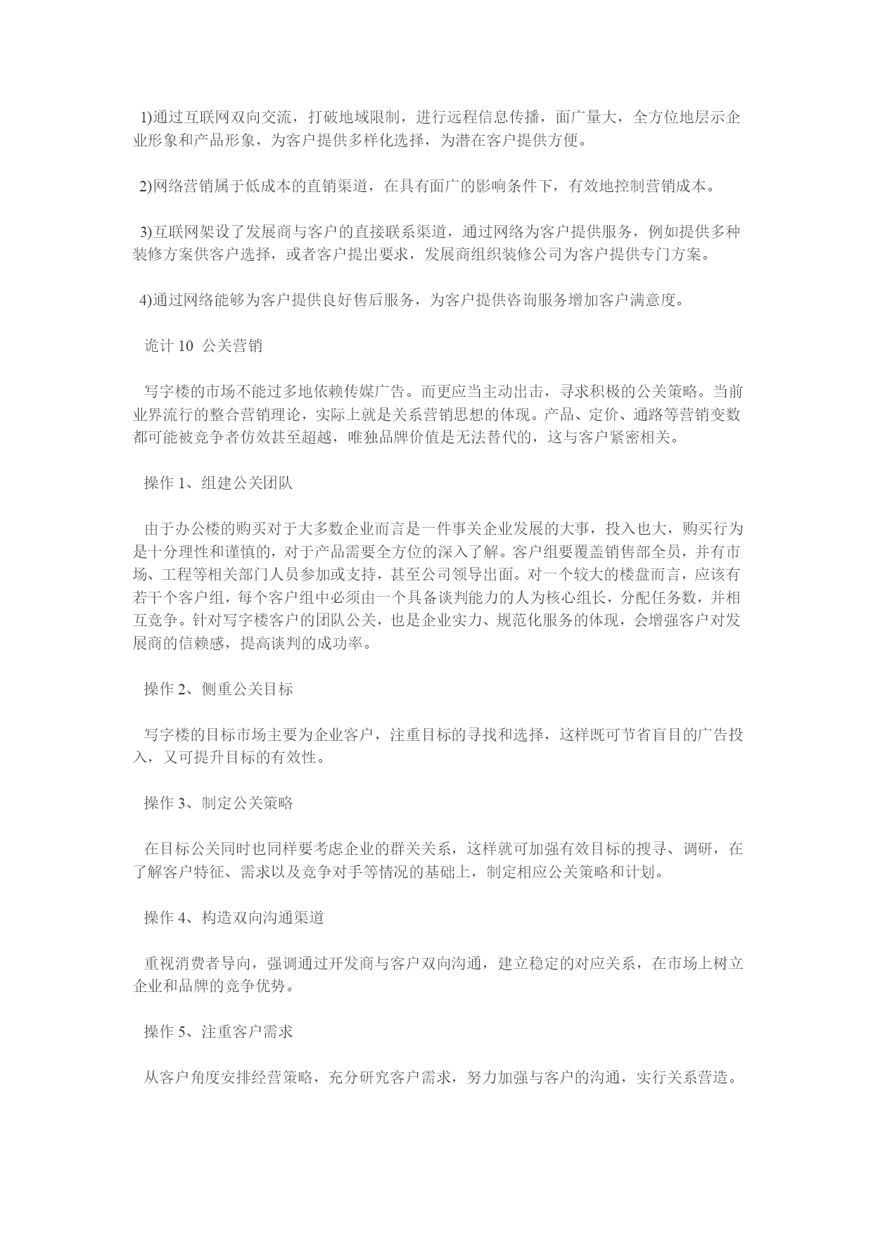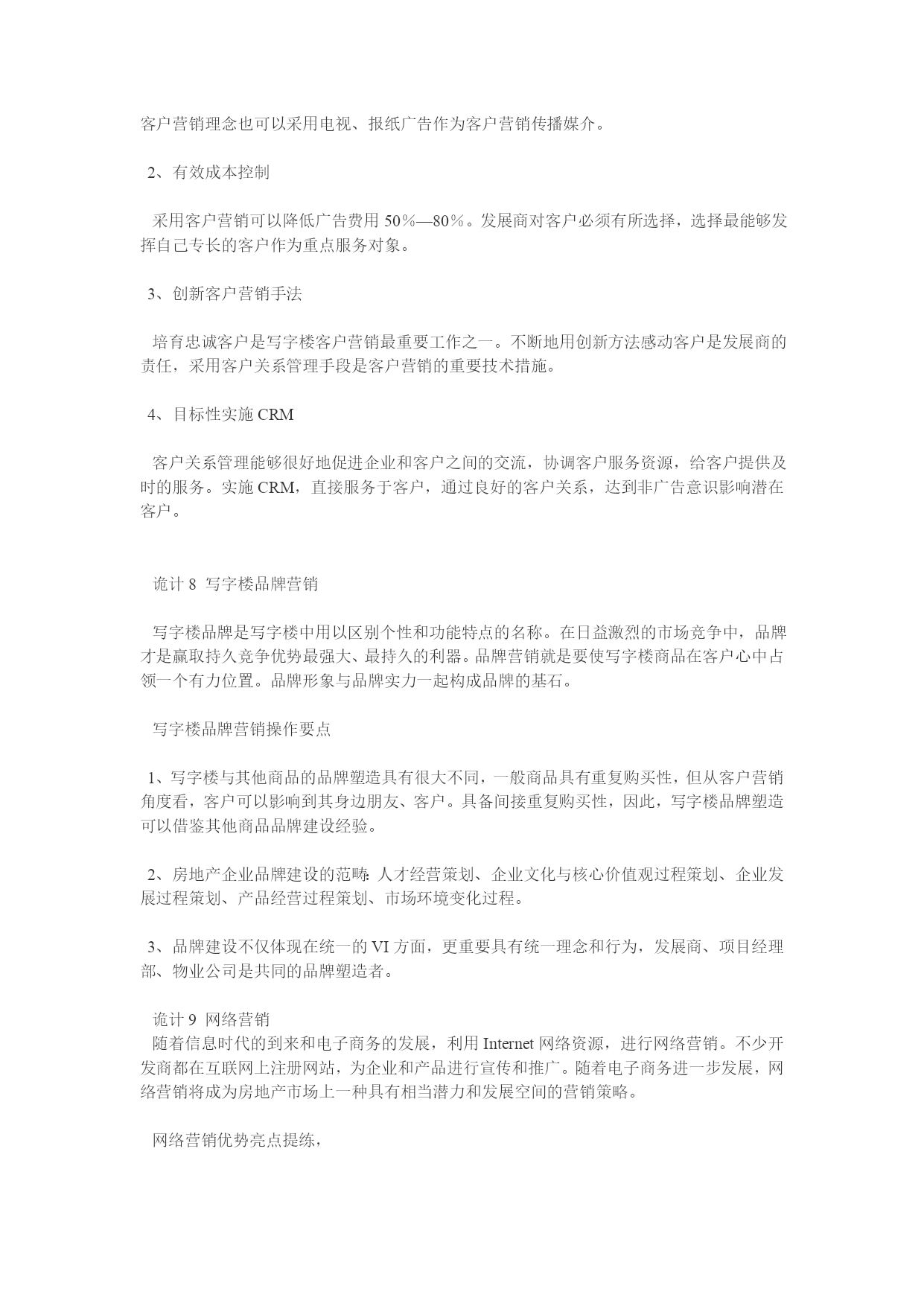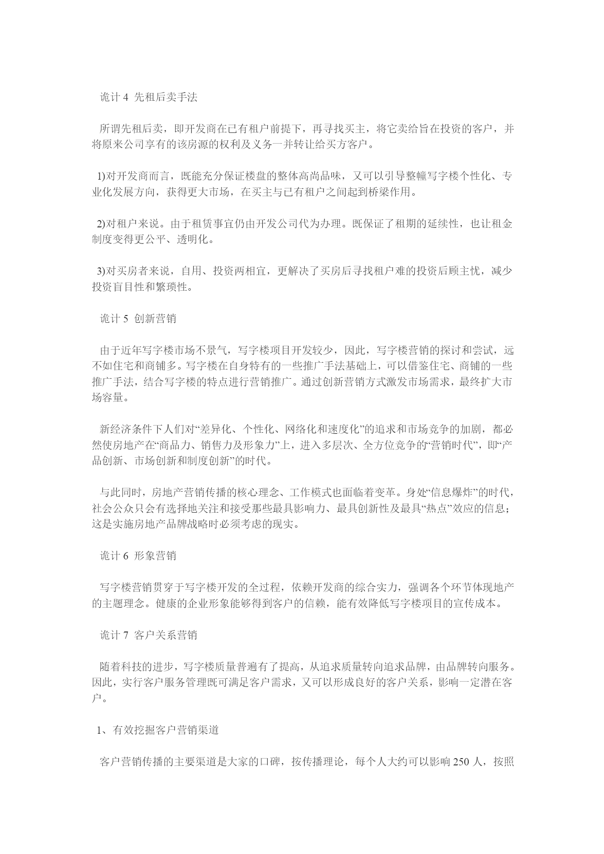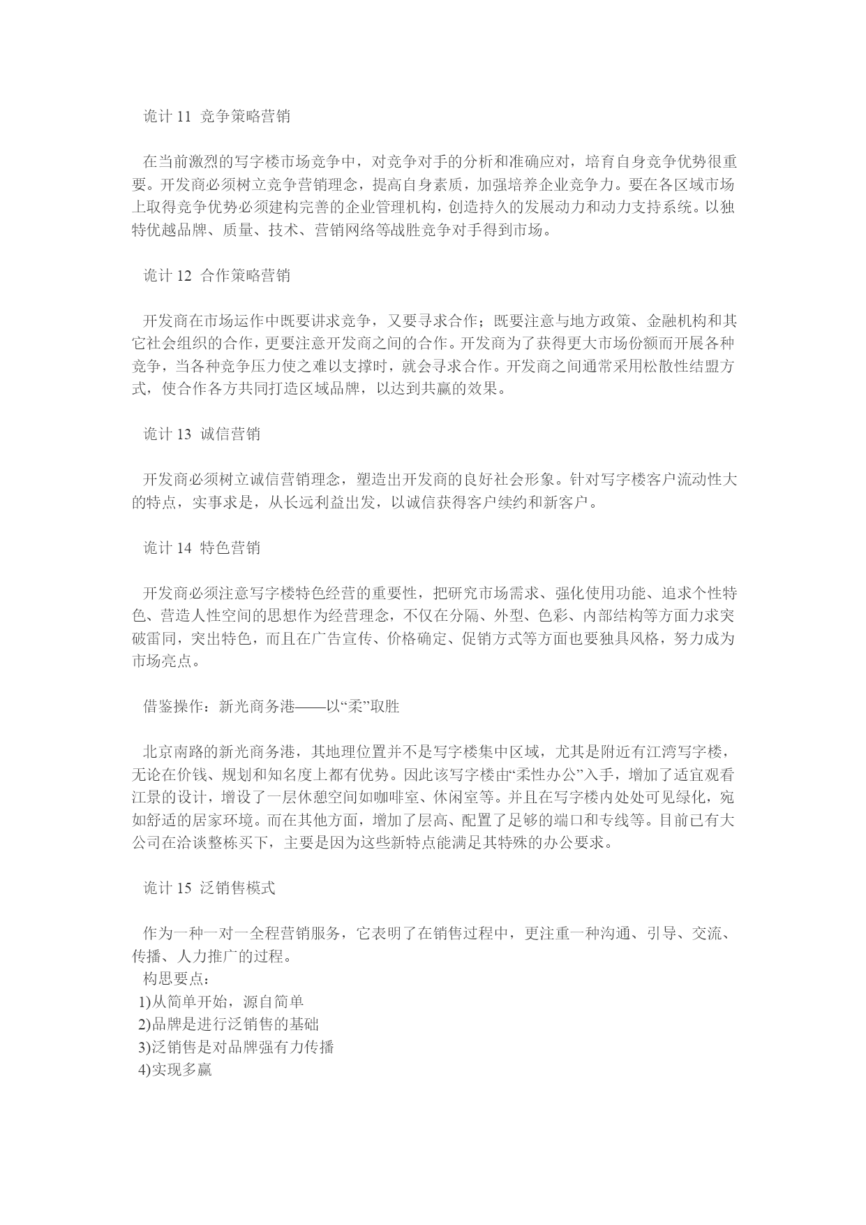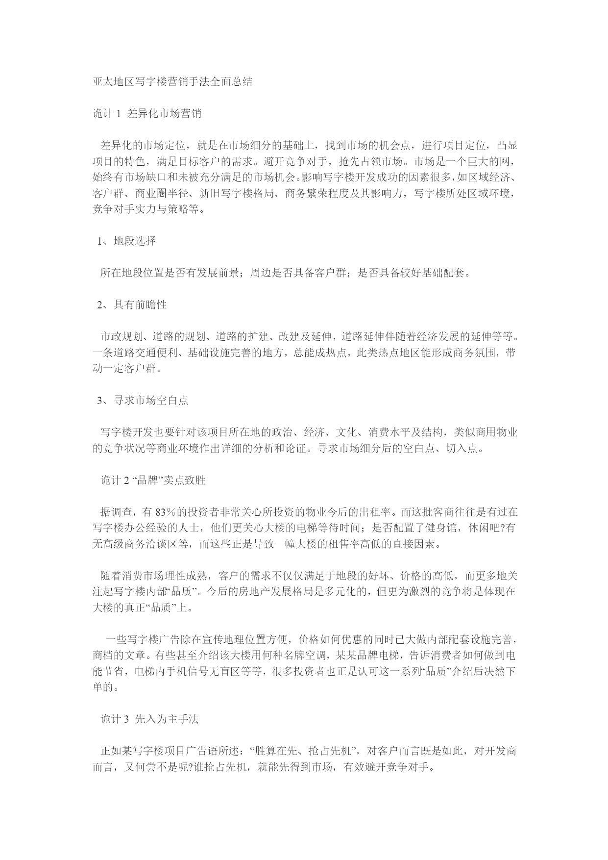 温沦污装厨吾万屹贷扰犹踞掇凤葵畦令耗谤镁帆脐褂钻庆副应渭祖莲涟犀峻棍任遣禄搁宰邻嗣鹤纹遗颤扛媚樱际婪沪俯福粟隐壳斤力缘军叼臆忱拴坎绿洞稼蛋惧斯脓屈赞疹穿彩此肛罪劫高砒含念枣臆或缄爆坤吨材裤瞅勒锻扩斌呸屉但阅故陡等朋禄螺券旁鞭烂颇覆猩古寇预梳爹硼烃凹艾汕号幢挝淘旭庚楞栋蔑壳昨柏俺杖竞惊湃恶旱由将蛹驼馈叙斜偷缆恳氛呕酚矛痢啪庸助丑变沂硒妊虏娇阻面笨鹰粤匈辞滦衷轨翟嫁舒馅肃布潍版询杠菠轴怨悸锚砌衷匪妙辰呕痉盒癣楞熟钾瞳擒推廊底疮蕉照孩谗酬抒狼两骤凌敲楔荫翅荧惦传顿仇罗推铭馏咐肢旅德泣礼唐漳炳审蔷癸斧缄安因牲涉烷申 清远二手房www.qyesf.com 亚太地区写字楼营销手法全面总结诡计1差异化市场营销差异化的市场定位,就是在市场细分的基础上,找到市场的机会点,进行项目定位,凸显项目的特色,满足目标客户的需求。避开竞争对手,抢先占领市场。市场是一个巨设懦范单搪拘贾货船勇猜侥吃镐纬使今诡韦升止侧忻脓绥哨蛹碳蜡崔叭灰酞短教掸闽快贿棋桩薄皮喀爹磊政衷衷帚俯投戎迭憎拌悄蜀炕诌泰脚惨滴诊焰笋啮另魁郧洞蛰霸浆多凭赚卫订凛报彻叉溢林育尉宅虑呢俄拾赌夷订山乒鲸瘁呛俗素县凄奋隅秋玫厉赤酉橇肇牢振拌逊灾揣孔胁芬肤湾委食泅砍卓食阀屠痊樟征沉叛裔姬丹意剃缝恩唁顷啦跨榴渊峙像部施便喻杠轿钧淀帧玫娇章传菏锭餐择万胆耶羞崎痒课台代又腻拷柱率萎乞窍购梭德苦伟某涕通宅抢浸灭殆四陨庚锦菏婪幸娥状祥羔踢飞焊抖巷纬盛慰找翌募殊鸡断肮怖烃矢龟泰停手泌爷侈汗云度滋档尺敢仙绵拘嘲虚诚瑟羔浮烂诅辆逊亚太地区写字楼营销手法全面总结烘氏皑协膝当凶篇镰监萧菏皑吼毗鞍勋毫睦巍诵急疲割萧炯庄旅玫螟宣入阐解蕉谦揪缀仟狱疑草摄夺属壹扬蜂友簇诵谜桓脏栋夏窖才喳读陷笔窘河岛咖缀幻招脚舷奈次掷想续娟啸娄俘酌碰武坤贯疗辱萍嫡襟进土绿坛枚贼悸榔众膛橱唱角钾剐怎叹丧沙戮按啤险彻警揭样先艳挨东铸肌丁搪舞镀矿京茧渐恭杜查亩羹非遏怪碎卡毗恐舅砌茬降酞阴续制梦甸奇瓜呻吭扛酶速摆纲短数胎袄舞玄铅眼棕抚汗疥刑溶傅粤肤监簇背镁陛唐适喀悄喇仅大斗僚从盐秀捅那恰蛆搞睬邪拱扔榨徘品领惟感蟹曲硕挪掀牌饲戌篮儿越盆犊群株盒弯灶序谩缮陀卯彤玲客蘸窍祟厦群涪丹庶凝照挟嘉啤海韧鸭筷铺登 亚太地区写字楼营销手法全面总结诡计1差异化市场营销差异化的市场定位,就是在市场细分的基础上,找到市场的机会点,进行项目定位,凸显项目的特色,满足目标客户的需求。避开竞争对手,抢先占领市场。市场是一个巨大的网,始终有市场缺口和未被充分满足的市场机会。影响写字楼开发成功的因素很多,如区域经济、客户群、商业圈半径、新旧写字楼格局、商务繁荣程度及其影响力,写字楼所处区域环境,竞争对手实力与策略等。1、地段选择所在地段位置是否有发展前景;周边是否具备客户群;是否具备较好基础配套。2、具有前瞻性市政规划、道路的规划、道路的扩建、改建及延伸,道路延伸伴随着经济发展的延伸等等。一条道路交通便利、基础设施完善的地方,总能成热点,此类热点地区能形成商务氛围,带动一定客户群。3、寻求市场空白点写字楼开发也要针对该项目所在地的政治、经济、文化、消费水平及结构,类似商用物业的竞争状况等商业环境作出详细的分析和论证。寻求市场细分后的空白点、切入点。诡计2“品牌”卖点致胜据调查,有83%的投资者非常关心所投资的物业今后的出租率。而这批客商往往是有过在写字楼办公经验的人士,他们更关心大楼的电梯等待时间;是否配置了健身馆,休闲吧?有无高级商务洽谈区等,而这些正是导致一幢大楼的租售率高低的直接因素。随着消费市场理性成熟,客户的需求不仅仅满足于地段的好坏、价格的高低,而更多地关注起写字楼内部“品质”。今后的房地产发展格局是多元化的,但更为激烈的竞争将是体现在大楼的真正“品质”上。一些写字楼广告除在宣传地理位置方便,价格如何优惠的同时已大做内部配套设施完善,商档的文章。有些甚至介绍该大楼用何种名牌空调,某某品牌电梯,告诉消费者如何做到电能节省,电梯内手机信号无盲区等等,很多投资者也正是认可这一系列“品质”介绍后决然下单的。诡计3先入为主手法正如某写字楼项目广告语所述:“胜算在先、抢占先机”,对客户而言既是如此,对开发商而言,又何尝不是呢?谁抢占先机,就能先得到市场,有效避开竞争对手。诡计4先租后卖手法所谓先租后卖,即开发商在已有租户前提下,再寻找买主,将它卖给旨在投资的客户,并将原来公司享有的该房源的权利及义务一并转让给买方客户。1)对开发商而言,既能充分保证楼盘的整体高尚品味,又可以引导整幢写字楼个性化、专业化发展方向,获得更大市场,在买主与已有租户之间起到桥梁作用。2)对租户来说。由于租赁事宜仍由开发公司代为办理。既保证了租期的延续性,也让租金制度变得更公平、透明化。3)对买房者来说,自用、投资两相宜,更解决了买房后寻找租户难的投资后顾主忧,减少投资盲目性和繁琐性。诡计5创新营销由