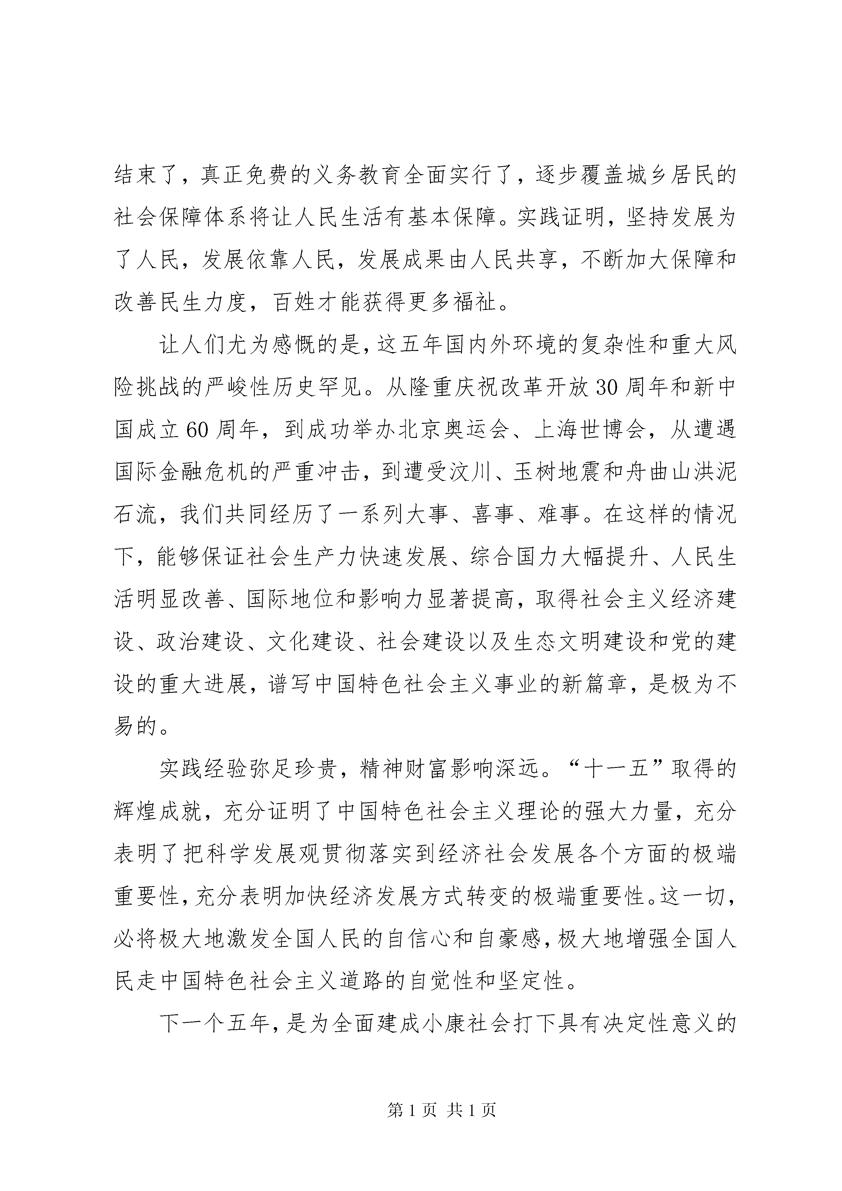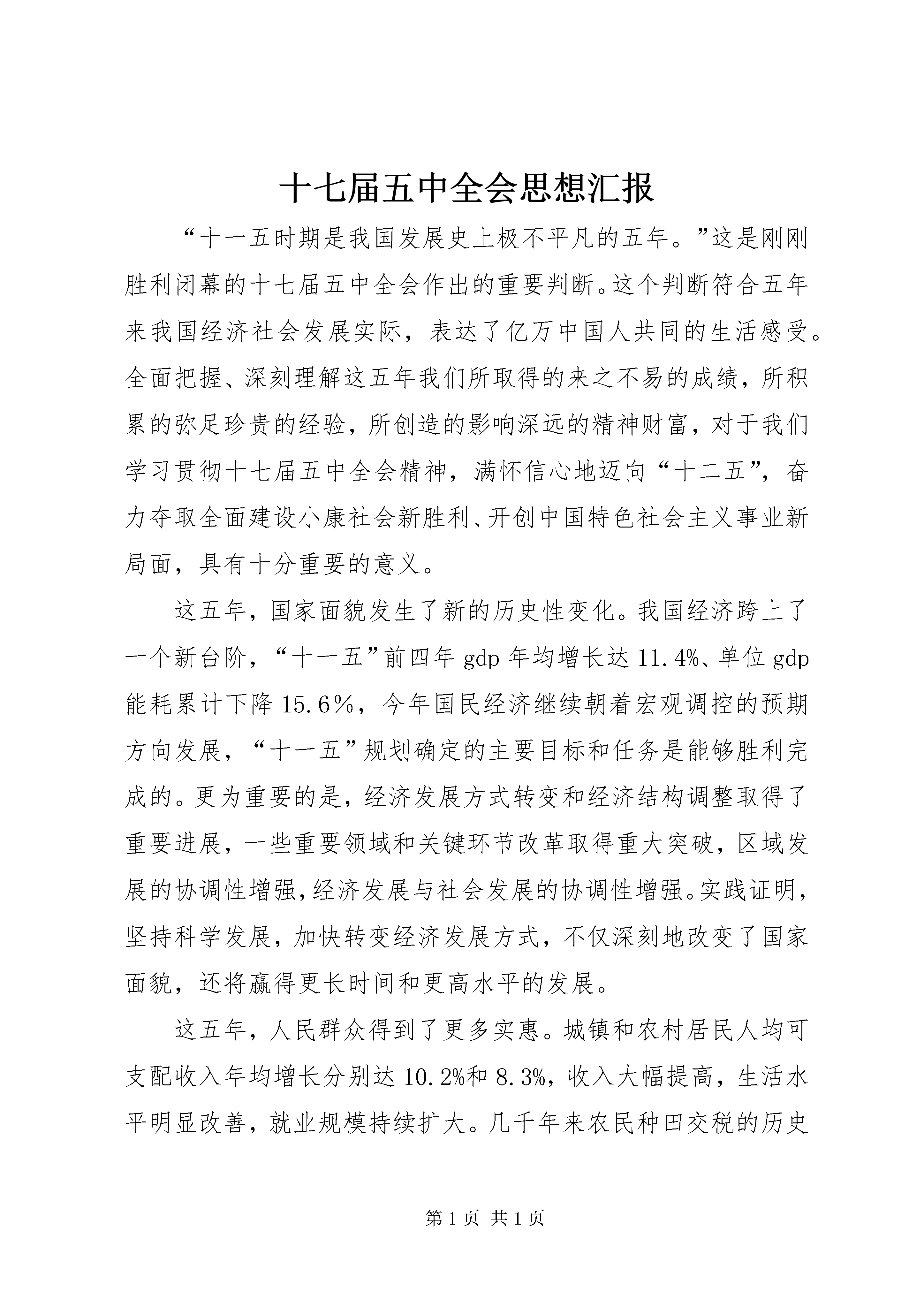 十七届五中全会思想汇报“十一五时期是我国发展史上极不平凡的五年。”这是刚刚胜利闭幕的十七届五中全会作出的重要判断。这个判断符合五年来我国经济社会发展实际,表达了亿万中国人共同的生活感受。全面把握、深刻理解这五年我们所取得的来之不易的成绩,所积累的弥足珍贵的经验,所创造的影响深远的精神财富,对于我们学习贯彻十七届五中全会精神,满怀信心地迈向“十二五”,奋力夺取全面建设小康社会新胜利、开创中国特色社会主义事业新局面,具有十分重要的意义。这五年,国家面貌发生了新的历史性变化。我国经济跨上了一个新台阶,“十一五”前四年gdp年均增长达11.4%、单位gdp能耗累计下降15.6%,今年国民经济继续朝着宏观调控的预期方向发展,“十一五”规划确定的主要目标和任务是能够胜利完成的。更为重要的是,经济发展方式转变和经济结构调整取得了重要进展,一些重要领域和关键环节改革取得重大突破,区域发展的协调性增强,经济发展与社会发展的协调性增强。实践证明,坚持科学发展,加快转变经济发展方式,不仅深刻地改变了国家面貌,还将赢得更长时间和更高水平的发展。这五年,人民群众得到了更多实惠。城镇和农村居民人均可支配收入年均增长分别达10.2%和8.3%,收入大幅提高,生活水平明显改善,就业规模持续扩大。几千年来农民种田交税的历史结束了,真正免费的义务教育全面实行了,逐步覆盖城乡居民的社会保障体系将让人民生活有基本保障。实践证明,坚持发展为了人民,发展依靠人民,发展成果由人民共享,不断加大保障和改善民生力度,百姓才能获得更多福祉。让人们尤为感慨的是,这五年国内外环境的复杂性和重大风险挑战的严峻性历史罕见。从隆重庆祝改革开放30周年和新中国成立60周年,到成功举办北京奥运会、上海世博会,从遭遇国际金融危机的严重冲击,到遭受汶川、玉树地震和舟曲山洪泥石流,我们共同经历了一系列大事、喜事、难事。在这样的情况下,能够保证社会生产力快速发展、综合国力大幅提升、人民生活明显改善、国际地位和影响力显著提高,取得社会主义经济建设、政治建设、文化建设、社会建设以及生态文明建设和党的建设的重大进展,谱写中国特色社会主义事业的新篇章,是极为不易的。实践经验弥足珍贵,精神财富影响深远。“十一五”取得的辉煌成就,充分证明了中国特色社会主义理论的强大力量,充分表明了把科学发展观贯彻落实到经济社会发展各个方面的极端重要性,充分表明加快经济发展方式转变的极端重要性。这一切,必将极大地激发全国人民的自信心和自豪感,极大地增强全国人民走中国特色社会主义道路的自觉性和坚定性。下一个五年,是为全面建成小康社会打下具有决定性意义的基础的关键五年。十七届五中全会通过的“十二五”规划建议,对推动“十二五”时期我国经济社会发展作出全面部署,是今后五年我国经济社会发展的重要指导性文件。认真学习贯彻十七届五中全会精神,把思想和行动统一到中央决策部署上来,就必定能够书写我国发展史上又一个五年的崭新篇章。