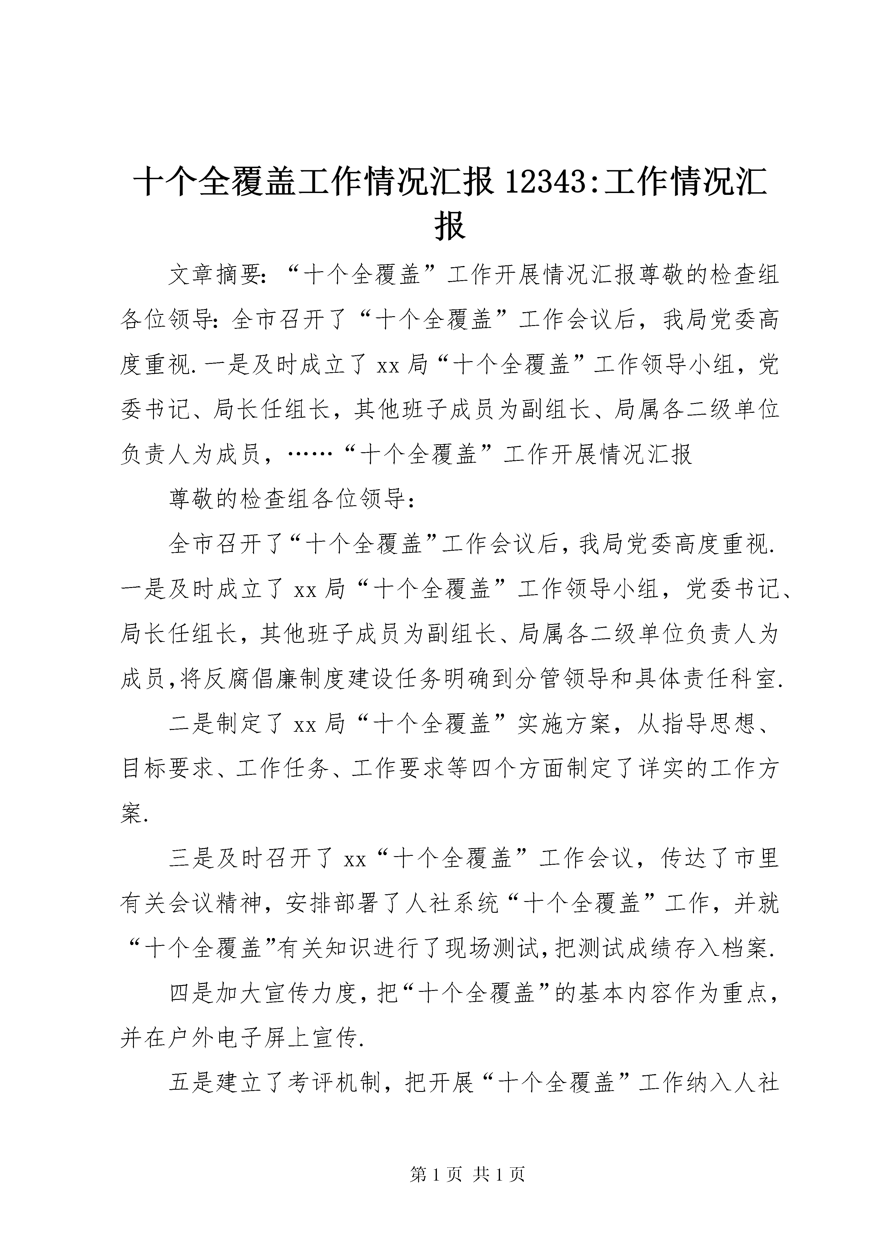十个全覆盖工作情况汇报12343:工作情况汇报文章摘要:“十个全覆盖”工作开展情况汇报尊敬的检查组各位领导:全市召开了“十个全覆盖”工作会议后,我局党委高度重视.一是及时成立了xx局“十个全覆盖”工作领导小组,党委书记、局长任组长,其他班子成员为副组长、局属各二级单位负责人为成员,……“十个全覆盖”工作开展情况汇报尊敬的检查组各位领导:全市召开了“十个全覆盖”工作会议后,我局党委高度重视.一是及时成立了xx局“十个全覆盖”工作领导小组,党委书记、局长任组长,其他班子成员为副组长、局属各二级单位负责人为成员,将反腐倡廉制度建设任务明确到分管领导和具体责任科室.二是制定了xx局“十个全覆盖”实施方案,从指导思想、目标要求、工作任务、工作要求等四个方面制定了详实的工作方案.三是及时召开了xx“十个全覆盖”工作会议,传达了市里有关会议精神,安排部署了人社系统“十个全覆盖”工作,并就“十个全覆盖”有关知识进行了现场测试,把测试成绩存入档案.四是加大宣传力度,把“十个全覆盖”的基本内容作为重点,并在户外电子屏上宣传.五是建立了考评机制,把开展“十个全覆盖”工作纳入人社系统年终考评内容,并作为评选表模、年度考核的重要依据.六是建立健全各项工作制度和工作流程,进一步规范办事程序,增强各项工作的透明度,自觉接收社会监督.七是加强了资料的管理及归档工作.