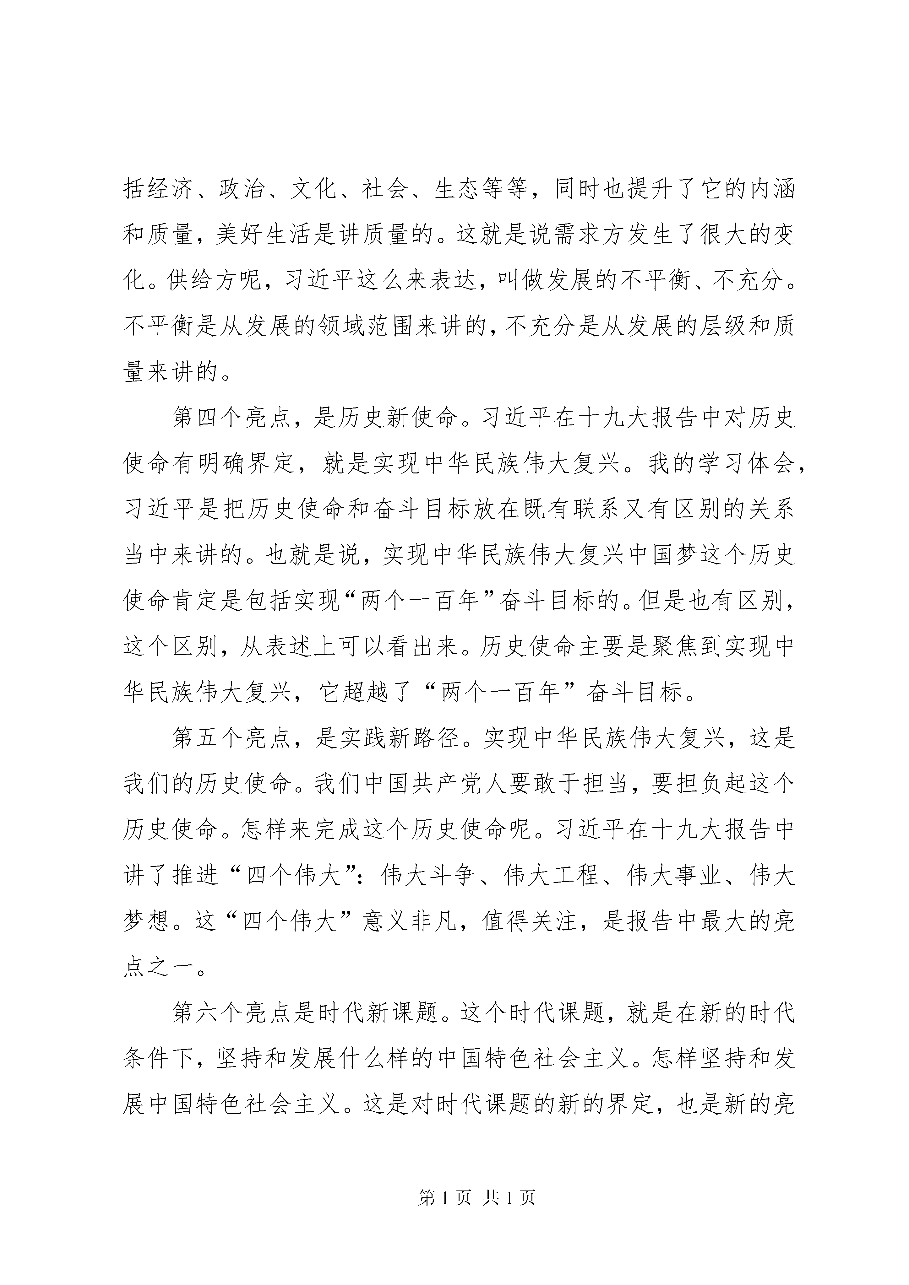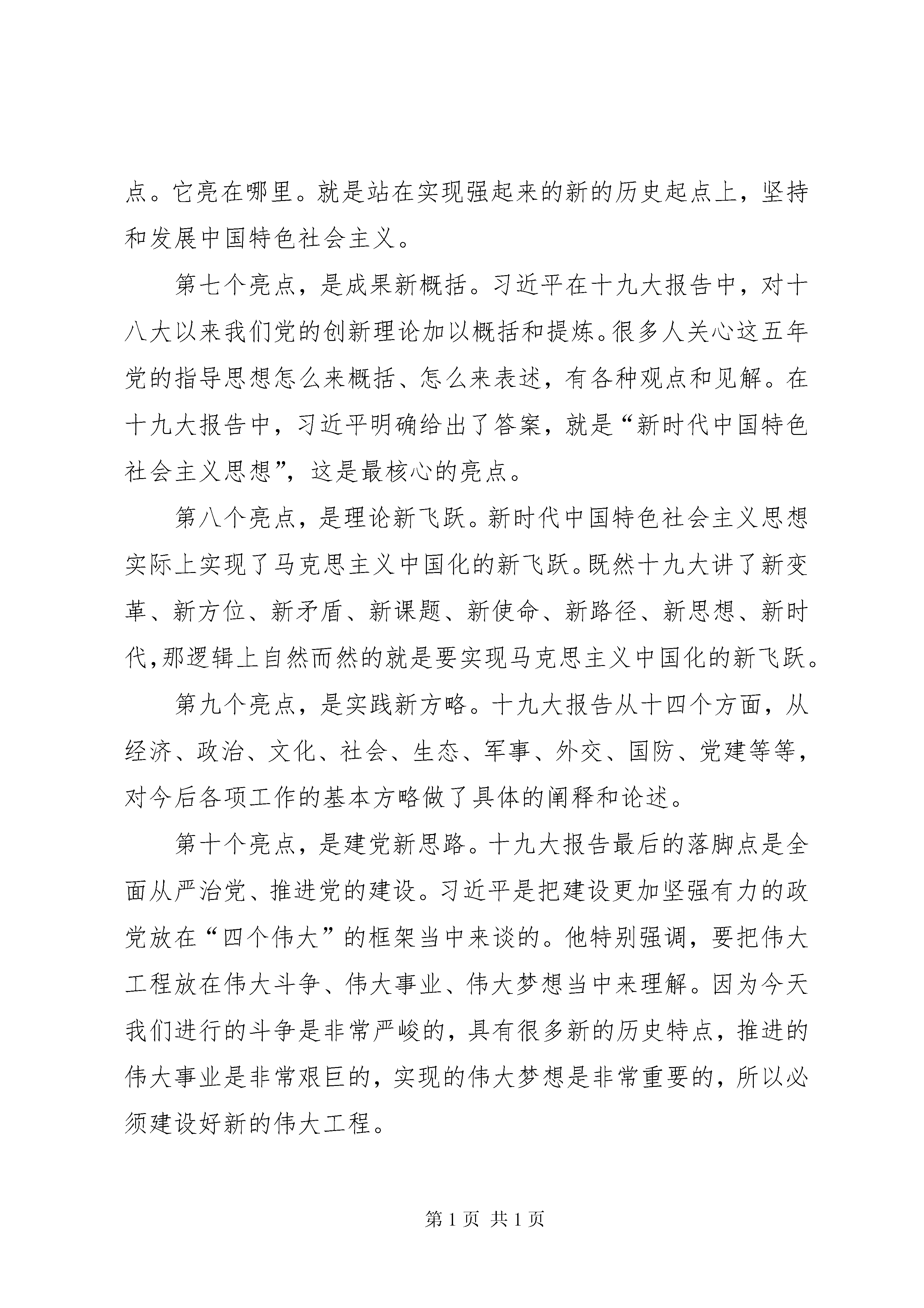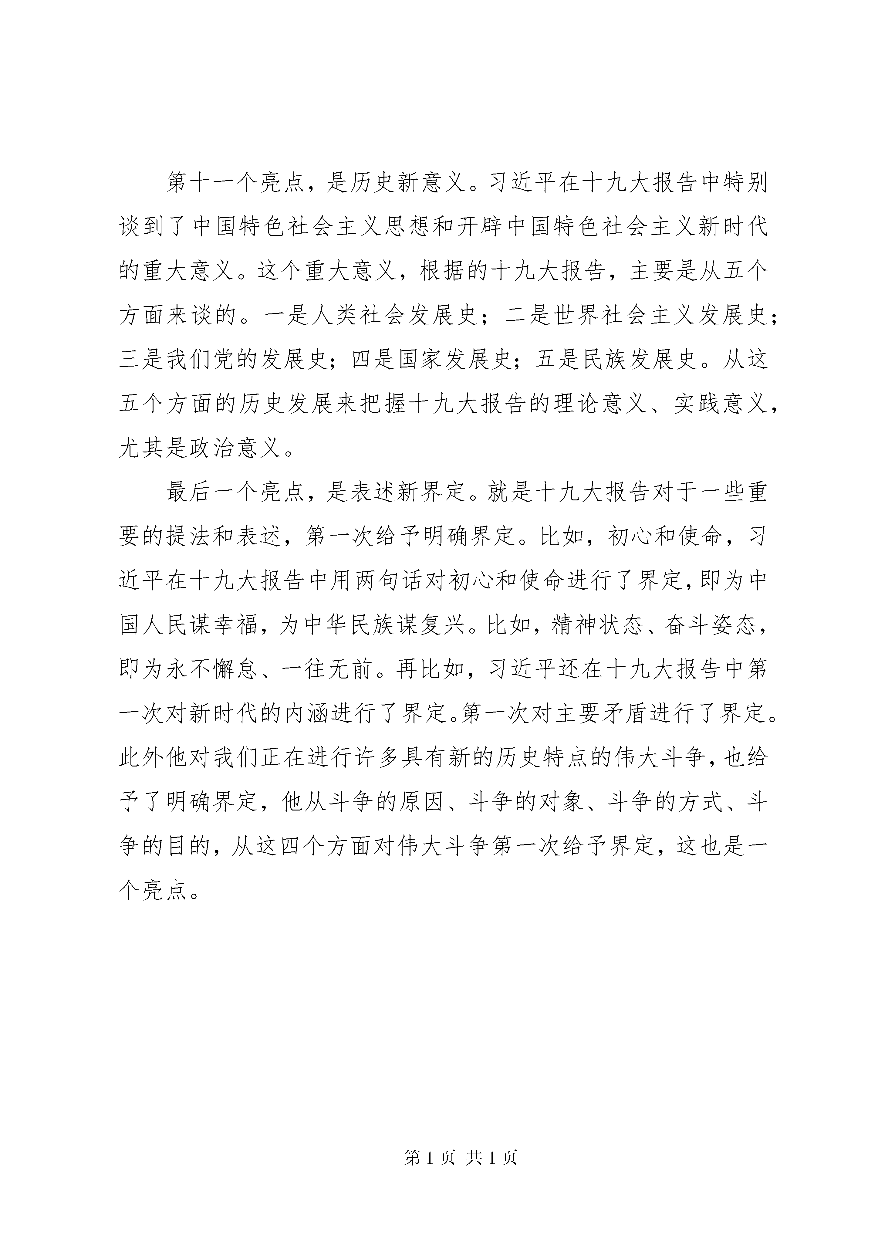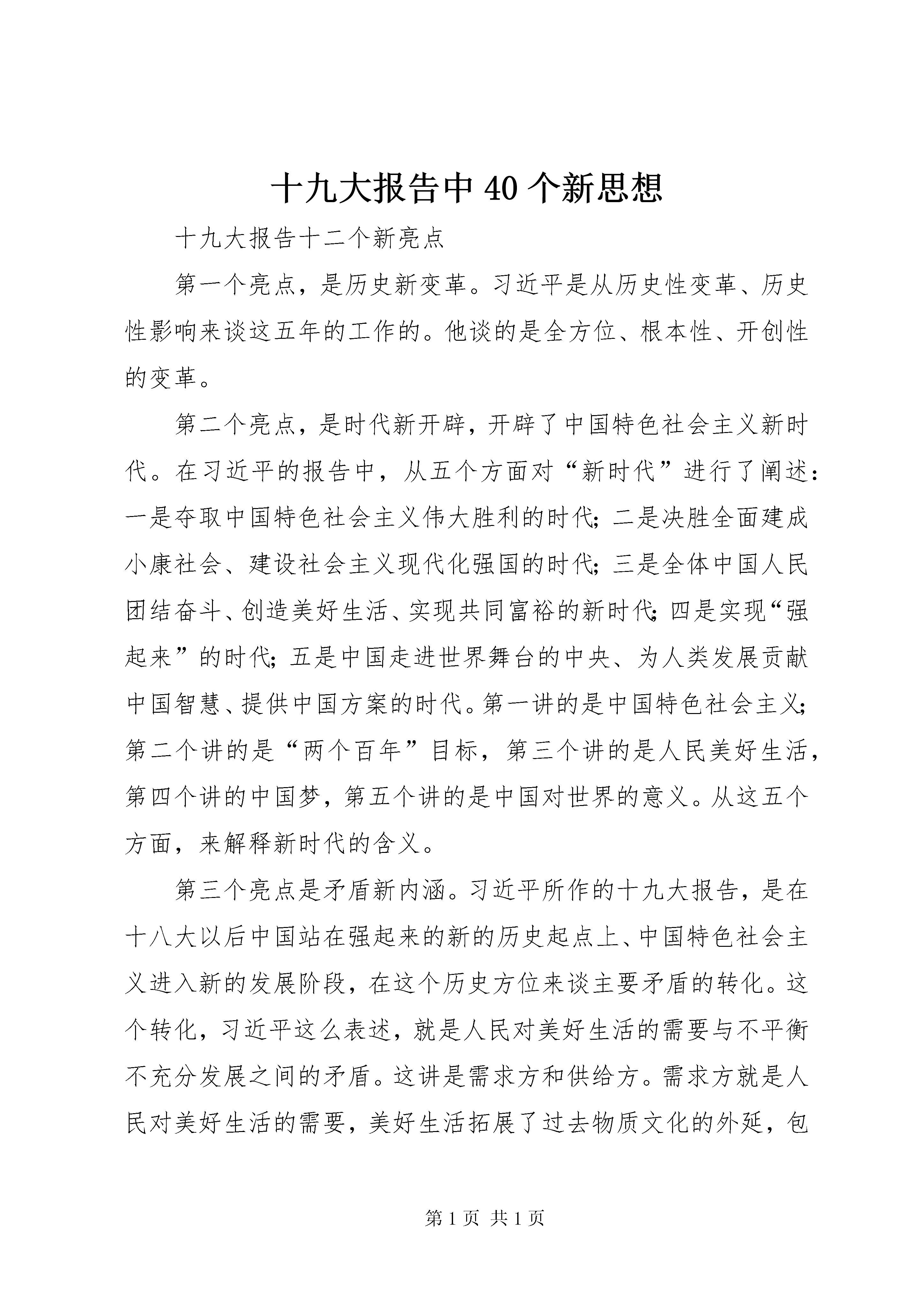 十九大报告中40个新思想十九大报告十二个新亮点第一个亮点,是历史新变革。习近平是从历史性变革、历史性影响来谈这五年的工作的。他谈的是全方位、根本性、开创性的变革。第二个亮点,是时代新开辟,开辟了中国特色社会主义新时代。在习近平的报告中,从五个方面对“新时代”进行了阐述:一是夺取中国特色社会主义伟大胜利的时代;二是决胜全面建成小康社会、建设社会主义现代化强国的时代;三是全体中国人民团结奋斗、创造美好生活、实现共同富裕的新时代;四是实现“强起来”的时代;五是中国走进世界舞台的中央、为人类发展贡献中国智慧、提供中国方案的时代。第一讲的是中国特色社会主义;第二个讲的是“两个百年”目标,第三个讲的是人民美好生活,第四个讲的中国梦,第五个讲的是中国对世界的意义。从这五个方面,来解释新时代的含义。第三个亮点是矛盾新内涵。习近平所作的十九大报告,是在十八大以后中国站在强起来的新的历史起点上、中国特色社会主义进入新的发展阶段,在这个历史方位来谈主要矛盾的转化。这个转化,习近平这么表述,就是人民对美好生活的需要与不平衡不充分发展之间的矛盾。这讲是需求方和供给方。需求方就是人民对美好生活的需要,美好生活拓展了过去物质文化的外延,包括经济、政治、文化、社会、生态等等,同时也提升了它的内涵和质量,美好生活是讲质量的。这就是说需求方发生了很大的变化。供给方呢,习近平这么来表达,叫做发展的不平衡、不充分。不平衡是从发展的领域范围来讲的,不充分是从发展的层级和质量来讲的。第四个亮点,是历史新使命。习近平在十九大报告中对历史使命有明确界定,就是实现中华民族伟大复兴。我的学习体会,习近平是把历史使命和奋斗目标放在既有联系又有区别的关系当中来讲的。也就是说,实现中华民族伟大复兴中国梦这个历史使命肯定是包括实现“两个一百年”奋斗目标的。但是也有区别,这个区别,从表述上可以看出来。历史使命主要是聚焦到实现中华民族伟大复兴,它超越了“两个一百年”奋斗目标。第五个亮点,是实践新路径。实现中华民族伟大复兴,这是我们的历史使命。我们中国共产党人要敢于担当,要担负起这个历史使命。怎样来完成这个历史使命呢。习近平在十九大报告中讲了推进“四个伟大”:伟大斗争、伟大工程、伟大事业、伟大梦想。这“四个伟大”意义非凡,值得关注,是报告中最大的亮点之一。第六个亮点是时代新课题。这个时代课题,就是在新的时代条件下,坚持和发展什么样的中国特色社会主义。怎样坚持和发展中国特色社会主义。这是对时代课题的新的界定,也是新的亮点。它亮在哪里。就是站在实现强起来的新的历史起点上,坚持和发展中国特色社会主义。第七个亮点,是成果新概括。习近平在十九大报告中,对十八大以来我们党的创新理论加以概括和提炼。很多人关心这五年党的指导思想怎么来概括、怎么来表述,有各种观点和见解。在十九大报告中,习近平明确给出了答案,就是“新时代中国特色社会主义思想”,这是最核心的亮点。第八个亮点,是理论新飞跃。新时代中国特色社会主义思想实际上实现了马克思主义中国化的新飞跃。既然十九大讲了新变革、新方位、新矛盾、新课题、新使命、新路径、新思想、新时代,那逻辑上自然而然的就是要实现马克思主义中国化的新飞跃。第九个亮点,是实践新方略。十九大报告从十四个方面,从经济、政治、文化、社会、生态、军事、外交、国防、党建等等,对今后各项工作的基本方略做了具体的阐释和论述。第十个亮点,是建党新思路。十九大报告最后的落脚点是全面从严治党、推进党的建设。习近平是把建设更加坚强有力的政党放在“四个伟大”的框架当中来谈的。他特别强调,要把伟大工程放在伟大斗争、伟大事业、伟大梦想当中来理解。因为今天我们进行的斗争是非常严峻的,具有很多新的历史特点,推进的伟大事业是非常艰巨的,实现的伟大梦想是非常重要的,所以必须建设好新的伟大工程。第十一个亮点,是历史新意义。习近平在十九大报告中特别谈到了中国特色社会主义思想和开辟中国特色社会主义新时代的重大意义。这个重大意义,根据的十九大报告,主要是从五个方面来谈的。一是人类社会发展史;二是世界社会主义发展史;三是我们党的发展史;四是国家发展史;五是民族发展史。从这五个方面的历史发展来把握十九大报告的理论意义、实践意义,尤其是政治意义。最后一个亮点,是表述新界定。就是十九大报告对于一些重要的提法和表述,第一次给予明确界定。比如,初心和使命,习近平在十九大报告中用两句话对初心和使命进行了界定,即为中国人民谋幸福,为中华民族谋复兴。比如,精神状态、奋斗姿态,即为永不懈怠、一往无前。再比如,习近平还在十九大报告中第一次对新时代的内涵进行了界定。第一次对主要矛盾进行了界定。此外他对我们正在进行许多具有新的历史特点的伟大斗争,也给予了明确界定,他从斗争的原因、斗争的对象、斗争的方式、斗争的目的,从这四个方面对伟