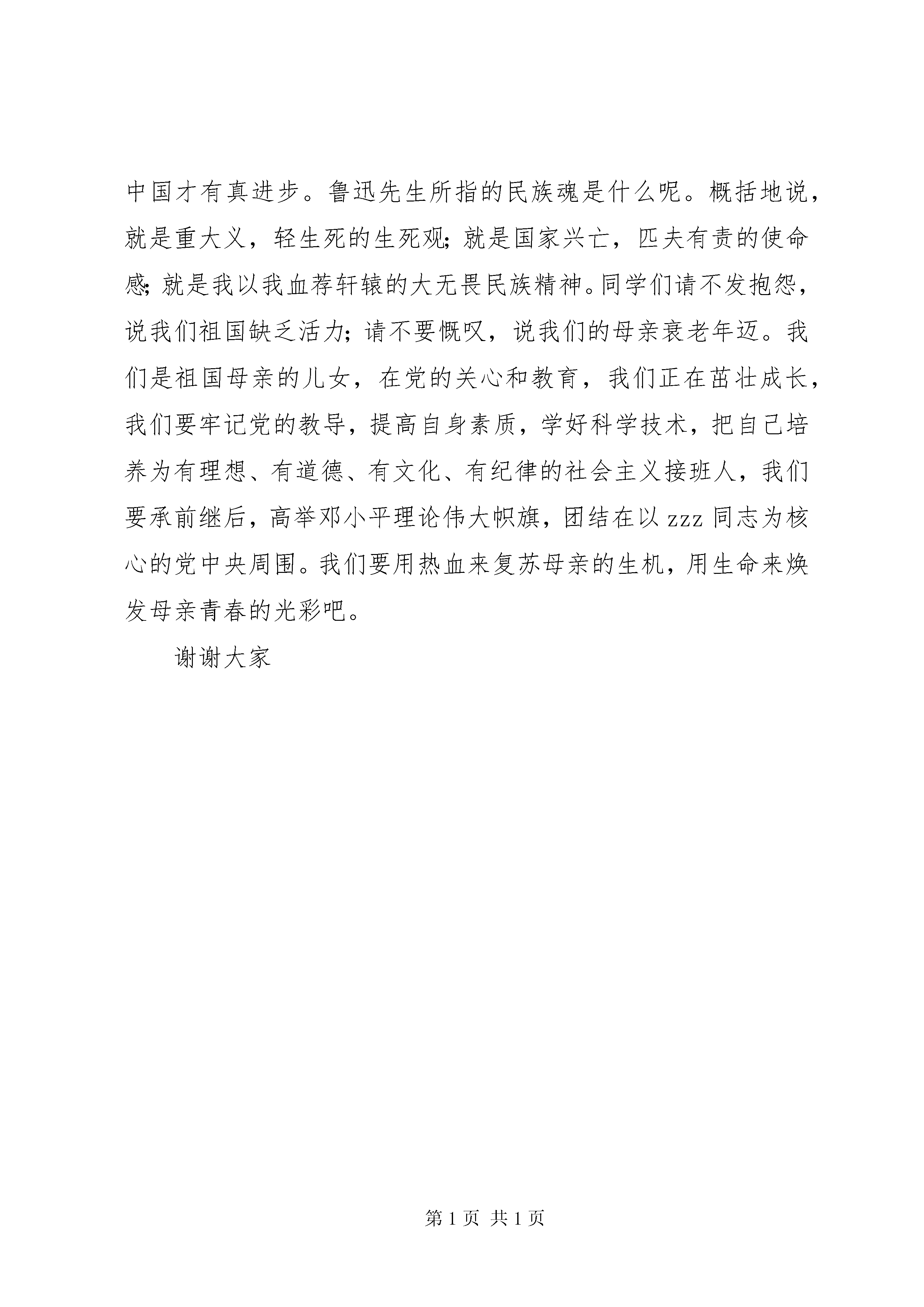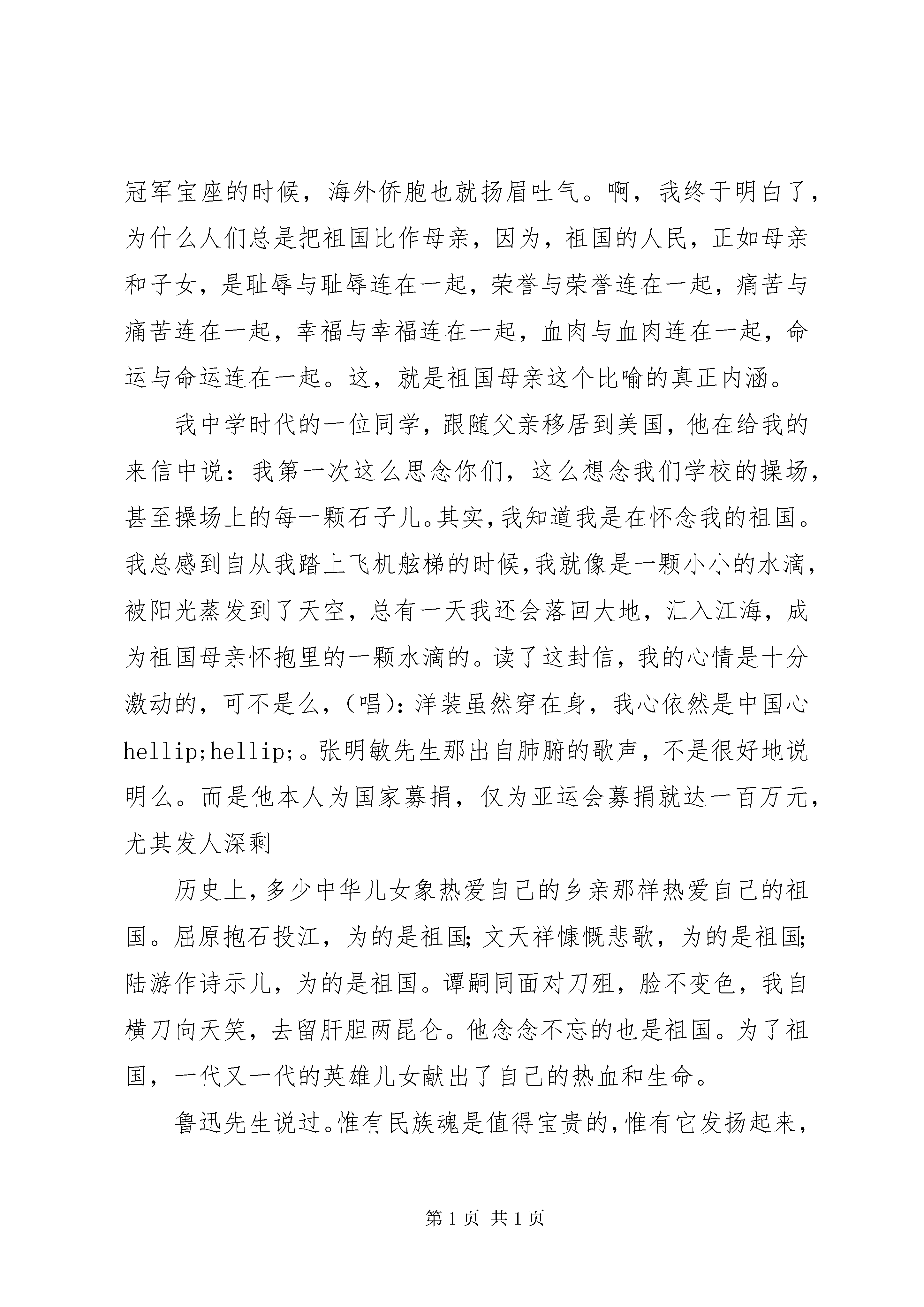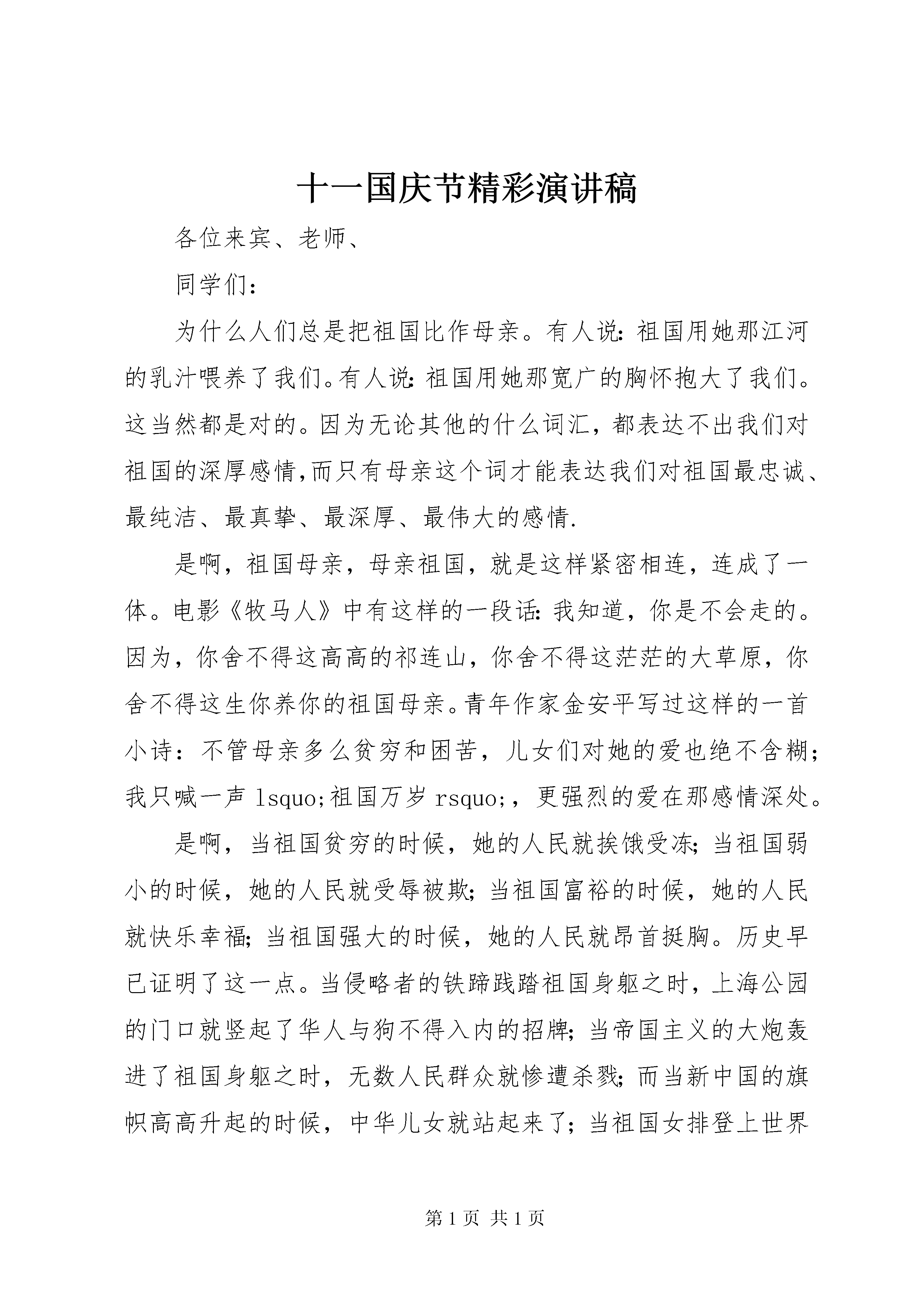 十一国庆节精彩演讲稿各位来宾、老师、同学们:为什么人们总是把祖国比作母亲。有人说:祖国用她那江河的乳汁喂养了我们。有人说:祖国用她那宽广的胸怀抱大了我们。这当然都是对的。因为无论其他的什么词汇,都表达不出我们对祖国的深厚感情,而只有母亲这个词才能表达我们对祖国最忠诚、最纯洁、最真挚、最深厚、最伟大的感情.是啊,祖国母亲,母亲祖国,就是这样紧密相连,连成了一体。电影《牧马人》中有这样的一段话:我知道,你是不会走的。因为,你舍不得这高高的祁连山,你舍不得这茫茫的大草原,你舍不得这生你养你的祖国母亲。青年作家金安平写过这样的一首小诗:不管母亲多么贫穷和困苦,儿女们对她的爱也绝不含糊;我只喊一声lsquo;祖国万岁rsquo;,更强烈的爱在那感情深处。是啊,当祖国贫穷的时候,她的人民就挨饿受冻;当祖国弱小的时候,她的人民就受辱被欺;当祖国富裕的时候,她的人民就快乐幸福;当祖国强大的时候,她的人民就昂首挺胸。历史早已证明了这一点。当侵略者的铁蹄践踏祖国身躯之时,上海公园的门口就竖起了华人与狗不得入内的招牌;当帝国主义的大炮轰进了祖国身躯之时,无数人民群众就惨遭杀戮;而当新中国的旗帜高高升起的时候,中华儿女就站起来了;当祖国女排登上世界冠军宝座的时候,海外侨胞也就扬眉吐气。啊,我终于明白了,为什么人们总是把祖国比作母亲,因为,祖国的人民,正如母亲和子女,是耻辱与耻辱连在一起,荣誉与荣誉连在一起,痛苦与痛苦连在一起,幸福与幸福连在一起,血肉与血肉连在一起,命运与命运连在一起。这,就是祖国母亲这个比喻的真正内涵。我中学时代的一位同学,跟随父亲移居到美国,他在给我的来信中说:我第一次这么思念你们,这么想念我们学校的操场,甚至操场上的每一颗石子儿。其实,我知道我是在怀念我的祖国。我总感到自从我踏上飞机舷梯的时候,我就像是一颗小小的水滴,被阳光蒸发到了天空,总有一天我还会落回大地,汇入江海,成为祖国母亲怀抱里的一颗水滴的。读了这封信,我的心情是十分激动的,可不是么,(唱):洋装虽然穿在身,我心依然是中国心hellip;hellip;。张明敏先生那出自肺腑的歌声,不是很好地说明么。而是他本人为国家募捐,仅为亚运会募捐就达一百万元,尤其发人深剩历史上,多少中华儿女象热爱自己的乡亲那样热爱自己的祖国。屈原抱石投江,为的是祖国;文天祥慷慨悲歌,为的是祖国;陆游作诗示儿,为的是祖国。谭嗣同面对刀殂,脸不变色,我自横刀向天笑,去留肝胆两昆仑。他念念不忘的也是祖国。为了祖国,一代又一代的英雄儿女献出了自己的热血和生命。鲁迅先生说过。惟有民族魂是值得宝贵的,惟有它发扬起来,中国才有真进步。鲁迅先生所指的民族魂是什么呢。概括地说,就是重大义,轻生死的生死观;就是国家兴亡,匹夫有责的使命感;就是我以我血荐轩辕的大无畏民族精神。同学们请不发抱怨,说我们祖国缺乏活力;请不要慨叹,说我们的母亲衰老年迈。我们是祖国母亲的儿女,在党的关心和教育,我们正在茁壮成长,我们要牢记党的教导,提高自身素质,学好科学技术,把自己培养为有理想、有道德、有文化、有纪律的社会主义接班人,我们要承前继后,高举邓小平理论伟大帜旗,团结在以zzz同志为核心的党中央周围。我们要用热血来复苏母亲的生机,用生命来焕发母亲青春的光彩吧。谢谢大家