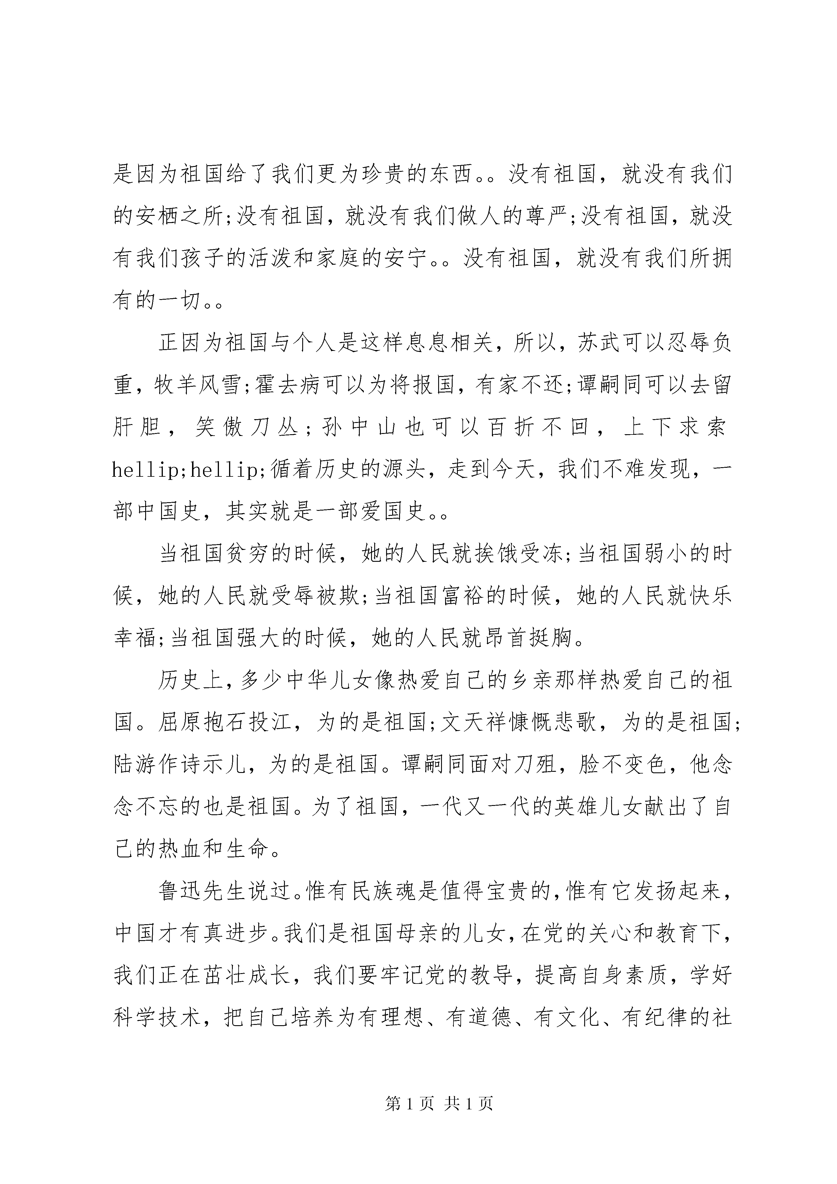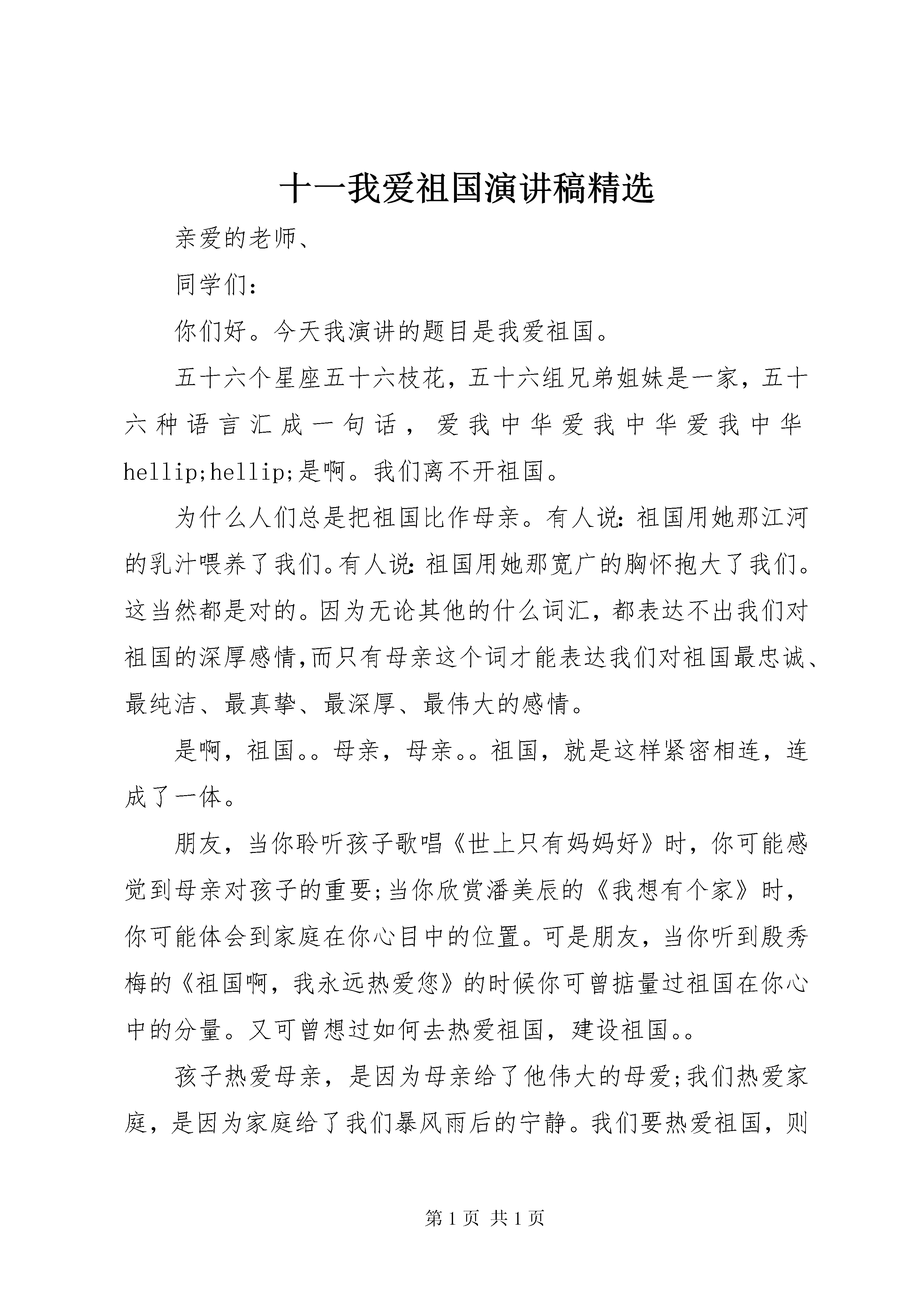 十一我爱祖国演讲稿精选亲爱的老师、同学们:你们好。今天我演讲的题目是我爱祖国。五十六个星座五十六枝花,五十六组兄弟姐妹是一家,五十六种语言汇成一句话,爱我中华爱我中华爱我中华hellip;hellip;是啊。我们离不开祖国。为什么人们总是把祖国比作母亲。有人说:祖国用她那江河的乳汁喂养了我们。有人说:祖国用她那宽广的胸怀抱大了我们。这当然都是对的。因为无论其他的什么词汇,都表达不出我们对祖国的深厚感情,而只有母亲这个词才能表达我们对祖国最忠诚、最纯洁、最真挚、最深厚、最伟大的感情。是啊,祖国。。母亲,母亲。。祖国,就是这样紧密相连,连成了一体。朋友,当你聆听孩子歌唱《世上只有妈妈好》时,你可能感觉到母亲对孩子的重要;当你欣赏潘美辰的《我想有个家》时,你可能体会到家庭在你心目中的位置。可是朋友,当你听到殷秀梅的《祖国啊,我永远热爱您》的时候你可曾掂量过祖国在你心中的分量。又可曾想过如何去热爱祖国,建设祖国。。孩子热爱母亲,是因为母亲给了他伟大的母爱;我们热爱家庭,是因为家庭给了我们暴风雨后的宁静。我们要热爱祖国,则是因为祖国给了我们更为珍贵的东西。。没有祖国,就没有我们的安栖之所;没有祖国,就没有我们做人的尊严;没有祖国,就没有我们孩子的活泼和家庭的安宁。。没有祖国,就没有我们所拥有的一切。。正因为祖国与个人是这样息息相关,所以,苏武可以忍辱负重,牧羊风雪;霍去病可以为将报国,有家不还;谭嗣同可以去留肝胆,笑傲刀丛;孙中山也可以百折不回,上下求索hellip;hellip;循着历史的源头,走到今天,我们不难发现,一部中国史,其实就是一部爱国史。。当祖国贫穷的时候,她的人民就挨饿受冻;当祖国弱小的时候,她的人民就受辱被欺;当祖国富裕的时候,她的人民就快乐幸福;当祖国强大的时候,她的人民就昂首挺胸。历史上,多少中华儿女像热爱自己的乡亲那样热爱自己的祖国。屈原抱石投江,为的是祖国;文天祥慷慨悲歌,为的是祖国;陆游作诗示儿,为的是祖国。谭嗣同面对刀殂,脸不变色,他念念不忘的也是祖国。为了祖国,一代又一代的英雄儿女献出了自己的热血和生命。鲁迅先生说过。惟有民族魂是值得宝贵的,惟有它发扬起来,中国才有真进步。我们是祖国母亲的儿女,在党的关心和教育下,我们正在茁壮成长,我们要牢记党的教导,提高自身素质,学好科学技术,把自己培养为有理想、有道德、有文化、有纪律的社会主义接班人,我们要承前起后,高举邓小平理论伟大帜旗。我们要用热血来复苏母亲的生机,用生命来焕发母亲青春的光彩吧。谢谢大家。淘,