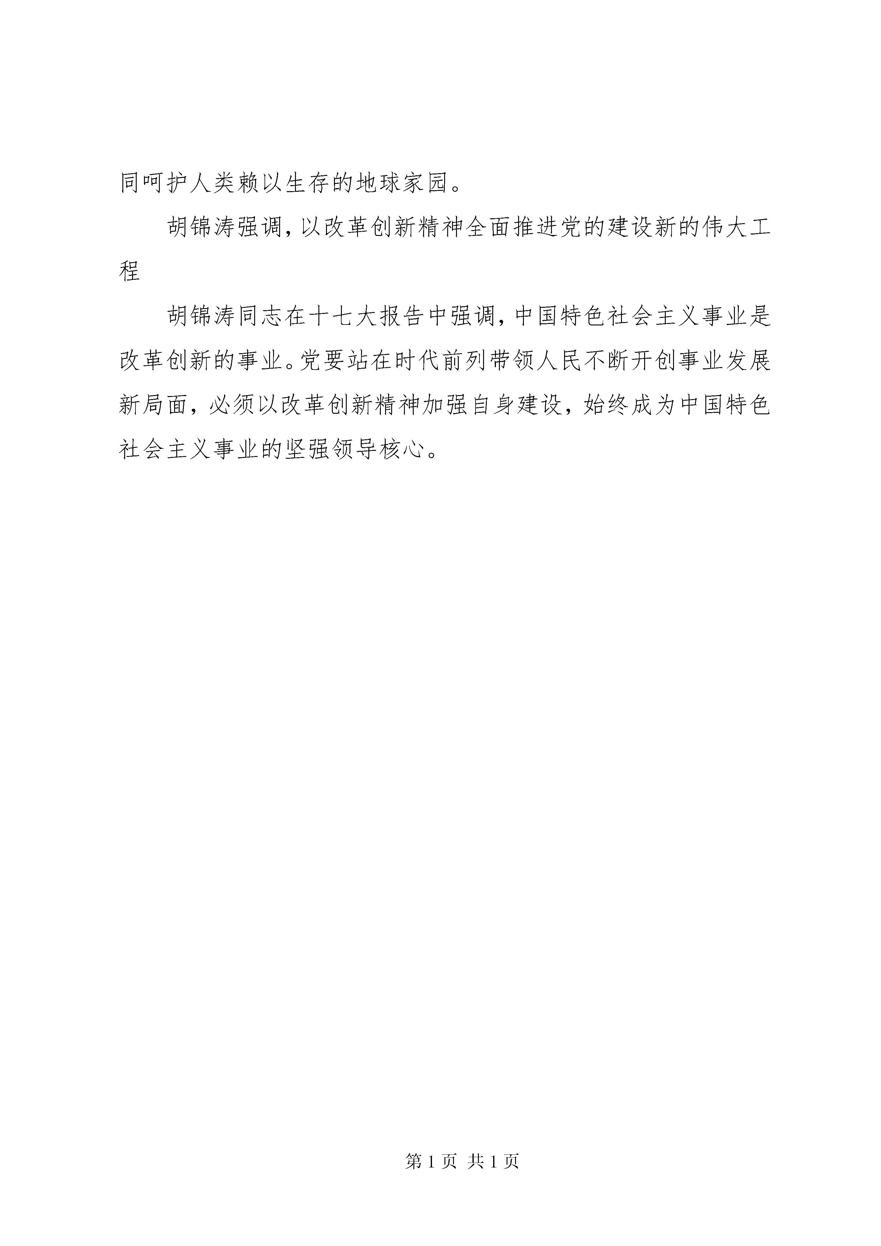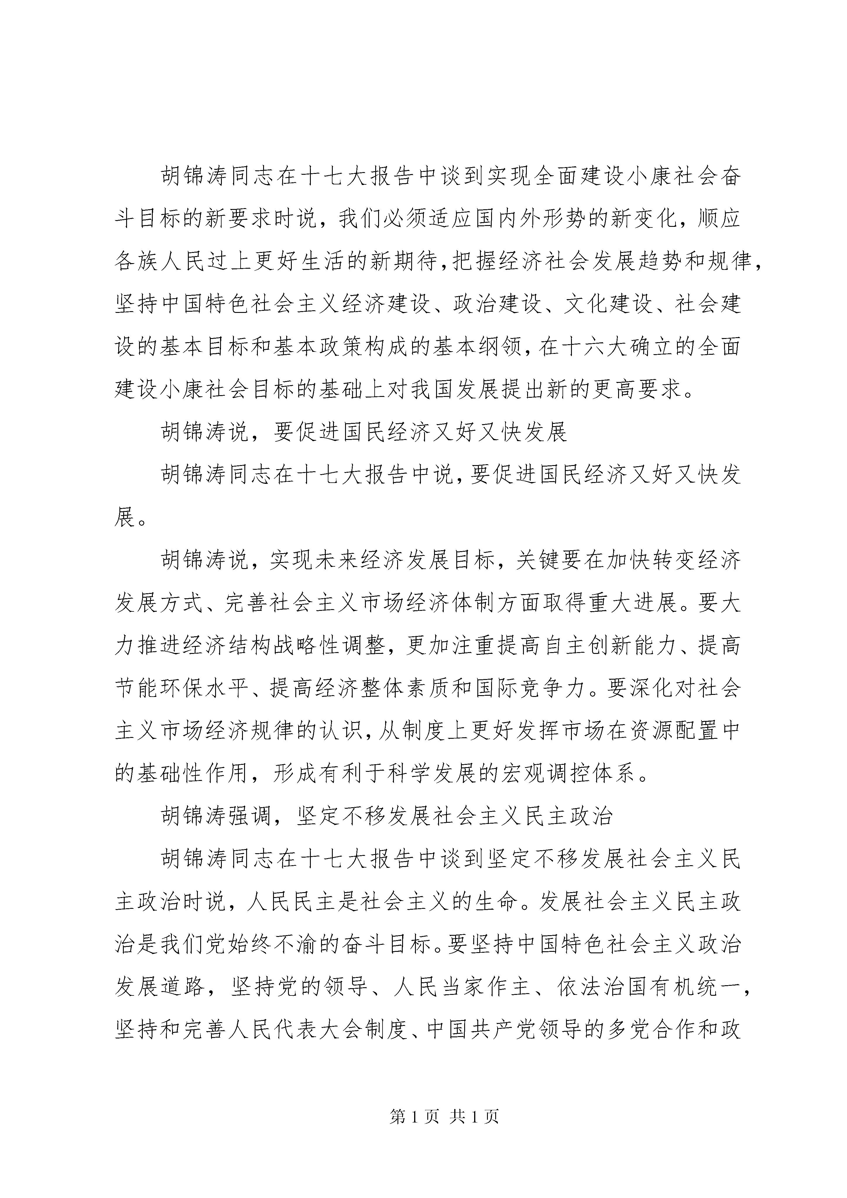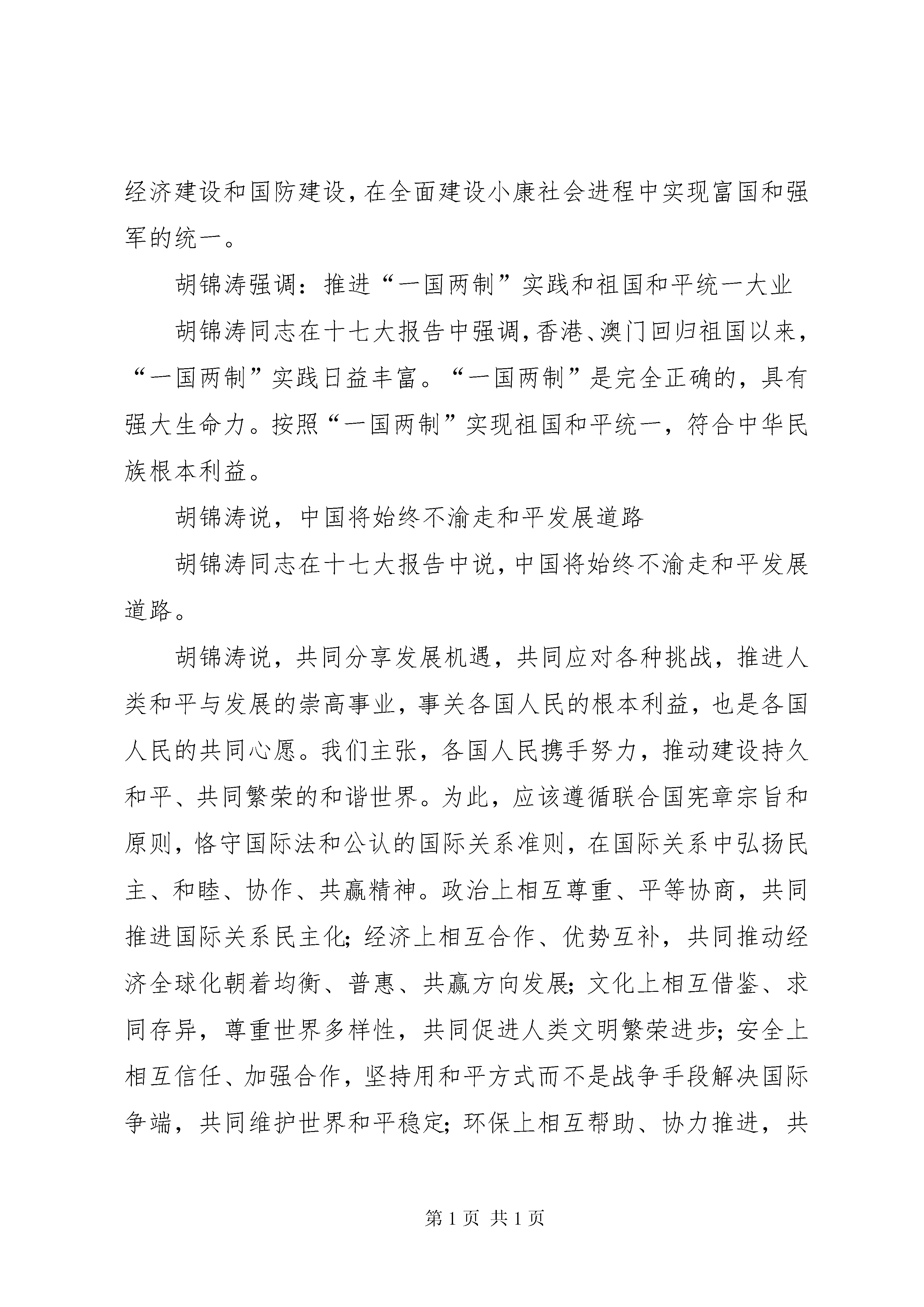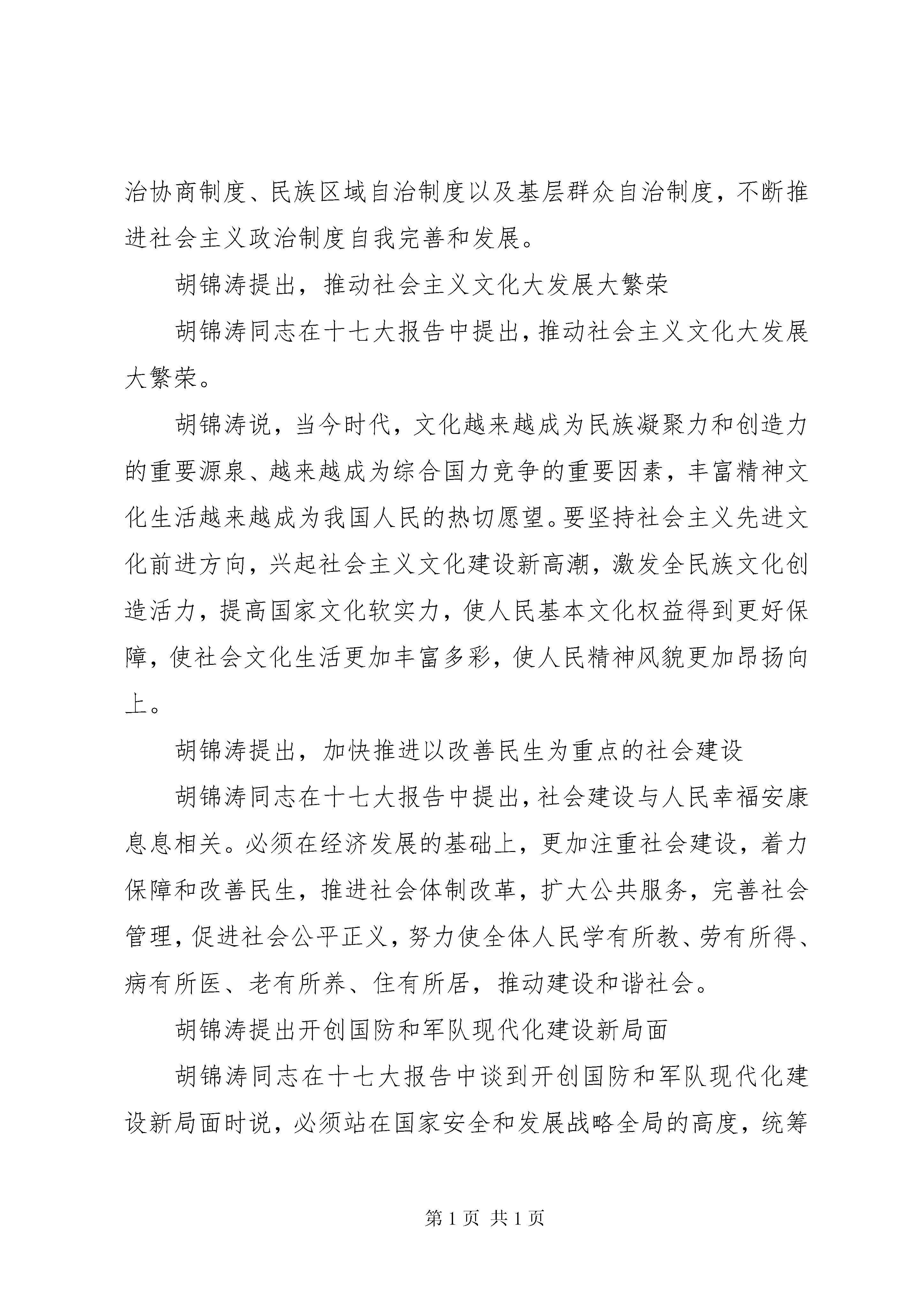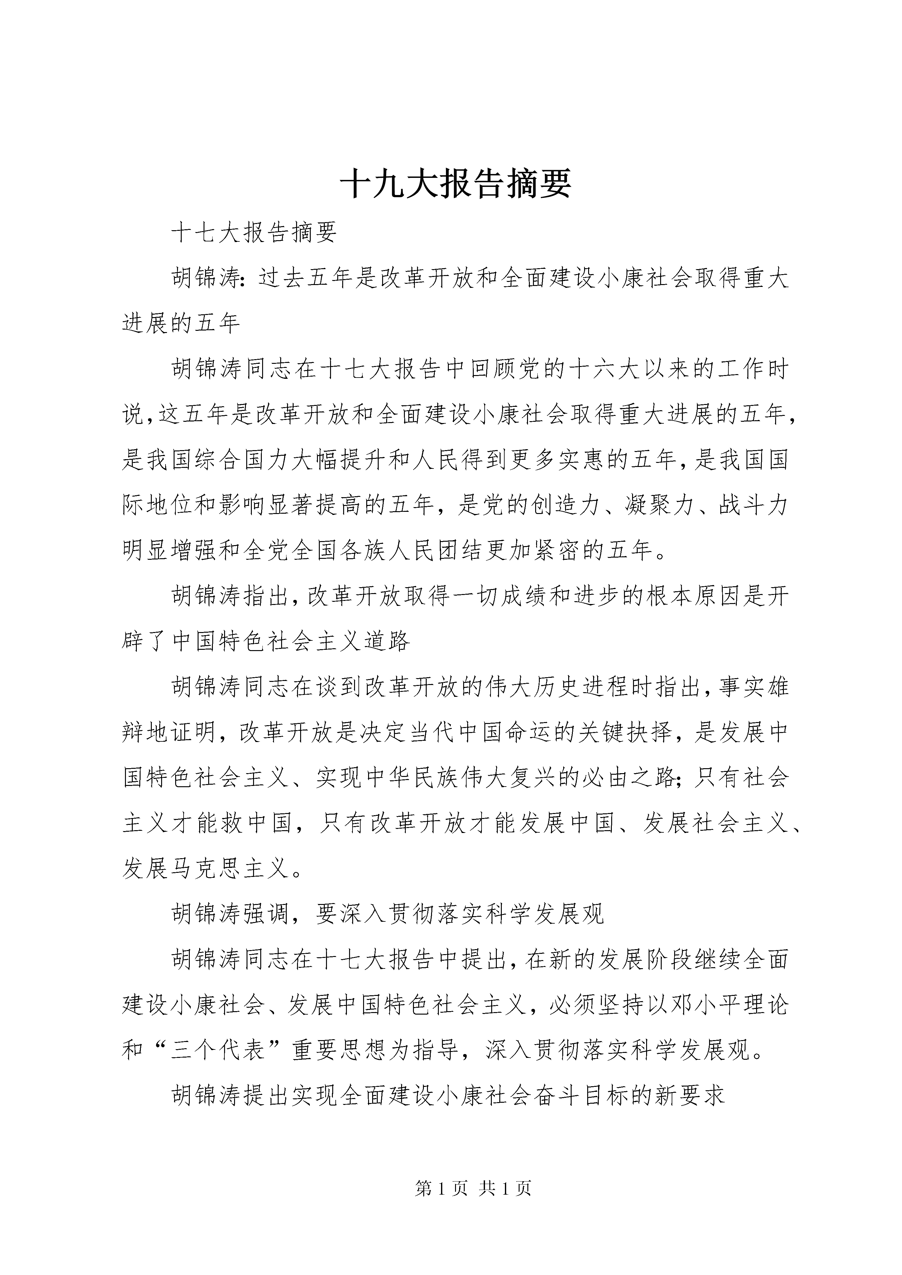 十九大报告摘要十七大报告摘要胡锦涛:过去五年是改革开放和全面建设小康社会取得重大进展的五年胡锦涛同志在十七大报告中回顾党的十六大以来的工作时说,这五年是改革开放和全面建设小康社会取得重大进展的五年,是我国综合国力大幅提升和人民得到更多实惠的五年,是我国国际地位和影响显著提高的五年,是党的创造力、凝聚力、战斗力明显增强和全党全国各族人民团结更加紧密的五年。胡锦涛指出,改革开放取得一切成绩和进步的根本原因是开辟了中国特色社会主义道路胡锦涛同志在谈到改革开放的伟大历史进程时指出,事实雄辩地证明,改革开放是决定当代中国命运的关键抉择,是发展中国特色社会主义、实现中华民族伟大复兴的必由之路;只有社会主义才能救中国,只有改革开放才能发展中国、发展社会主义、发展马克思主义。胡锦涛强调,要深入贯彻落实科学发展观胡锦涛同志在十七大报告中提出,在新的发展阶段继续全面建设小康社会、发展中国特色社会主义,必须坚持以邓小平理论和“三个代表”重要思想为指导,深入贯彻落实科学发展观。胡锦涛提出实现全面建设小康社会奋斗目标的新要求胡锦涛同志在十七大报告中谈到实现全面建设小康社会奋斗目标的新要求时说,我们必须适应国内外形势的新变化,顺应各族人民过上更好生活的新期待,把握经济社会发展趋势和规律,坚持中国特色社会主义经济建设、政治建设、文化建设、社会建设的基本目标和基本政策构成的基本纲领,在十六大确立的全面建设小康社会目标的基础上对我国发展提出新的更高要求。胡锦涛说,要促进国民经济又好又快发展胡锦涛同志在十七大报告中说,要促进国民经济又好又快发展。胡锦涛说,实现未来经济发展目标,关键要在加快转变经济发展方式、完善社会主义市场经济体制方面取得重大进展。要大力推进经济结构战略性调整,更加注重提高自主创新能力、提高节能环保水平、提高经济整体素质和国际竞争力。要深化对社会主义市场经济规律的认识,从制度上更好发挥市场在资源配置中的基础性作用,形成有利于科学发展的宏观调控体系。胡锦涛强调,坚定不移发展社会主义民主政治胡锦涛同志在十七大报告中谈到坚定不移发展社会主义民主政治时说,人民民主是社会主义的生命。发展社会主义民主政治是我们党始终不渝的奋斗目标。要坚持中国特色社会主义政治发展道路,坚持党的领导、人民当家作主、依法治国有机统一,坚持和完善人民代表大会制度、中国共产党领导的多党合作和政治协商制度、民族区域自治制度以及基层群众自治制度,不断推进社会主义政治制度自我完善和发展。胡锦涛提出,推动社会主义文化大发展大繁荣胡锦涛同志在十七大报告中提出,推动社会主义文化大发展大繁荣。胡锦涛说,当今时代,文化越来越成为民族凝聚力和创造力的重要源泉、越来越成为综合国力竞争的重要因素,丰富精神文化生活越来越成为我国人民的热切愿望。要坚持社会主义先进文化前进方向,兴起社会主义文化建设新高潮,激发全民族文化创造活力,提高国家文化软实力,使人民基本文化权益得到更好保障,使社会文化生活更加丰富多彩,使人民精神风貌更加昂扬向上。胡锦涛提出,加快推进以改善民生为重点的社会建设胡锦涛同志在十七大报告中提出,社会建设与人民幸福安康息息相关。必须在经济发展的基础上,更加注重社会建设,着力保障和改善民生,推进社会体制改革,扩大公共服务,完善社会管理,促进社会公平正义,努力使全体人民学有所教、劳有所得、病有所医、老有所养、住有所居,推动建设和谐社会。胡锦涛提出开创国防和军队现代化建设新局面胡锦涛同志在十七大报告中谈到开创国防和军队现代化建设新局面时说,必须站在国家安全和发展战略全局的高度,统筹经济建设和国防建设,在全面建设小康社会进程中实现富国和强军的统一。胡锦涛强调:推进“一国两制”实践和祖国和平统一大业胡锦涛同志在十七大报告中强调,香港、澳门回归祖国以来,“一国两制”实践日益丰富。“一国两制”是完全正确的,具有强大生命力。按照“一国两制”实现祖国和平统一,符合中华民族根本利益。胡锦涛说,中国将始终不渝走和平发展道路胡锦涛同志在十七大报告中说,中国将始终不渝走和平发展道路。胡锦涛说,共同分享发展机遇,共同应对各种挑战,推进人类和平与发展的崇高事业,事关各国人民的根本利益,也是各国人民的共同心愿。我们主张,各国人民携手努力,推动建设持久和平、共同繁荣的和谐世界。为此,应该遵循联合国宪章宗旨和原则,恪守国际法和公认的国际关系准则,在国际关系中弘扬民主、和睦、协作、共赢精神。政治上相互尊重、平等协商,共同推进国际关系民主化;经济上相互合作、优势互补,共同推动经济全球化朝着均衡、普惠、共赢方向发展;文化上相互借鉴、求同存异,尊重世界多样性,共同促进人类文明繁荣进步;安全上相互信任、加强合作,坚持用和平方式而不是战争手段解决国际争端,共同维护世界和平稳定;环保上相互帮助、协力推进,共同呵护人类赖以