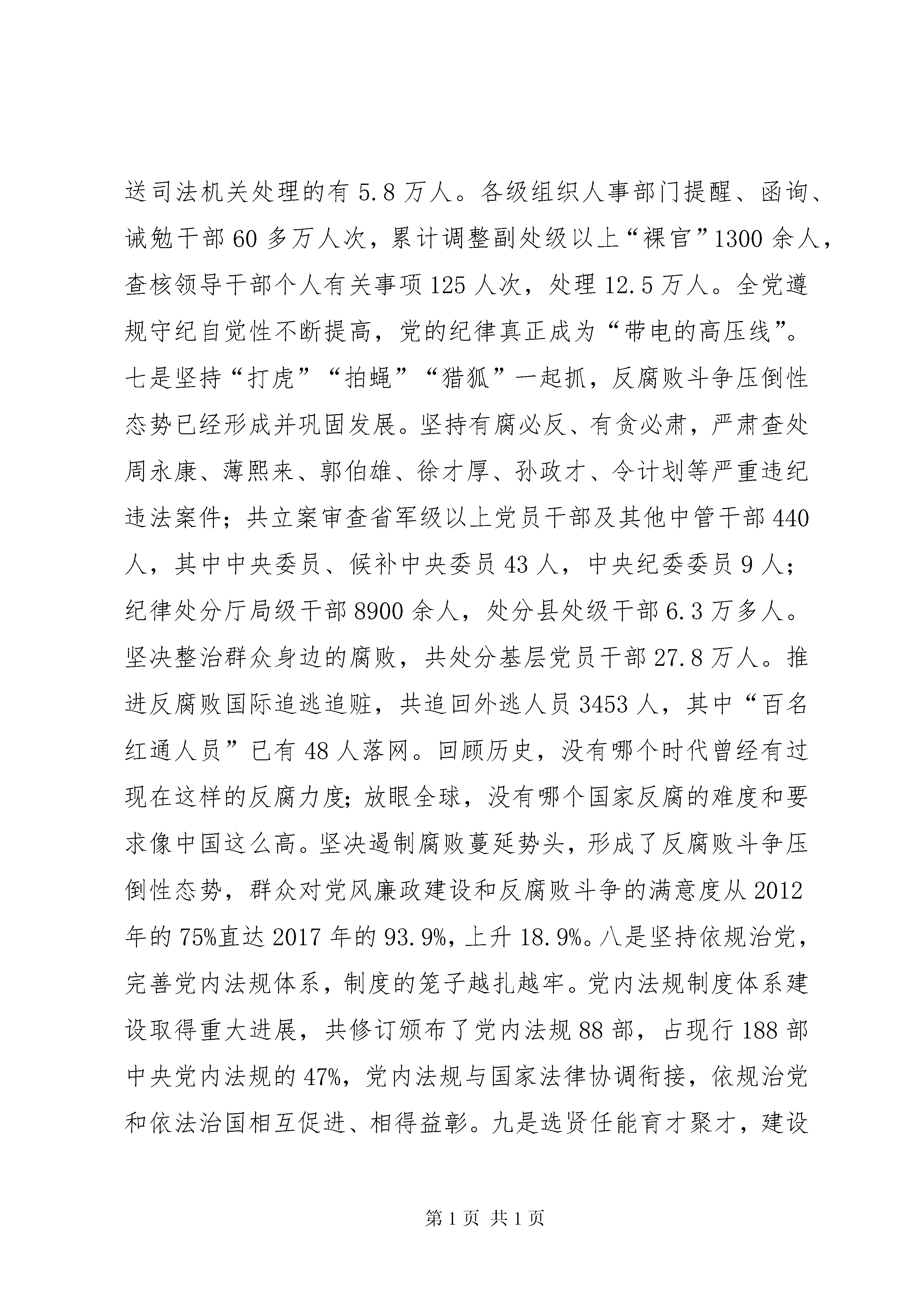 十九大报告精神宣贯讲稿下面,从两个方面与大家交流学习体会。一是充分认识五年来全面从严治党的重大成就,主要谈如何把学习贯彻十九大精神同把握党的十八大以来我们建设伟大工程、推进全面从严治党的实践贯通起来;二是全面把握十九大对新时代全面从严治党作出的新部署,主要谈如何全面、系统、深入地学懂弄通十九大对全面从严治党作出的整体部署。一、充分认识五年来全面从严治党的重大成就在党的十八大以来极不平凡、波澜壮阔的5年中,全面从严治党是十分突出的一大亮点。十九大报告评价五年来“全面从严治党成效显著”,是十个方面重大成就之一。以习近平同志为核心的党中央,靠着“不惜得罪千百人,决不辜负十三亿”的政治魄力和历史担当,兑现“打铁还要自身硬”的庄严承诺,统揽推进伟大斗争、伟大工程、伟大事业、伟大梦想,将全面从严治党纳入“四个全面”战略布局,正风肃纪反腐,挽狂澜于既倒,解决了一大批党内存在多年的顽瘴痼疾和人民群众反映强烈、对党的执政基础威胁较大的突出问题,从根本上扭转了党的领导弱化、党的建设缺失、全面从严治党不力的状况,赢得了人民群众对党的信心、信任和信赖,开辟了管党治党新境界,为党和国家事业取得全方位开创性成就、发生深层次根本性变革提供了坚强保证。具体来看,可以从以下十个方面把握。一是勇于使命担当,砥砺形成坚强领导核心。十八届六中全会确立习近平同志为党中央的核心、全党的核心,正式提出“以习近平同志为核心的党中央”。这是中国共产党的郑重抉择,是党心军心民心所向,是国家之幸、人民之福,对维护党中央权威和党的集中统一领导,保证党和国家兴旺发达、长治久安,具有十分重大而深远的意义。二是着力提高政治站位,维护党中央权威和集中统一领导更加自觉坚定。坚持和加强党的领导特别是坚决维护以习近平同志为核心的党中央集中统一领导,党的创造力、凝聚力、战斗力和领导力、号召力显著增强,为党和国家事业未来发展奠定了长远基础。广大党员干部自觉向以习近平同志为核心的党中央看齐,政治警觉性和政治鉴别力进一步增强。三是实现思想建党和制度治党相结合,党内政治生活呈现出新气象。始终把思想建党摆在首位,深入开展群众路线教育实践活动、“三严三实”专题教育,推进“两学一做”学习教育常态化制度化,推动全党增强“四个意识”,坚定“四个自信”。始终把严肃党内政治生活作为根本性基础性工作,严明政治纪律和政治规矩,党内政治生活面貌一新,党内政治生态得到净化。四是锲而不舍落实中央八项规定精神,以党的作风转变引领社会风气变革。从落实八项规定破题,从解决人民群众反映最强烈的“四风”入手,中央政治局以身作则、以上率下,全党踏石留印、抓铁有痕,刹住了一些曾被认为不可能刹住的歪风邪气,攻克了一些过去司空见惯的官场陋习和作风难题,极大地提升了党在人民群众中的形象和威信。5年来,全国共查处违反中央八项规定精神问题17.61万起,处理党员干部23.9万人,给予党纪政纪处分12.8万人,平均每天约有140人受处理。国家统计局社情民意调查显示,94.8%的受访者肯定中央八项规定成效,85.5%认为身边党员干部工作作风有改进,89.5%认为党员干部工作作风带动社会风气改进。中央八项规定已经成为适用全党、家喻户晓的热词,成为改变中国政治生态和社会面貌的标志性话语。五是强化党内监督,巡视利剑作用彰显,实现一届任期全覆盖。构建了党中央统一领导、党委(党组)全面监督、纪律检查机关专责监督、基层组织日常监督、党员民主监督的党内监督体系。发挥巡视利剑作用,中央巡视开展12轮、共巡视277个党组织,对16个省区市开展巡视“回头看”,对4个中央单位进行“机动式”巡视,首次实现一届任期巡视全覆盖。同时,深化纪律检查体制改革,推进双重领导体制具体化、程序化、制度化。设立47家派驻中央一级党和国家部委纪检组,实现中央纪委派驻监督全覆盖。深化国家监察体制改革,完善党和国家自我监督体系。六是全面加强纪律建设,推动管党治党从“宽松软”走向“严紧硬”。实现纪法分开,使纪律真正严起来立起来,执行到位。创新执纪方式,实践监督执纪“四种形态”,抓早抓小、层层设防。五年来,全国纪检监察机关共处置问题线索267.4万件,立案154.5万件,处分153.7万人,涉嫌犯罪被移送司法机关处理的有5.8万人。各级组织人事部门提醒、函询、诫勉干部60多万人次,累计调整副处级以上“裸官”1300余人,查核领导干部个人有关事项125人次,处理12.5万人。全党遵规守纪自觉性不断提高,党的纪律真正成为“带电的高压线”。七是坚持“打虎”“拍蝇”“猎狐”一起抓,反腐败斗争压倒性态势已经形成并巩固发展。坚持有腐必反、有贪必肃,严肃查处周永康、薄熙来、郭伯雄、徐才厚、孙政才、令计划等严重违纪违法案件;共立案审查省军级以上党员干部及其他中管干部440人,其中中央委员、候补中