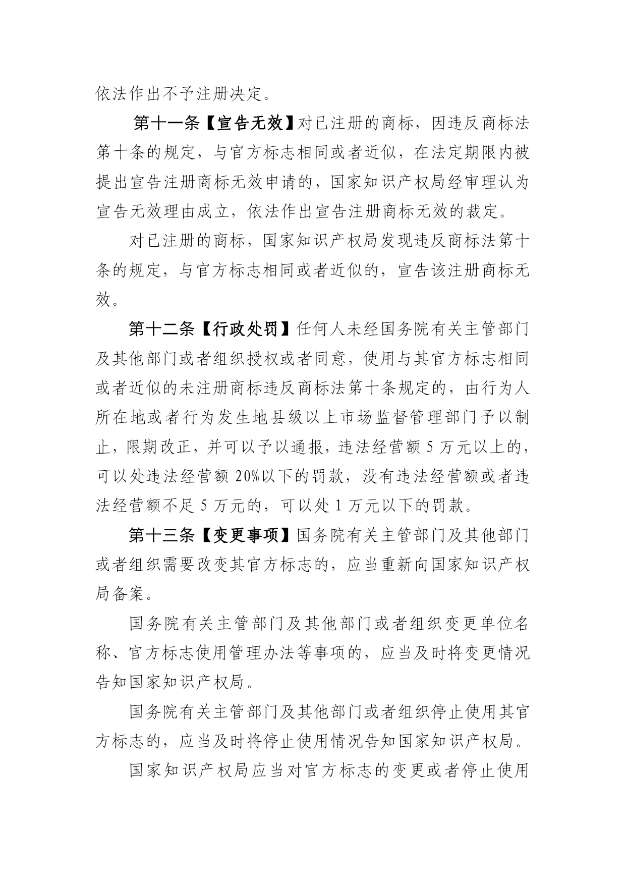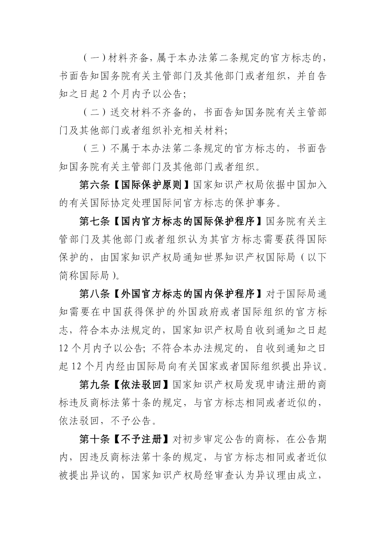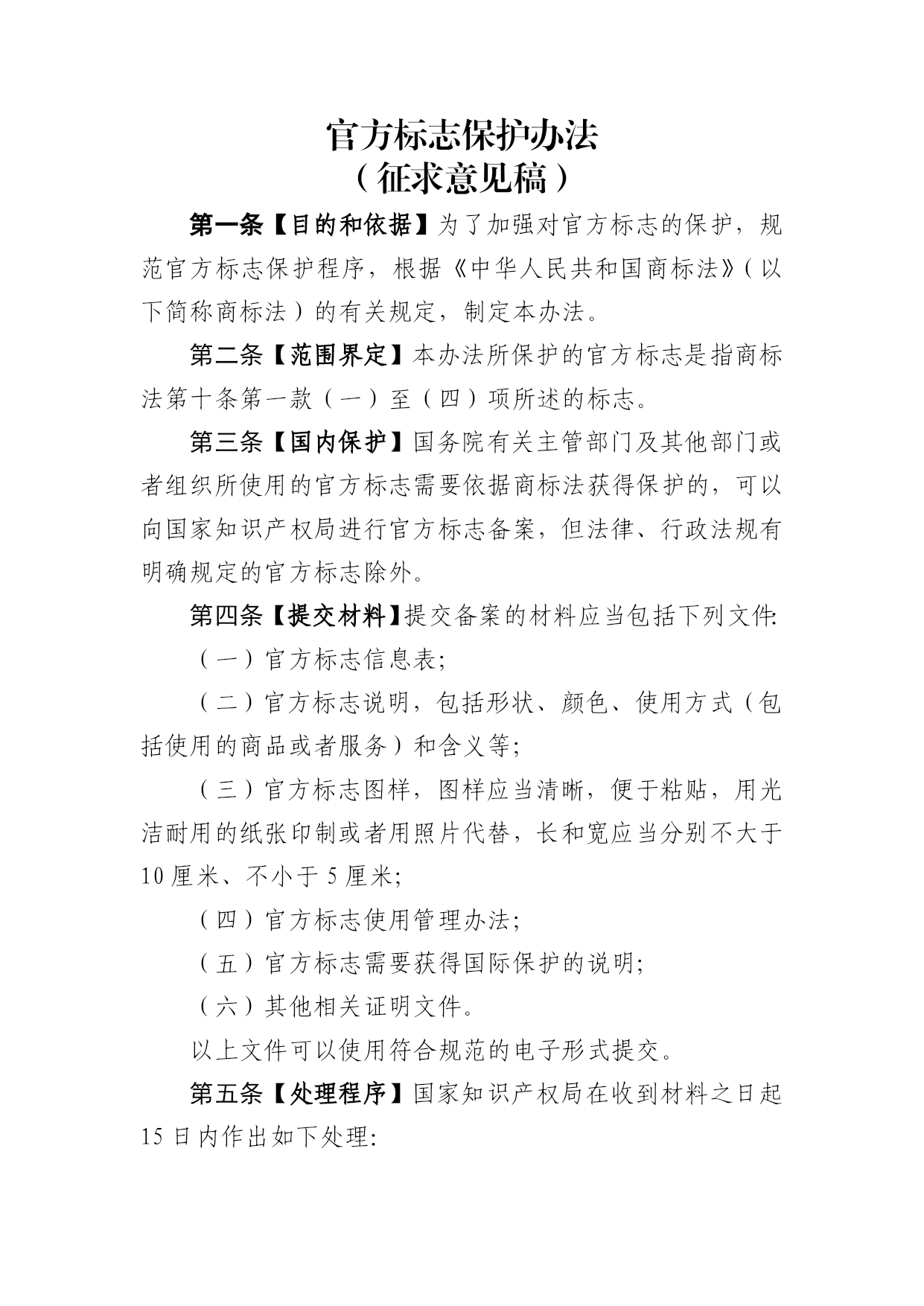官方标志保护办法 (征求意见稿) 第一条【目的和依据】为了加强对官方标志的保护,规范官方标志保护程序,根据《中华人民共和国商标法》(以下简称商标法)的有关规定,制定本办法。 第二条【范围界定】本办法所保护的官方标志是指商标法第十条第一款(一)至(四)项所述的标志。 第三条【国内保护】国务院有关主管部门及其他部门或者组织所使用的官方标志需要依据商标法获得保护的,可以向国家知识产权局进行官方标志备案,但法律、行政法规有明确规定的官方标志除外。 第四条【提交材料】提交备案的材料应当包括下列文件: (一)官方标志信息表; (二)官方标志说明,包括形状、颜色、使用方式(包括使用的商品或者服务)和含义等; (三)官方标志图样,图样应当清晰,便于粘贴,用光洁耐用的纸张印制或者用照片代替,长和宽应当分别不大于10厘米、不小于5厘米; (四)官方标志使用管理办法; (五)官方标志需要获得国际保护的说明; (六)其他相关证明文件。 以上文件可以使用符合规范的电子形式提交。 第五条【处理程序】国家知识产权局在收到材料之日起15日内作出如下处理: (一)材料齐备,属于本办法第二条规定的官方标志的,书面告知国务院有关主管部门及其他部门或者组织,并自告知之日起2个月内予以公告; (二)送交材料不齐备的,书面告知国务院有关主管部门及其他部门或者组织补充相关材料; (三)不属于本办法第二条规定的官方标志的,书面告知国务院有关主管部门及其他部门或者组织。 第六条【国际保护原则】国家知识产权局依据中国加入的有关国际协定处理国际间官方标志的保护事务。 第七条【国内官方标志的国际保护程序】国务院有关主管部门及其他部门或者组织认为其官方标志需要获得国际保护的,由国家知识产权局通知世界知识产权国际局(以下简称国际局)。 第八条【外国官方标志的国内保护程序】对于国际局通知需要在中国获得保护的外国政府或者国际组织的官方标志,符合本办法规定的,国家知识产权局自收到通知之日起12个月内予以公告;不符合本办法规定的,自收到通知之日起12个月内经由国际局向有关国家或者国际组织提出异议。 第九条【依法驳回】国家知识产权局发现申请注册的商标违反商标法第十条的规定,与官方标志相同或者近似的,依法驳回,不予公告。 第十条【不予注册】对初步审定公告的商标,在公告期内,因违反商标法第十条的规定,与官方标志相同或者近似被提出异议的,国家知识产权局经审查认为异议理由成立,依法作出不予注册决定。 第十一条【宣告无效】对已注册的商标,因违反商标法第十条的规定,与官方标志相同或者近似,在法定期限内被提出宣告注册商标无效申请的,国家知识产权局经审理认为宣告无效理由成立,依法作出宣告注册商标无效的裁定。 对已注册的商标,国家知识产权局发现违反商标法第十条的规定,与官方标志相同或者近似的,宣告该注册商标无效。 第十二条【行政处罚】任何人未经国务院有关主管部门及其他部门或者组织授权或者同意,使用与其官方标志相同或者近似的未注册商标违反商标法第十条规定的,由行为人所在地或者行为发生地县级以上市场监督管理部门予以制止,限期改正,并可以予以通报,违法经营额5万元以上的,可以处违法经营额20%以下的罚款,没有违法经营额或者违法经营额不足5万元的,可以处1万元以下的罚款。 第十三条【变更事项】国务院有关主管部门及其他部门或者组织需要改变其官方标志的,应当重新向国家知识产权局备案。 国务院有关主管部门及其他部门或者组织变更单位名称、官方标志使用管理办法等事项的,应当及时将变更情况告知国家知识产权局。 国务院有关主管部门及其他部门或者组织停止使用其官方标志的,应当及时将停止使用情况告知国家知识产权局。 国家知识产权局应当对官方标志的变更或者停止使用事项予以公告。 第十四条本办法自年月日起实施。
