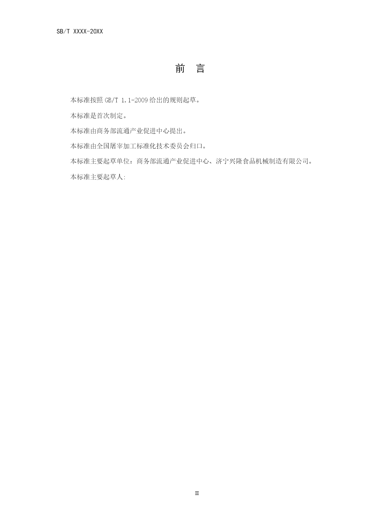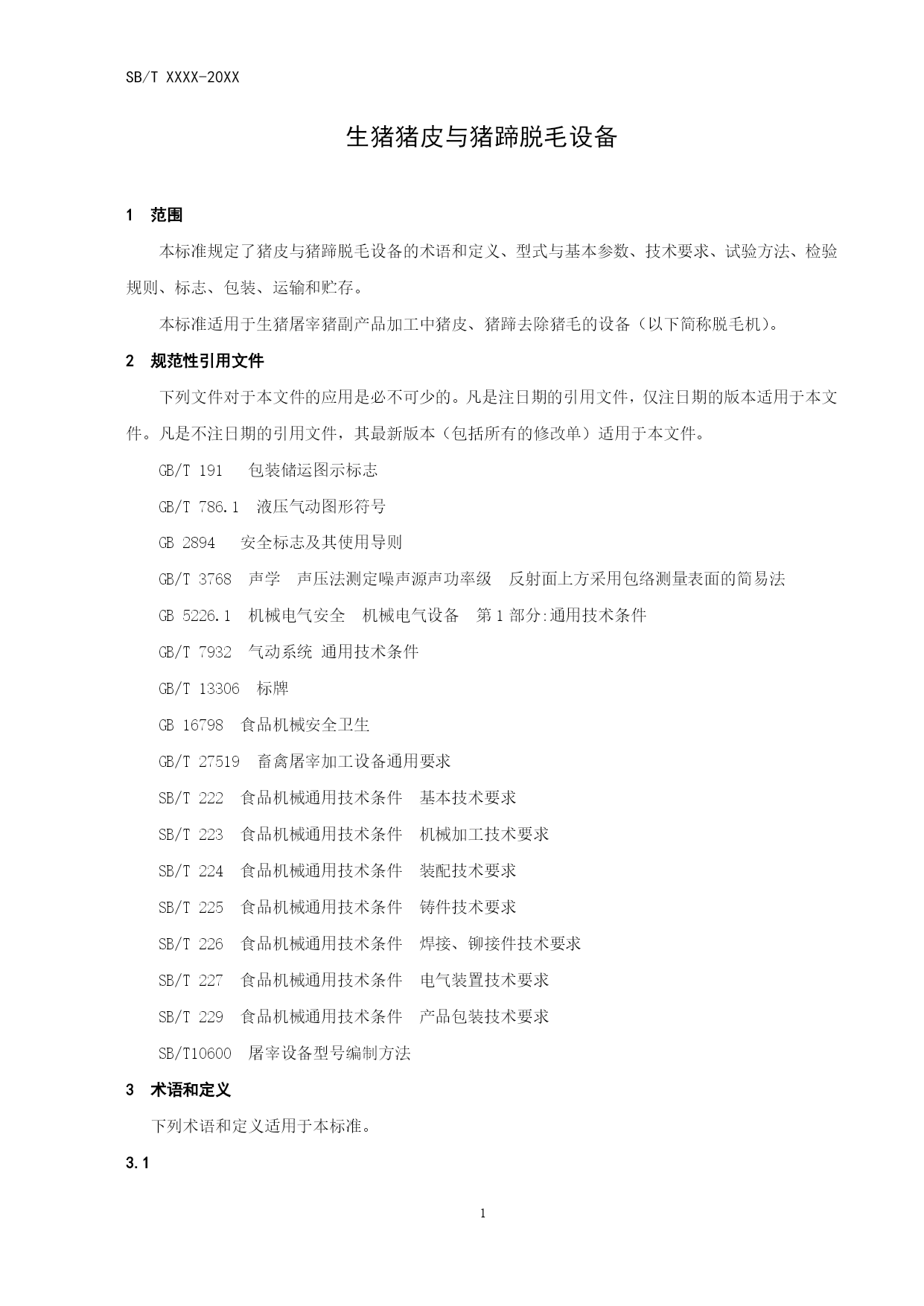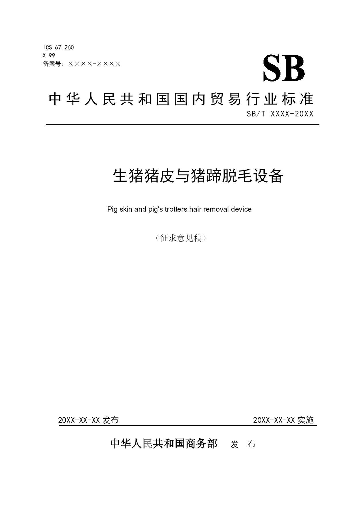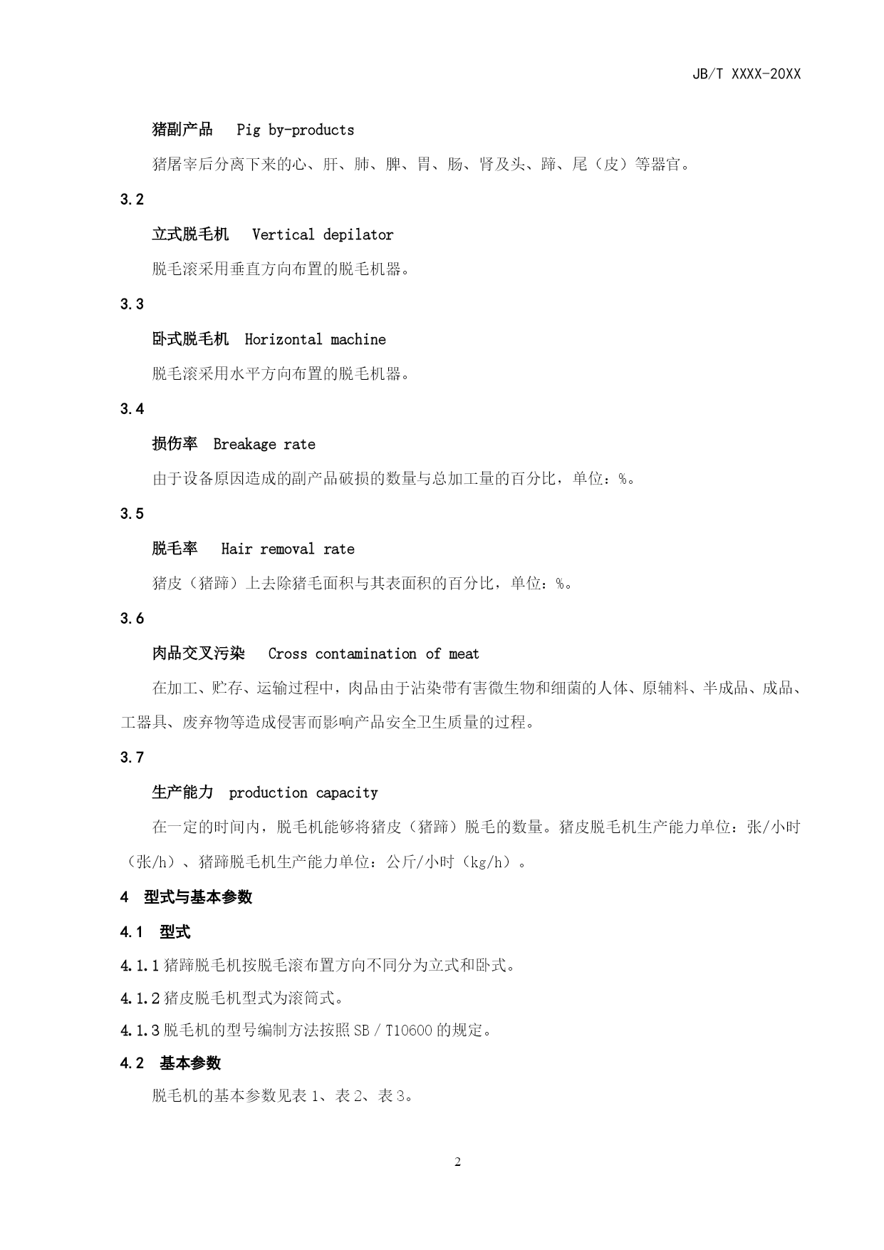 JB/TXXXX-20XX JB/TXXXX-20XX ICS67.260 X99 备案号:××××-×××× 中华人民共和国国内贸易行业标准 SB/TXXXX-20XX 生猪猪皮与猪蹄脱毛设备 Pigskinandpig'strottershairremovaldevice (征求意见稿) 20XX-XX-XX发布20XX-XX-XX实施 中华人民共和国商务部发布 SB/TXXXX-20XX PAGEI PAGEI 目次 TOC\o"1-2"\h\z\uHYPERLINK\l"_Toc260382854"前言 PAGEREF_Toc260382854\hII HYPERLINK\l"_Toc260382855"1范围 PAGEREF_Toc260382855\h1 HYPERLINK\l"_Toc260382856"2规范性引用文件 PAGEREF_Toc260382856\h1 HYPERLINK\l"_Toc260382857"3术语和定义 1 HYPERLINK\l"_Toc260382858"4型式与基本参数 PAGEREF_Toc260382858\h2 HYPERLINK\l"_Toc260382861"5技术要求 PAGEREF_Toc260382861\h3 HYPERLINK\l"_Toc260382862"6试验方法 4 HYPERLINK\l"_Toc260382863"7检验规则 6 HYPERLINK\l"_Toc260382864"8标志、包装、运输和贮存 6 前言 本标准按照GB/T1.1-2009给出的规则起草。 本标准是首次制定。 本标准由商务部流通产业促进中心提出。 本标准由全国屠宰加工标准化技术委员会归口。 本标准主要起草单位:商务部流通产业促进中心、济宁兴隆食品机械制造有限公司。 本标准主要起草人: 生猪猪皮与猪蹄脱毛设备 1范围 本标准规定了猪皮与猪蹄脱毛设备的术语和定义、型式与基本参数、技术要求、试验方法、检验规则、标志、包装、运输和贮存。 本标准适用于生猪屠宰猪副产品加工中猪皮、猪蹄去除猪毛的设备(以下简称脱毛机)。 2规范性引用文件 下列文件对于本文件的应用是必不可少的。凡是注日期的引用文件,仅注日期的版本适用于本文件。凡是不注日期的引用文件,其最新版本(包括所有的修改单)适用于本文件。 GB/T191包装储运图示标志 GB/T786.1液压气动图形符号 GB2894安全标志及其使用导则 GB/T3768声学声压法测定噪声源声功率级反射面上方采用包络测量表面的简易法 GB5226.1机械电气安全机械电气设备第1部分:通用技术条件 GB/T7932气动系统通用技术条件 GB/T13306标牌 GB16798食品机械安全卫生 GB/T27519畜禽屠宰加工设备通用要求 SB/T222食品机械通用技术条件基本技术要求 SB/T223食品机械通用技术条件机械加工技术要求 SB/T224食品机械通用技术条件装配技术要求 SB/T225食品机械通用技术条件铸件技术要求 SB/T226食品机械通用技术条件焊接、铆接件技术要求 SB/T227食品机械通用技术条件电气装置技术要求 SB/T229食品机械通用技术条件产品包装技术要求 SB/T10600屠宰设备型号编制方法 3术语和定义 下列术语和定义适用于本标准。 3.1 猪副产品Pigby-products 猪屠宰后分离下来的心、肝、肺、脾、胃、肠、肾及头、蹄、尾(皮)等器官。 3.2 立式脱毛机Verticaldepilator 脱毛滚采用垂直方向布置的脱毛机器。 3.3 卧式脱毛机Horizontalmachine 脱毛滚采用水平方向布置的脱毛机器。 3.4 损伤率Breakagerate 由于设备原因造成的副产品破损的数量与总加工量的百分比,单位:%。 3.5 脱毛率Hairremovalrate 猪皮(猪蹄)上去除猪毛面积与其表面积的百分比,单位:%。 3.6 肉品交叉污染Crosscontaminationofmeat 在加工、贮存、运输过程中,肉品由于沾染带有害微生物和细菌的人体、原辅料、半成品、成品、工器具、废弃物等造成侵害而影响产品安全卫生质量的过程。 3.7 生产能力productioncapacity 在一定的时间内,脱毛机能够将猪皮(猪蹄)脱毛的数量。猪皮脱毛机生产能力单位:张/小时(张/h)、猪蹄脱毛机生产能力单位:公斤/小时(kg/h)。 4型式与基本参数 4.1型式 4.1.1猪蹄脱毛