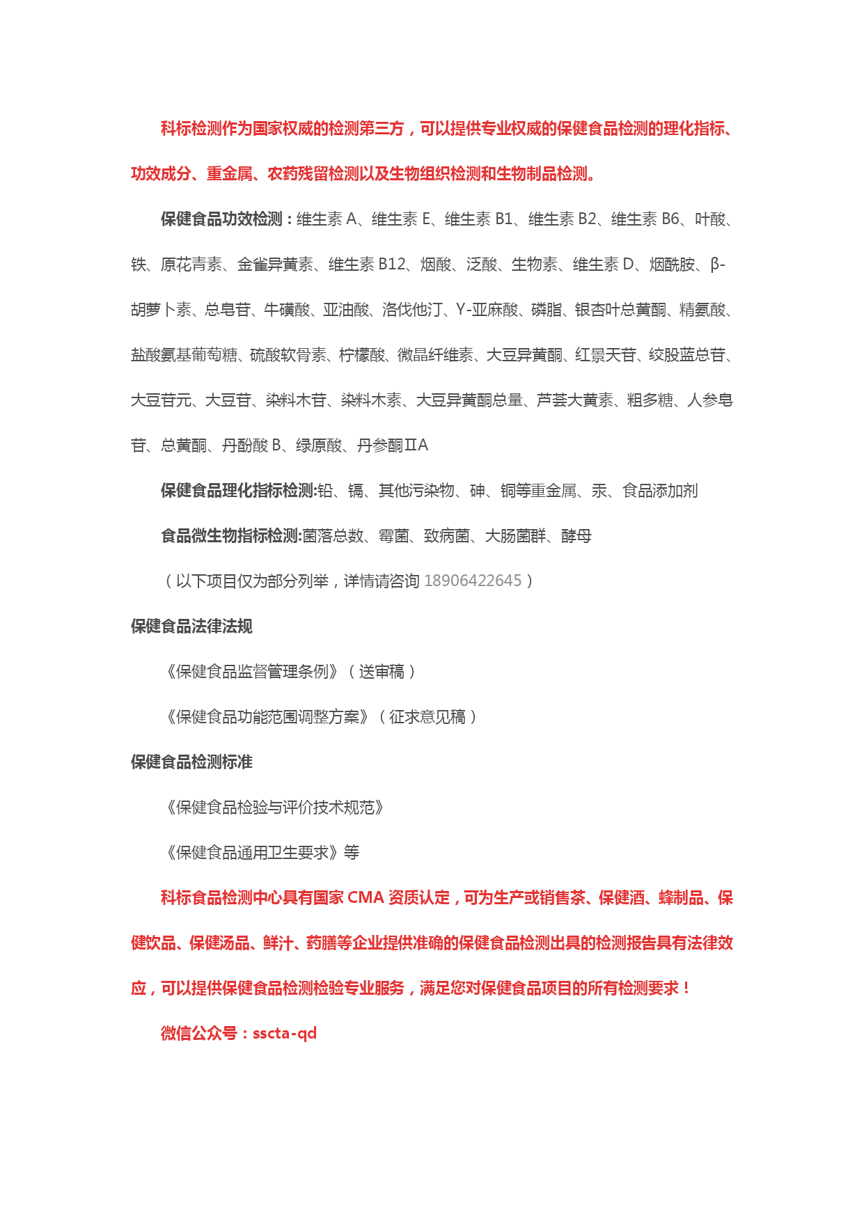 科标检测作为国家权威的检测第三方,可以提供专业权威的保健食品检测的理化指标、功效成分、重金属、农药残留检测以及生物组织检测和生物制品检测。 保健食品功效检测:维生素A、维生素E、维生素B1、维生素B2、维生素B6、叶酸、铁、原花青素、金雀异黄素、维生素B12、烟酸、泛酸、生物素、维生素D、烟酰胺、β-胡萝卜素、总皂苷、牛磺酸、亚油酸、洛伐他汀、Y-亚麻酸、磷脂、银杏叶总黄酮、精氨酸、盐酸氨基葡萄糖、硫酸软骨素、柠檬酸、微晶纤维素、大豆异黄酮、红景天苷、绞股蓝总苷、大豆苷元、大豆苷、染料木苷、染料木素、大豆异黄酮总量、芦荟大黄素、粗多糖、人参皂苷、总黄酮、丹酚酸B、绿原酸、丹参酮ⅡA 保健食品理化指标检测:铅、镉、其他污染物、砷、铜等重金属、汞、食品添加剂 食品微生物指标检测:菌落总数、霉菌、致病菌、大肠菌群、酵母 (以下项目仅为部分列举,详情请咨询18906422645)保健食品法律法规 《保健食品监督管理条例》(送审稿) 《保健食品功能范围调整方案》(征求意见稿)保健食品检测标准 《保健食品检验与评价技术规范》 《保健食品通用卫生要求》等 科标食品检测中心具有国家CMA资质认定,可为生产或销售茶、保健酒、蜂制品、保健饮品、保健汤品、鲜汁、药膳等企业提供准确的保健食品检测出具的检测报告具有法律效应,可以提供保健食品检测检验专业服务,满足您对保健食品项目的所有检测要求! 微信公众号:sscta-qd