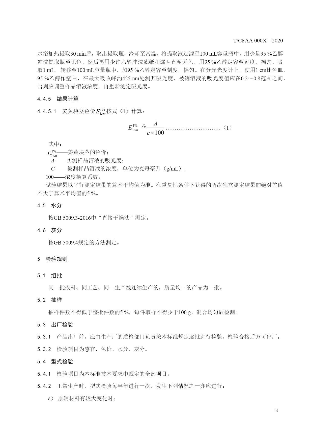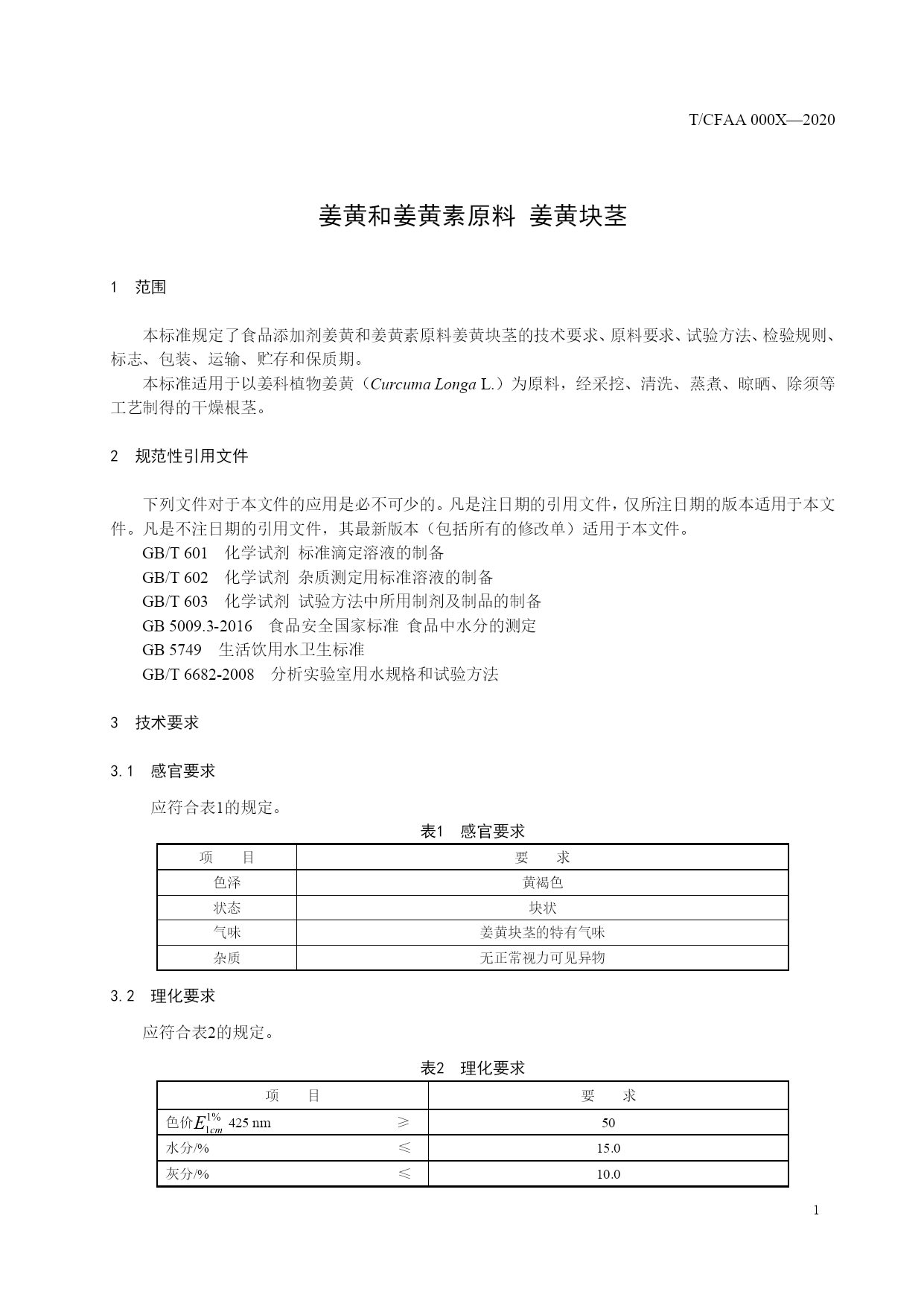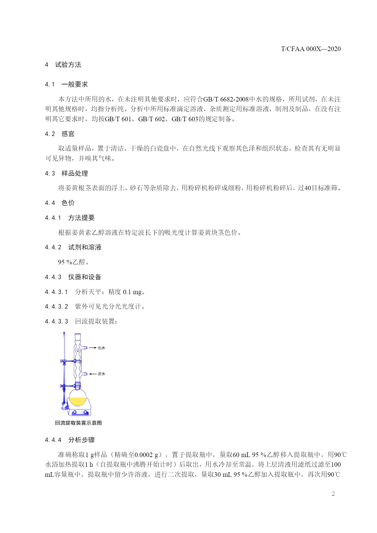 Q/JLS02-2005 PAGEI T/CFAA000X—2020 中国食品添加剂和配料协会团体标准 ICS67.220.20 B38 中国食品添加剂和配料协会发布 姜黄和姜黄素原料姜黄块茎 TurmericandcurcuminrawmaterialTurmerictuber 20××-××-××实施 20××-××-××发布 T/CFAA000X—2020 PAGE\*MERGEFORMAT4 前 言 本标准按照GB/T1.1-2020给出的规则起草。 本标准由中国食品添加剂和配料协会着色剂专业委员会提出。 本标准由中国食品添加剂和配料协会团体标准技术委员会归口。 本标准起草单位:河北昱华生物科技有限公司、邢台红日生物科技有限公司、河北天旭生物科技有限公司、××××。 本标准主要起草人:××××。 本标准为首次发布。 姜黄和姜黄素原料姜黄块茎 范围 本标准规定了食品添加剂姜黄和姜黄素原料姜黄块茎的技术要求、原料要求、试验方法、检验规则、标志、包装、运输、贮存和保质期。 本标准适用于以姜科植物姜黄(CurcumaLongaL.)为原料,经采挖、清洗、蒸煮、晾晒、除须等工艺制得的干燥根茎。 规范性引用文件 下列文件对于本文件的应用是必不可少的。凡是注日期的引用文件,仅所注日期的版本适用于本文件。凡是不注日期的引用文件,其最新版本(包括所有的修改单)适用于本文件。 GB/T601化学试剂标准滴定溶液的制备 GB/T602化学试剂杂质测定用标准溶液的制备 GB/T603化学试剂试验方法中所用制剂及制品的制备 GB5009.3-2016食品安全国家标准食品中水分的测定 GB5749生活饮用水卫生标准 GB/T6682-2008分析实验室用水规格和试验方法 技术要求 感官要求 应符合表1的规定。 感官要求 项目要求色泽黄褐色状态块状气味姜黄块茎的特有气味杂质无正常视力可见异物理化要求 应符合表2的规定。 理化要求 项目要求色价425nm≥50水分/%≤15.0灰分/%≤10.0试验方法 一般要求 本方法中所用的水,在未注明其他要求时,应符合GB/T6682-2008中水的规格,所用试剂,在未注明其他规格时,均指分析纯。分析中所用标准滴定溶液、杂质测定用标准溶液、制剂及制品,在没有注明其它要求时,均按GB/T601、GB/T602、GB/T603的规定制备。 感官 取适量样品,置于清洁、干燥的白瓷盘中,在自然光线下观察其色泽和组织状态,检查其有无明显可见异物,并嗅其气味。 样品处理 将姜黄根茎表面的浮土、砂石等杂质除去,用粉碎机粉碎成细粉,用粉碎机粉碎后,过40目标准筛。 色价 方法提要 根据姜黄素乙醇溶液在特定波长下的吸光度计算姜黄块茎色价。 试剂和溶液 95%乙醇。 仪器和设备 分析天平:精度0.1mg。 紫外可见光分光光度计。 回流提取装置: 分析步骤 准确称取1g样品(精确至0.0002g),置于提取瓶中,量取60mL95%乙醇移入提取瓶中,用90℃水浴加热提取1h(自提取瓶中沸腾开始计时)后取出,用水冷却至常温,将上层清液用滤纸过滤至100mL容量瓶中,提取瓶中留少许溶液,进行二次提取,量取30mL95%乙醇加入提取瓶中,再次用90℃水浴加热提取30min后,取出提取瓶,冷却至常温,将提取液过滤至100mL容量瓶中,用少量95%乙醇冲洗提取瓶至无色,然后再用少许乙醇冲洗滤纸和漏斗直至无色,用95%乙醇定容至刻度,摇匀。吸取1mL,转移至100mL容量瓶中,加95%乙醇定容至刻度,摇匀。在分光光度计上,使用1cm比色皿,95%乙醇作空白,在最大吸收峰约425nm处测其吸光度,被测溶液的吸光度值应在0.2~0.8范围之间,否则应调整样品溶液浓度,再重新测定吸光度。 结果计算 姜黄块茎色价按式(1)计算: …………………………(1) 式中: ——姜黄块茎的色价; A——实测样品溶液的吸光度; C——被测样品溶液的浓度,单位为克每毫升(g/mL); 100——浓度换算系数。 试验结果以平行测定结果的算术平均值为准。在重复性条件下获得的两次独立测定结果的绝对差值不大于算术平均值的5%。 水分 按GB5009.3-2016中“直接干燥法”测定。 灰分 按GB5009.4规定的方法测定。 检验规则 组批 同一批投料、同工艺、同一生产线连续生产的,质量均一的产品为一批。 抽样 抽样件数不得低于整批件数的5%,每件取样不得少于100g,混合均匀后检测。 出厂检验 产品出厂前,应由生产厂的质检部门负责按本标准规定逐批进行检验,检验合格后方可出厂。 检验项目为感官、色价、水分、灰分。 型式检验 检验项目为本标准技术要求中规定的全部项目。 正常生产时,型式检验每半年进行一次,发生下列情况之一亦应进行: 原辅材料