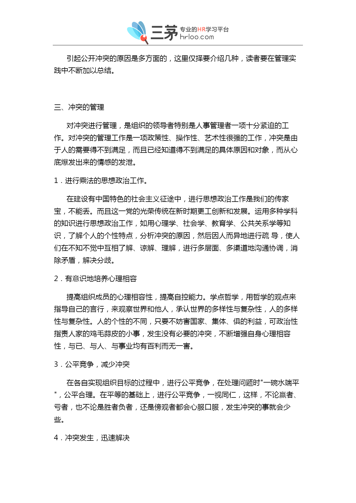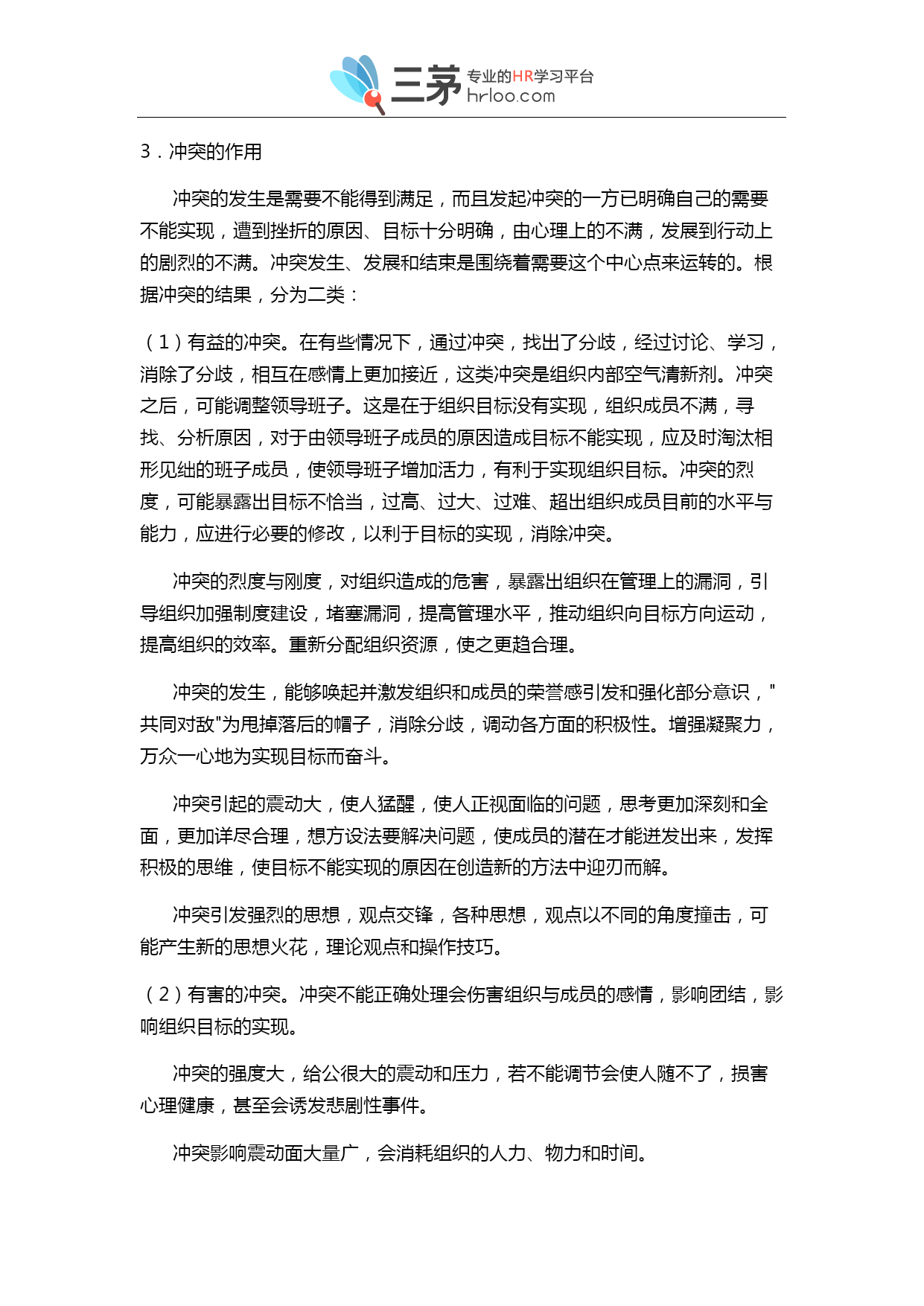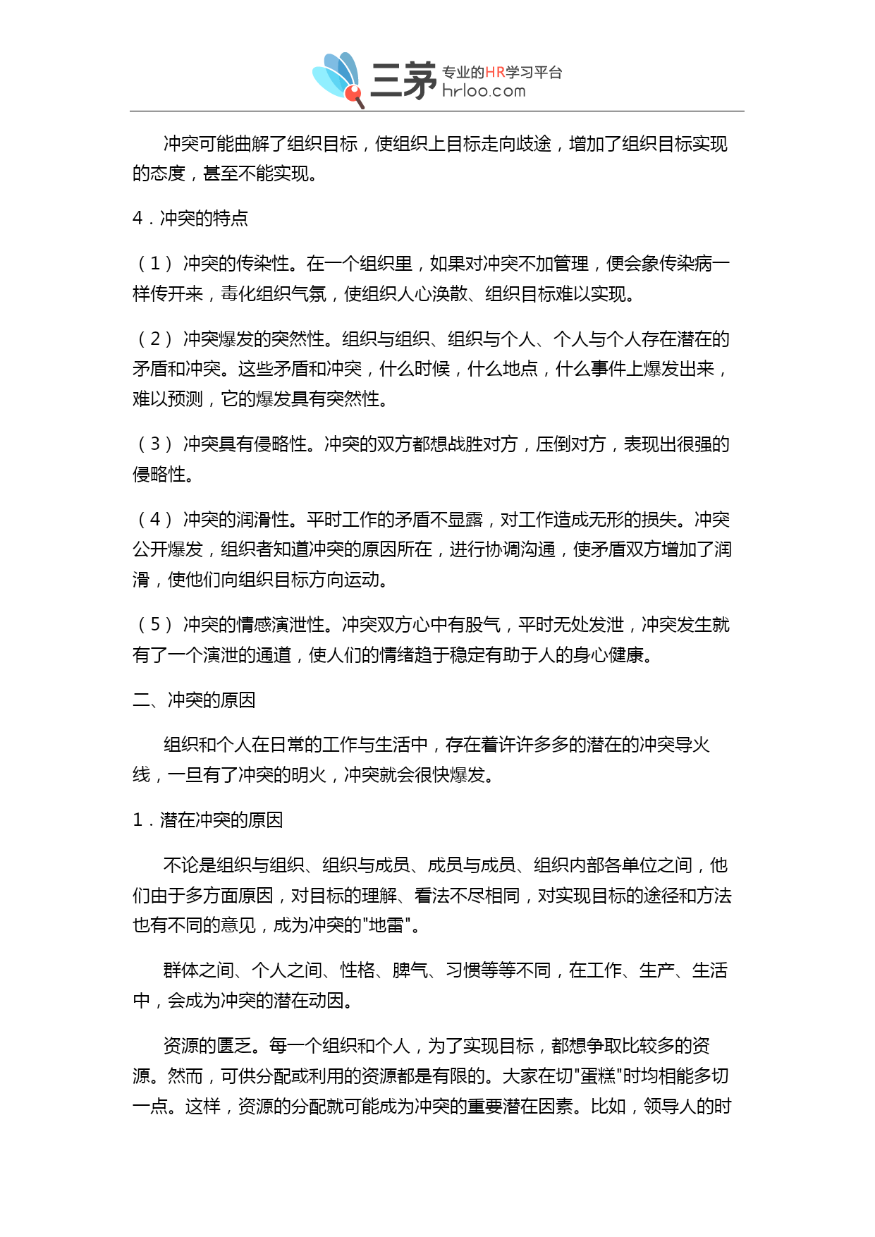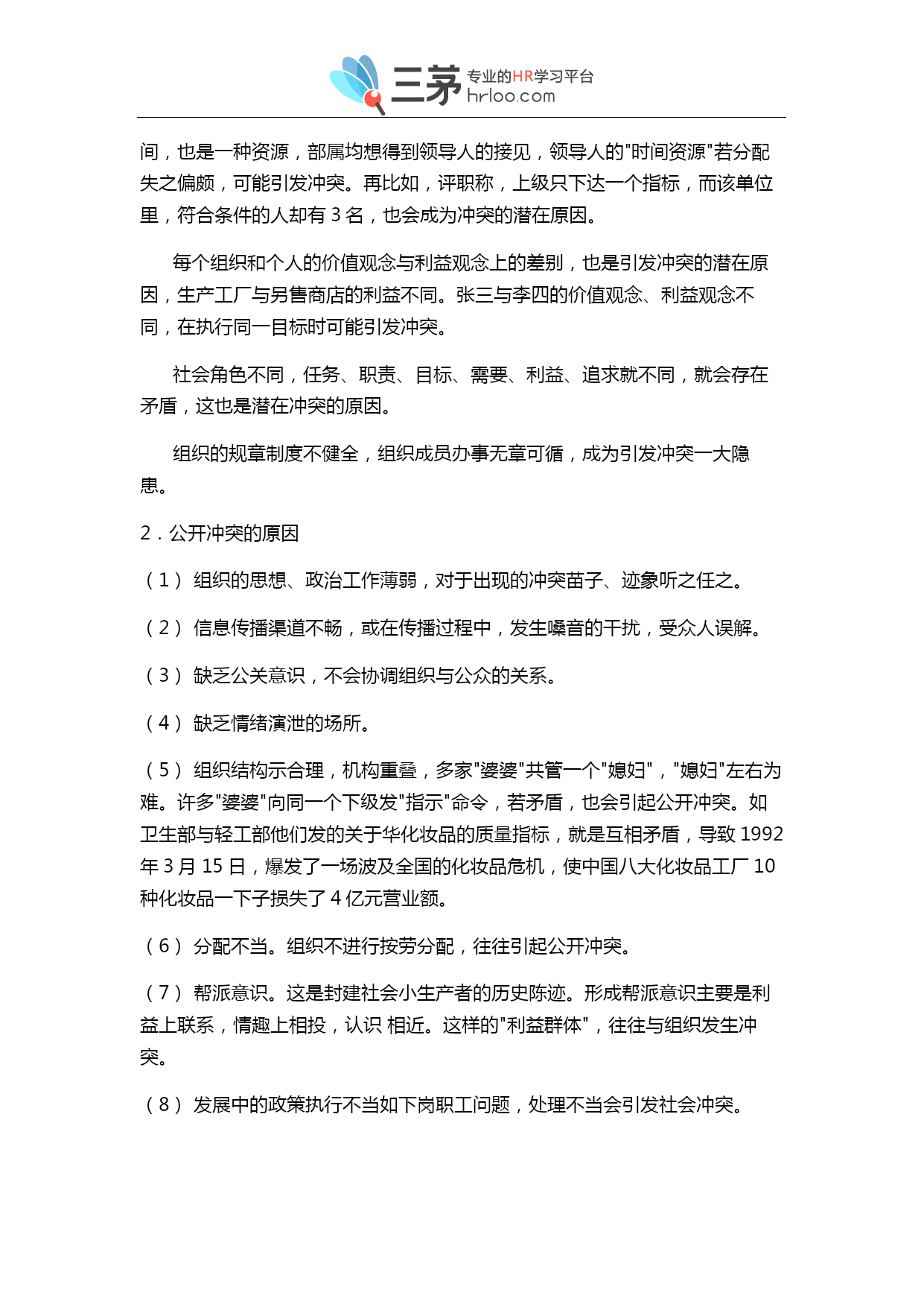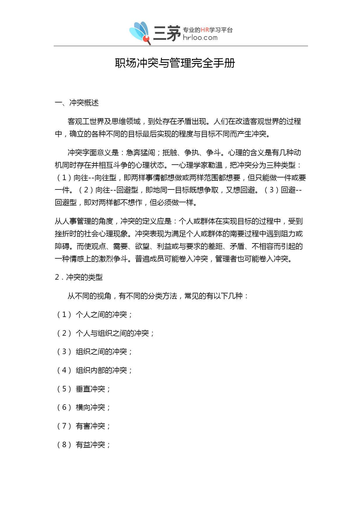 职场冲突与管理完全手册 一、冲突概述 客观工世界及思维领域,到处存在矛盾出现。人们在改造客观世界的过程中,确立的各种不同的目标最后实现的程度与目标不同而产生冲突。 冲突字面意义是:急奔猛闯;抵触、争执、争斗。心理的含义是有几种动机同时存在并相互斗争的心理状态。一心理学家勒温,把冲突分为三种类型:(1)向往--向往型,即两样事情都想做或两样范围都想要,但只能做一件或要一件。(2)向往--回避型,即地同一目标既想争取,又想回避。(3)回避--回避型,即对两样都不想作,但必须做一样。 从人事管理的角度,冲突的定义应是:个人或群体在实现目标的过程中,受到挫折时的社会心理现象。冲突表现为满足个人或群体的南要过程中遇到阻力或障碍。而使观点、需要、欲望、利益或与要求的差距、矛盾、不相容而引起的一种情感上的激烈争斗。普遍成员可能卷入冲突,管理者也可能卷入冲突。 2.冲突的类型 从不同的视角,有不同的分类方法,常见的有以下几种: (1)个人之间的冲突; (2)个人与组织之间的冲突; (3)组织之间的冲突; (4)组织内部的冲突; (5)垂直冲突; (6)横向冲突; (7)有害冲突; (8)有益冲突; 3.冲突的作用 冲突的发生是需要不能得到满足,而且发起冲突的一方已明确自己的需要不能实现,遭到挫折的原因、目标十分明确,由心理上的不满,发展到行动上的剧烈的不满。冲突发生、发展和结束是围绕着需要这个中心点来运转的。根据冲突的结果,分为二类: (1)有益的冲突。在有些情况下,通过冲突,找出了分歧,经过讨论、学习,消除了分歧,相互在感情上更加接近,这类冲突是组织内部空气清新剂。冲突之后,可能调整领导班子。这是在于组织目标没有实现,组织成员不满,寻找、分析原因,对于由领导班子成员的原因造成目标不能实现,应及时淘汰相形见绌的班子成员,使领导班子增加活力,有利于实现组织目标。冲突的烈度,可能暴露出目标不恰当,过高、过大、过难、超出组织成员目前的水平与能力,应进行必要的修改,以利于目标的实现,消除冲突。 冲突的烈度与刚度,对组织造成的危害,暴露出组织在管理上的漏洞,引导组织加强制度建设,堵塞漏洞,提高管理水平,推动组织向目标方向运动,提高组织的效率。重新分配组织资源,使之更趋合理。 冲突的发生,能够唤起并激发组织和成员的荣誉感引发和强化部分意识,"共同对敌"为甩掉落后的帽子,消除分歧,调动各方面的积极性。增强凝聚力,万众一心地为实现目标而奋斗。 冲突引起的震动大,使人猛醒,使人正视面临的问题,思考更加深刻和全面,更加详尽合理,想方设法要解决问题,使成员的潜在才能迸发出来,发挥积极的思维,使目标不能实现的原因在创造新的方法中迎刃而解。 冲突引发强烈的思想,观点交锋,各种思想,观点以不同的角度撞击,可能产生新的思想火花,理论观点和操作技巧。 (2)有害的冲突。冲突不能正确处理会伤害组织与成员的感情,影响团结,影响组织目标的实现。 冲突的强度大,给公很大的震动和压力,若不能调节会使人随不了,损害心理健康,甚至会诱发悲剧性事件。 冲突影响震动面大量广,会消耗组织的人力、物力和时间。 冲突可能曲解了组织目标,使组织上目标走向歧途,增加了组织目标实现的态度,甚至不能实现。 4.冲突的特点 (1)冲突的传染性。在一个组织里,如果对冲突不加管理,便会象传染病一样传开来,毒化组织气氛,使组织人心涣散、组织目标难以实现。 (2)冲突爆发的突然性。组织与组织、组织与个人、个人与个人存在潜在的矛盾和冲突。这些矛盾和冲突,什么时候,什么地点,什么事件上爆发出来,难以预测,它的爆发具有突然性。 (3)冲突具有侵略性。冲突的双方都想战胜对方,压倒对方,表现出很强的侵略性。 (4)冲突的润滑性。平时工作的矛盾不显露,对工作造成无形的损失。冲突公开爆发,组织者知道冲突的原因所在,进行协调沟通,使矛盾双方增加了润滑,使他们向组织目标方向运动。 (5)冲突的情感演泄性。冲突双方心中有股气,平时无处发泄,冲突发生就有了一个演泄的通道,使人们的情绪趋于稳定有助于人的身心健康。 二、冲突的原因 组织和个人在日常的工作与生活中,存在着许许多多的潜在的冲突导火线,一旦有了冲突的明火,冲突就会很快爆发。 1.潜在冲突的原因 不论是组织与组织、组织与成员、成员与成员、组织内部各单位之间,他们由于多方面原因,对目标的理解、看法不尽相同,对实现目标的途径和方法也有不同的意见,成为冲突的"地雷"。 群体之间、个人之间、性格、脾气、习惯等等不同,在工作、生产、生活中,会成为冲突的潜在动因。 资源的匮乏。每一个组织和个人,为了实现目标,都想争取比较多的资源。然而,可供分配或利用的资源都是有限的。大家在切"蛋糕"时均相能多切一点。这样,资源的分配就可能成为冲突的重要潜在因素。比如,领导人的时间,也是一种资源,部属均想得