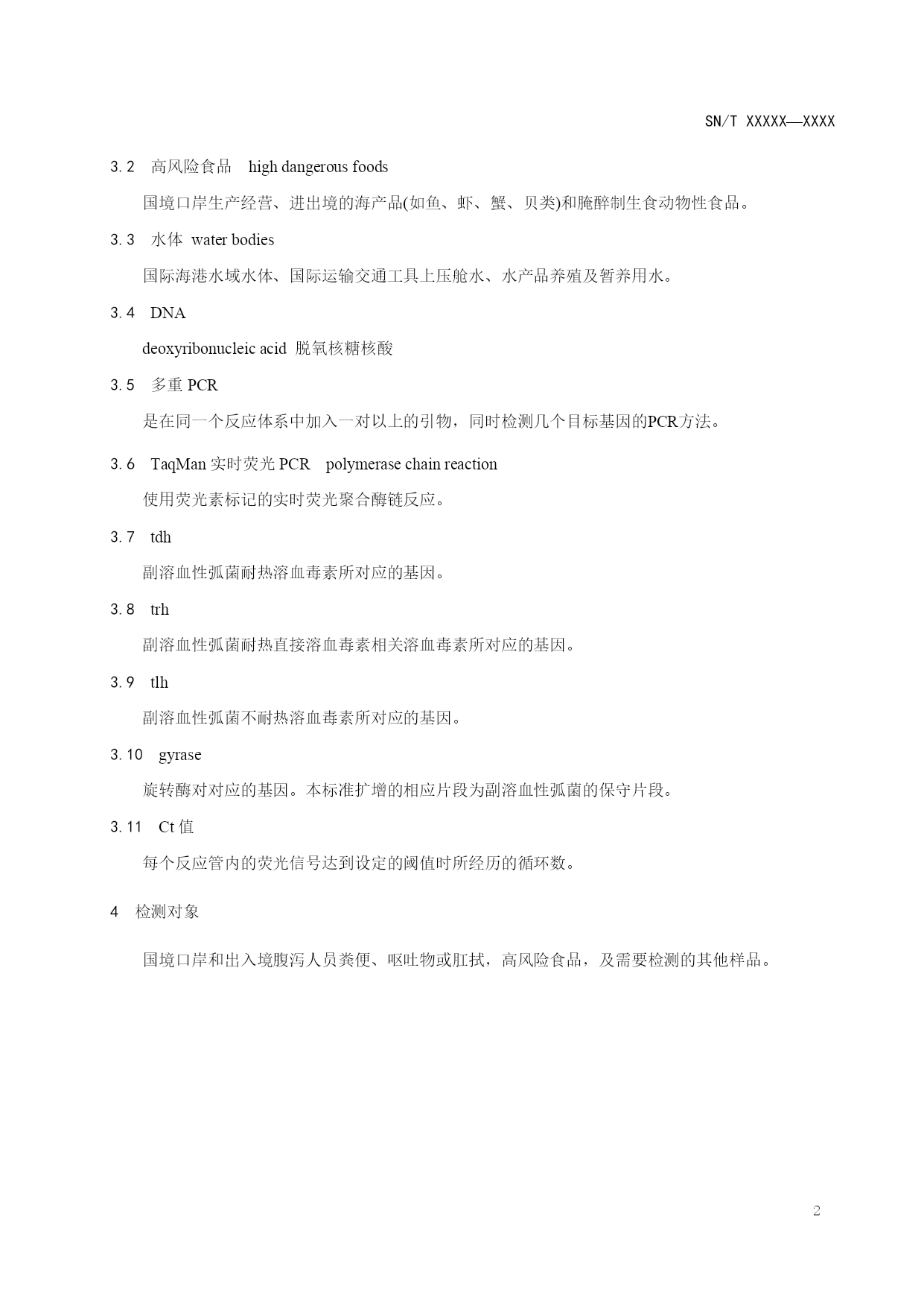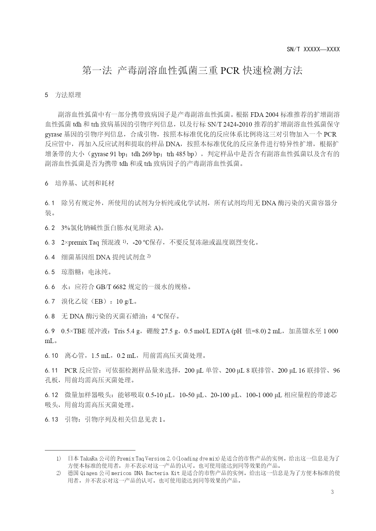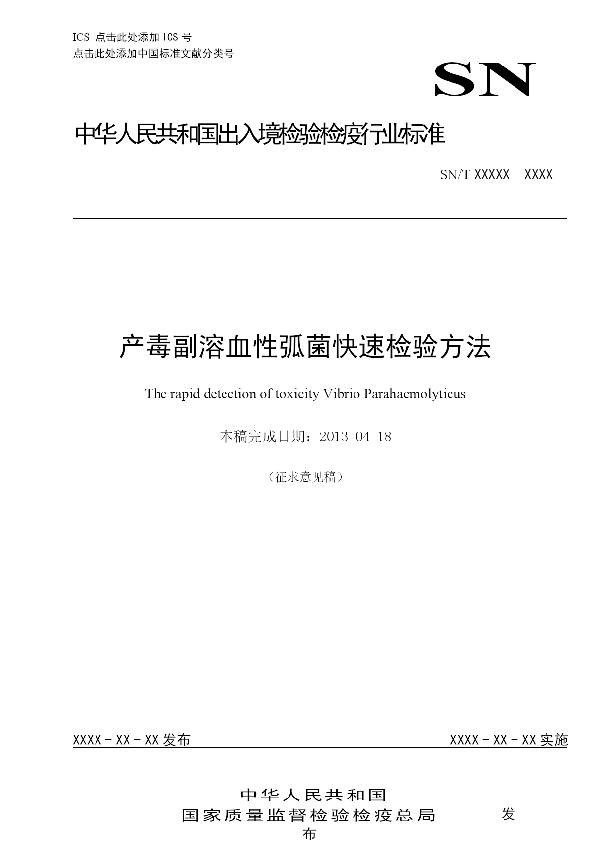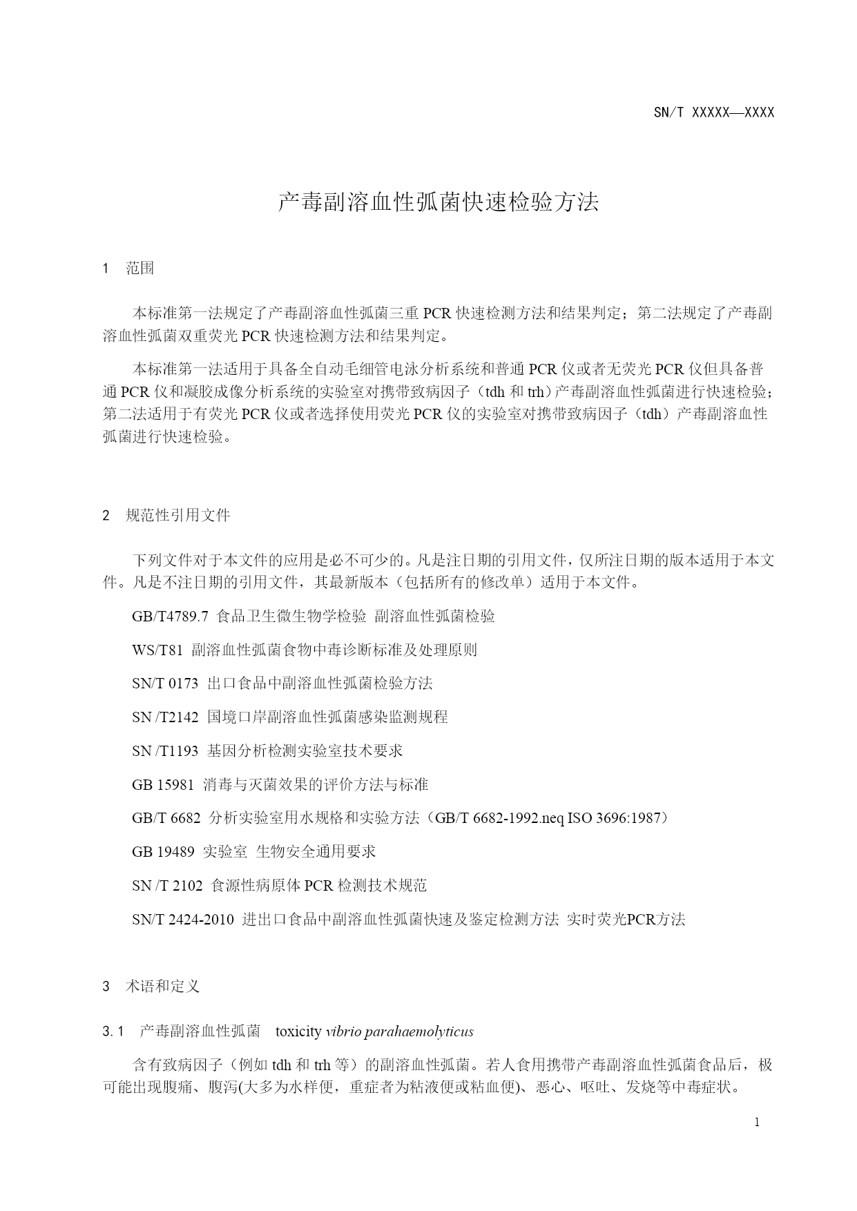ICS FORMTEXT点击此处添加ICS号 FORMTEXT点击此处添加中国标准文献分类号 FORMTEXT FORMTEXTSN 中华人民共和国FORMTEXT出入境检验检疫行业标准 FORMTEXTSN/TFORMTEXTXXXXX—FORMTEXTXXXX FORMTEXT FORMTEXT产毒副溶血性弧菌快速检验方法 FORMTEXTTherapiddetectionoftoxicityVibrioParahaemolyticus FORMTEXT本稿完成日期:2013-04-18 FORMDROPDOWNFORMTEXT FORMTEXTXXXX-FORMTEXTXX-FORMTEXTXX发布 FORMTEXTXXXX-FORMTEXTXX-FORMTEXTXX实施 FORMTEXT中华人民共和国 国家质量监督检验检疫总局 发布 SN/TXXXXX—XXXX PAGE\*MERGEFORMAT12 前言 本标准的附录A为规范性附录。 本标准由国家认证认可监督管理委员会提出并归口。 本标准起草单位:中华人民共和国云南出入境检验检疫局,中华人民共和国上海出入境检验检疫局,上海市临床检验中心,昆明市西山区疾病预防控制中心。 本标准主要起草人:陈丽萍,刘忠民,张继伦,陈芸,彭云霞,王庆忠,王珏。 本标准系首次发布的出入境检验检疫行业标准。 产毒副溶血性弧菌快速检验方法 范围 本标准第一法规定了产毒副溶血性弧菌三重PCR快速检测方法和结果判定;第二法规定了产毒副溶血性弧菌双重荧光PCR快速检测方法和结果判定。 本标准第一法适用于具备全自动毛细管电泳分析系统和普通PCR仪或者无荧光PCR仪但具备普通PCR仪和凝胶成像分析系统的实验室对携带致病因子(tdh和trh)产毒副溶血性弧菌进行快速检验;第二法适用于有荧光PCR仪或者选择使用荧光PCR仪的实验室对携带致病因子(tdh)产毒副溶血性弧菌进行快速检验。 规范性引用文件 下列文件对于本文件的应用是必不可少的。凡是注日期的引用文件,仅所注日期的版本适用于本文件。凡是不注日期的引用文件,其最新版本(包括所有的修改单)适用于本文件。 GB/T4789.7食品卫生微生物学检验副溶血性弧菌检验 WS/T81副溶血性弧菌食物中毒诊断标准及处理原则 SN/T0173出口食品中副溶血性弧菌检验方法 SN/T2142国境口岸副溶血性弧菌感染监测规程 SN/T1193基因分析检测实验室技术要求 GB15981消毒与灭菌效果的评价方法与标准 GB/T6682分析实验室用水规格和实验方法(GB/T6682-1992.neqISO3696:1987) GB19489实验室生物安全通用要求 SN/T2102食源性病原体PCR检测技术规范 SN/T2424-2010进出口食品中副溶血性弧菌快速及鉴定检测方法实时荧光PCR方法 术语和定义 产毒副溶血性弧菌toxicityvibrioparahaemolyticus 含有致病因子(例如tdh和trh等)的副溶血性弧菌。若人食用携带产毒副溶血性弧菌食品后,极可能出现腹痛、腹泻(大多为水样便,重症者为粘液便或粘血便)、恶心、呕吐、发烧等中毒症状。 高风险食品highdangerousfoods 国境口岸生产经营、进出境的海产品(如鱼、虾、蟹、贝类)和腌醉制生食动物性食品。 水体waterbodies 国际海港水域水体、国际运输交通工具上压舱水、水产品养殖及暂养用水。 DNA deoxyribonucleicacid脱氧核糖核酸 多重PCR 是在同一个反应体系中加入一对以上的引物,同时检测几个目标基因的PCR方法。 TaqMan实时荧光PCRpolymerasechainreaction 使用荧光素标记的实时荧光聚合酶链反应。 tdh 副溶血性弧菌耐热溶血毒素所对应的基因。 trh 副溶血性弧菌耐热直接溶血毒素相关溶血毒素所对应的基因。 tlh 副溶血性弧菌不耐热溶血毒素所对应的基因。 gyrase 旋转酶对对应的基因。本标准扩增的相应片段为副溶血性弧菌的保守片段。 Ct值 每个反应管内的荧光信号达到设定的阈值时所经历的循环数。 检测对象 国境口岸和出入境腹泻人员粪便、呕吐物或肛拭,高风险食品,及需要检测的其他样品。 第一法产毒副溶血性弧菌三重PCR快速检测方法 方法原理 副溶血性弧菌中有一部分携带致病因子是产毒副溶血性弧菌。根据FDA2004标准推荐的扩增副溶血性弧菌tdh和trh