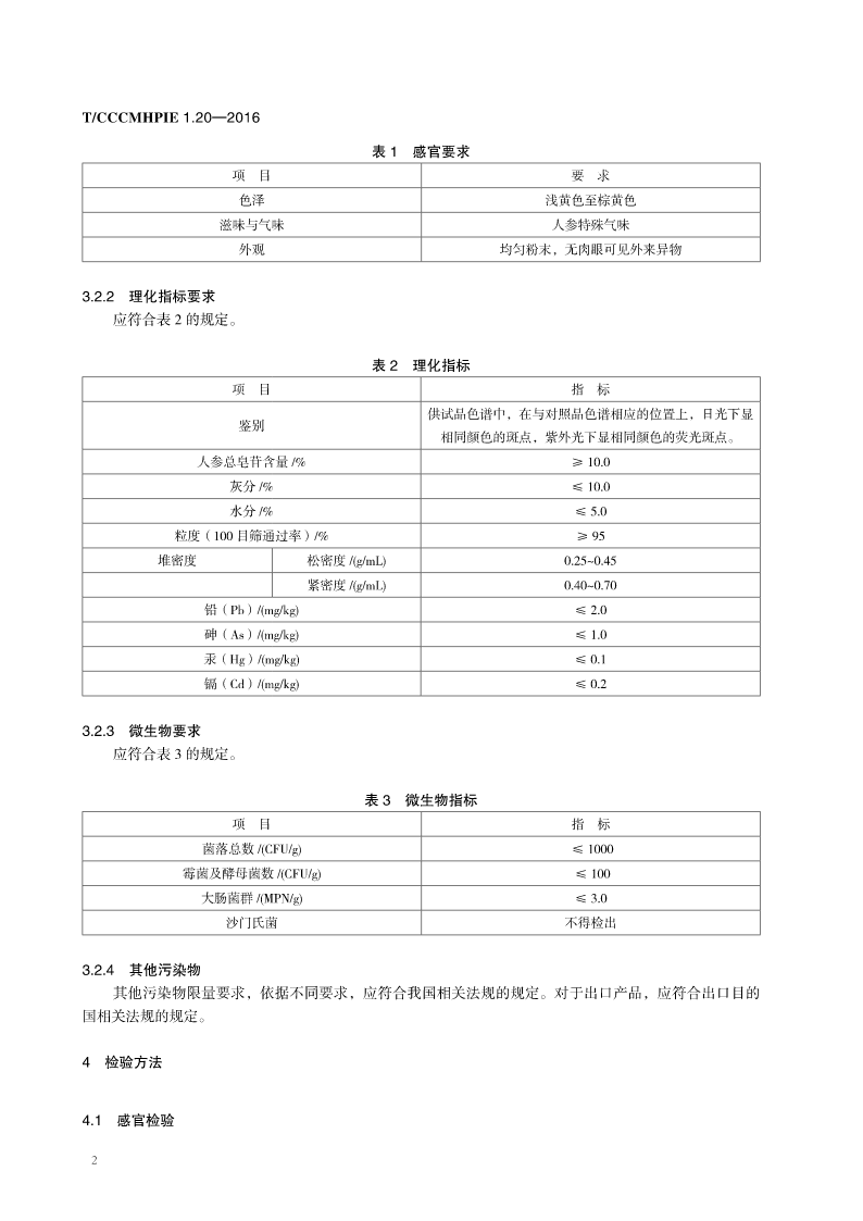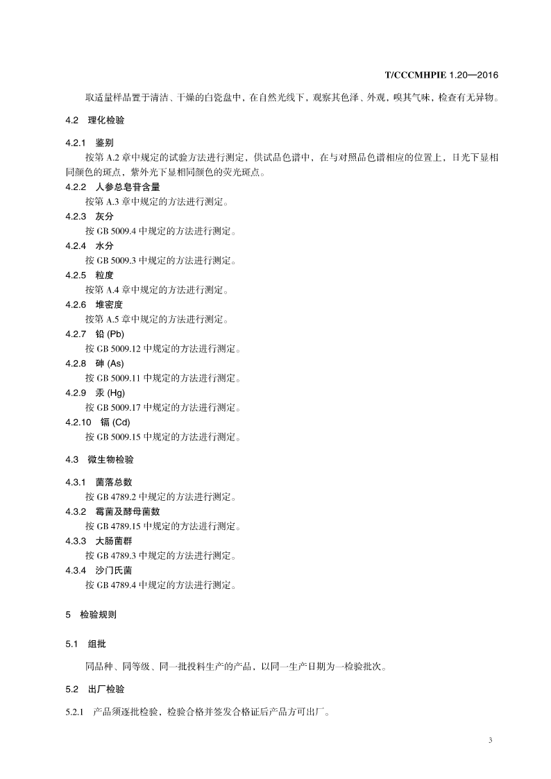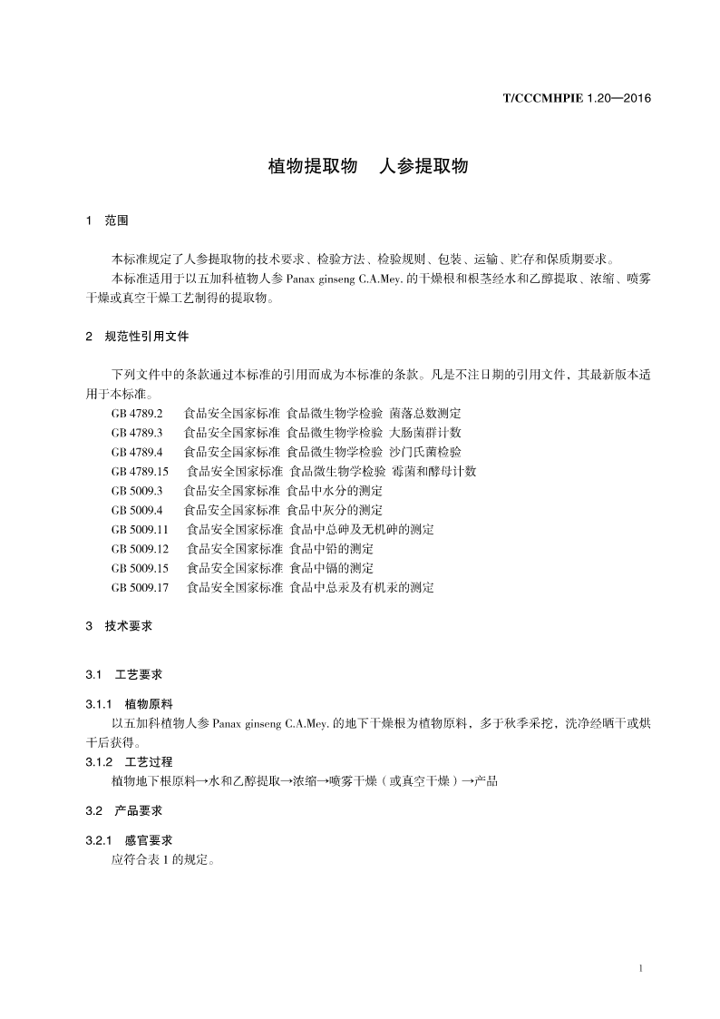 ICS11.120 C25T 中国医药保健品进出口商会团体标准 T/CCCMHPIE1.20—2016 植物提取物人参提取物 Plantextract—Panaxginsengextract 2017-06-21发布2017-07-01实施 中国医药保健品进出口商会发布 前言 本标准按照GB/T1.1—2009和GB/T2004.1—2016给出的规则起草。 本标准由中国医药保健品进出口商会提出。 本标准由中华人民共和国商务部归口。 本标准起草单位:吉林省宏久生物科技股份有限公司。 本标准主要起草人:金爱玉、高开华、王评评、辛忠源、姜海洋。 T/CCCMHPIE1.20—2016 植物提取物人参提取物 1范围 本标准规定了人参提取物的技术要求、检验方法、检验规则、包装、运输、贮存和保质期要求。 本标准适用于以五加科植物人参PanaxginsengC.A.Mey.的干燥根和根茎经水和乙醇提取、浓缩、喷雾 干燥或真空干燥工艺制得的提取物。 2规范性引用文件 下列文件中的条款通过本标准的引用而成为本标准的条款。凡是不注日期的引用文件,其最新版本适 用于本标准。 GB4789.2食品安全国家标准食品微生物学检验菌落总数测定 GB4789.3食品安全国家标准食品微生物学检验大肠菌群计数 GB4789.4食品安全国家标准食品微生物学检验沙门氏菌检验 GB4789.15食品安全国家标准食品微生物学检验霉菌和酵母计数 GB5009.3食品安全国家标准食品中水分的测定 GB5009.4食品安全国家标准食品中灰分的测定 GB5009.11食品安全国家标准食品中总砷及无机砷的测定 GB5009.12食品安全国家标准食品中铅的测定 GB5009.15食品安全国家标准食品中镉的测定 GB5009.17食品安全国家标准食品中总汞及有机汞的测定 3技术要求 3.1工艺要求 3.1.1植物原料 以五加科植物人参PanaxginsengC.A.Mey.的地下干燥根为植物原料,多于秋季采挖,洗净经晒干或烘 干后获得。 3.1.2工艺过程 植物地下根原料→水和乙醇提取→浓缩→喷雾干燥(或真空干燥)→产品 3.2产品要求 3.2.1感官要求 应符合表1的规定。 1 T/CCCMHPIE1.20—2016 表1感官要求 项目要求 色泽浅黄色至棕黄色 滋味与气味人参特殊气味 外观均匀粉末,无肉眼可见外来异物 3.2.2理化指标要求 应符合表2的规定。 表2理化指标 项目指标 供试品色谱中,在与对照品色谱相应的位置上,日光下显 鉴别 相同颜色的斑点,紫外光下显相同颜色的荧光斑点。 人参总皂苷含量/%≥10.0 灰分/%≤10.0 水分/%≤5.0 粒度(100目筛通过率)/%≥95 堆密度松密度/(g/mL)0.25~0.45 紧密度/(g/mL)0.40~0.70 铅(Pb)/(mg/kg)≤2.0 砷(As)/(mg/kg)≤1.0 汞(Hg)/(mg/kg)≤0.1 镉(Cd)/(mg/kg)≤0.2 3.2.3微生物要求 应符合表3的规定。 表3微生物指标 项目指标 菌落总数/(CFU/g)≤1000 霉菌及酵母菌数/(CFU/g)≤100 大肠菌群/(MPN/g)≤3.0 沙门氏菌不得检出 3.2.4其他污染物 其他污染物限量要求,依据不同要求,应符合我国相关法规的规定。对于出口产品,应符合出口目的 国相关法规的规定。 4检验方法 4.1感官检验 2 T/CCCMHPIE1.20—2016 取适量样品置于清洁、干燥的白瓷盘中,在自然光线下,观察其色泽、外观,嗅其气味,检查有无异物。 4.2理化检验 4.2.1鉴别 按第A.2章中规定的试验方法进行测定,供试品色谱中,在与对照品色谱相应的位置上,日光下显相 同颜色的斑点,紫外光下显相同颜色的荧光斑点。 4.2.2人参总皂苷含量 按第A.3章中规定的方法进行测定。 4.2.3灰分 按GB5009.4中规定的方法进行测定。 4.2.4水分 按GB5009.3中规定的方法进行测定。 4.2.5粒度 按第A.4章中规定的方法进行测定。 4.2.6堆密度 按第A.5章中规定的方法进行测定。 4.2.7铅(Pb) 按GB5009.12中规定的方法进行测定。 4.2.8砷(As) 按GB5009.11中规定的方法进行测定。 4.2.9汞(Hg) 按GB5009.17中规定的方法进行测定。 4.2.10镉(Cd) 按GB5009.15中规定的方法进行测定。 4.3微生物检验 4.3.1菌落总数 按GB4789.2中规定的方法进行测定。 4.3.2霉菌及酵母菌数 按GB4789.15中规定的方法进行测定。 4.3.3大肠菌群 按GB4789.3中规定的