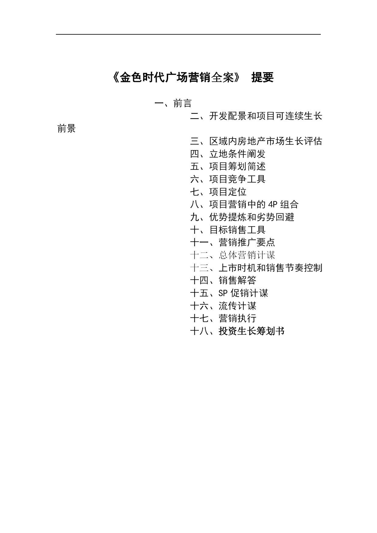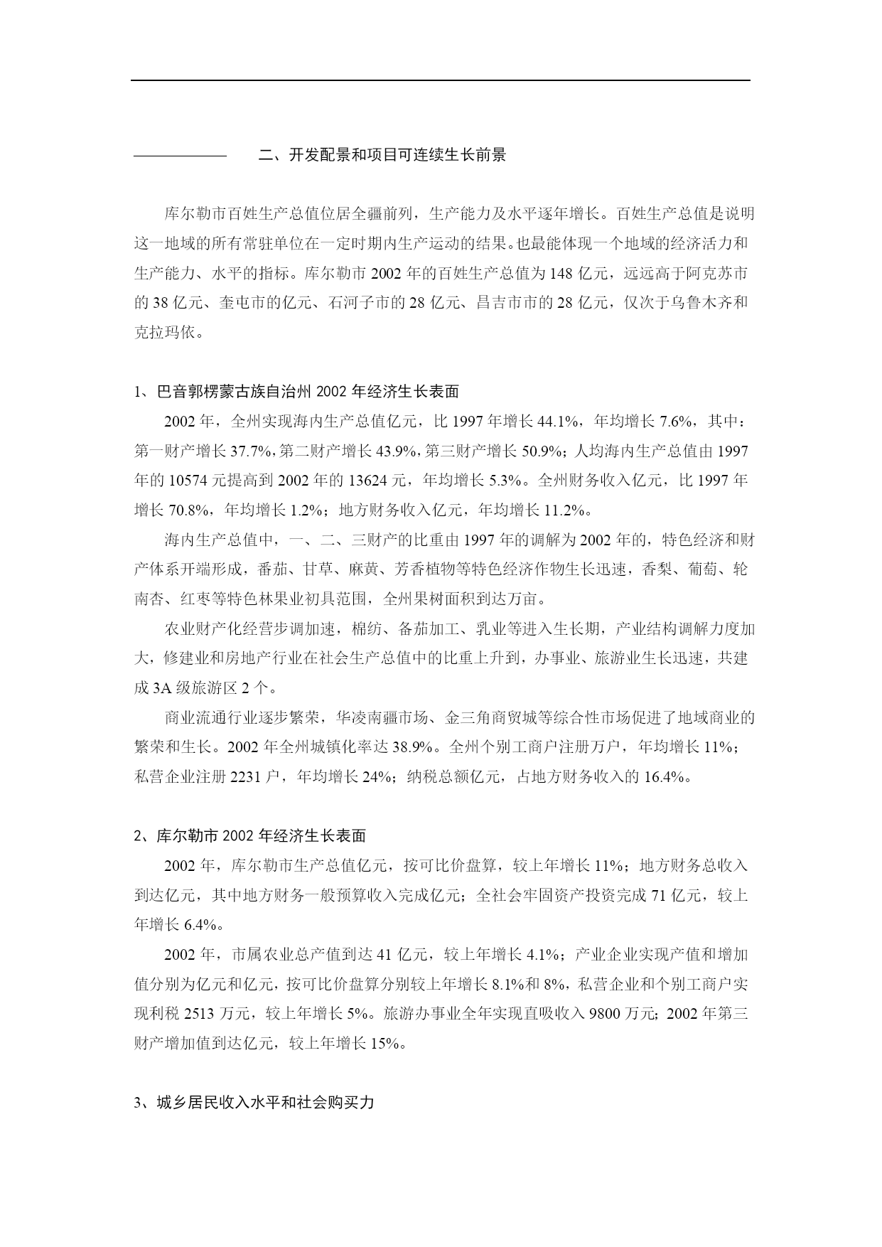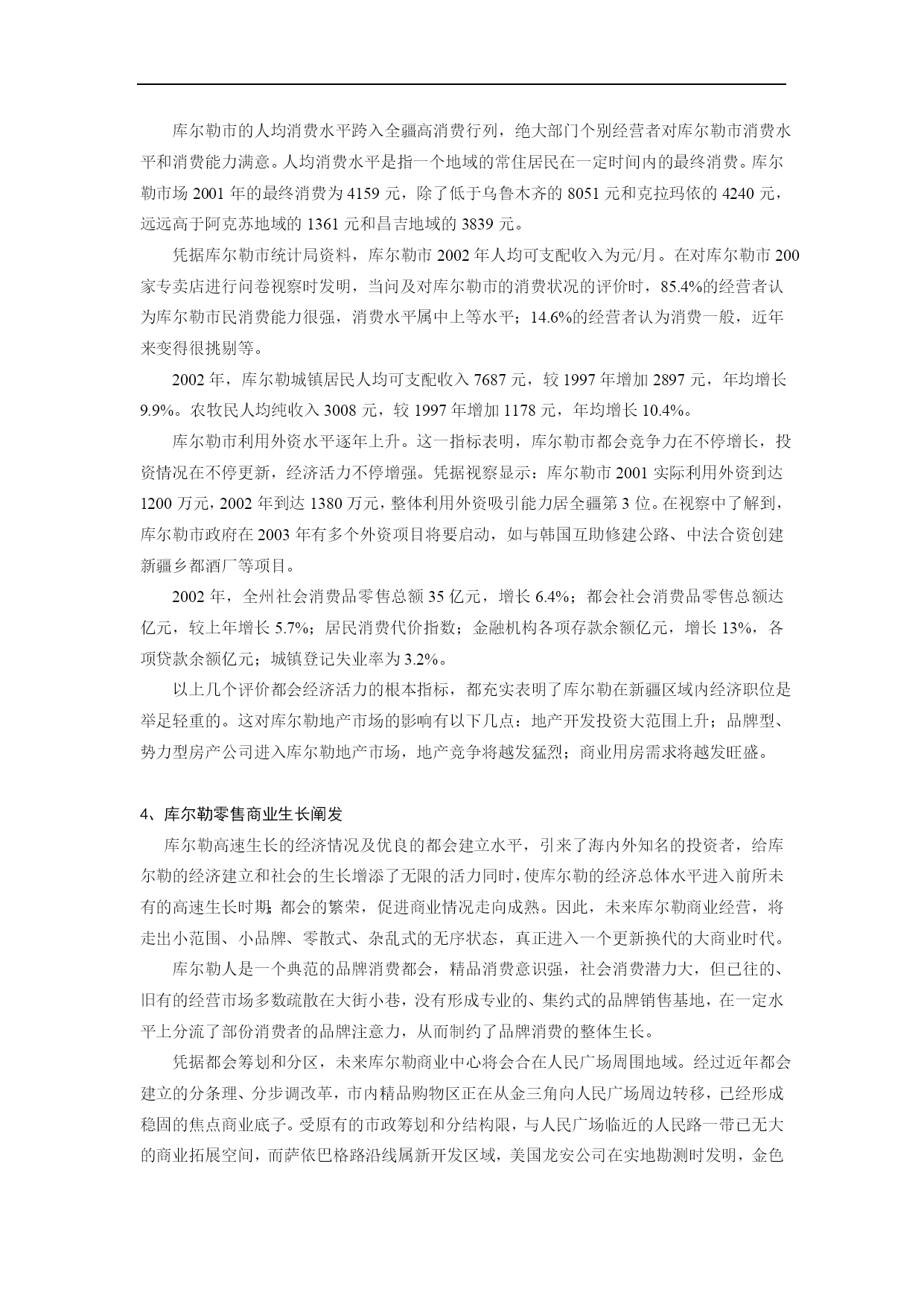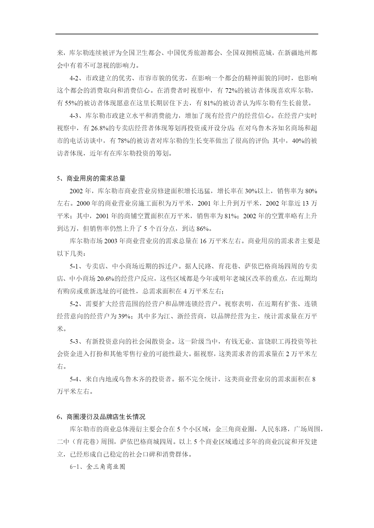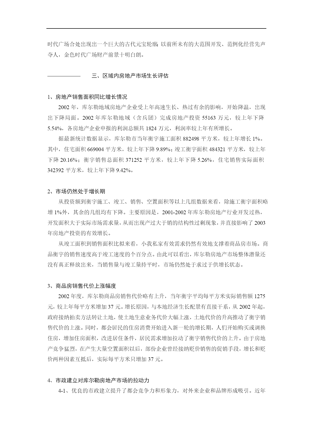 《金色时代广场营销全案》提要一、前言二、开发配景和项目可连续生长前景三、区域内房地产市场生长评估四、立地条件阐发五、项目筹划简述六、项目竞争工具七、项目定位八、项目营销中的4P组合九、优势提炼和劣势回避十、目标销售工具十一、营销推广要点十二、总体营销计谋十三、上市时机和销售节奏控制十四、销售解答十五、SP促销计谋十六、流传计谋十七、营销执行 十八、投资生长筹划书 ——————二、开发配景和项目可连续生长前景库尔勒市百姓生产总值位居全疆前列,生产能力及水平逐年增长。百姓生产总值是说明这一地域的所有常驻单位在一定时期内生产运动的结果。也最能体现一个地域的经济活力和生产能力、水平的指标。库尔勒市2002年的百姓生产总值为148亿元,远远高于阿克苏市的38亿元、奎屯市的亿元、石河子市的28亿元、昌吉市市的28亿元,仅次于乌鲁木齐和克拉玛依。1、巴音郭楞蒙古族自治州2002年经济生长表面2002年,全州实现海内生产总值亿元,比1997年增长44.1%,年均增长7.6%,其中:第一财产增长37.7%,第二财产增长43.9%,第三财产增长50.9%;人均海内生产总值由1997年的10574元提高到2002年的13624元,年均增长5.3%。全州财务收入亿元,比1997年增长70.8%,年均增长1.2%;地方财务收入亿元,年均增长11.2%。海内生产总值中,一、二、三财产的比重由1997年的调解为2002年的,特色经济和财产体系开端形成,番茄、甘草、麻黄、芳香植物等特色经济作物生长迅速,香梨、葡萄、轮南杏、红枣等特色林果业初具范围,全州果树面积到达万亩。农业财产化经营步调加速,棉纺、备茄加工、乳业等进入生长期,产业结构调解力度加大,修建业和房地产行业在社会生产总值中的比重上升到,办事业、旅游业生长迅速,共建成3A级旅游区2个。商业流通行业逐步繁荣,华凌南疆市场、金三角商贸城等综合性市场促进了地域商业的繁荣和生长。2002年全州城镇化率达38.9%。全州个别工商户注册万户,年均增长11%;私营企业注册2231户,年均增长24%;纳税总额亿元,占地方财务收入的16.4%。2、库尔勒市2002年经济生长表面2002年,库尔勒市生产总值亿元,按可比价盘算,较上年增长11%;地方财务总收入到达亿元,其中地方财务一般预算收入完成亿元;全社会牢固资产投资完成71亿元,较上年增长6.4%。2002年,市属农业总产值到达41亿元,较上年增长4.1%;产业企业实现产值和增加值分别为亿元和亿元,按可比价盘算分别较上年增长8.1%和8%,私营企业和个别工商户实现利税2513万元,较上年增长5%。旅游办事业全年实现直吸收入9800万元;2002年第三财产增加值到达亿元,较上年增长15%。3、城乡居民收入水平和社会购买力库尔勒市的人均消费水平跨入全疆高消费行列,绝大部门个别经营者对库尔勒市消费水平和消费能力满意。人均消费水平是指一个地域的常住居民在一定时间内的最终消费。库尔勒市场2001年的最终消费为4159元,除了低于乌鲁木齐的8051元和克拉玛依的4240元,远远高于阿克苏地域的1361元和昌吉地域的3839元。凭据库尔勒市统计局资料,库尔勒市2002年人均可支配收入为元/月。在对库尔勒市200家专卖店进行问卷视察时发明,当问及对库尔勒市的消费状况的评价时,85.4%的经营者认为库尔勒市民消费能力很强,消费水平属中上等水平;14.6%的经营者认为消费一般,近年来变得很挑剔等。2002年,库尔勒城镇居民人均可支配收入7687元,较1997年增加2897元,年均增长9.9%。农牧民人均纯收入3008元,较1997年增加1178元,年均增长10.4%。库尔勒市利用外资水平逐年上升。这一指标表明,库尔勒市都会竞争力在不停增长,投资情况在不停更新,经济活力不停增强。凭据视察显示:库尔勒市2001实际利用外资到达1200万元,2002年到达1380万元,整体利用外资吸引能力居全疆第3位。在视察中了解到,库尔勒市政府在2003年有多个外资项目将要启动,如与韩国互助修建公路、中法合资创建新疆乡都酒厂等项目。2002年,全州社会消费品零售总额35亿元,增长6.4%;都会社会消费品零售总额达亿元,较上年增长5.7%;居民消费代价指数;金融机构各项存款余额亿元,增长13%,各项贷款余额亿元;城镇登记失业率为3.2%。以上几个评价都会经济活力的根本指标,都充实表明了库尔勒在新疆区域内经济职位是举足轻重的。这对库尔勒地产市场的影响有以下几点:地产开发投资大范围上升;品牌型、势力型房产公司进入库尔勒地产市场,地产竞争将越发猛烈;商业用房需求将越发旺盛。4、库尔勒零售商业生长阐发库尔勒高速生长的经济情况及优良的都会建立水平,引来了海内外知名的投资者,给库尔勒的经济建立和社会的生长增添了无限的