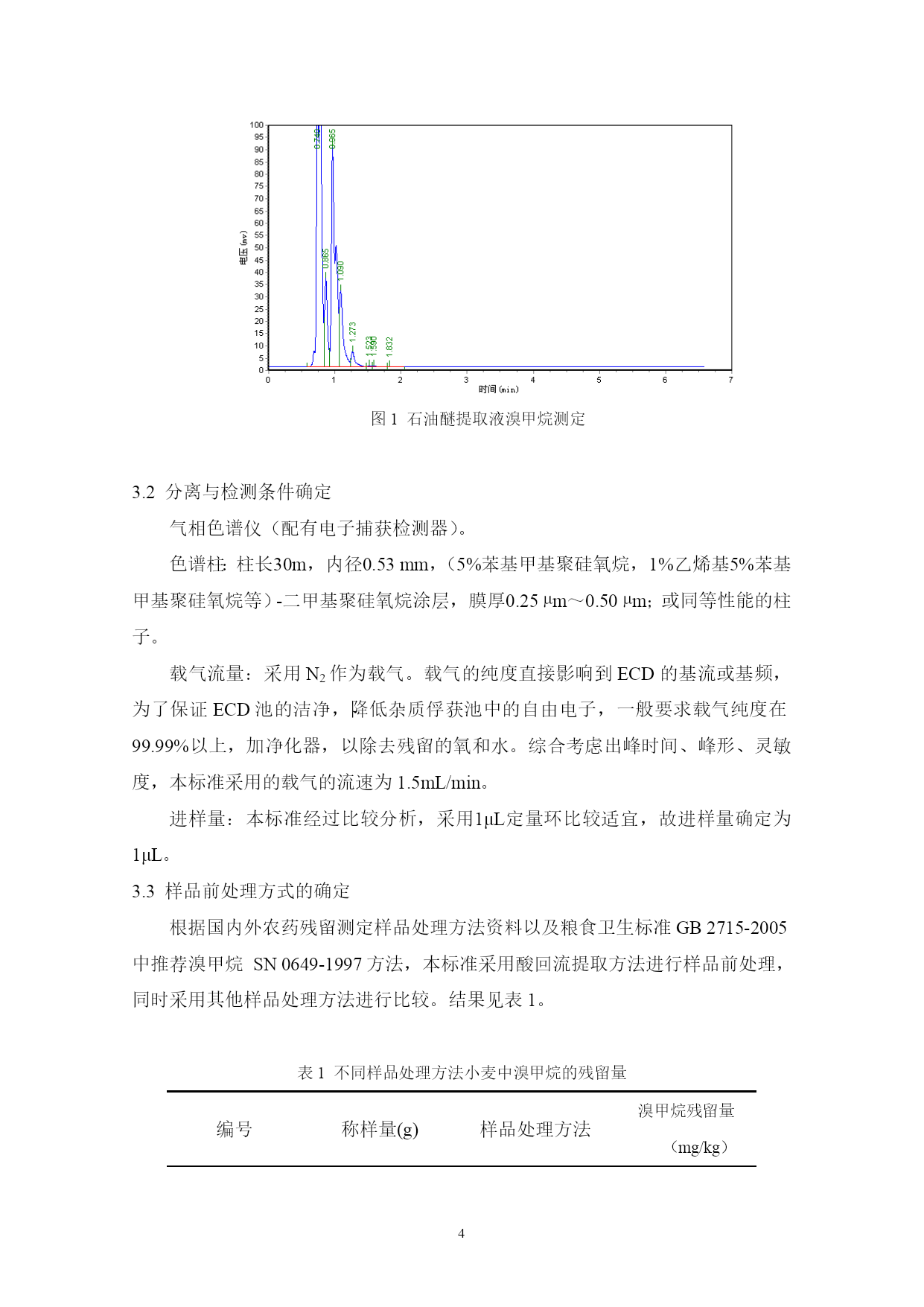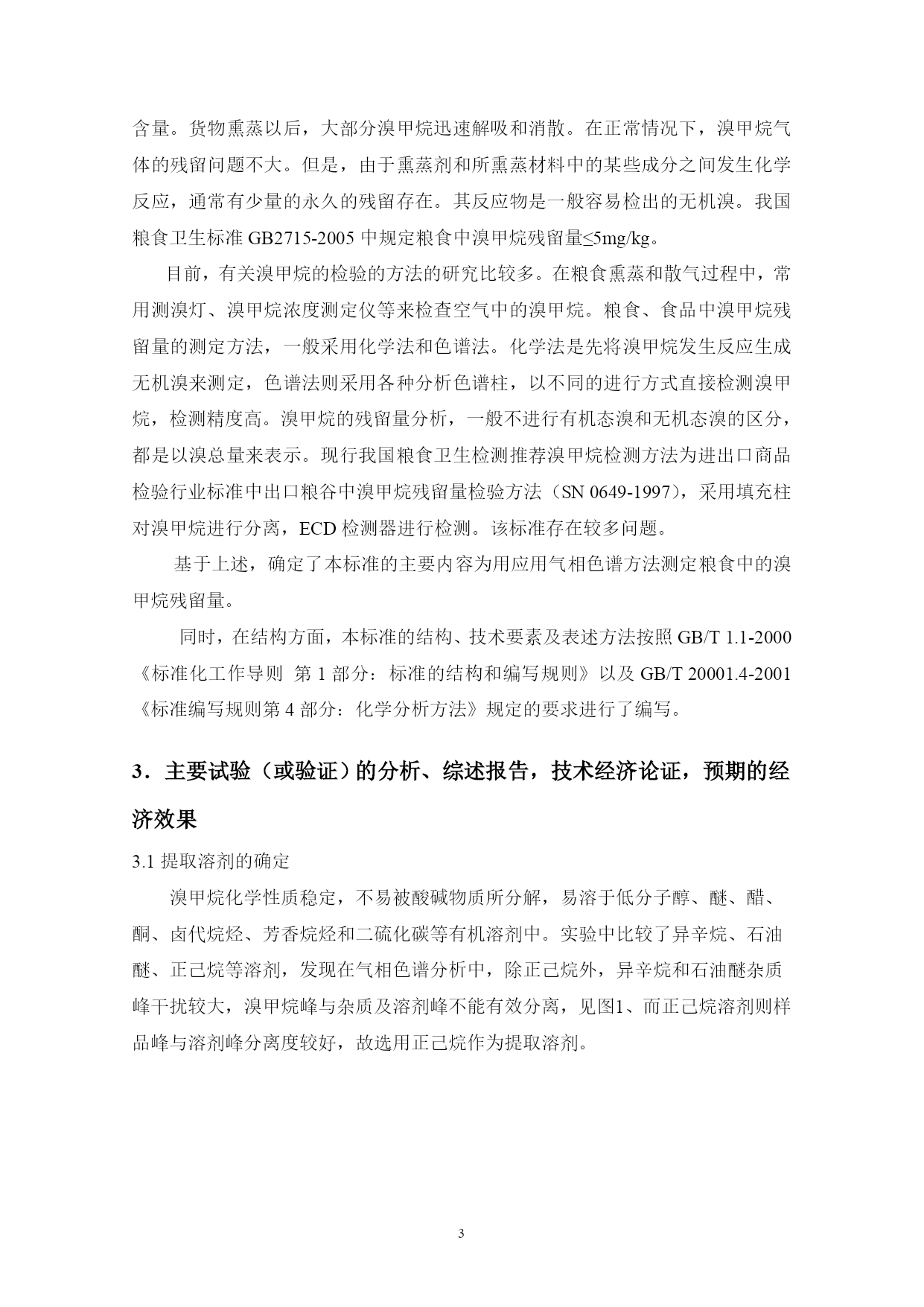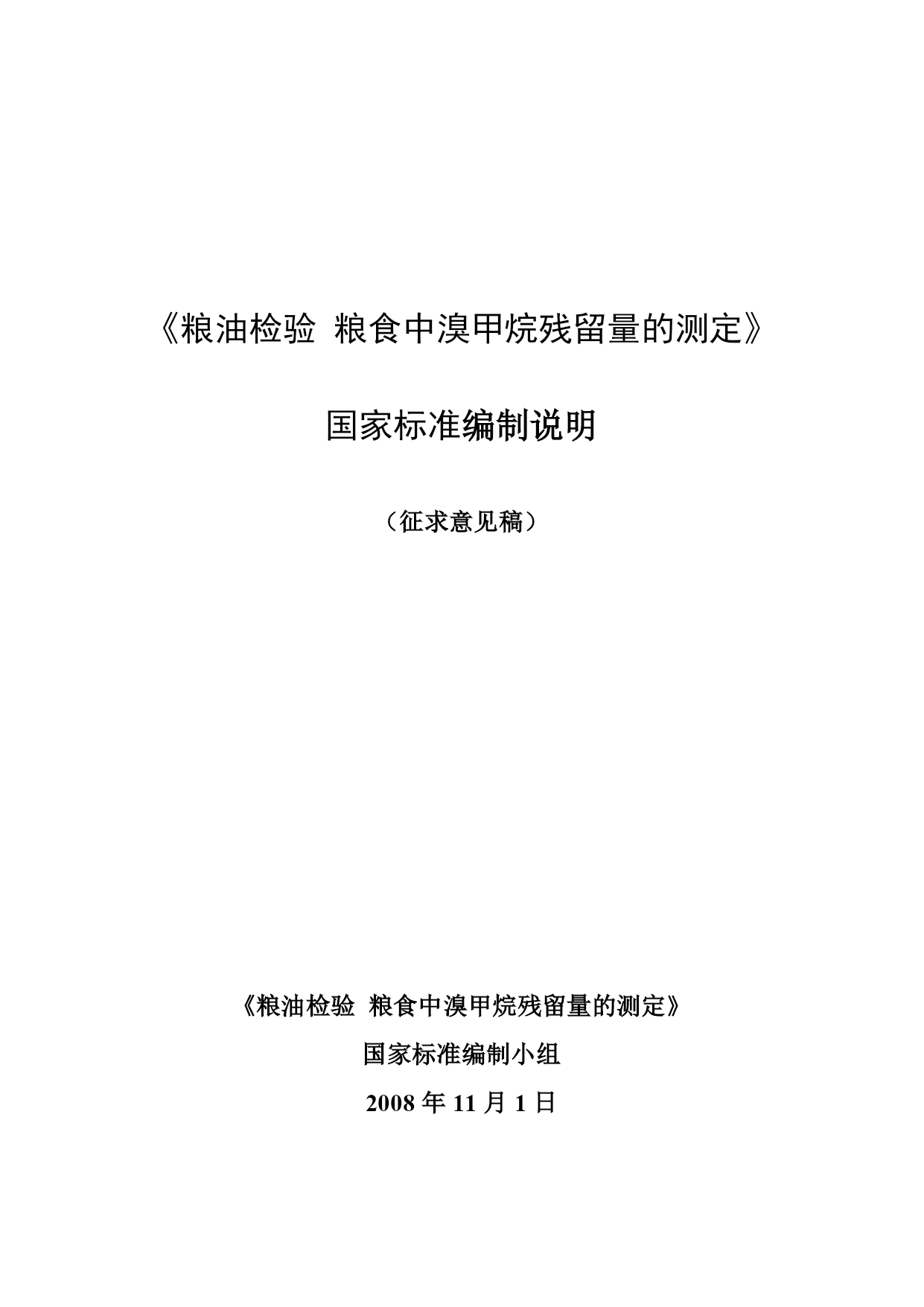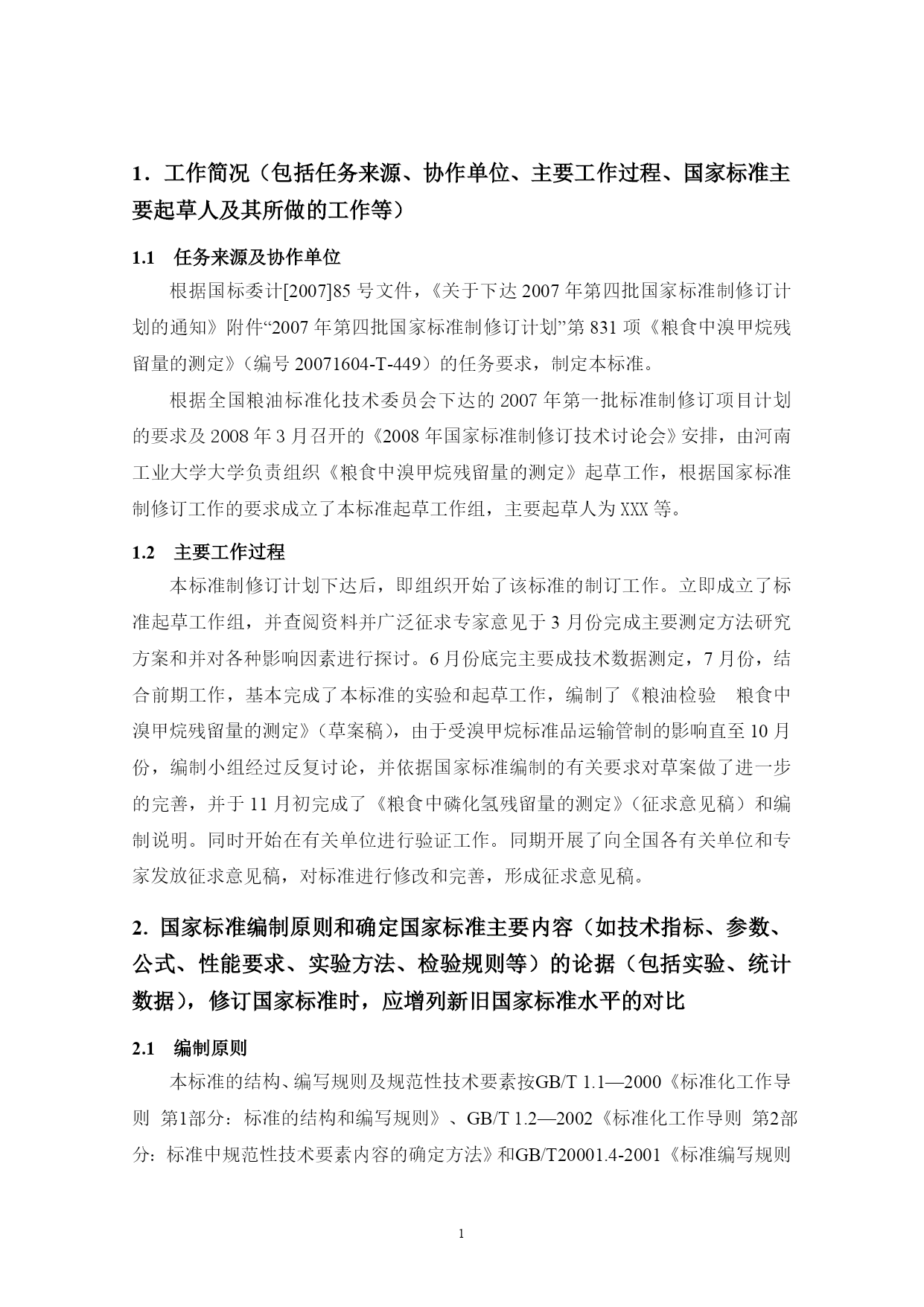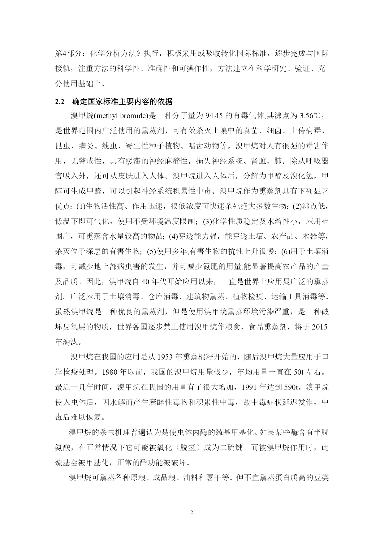 《粮油检验粮食中溴甲烷残留量的测定》 国家标准编制说明 (征求意见稿) 《粮油检验粮食中溴甲烷残留量的测定》 国家标准编制小组 2008年11月1日 1.工作简况(包括任务来源、协作单位、主要工作过程、国家标准主要起草人及其所做的工作等) 1.1任务来源及协作单位 根据国标委计[2007]85号文件,《关于下达2007年第四批国家标准制修订计划的通知》附件“2007年第四批国家标准制修订计划”第831项《粮食中溴甲烷残留量的测定》(编号20071604-T-449)的任务要求,制定本标准。 根据全国粮油标准化技术委员会下达的2007年第一批标准制修订项目计划的要求及2008年3月召开的《2008年国家标准制修订技术讨论会》安排,由河南工业大学大学负责组织《粮食中溴甲烷残留量的测定》起草工作,根据国家标准制修订工作的要求成立了本标准起草工作组,主要起草人为XXX等。 1.2主要工作过程 本标准制修订计划下达后,即组织开始了该标准的制订工作。立即成立了标准起草工作组,并查阅资料并广泛征求专家意见于3月份完成主要测定方法研究方案和并对各种影响因素进行探讨。6月份底完主要成技术数据测定,7月份,结合前期工作,基本完成了本标准的实验和起草工作,编制了《粮油检验粮食中溴甲烷残留量的测定》(草案稿),由于受溴甲烷标准品运输管制的影响直至10月份,编制小组经过反复讨论,并依据国家标准编制的有关要求对草案做了进一步的完善,并于11月初完成了《粮食中磷化氢残留量的测定》(征求意见稿)和编制说明。同时开始在有关单位进行验证工作。同期开展了向全国各有关单位和专家发放征求意见稿,对标准进行修改和完善,形成征求意见稿。 2.国家标准编制原则和确定国家标准主要内容(如技术指标、参数、公式、性能要求、实验方法、检验规则等)的论据(包括实验、统计数据),修订国家标准时,应增列新旧国家标准水平的对比 2.1编制原则 本标准的结构、编写规则及规范性技术要素按GB/T1.1—2000《标准化工作导则第1部分:标准的结构和编写规则》、GB/T1.2—2002《标准化工作导则第2部分:标准中规范性技术要素内容的确定方法》和GB/T20001.4-2001《标准编写规则第4部分:化学分析方法》执行,积极采用或吸收转化国际标准,逐步完成与国际接轨,注重方法的科学性、准确性和可操作性,方法建立在科学研究、验证、充分使用基础上。 2.2确定国家标准主要内容的依据 溴甲烷(methylbromide)是一种分子量为94.45的有毒气体,其沸点为3.56℃,是世界范围内广泛使用的熏蒸剂,可有效杀灭土壤中的真菌、细菌、土传病毒、昆虫、螨类、线虫、寄生性种子植物、啮齿动物等。溴甲烷对人有很强的毒害作用,无警戒性,具有缓滞的神经麻醉性,损失神经系统、肾脏、肺。除从呼吸器官吸入外,还可从皮肤进入人体。溴甲烷进入人体后,分解为甲醇及溴化氢,甲醇可生成甲醛,可以引起神经系统积累性中毒。溴甲烷作为熏蒸剂具有下列显著优点:(1)生物活性高、作用迅速,很低浓度可快速杀死绝大多数生物;(2)沸点低,低温下即可气化,使用不受环境温度限制;(3)化学性质稳定及水溶性小,应用范围广,可熏蒸含水量较高的物品;(4)穿透能力强,能穿透土壤、农产品、木器等,杀灭位于深层的有害生物;(5)使用多年,有害生物的抗性上升很慢;(6)用于土壤消毒,可减少地上部病虫害的发生,并可减少氮肥的用量,能显著提高农产品的产量及品质。因此,溴甲烷自40年代开始应用以来,一直是世界上应用最广泛的熏蒸剂。广泛应用于土壤消毒、仓库消毒、建筑物熏蒸、植物检疫、运输工具消毒等。虽然溴甲烷是一种优良的熏蒸剂,但是使用溴甲烷熏蒸环境污染严重,是一种破坏臭氧层的物质,世界各国逐步禁止使用溴甲烷作粮食、食品熏蒸剂,将于2015年淘汰。 溴甲烷在我国的应用是从1953年熏蒸棉籽开始的,随后溴甲烷大量应用于口岸检疫处理。1980年以前,我国的溴甲烷用量极少,年均用量一直在50t左右。最近十几年时间,溴甲烷在我国的用量有了很大增加,1991年达到590t。溴甲烷侵入虫体后,因水解而产生麻醉性毒物和积累性中毒,故中毒症状延迟发作,中毒后难以恢复。 溴甲烷的杀虫机理普遍认为是使虫体内酶的巯基甲基化。如果某些酶含有半胱氨酸,在正常情况下它可能被氧化(脱氢)成为二硫键。而被溴甲烷作用时,此巯基会被甲基化,正常的酶功能被破坏。 溴甲烷可熏蒸各种原粮、成品粮、油料和薯干等。但不宜熏蒸蛋白质高的豆类含量。货物熏蒸以后,大部分溴甲烷迅速解吸和消散。在正常情况下,溴甲烷气体的残留问题不大。但是,由于熏蒸剂和所熏蒸材料中的某些成分之间发生化学反应,通常有少量的永久的残留存在。其反应物是一般容易检出的无机溴。我国粮食卫生标准GB2715-