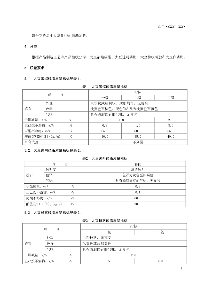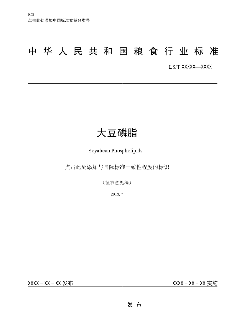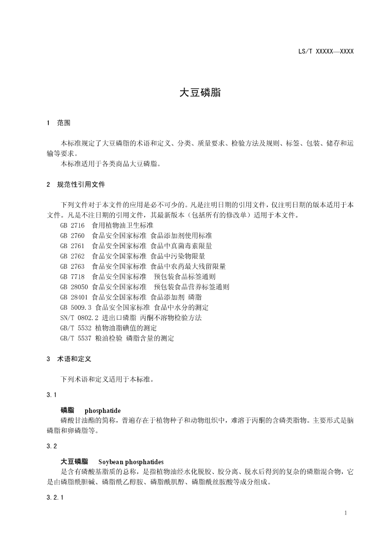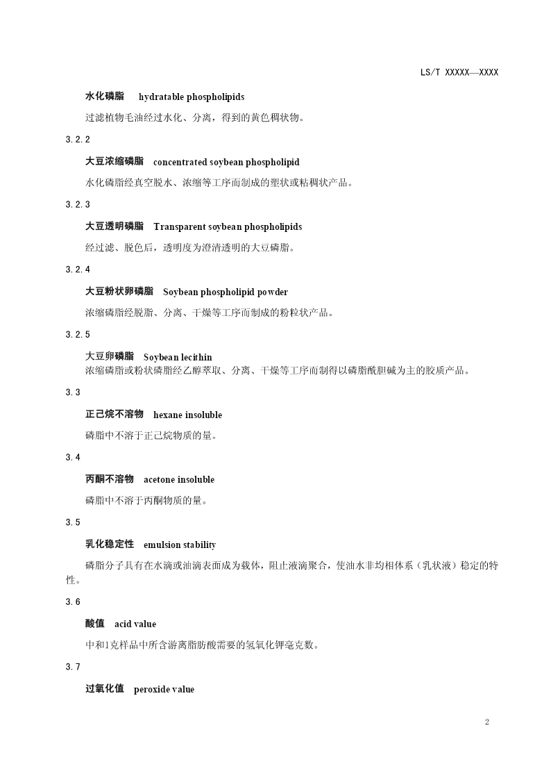 ICS 点击此处添加中国标准文献分类号 中华人民共和国粮食行业标准 LS/TXXXXX—XXXX 大豆磷脂 SoyabeanPhospholipids 点击此处添加与国际标准一致性程度的标识 (征求意见稿) 2013.7 XXXX-XX-XX发布XXXX-XX-XX实施 发布 LS/TXXXXX—XXXX 前言 本标准由国家粮食局提出。 本标准由全国粮油标准化技术委员会归口。 本标准负责起草单位:国家粮食局科学研究院、中储粮总公司 本标准主要起草人: I LS/TXXXXX—XXXX 大豆磷脂 1范围 本标准规定了大豆磷脂的术语和定义、分类、质量要求、检验方法及规则、标签、包装、储存和运 输等要求。 本标准适用于各类商品大豆磷脂。 2规范性引用文件 下列文件对于本文件的应用是必不可少的。凡是注明日期的引用文件,仅注明日期的版本适用于本 文件。凡是不注日期的引用文件,其最新版本(包括所有的修改单)适用于本文件。 GB2716食用植物油卫生标准 GB2760食品安全国家标准食品添加剂使用标准 GB2761食品安全国家标准食品中真菌毒素限量 GB2762食品安全国家标准食品中污染物限量 GB2763食品安全国家标准食品中农药最大残留限量 GB7718食品安全国家标准预包装食品标签通则 GB28050食品安全国家标准预包装食品营养标签通则 GB28401食品安全国家标准食品添加剂磷脂 GB5009.3食品安全国家标准食品中水分的测定 SN/T0802.2进出口磷脂丙酮不溶物检验方法 GB/T5532植物油脂碘值的测定 GB/T5537粮油检验磷脂含量的测定 3术语和定义 下列术语和定义适用于本标准。 3.1 磷脂phosphatide 磷酸甘油酯的简称,普遍存在于植物种子和动物组织中,难溶于丙酮的含磷类脂物。主要形式是脑 磷脂和卵磷脂等。 3.2 大豆磷脂Soybeanphosphatides 是含有磷酸基脂质的总称,是指植物油经水化脱胶、胶分离、脱水后得到的复杂的磷脂混合物,它 是由磷脂酰胆碱、磷脂酰乙醇胺、磷脂酰肌醇、磷脂酰丝胺酸等成分组成。 3.2.1 1 LS/TXXXXX—XXXX 水化磷脂hydratablephospholipids 过滤植物毛油经过水化、分离,得到的黄色稠状物。 3.2.2 大豆浓缩磷脂concentratedsoybeanphospholipid 水化磷脂经真空脱水、浓缩等工序而制成的塑状或粘稠状产品。 3.2.3 大豆透明磷脂Transparentsoybeanphospholipids 经过滤、脱色后,透明度为澄清透明的大豆磷脂。 3.2.4 大豆粉状卵磷脂Soybeanphospholipidpowder 浓缩磷脂经脱脂、分离、干燥等工序而制成的粉粒状产品。 3.2.5 大豆卵磷脂Soybeanlecithin 浓缩磷脂或粉状磷脂经乙醇萃取、分离、干燥等工序而制得以磷脂酰胆碱为主的胶质产品。 3.3 正己烷不溶物hexaneinsoluble 磷脂中不溶于正己烷物质的量。 3.4 丙酮不溶物acetoneinsoluble 磷脂中不溶于丙酮物质的量。 3.5 乳化稳定性emulsionstability 磷脂分子具有在水滴或油滴表面成为载体,阻止液滴聚合,使油水非均相体系(乳状液)稳定的特 性。 3.6 酸值acidvalue 中和1克样品中所含游离脂肪酸需要的氢氧化钾毫克数。 3.7 过氧化值peroxidevalue 2 LS/TXXXXX—XXXX 每千克样品中过氧化物的毫摩尔数。 4分类 根据产品制造工艺和产品性状分为:大豆浓缩磷脂、大豆透明磷脂、大豆粉状磷脂和大豆卵磷脂。 5质量要求 5.1大豆浓缩磷脂质量指标见表1。 表1大豆浓缩磷脂质量指标 指标 项目 一级二级三级 外观呈塑状或粘稠状,质地均匀,无霉变 感官色泽浅黄色至棕色,脱色的产品为浅黄色至黄色 气味具有磷脂固有的气味,无异味 干燥减量,w/%≤1.02.0 正己烷不溶物,w/%≤0.31.03.0 丙酮不溶物,w/%≥65.060.055.0 酸值(以KOH计)/(mg/g)≤30.035.040.0 水合试验不分层 5.2大豆透明磷脂质量指标见表2。 表2大豆透明磷脂质量指标 项目指标 透明度澄清透明 感官色泽色泽为黄色至棕褐色 气味具有磷脂固有的气味,无异味 干燥减量,w/%≤0.8 正己烷不溶物,w/%≤0.1 丙酮不溶物,w/%≥60.0 酸值(以KOH计)/(mg/g)≤30.0 5.3大豆粉状磷脂质量指标见表3。 表3大豆粉状磷脂质量指标 指标 项目 一级