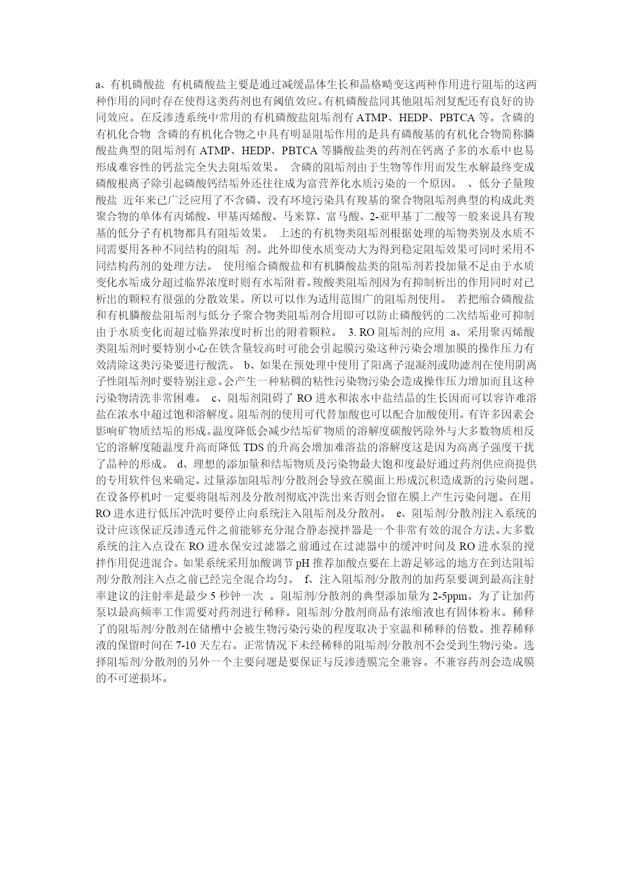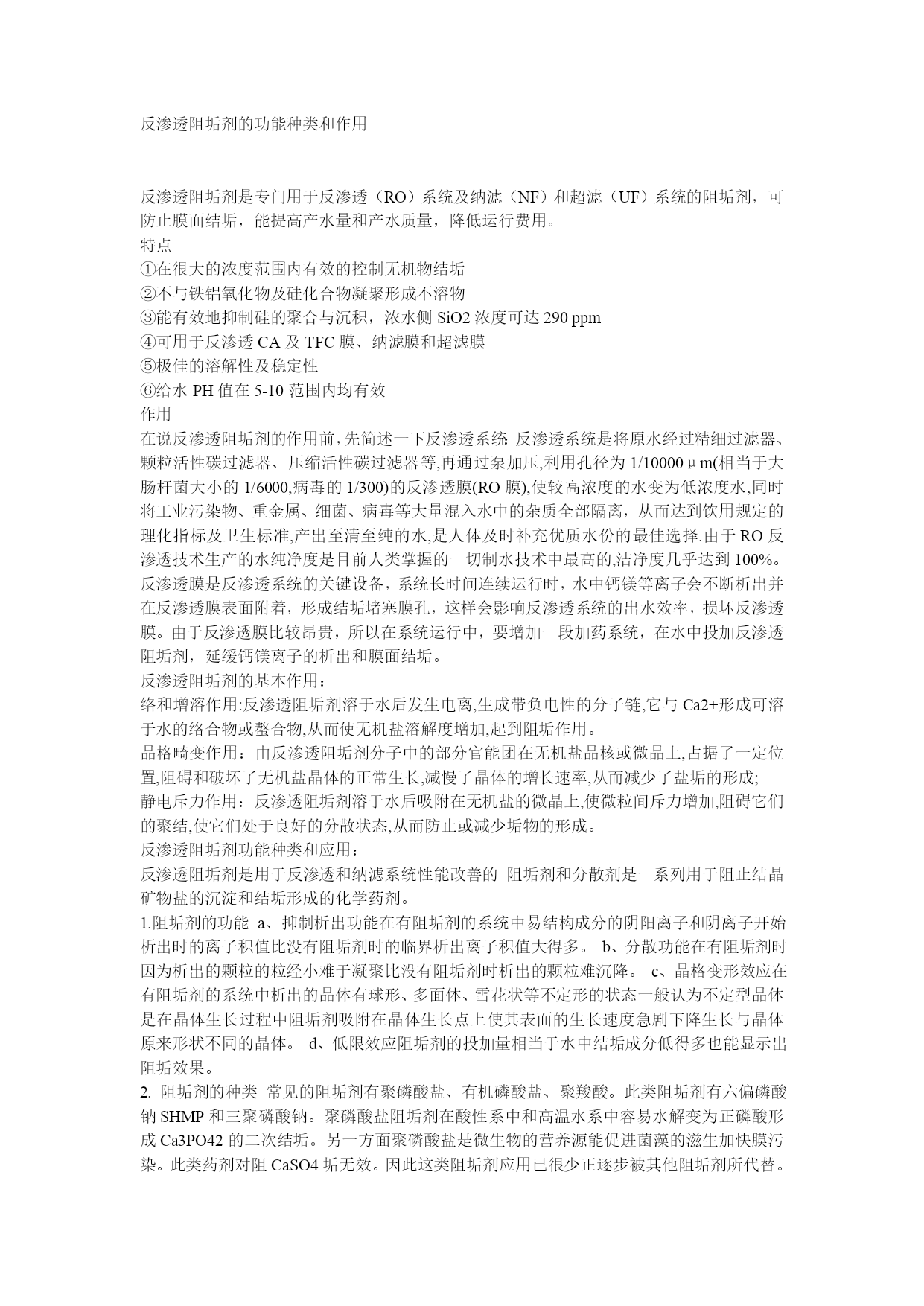 反渗透阻垢剂的功能种类和作用 反渗透阻垢剂是专门用于反渗透(RO)系统及纳滤(NF)和超滤(UF)系统的阻垢剂,可防止膜面结垢,能提高产水量和产水质量,降低运行费用。 特点 ①在很大的浓度范围内有效的控制无机物结垢 ②不与铁铝氧化物及硅化合物凝聚形成不溶物 ③能有效地抑制硅的聚合与沉积,浓水侧SiO2浓度可达290ppm ④可用于反渗透CA及TFC膜、纳滤膜和超滤膜 ⑤极佳的溶解性及稳定性 ⑥给水PH值在5-10范围内均有效 作用 在说反渗透阻垢剂的作用前,先简述一下反渗透系统:反渗透系统是将原水经过精细过滤器、颗粒活性碳过滤器、压缩活性碳过滤器等,再通过泵加压,利用孔径为1/10000μm(相当于大肠杆菌大小的1/6000,病毒的1/300)的反渗透膜(RO膜),使较高浓度的水变为低浓度水,同时将工业污染物、重金属、细菌、病毒等大量混入水中的杂质全部隔离,从而达到饮用规定的理化指标及卫生标准,产出至清至纯的水,是人体及时补充优质水份的最佳选择.由于RO反渗透技术生产的水纯净度是目前人类掌握的一切制水技术中最高的,洁净度几乎达到100%。 反渗透膜是反渗透系统的关键设备,系统长时间连续运行时,水中钙镁等离子会不断析出并在反渗透膜表面附着,形成结垢堵塞膜孔,这样会影响反渗透系统的出水效率,损坏反渗透膜。由于反渗透膜比较昂贵,所以在系统运行中,要增加一段加药系统,在水中投加反渗透阻垢剂,延缓钙镁离子的析出和膜面结垢。 反渗透阻垢剂的基本作用: 络和增溶作用:反渗透阻垢剂溶于水后发生电离,生成带负电性的分子链,它与Ca2+形成可溶于水的络合物或螯合物,从而使无机盐溶解度增加,起到阻垢作用。 晶格畸变作用:由反渗透阻垢剂分子中的部分官能团在无机盐晶核或微晶上,占据了一定位置,阻碍和破坏了无机盐晶体的正常生长,减慢了晶体的增长速率,从而减少了盐垢的形成; 静电斥力作用:反渗透阻垢剂溶于水后吸附在无机盐的微晶上,使微粒间斥力增加,阻碍它们的聚结,使它们处于良好的分散状态,从而防止或减少垢物的形成。 反渗透阻垢剂功能种类和应用: 反渗透阻垢剂是用于反渗透和纳滤系统性能改善的阻垢剂和分散剂是一系列用于阻止结晶矿物盐的沉淀和结垢形成的化学药剂。 1.阻垢剂的功能a、抑制析出功能在有阻垢剂的系统中易结构成分的阴阳离子和阴离子开始析出时的离子积值比没有阻垢剂时的临界析出离子积值大得多。b、分散功能在有阻垢剂时因为析出的颗粒的粒经小难于凝聚比没有阻垢剂时析出的颗粒难沉降。c、晶格变形效应在有阻垢剂的系统中析出的晶体有球形、多面体、雪花状等不定形的状态一般认为不定型晶体是在晶体生长过程中阻垢剂吸附在晶体生长点上使其表面的生长速度急剧下降生长与晶体原来形状不同的晶体。d、低限效应阻垢剂的投加量相当于水中结垢成分低得多也能显示出阻垢效果。 2.阻垢剂的种类常见的阻垢剂有聚磷酸盐、有机磷酸盐、聚羧酸。此类阻垢剂有六偏磷酸钠SHMP和三聚磷酸钠。聚磷酸盐阻垢剂在酸性系中和高温水系中容易水解变为正磷酸形成Ca3PO42的二次结垢。另一方面聚磷酸盐是微生物的营养源能促进菌藻的滋生加快膜污染。此类药剂对阻CaSO4垢无效。因此这类阻垢剂应用已很少正逐步被其他阻垢剂所代替。a、有机磷酸盐有机磷酸盐主要是通过减缓晶体生长和晶格畸变这两种作用进行阻垢的这两种作用的同时存在使得这类药剂也有阈值效应。有机磷酸盐同其他阻垢剂复配还有良好的协同效应。在反渗透系统中常用的有机磷酸盐阻垢剂有ATMP、HEDP、PBTCA等。含磷的有机化合物含磷的有机化合物之中具有明显阻垢作用的是具有磷酸基的有机化合物简称膦酸盐典型的阻垢剂有ATMP、HEDP、PBTCA等膦酸盐类的药剂在钙离子多的水系中也易形成难容性的钙盐完全失去阻垢效果。含磷的阻垢剂由于生物等作用而发生水解最终变成磷酸根离子除引起磷酸钙结垢外还往往成为富营养化水质污染的一个原因。、低分子量羧酸盐近年来已广泛应用了不含磷、没有环境污染具有羧基的聚合物阻垢剂典型的构成此类聚合物的单体有丙烯酸、甲基丙烯酸、马来算、富马酸、2-亚甲基丁二酸等一般来说具有羧基的低分子有机物都具有阻垢效果。上述的有机物类阻垢剂根据处理的垢物类别及水质不同需要用各种不同结构的阻垢剂。此外即使水质变动大为得到稳定阻垢效果可同时采用不同结构药剂的处理方法。使用缩合磷酸盐和有机膦酸盐类的阻垢剂若投加量不足由于水质变化水垢成分超过临界浓度时则有水垢附着。羧酸类阻垢剂因为有抑制析出的作用同时对已析出的颗粒有很强的分散效果。所以可以作为适用范围广的阻垢剂使用。若把缩合磷酸盐和有机膦酸盐阻垢剂与低分子聚合物类阻垢剂合用即可以防止磷酸钙的二次结垢业可抑制由于水质变化而超过临界浓度时析出的附着颗粒。3.RO阻垢剂的应用a、采用聚丙烯酸类阻垢剂时要特别小心在铁含量较高时可能会