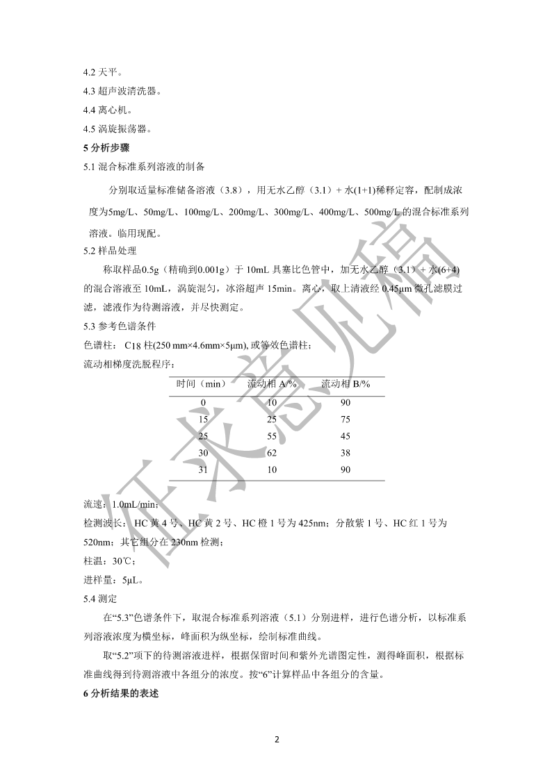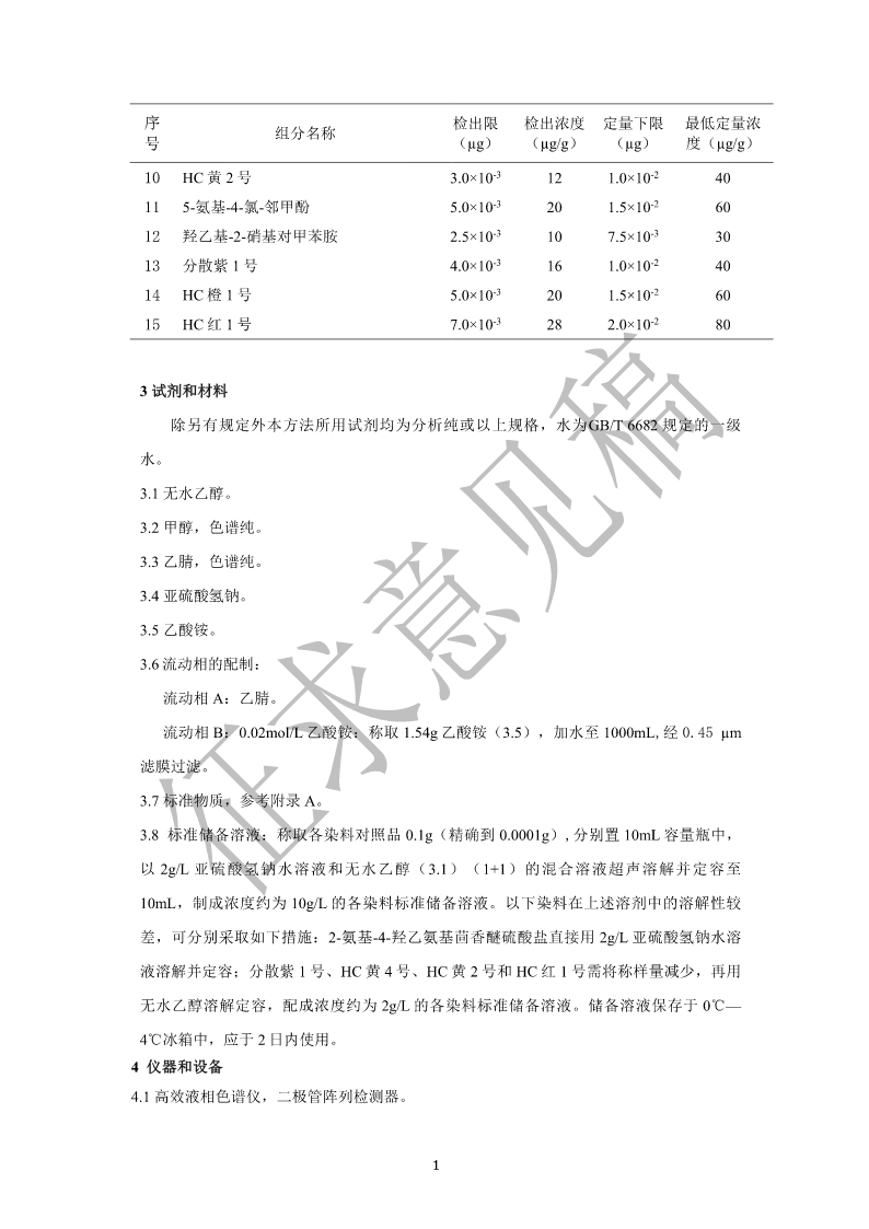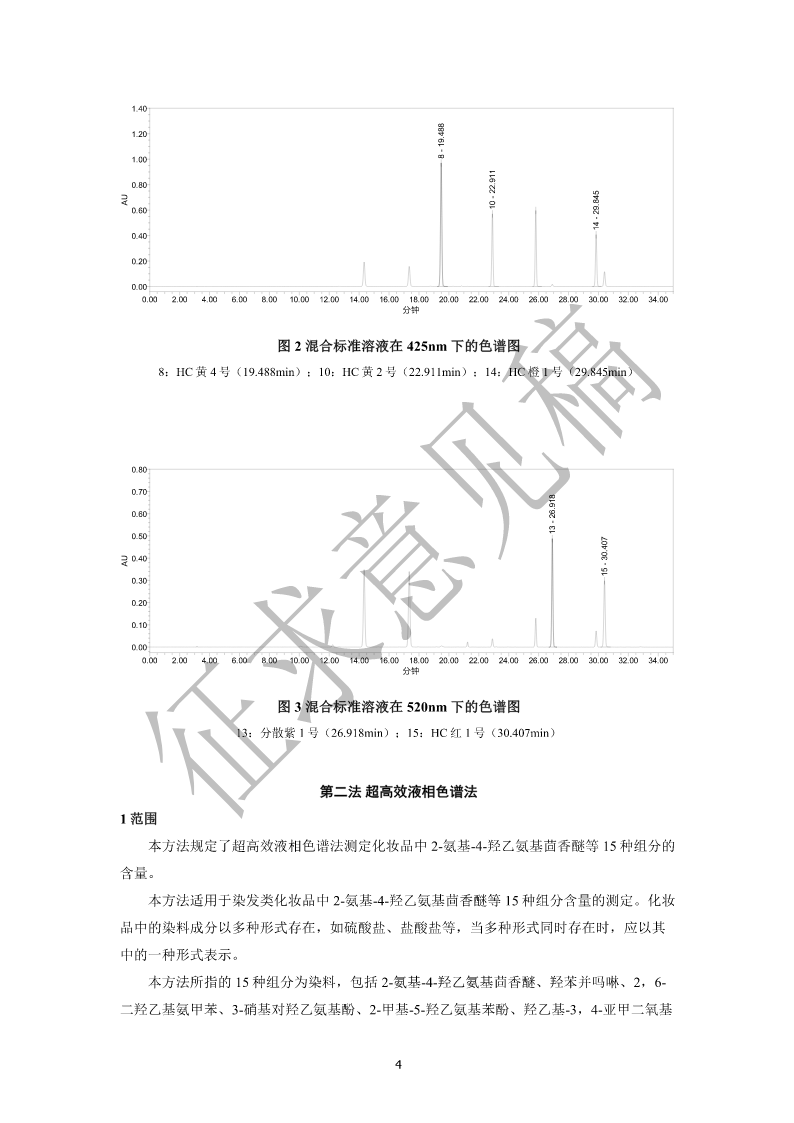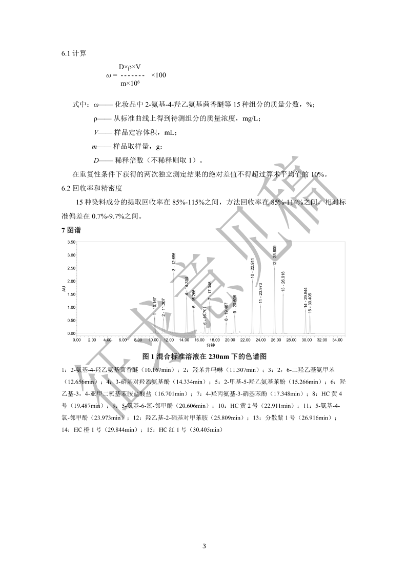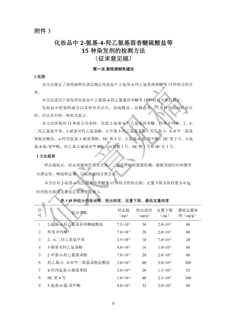 附件3 化妆品中2-氨基-4-羟乙氨基茴香醚硫酸盐等 15种染发剂的检测方法 (征求意见稿) 第一法高效液相色谱法 1范围 本方法规定了高效液相色谱法测定化妆品中2-氨基-4-羟乙氨基茴香醚等15种组分的含 量。 本方法适用于染发类化妆品中2-氨基-4-羟乙氨基茴香醚等15种组分含量的测定。 化妆品中的染料成分以多种形式存在,如硫酸盐、盐酸盐等,当多种形式同时存在 时,应以其中的一种形式表示。 本方法所指的15种组分为染料,包括2-氨基-4-羟乙氨基茴香醚、羟苯并吗啉、2,6- 二羟乙基氨甲苯、3-硝基对羟乙氨基酚、2-甲基-5-羟乙氨基苯酚、羟乙基-3,4-亚甲二氧基 苯胺盐酸盐、4-羟丙氨基-3-硝基苯酚、HC黄4号、5-氨基-6-氯-邻甲酚、HC黄2号、5-氨 基-4-氯-邻甲酚、羟乙基-2-硝基对甲苯胺、分散紫1号、HC橙1号和HC红1号。 2方法提要 样品提取后,经高效液相色谱仪分离,二极管阵列检测器检测,根据保留时间和紫外 光谱定性,峰面积定量,以标准曲线计算含量。 本方法对2-氨基-4-羟乙氨基茴香醚等15种组分的检出限、定量下限及取样量为0.5g 时的检出浓度及最低定量浓度见表1。 表115种组分的检出限、检出浓度、定量下限、最低定量浓度 序检出限检出浓度定量下限最低定量浓 组分名称 号(µg)(µg/g)(µg)度(µg/g) 12-氨基-4-羟乙氨基茴香醚硫酸盐7.5×10-3302.0×10-280 2羟苯并吗啉7.0×10-3282.0×10-280 32,6-二羟乙基氨甲苯2.5×10-3107.0×10-328 43-硝基对羟乙氨基酚4.0×10-3161.0×10-240 52-甲基-5-羟乙氨基苯酚7.0×10-3282.0×10-280 6羟乙基-3,4-亚甲二氧基苯胺盐酸盐2.0×10-2805.0×10-2200 74-羟丙氨基-3-硝基苯酚5.0×10-3201.3×10-252 8HC黄4号1.0×10-2402.5×10-2100 95-氨基-6-氯-邻甲酚8.0×10-3322.0×10-280 0 序检出限检出浓度定量下限最低定量浓 组分名称 号(µg)(µg/g)(µg)度(µg/g) 10HC黄2号3.0×10-3121.0×10-240 115-氨基-4-氯-邻甲酚5.0×10-3201.5×10-260 12羟乙基-2-硝基对甲苯胺2.5×10-3107.5×10-330 13分散紫1号4.0×10-3161.0×10-240 14HC橙1号5.0×10-3201.5×10-260 15HC红1号7.0×10-3282.0×10-280 3试剂和材料 除另有规定外本方法所用试剂均为分析纯或以上规格,水为GB/T6682规定的一级 水。 3.1无水乙醇。 3.2甲醇,色谱纯。 3.3乙腈,色谱纯。 3.4亚硫酸氢钠。 3.5乙酸铵。 3.6流动相的配制: 流动相A:乙腈。 流动相B:0.02mol/L乙酸铵:称取1.54g乙酸铵(3.5),加水至1000mL,经0.45µm 滤膜过滤。 3.7标准物质,参考附录A。 3.8标准储备溶液:称取各染料对照品0.1g(精确到0.0001g),分别置10mL容量瓶中, 以2g/L亚硫酸氢钠水溶液和无水乙醇(3.1)(1+1)的混合溶液超声溶解并定容至 10mL,制成浓度约为10g/L的各染料标准储备溶液。以下染料在上述溶剂中的溶解性较 差,可分别采取如下措施:2-氨基-4-羟乙氨基茴香醚硫酸盐直接用2g/L亚硫酸氢钠水溶 液溶解并定容;分散紫1号、HC黄4号、HC黄2号和HC红1号需将称样量减少,再用 无水乙醇溶解定容,配成浓度约为2g/L的各染料标准储备溶液。储备溶液保存于0℃— 4℃冰箱中,应于2日内使用。 4仪器和设备 4.1高效液相色谱仪,二极管阵列检测器。 1 4.2天平。 4.3超声波清洗器。 4.4离心机。 4.5涡旋振荡器。 5分析步骤 5.1混合标准系列溶液的制备 分别取适量标准储备溶液(3.8),用无水乙醇(3.1)+水(1+1)稀释定容,配制成浓 度为5mg/L、50mg/L、100mg/L、200mg/L、300mg/L、400mg/L、500mg/L的混合标准系列 溶液。临用现配。 5.2样品处理 称取样品0.5g(精确到0.001g)于10mL具塞比色管中,加无水乙醇(3.1)+水(6+4) 的混合溶液至10mL,涡旋混匀,冰浴超声15min。离心,取上清液经0.45µm微孔滤膜过 滤,滤液作为待测溶液,并尽快测定。 5.3参考色谱条件 色谱柱:C18柱(250mm×4.6mm×5μm),或等效色谱柱; 流动相梯度洗