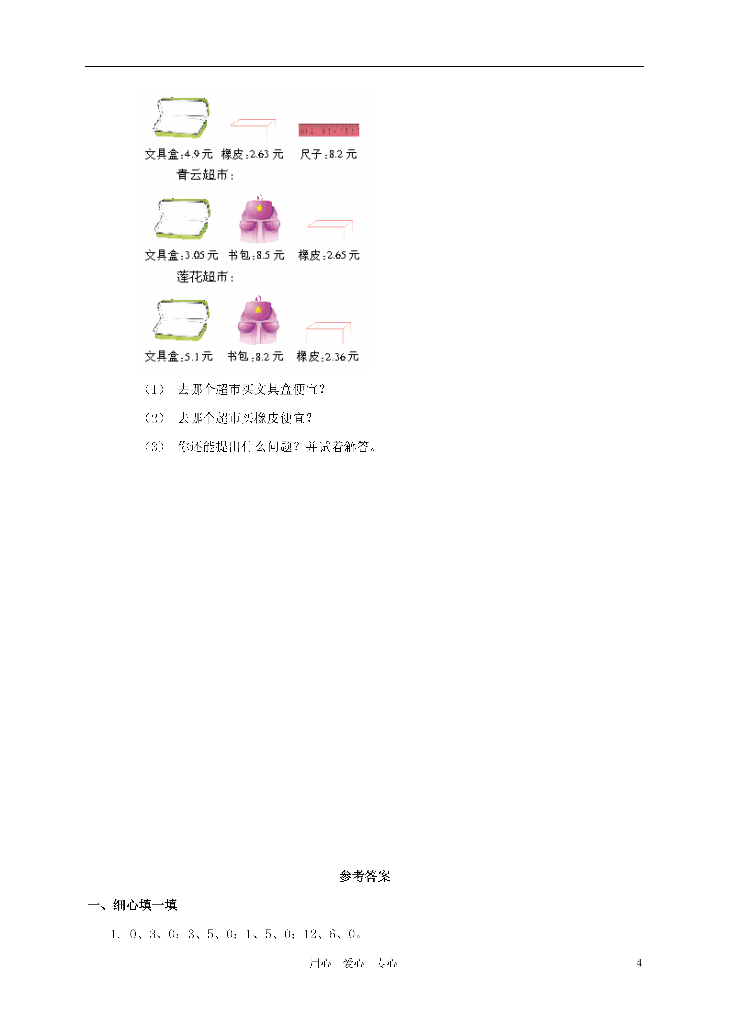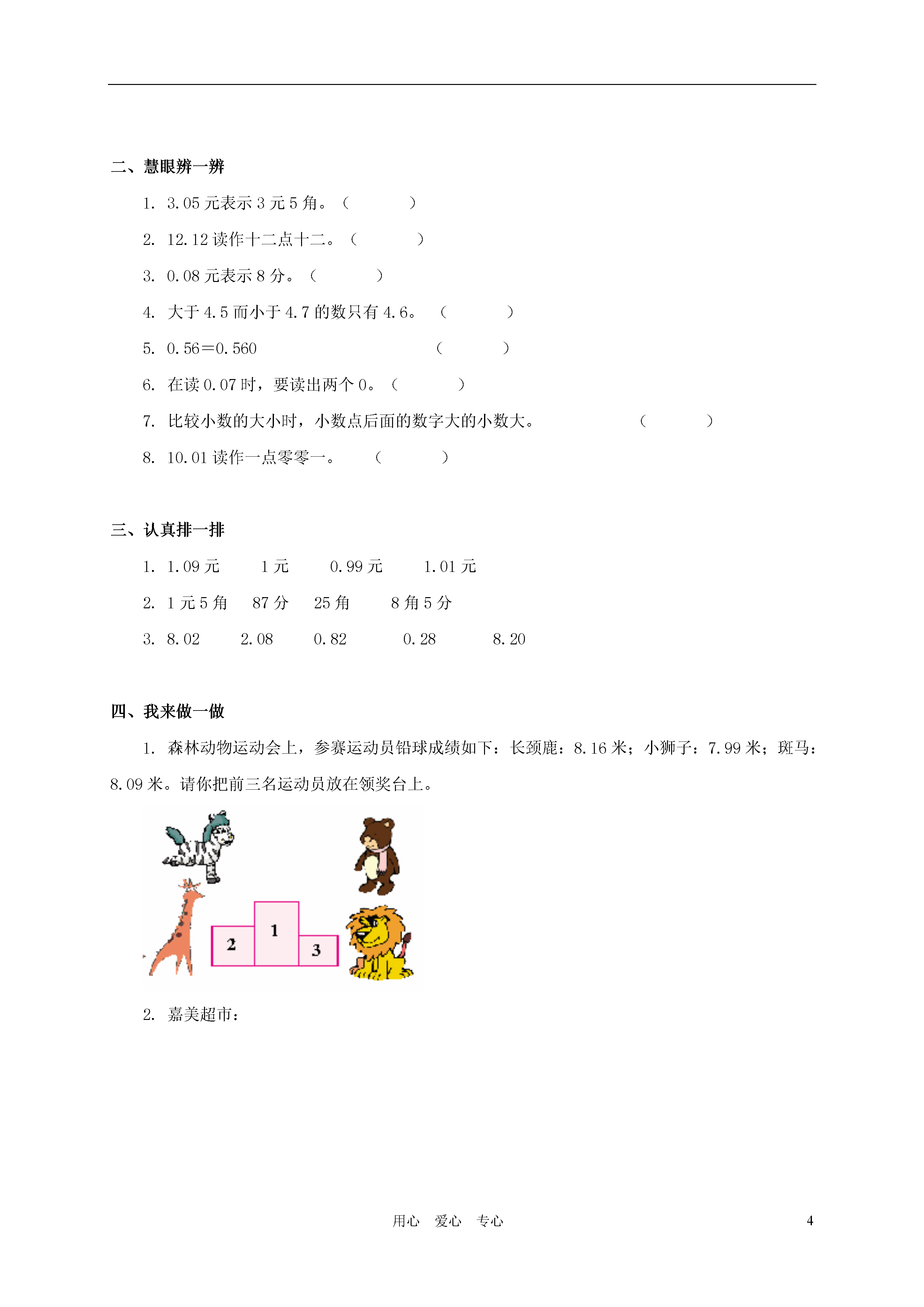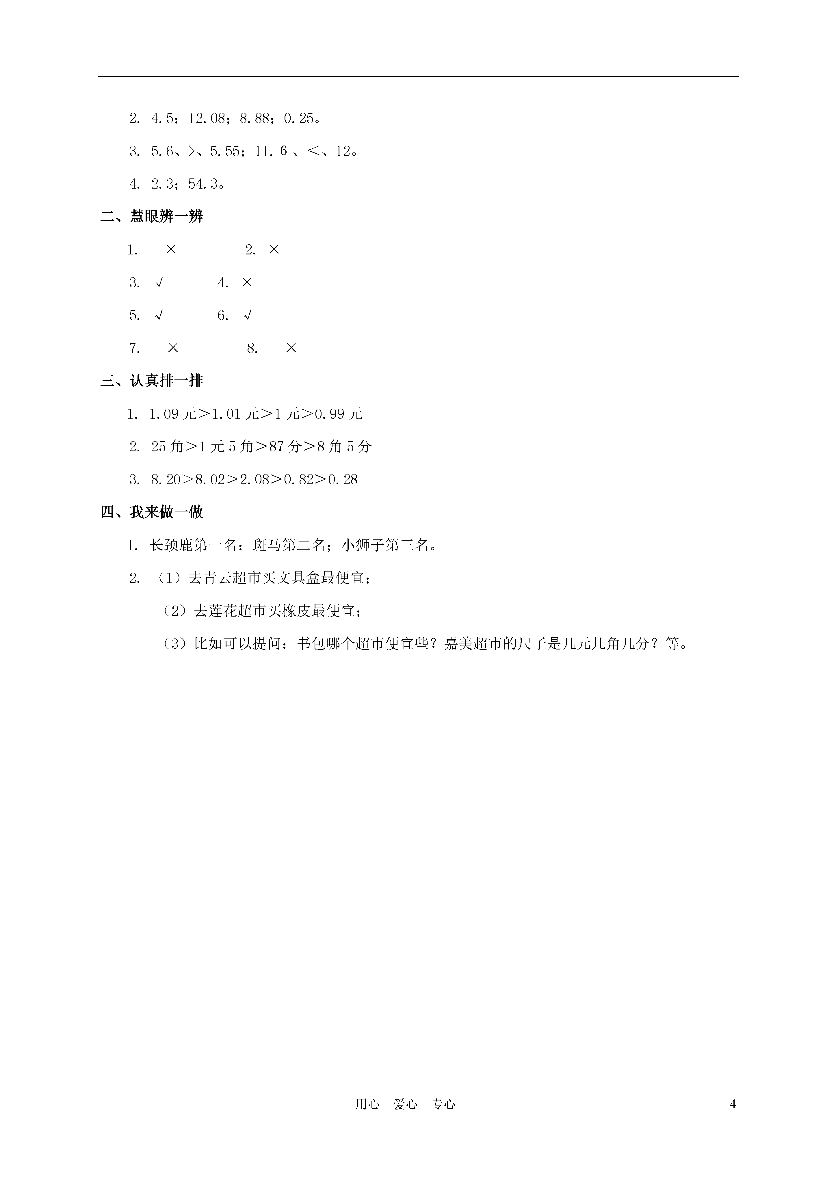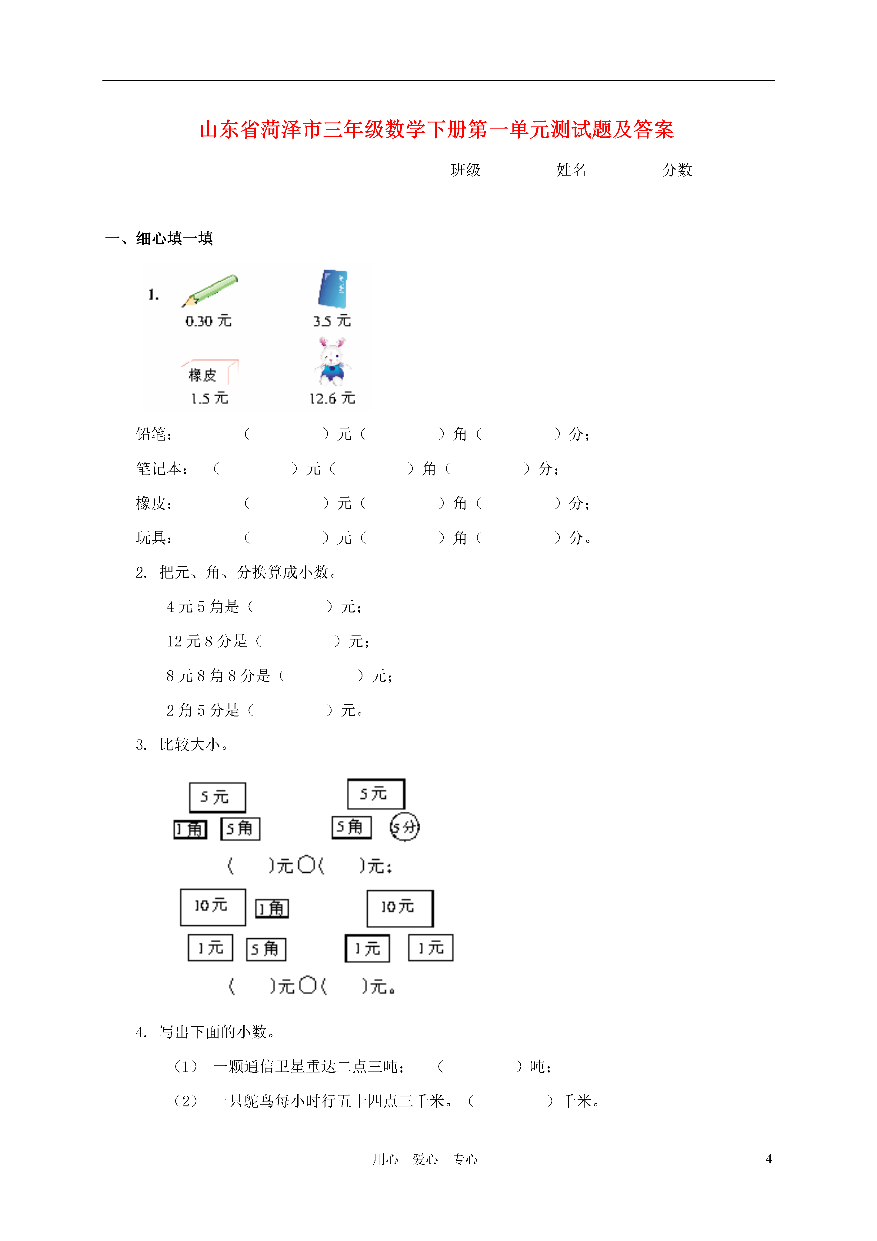4用心爱心专心山东省菏泽市三年级数学下册第一单元测试题及答案班级_______姓名_______分数_______一、细心填一填铅笔:()元()角()分;笔记本:()元()角()分;橡皮:()元()角()分;玩具:()元()角()分。2.把元、角、分换算成小数。4元5角是()元;12元8分是()元;8元8角8分是()元;2角5分是()元。3.比较大小。4.写出下面的小数。(1)一颗通信卫星重达二点三吨;()吨;(2)一只鸵鸟每小时行五十四点三千米。()千米。二、慧眼辨一辨1.3.05元表示3元5角。()2.12.12读作十二点十二。()3.0.08元表示8分。()4.大于4.5而小于4.7的数只有4.6。()5.0.56=0.560()6.在读0.07时,要读出两个0。()7.比较小数的大小时,小数点后面的数字大的小数大。()8.10.01读作一点零零一。()三、认真排一排1.1.09元1元0.99元1.01元2.1元5角87分25角8角5分3.8.022.080.820.288.20四、我来做一做1.森林动物运动会上,参赛运动员铅球成绩如下:长颈鹿:8.16米;小狮子:7.99米;斑马:8.09米。请你把前三名运动员放在领奖台上。2.嘉美超市:(1)去哪个超市买文具盒便宜?(2)去哪个超市买橡皮便宜?(3)你还能提出什么问题?并试着解答。参考答案一、细心填一填1.0、3、0;3、5、0;1、5、0;12、6、0。2.4.5;12.08;8.88;0.25。3.5.6、>、5.55;11.6、<、12。4.2.3;54.3。二、慧眼辨一辨1.×2.×3.√4.×5.√6.√7.×8.×三、认真排一排1.1.09元>1.01元>1元>0.99元2.25角>1元5角>87分>8角5分3.8.20>8.02>2.08>0.82>0.28四、我来做一做1.长颈鹿第一名;斑马第二名;小狮子第三名。2.(1)去青云超市买文具盒最便宜;(2)去莲花超市买橡皮最便宜;(3)比如可以提问:书包哪个超市便宜些?嘉美超市的尺子是几元几角几分?等。