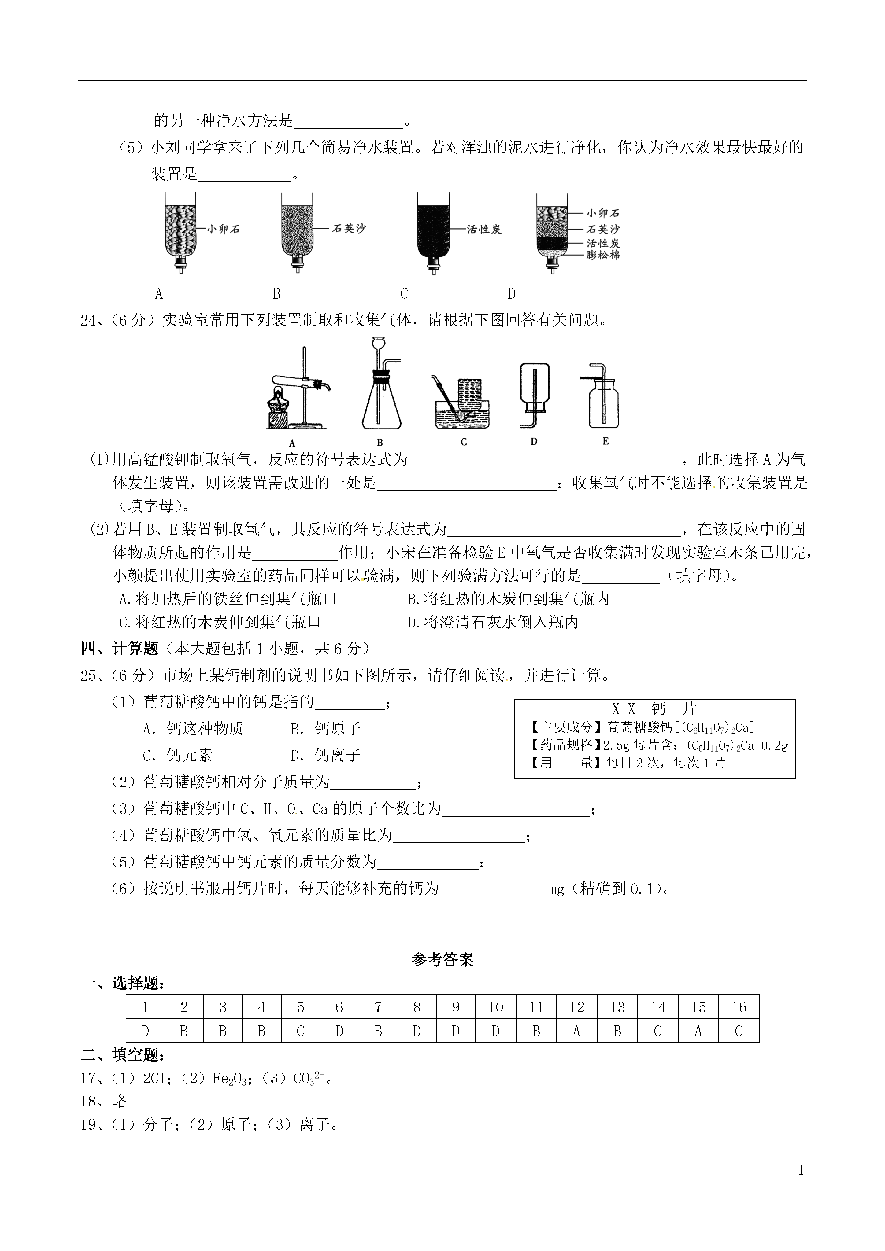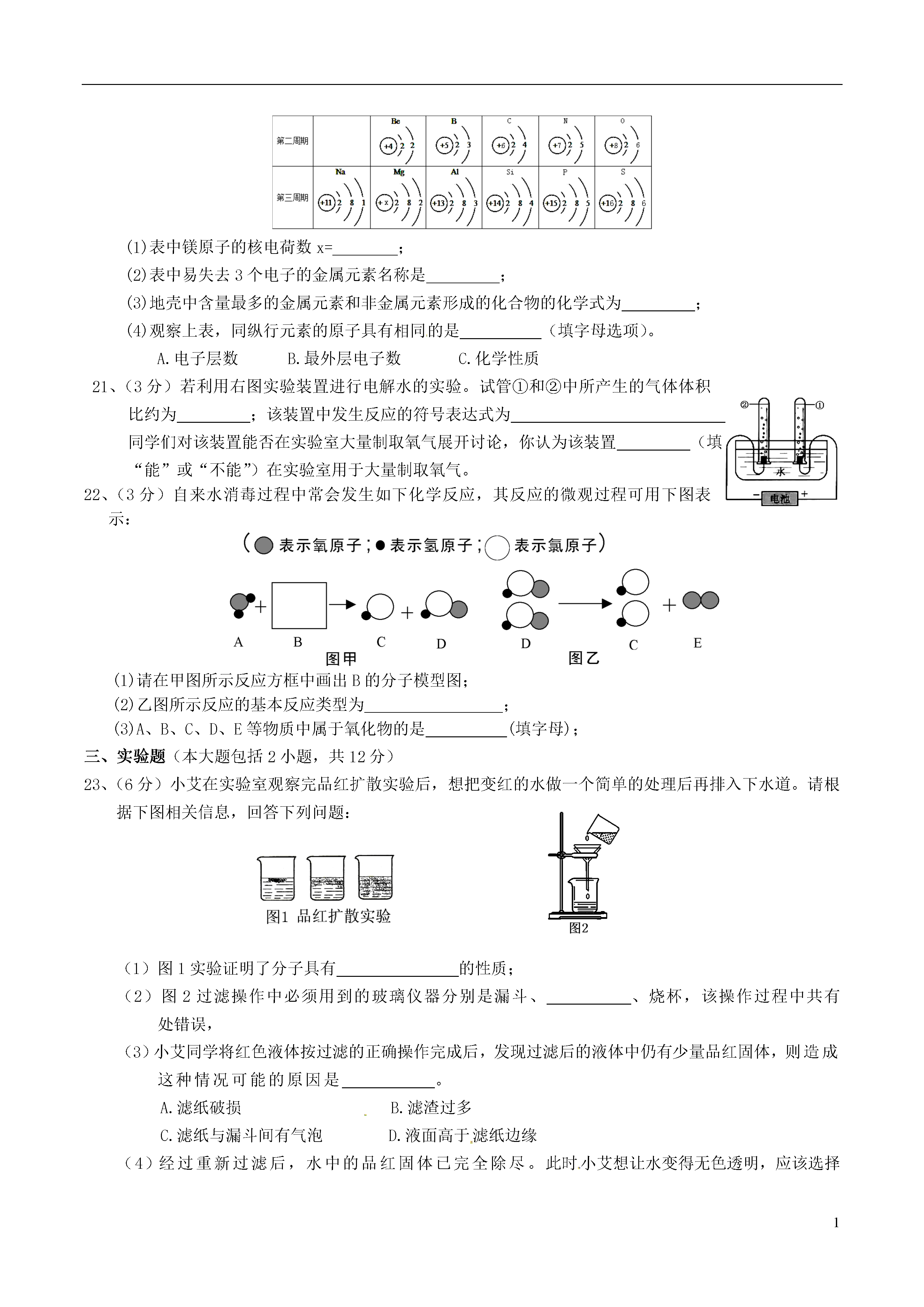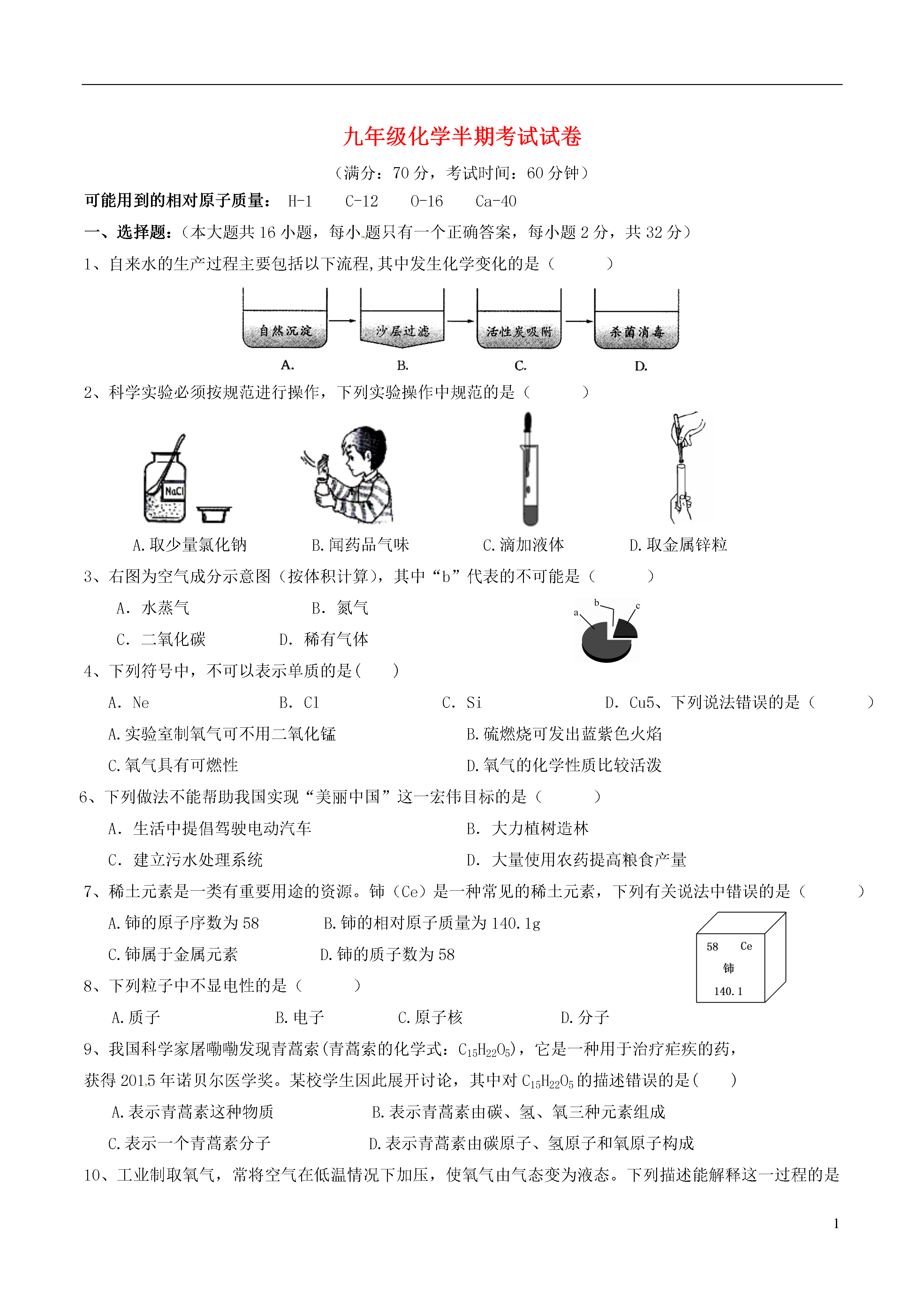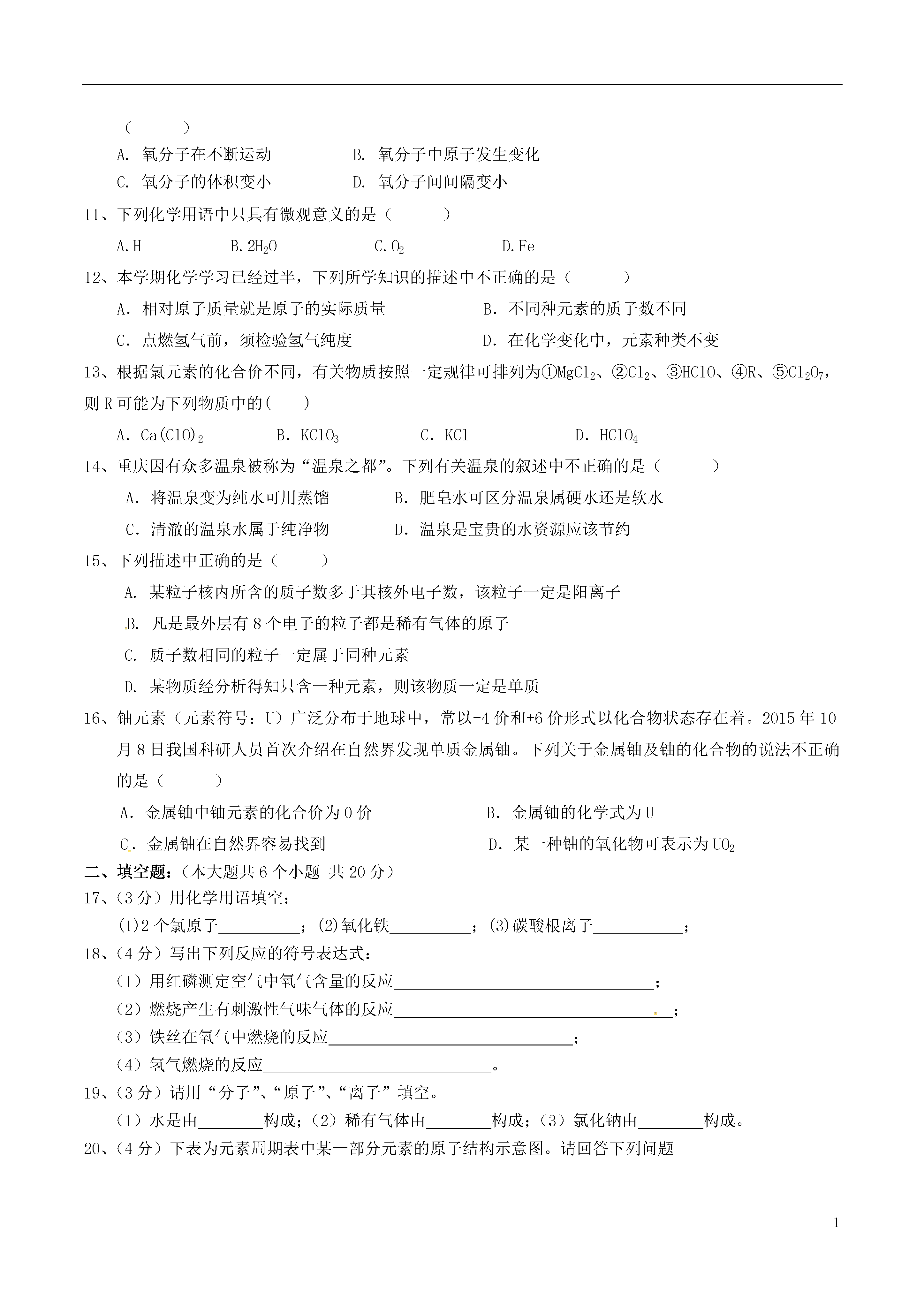 1九年级化学半期考试试卷(满分:70分,考试时间:60分钟)可能用到的相对原子质量:H-1C-12O-16Ca-40一、选择题:(本大题共16小题,每小题只有一个正确答案,每小题2分,共32分)1、自来水的生产过程主要包括以下流程,其中发生化学变化的是()2、科学实验必须按规范进行操作,下列实验操作中规范的是()A.取少量氯化钠B.闻药品气味C.滴加液体D.取金属锌粒3、右图为空气成分示意图(按体积计算),其中“b”代表的不可能是()水蒸气B.氮气C.二氧化碳D.稀有气体4、下列符号中,不可以表示单质的是()A.NeB.ClC.SiD.Cu5、下列说法错误的是()A.实验室制氧气可不用二氧化锰B.硫燃烧可发出蓝紫色火焰C.氧气具有可燃性D.氧气的化学性质比较活泼6、下列做法不能帮助我国实现“美丽中国”这一宏伟目标的是()A.生活中提倡驾驶电动汽车B.大力植树造林C.建立污水处理系统D.大量使用农药提高粮食产量7、稀土元素是一类有重要用途的资源。铈(Ce)是一种常见的稀土元素,下列有关说法中错误的是()铈的原子序数为58B.铈的相对原子质量为140.1gC.铈属于金属元素D.铈的质子数为588、下列粒子中不显电性的是()A.质子B.电子C.原子核D.分子9、我国科学家屠嘞嘞发现青蒿索(青蒿索的化学式:C15H22O5),它是一种用于治疗疟疾的药,获得2015年诺贝尔医学奖。某校学生因此展开讨论,其中对C15H22O5的描述错误的是()表示青蒿素这种物质B.表示青蒿素由碳、氢、氧三种元素组成C.表示一个青蒿素分子D.表示青蒿素由碳原子、氢原子和氧原子构成10、工业制取氧气,常将空气在低温情况下加压,使氧气由气态变为液态。下列描述能解释这一过程的是()A.氧分子在不断运动B.氧分子中原子发生变化C.氧分子的体积变小D.氧分子间间隔变小11、下列化学用语中只具有微观意义的是()A.HB.2H2OC.O2D.Fe12、本学期化学学习已经过半,下列所学知识的描述中不正确的是()A.相对原子质量就是原子的实际质量B.不同种元素的质子数不同C.点燃氢气前,须检验氢气纯度D.在化学变化中,元素种类不变13、根据氯元素的化合价不同,有关物质按照一定规律可排列为①MgCl2、②Cl2、③HClO、④R、⑤Cl2O7,则R可能为下列物质中的()A.Ca(ClO)2B.KClO3C.KClD.HClO414、重庆因有众多温泉被称为“温泉之都”。下列有关温泉的叙述中不正确的是()A.将温泉变为纯水可用蒸馏B.肥皂水可区分温泉属硬水还是软水C.清澈的温泉水属于纯净物D.温泉是宝贵的水资源应该节约15、下列描述中正确的是()A.某粒子核内所含的质子数多于其核外电子数,该粒子一定是阳离子B.凡是最外层有8个电子的粒子都是稀有气体的原子C.质子数相同的粒子一定属于同种元素D.某物质经分析得知只含一种元素,则该物质一定是单质16、铀元素(元素符号:U)广泛分布于地球中,常以+4价和+6价形式以化合物状态存在着。2015年10月8日我国科研人员首次介绍在自然界发现单质金属铀。下列关于金属铀及铀的化合物的说法不正确的是()A.金属铀中铀元素的化合价为0价B.金属铀的化学式为UC.金属铀在自然界容易找到D.某一种铀的氧化物可表示为UO2二、填空题:(本大题共6个小题共20分)17、(3分)用化学用语填空:(1)2个氯原子;(2)氧化铁;(3)碳酸根离子;18、(4分)写出下列反应的符号表达式:(1)用红磷测定空气中氧气含量的反应;(2)燃烧产生有刺激性气味气体的反应;(3)铁丝在氧气中燃烧的反应;(4)氢气燃烧的反应。19、(3分)请用“分子”、“原子”、“离子”填空。(1)水是由构成;(2)稀有气体由构成;(3)氯化钠由构成。20、(4分)下表为元素周期表中某一部分元素的原子结构示意图。请回答下列问题(1)表中镁原子的核电荷数x=;(2)表中易失去3个电子的金属元素名称是;(3)地壳中含量最多的金属元素和非金属元素形成的化合物的化学式为;(4)观察上表,同纵行元素的原子具有相同的是(填字母选项)。A.电子层数B.最外层电子数C.化学性质21、(3分)若利用右图实验装置进行电解水的实验。试管①和②中所产生的气体体积比约为;该装置中发生反应的符号表达式为;同学们对该装置能否在实验室大量制取氧气展开讨论,你认为该装置(填“能”或“不能”)在实验室用于大量制取氧气。22、(3分)自来水消毒过程中常会发生如下化学反应,其反应的微观过程可用下图表示:(1)请在甲图所示反应方框中画出B的分子模型图;(2)乙图所示反应的基本反应类