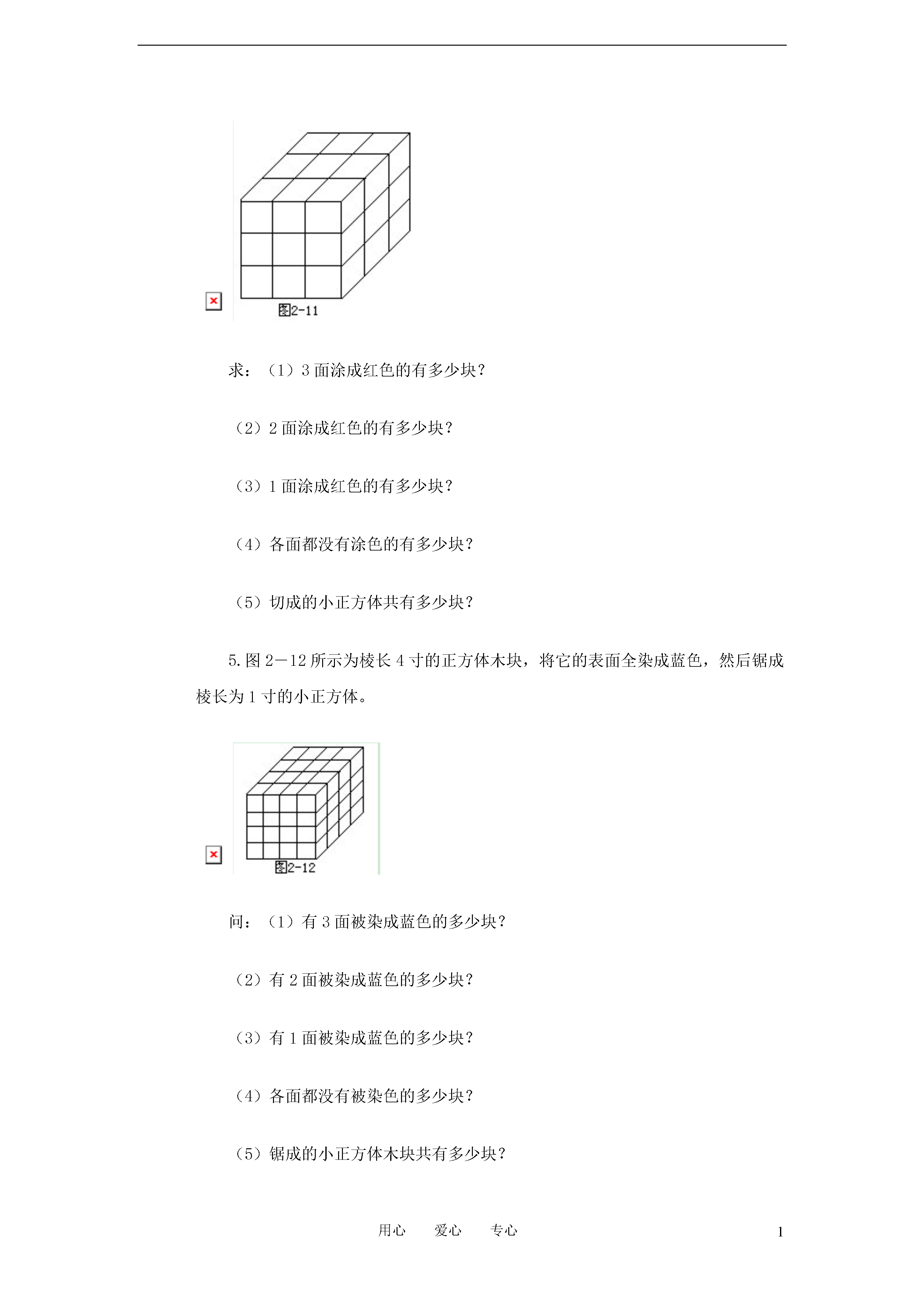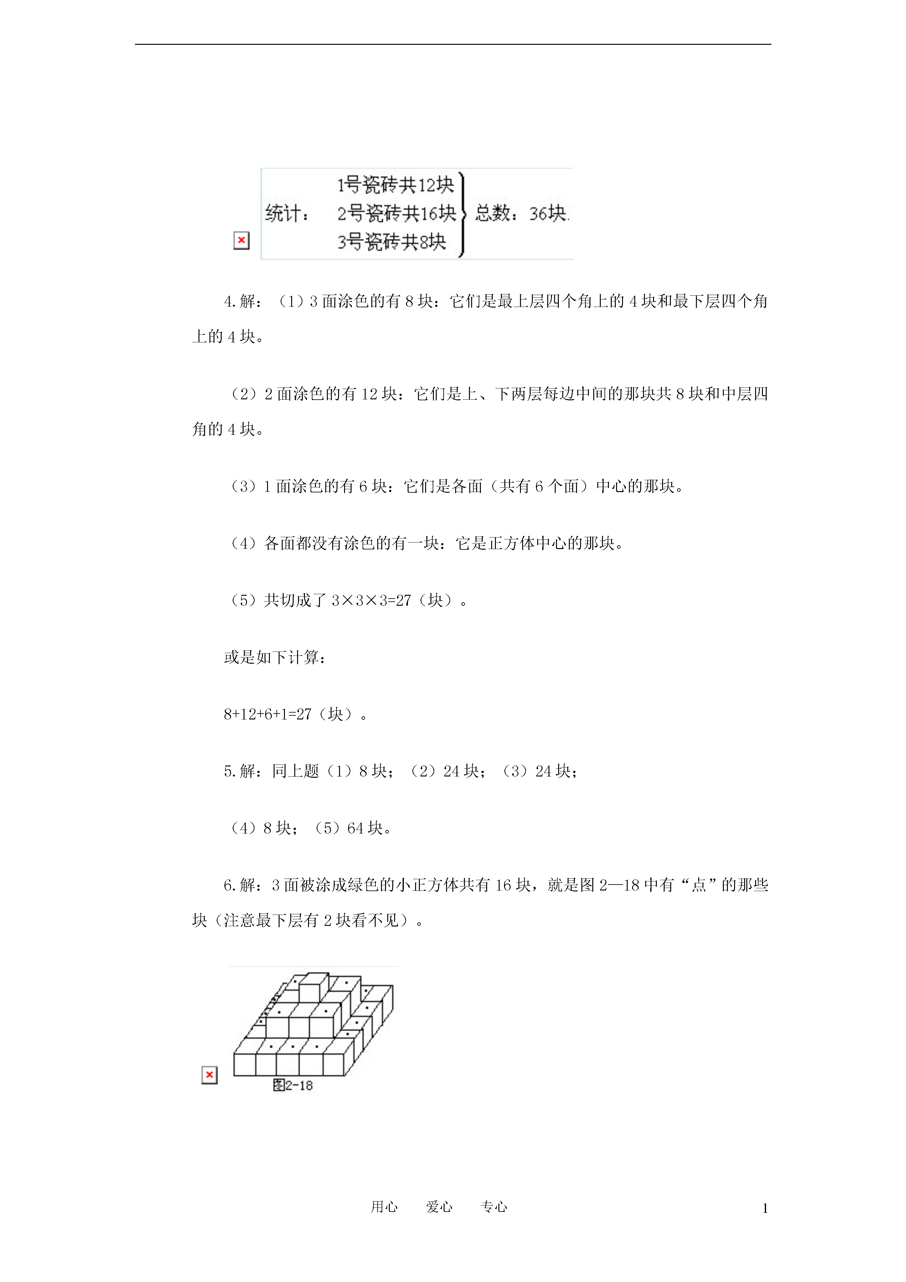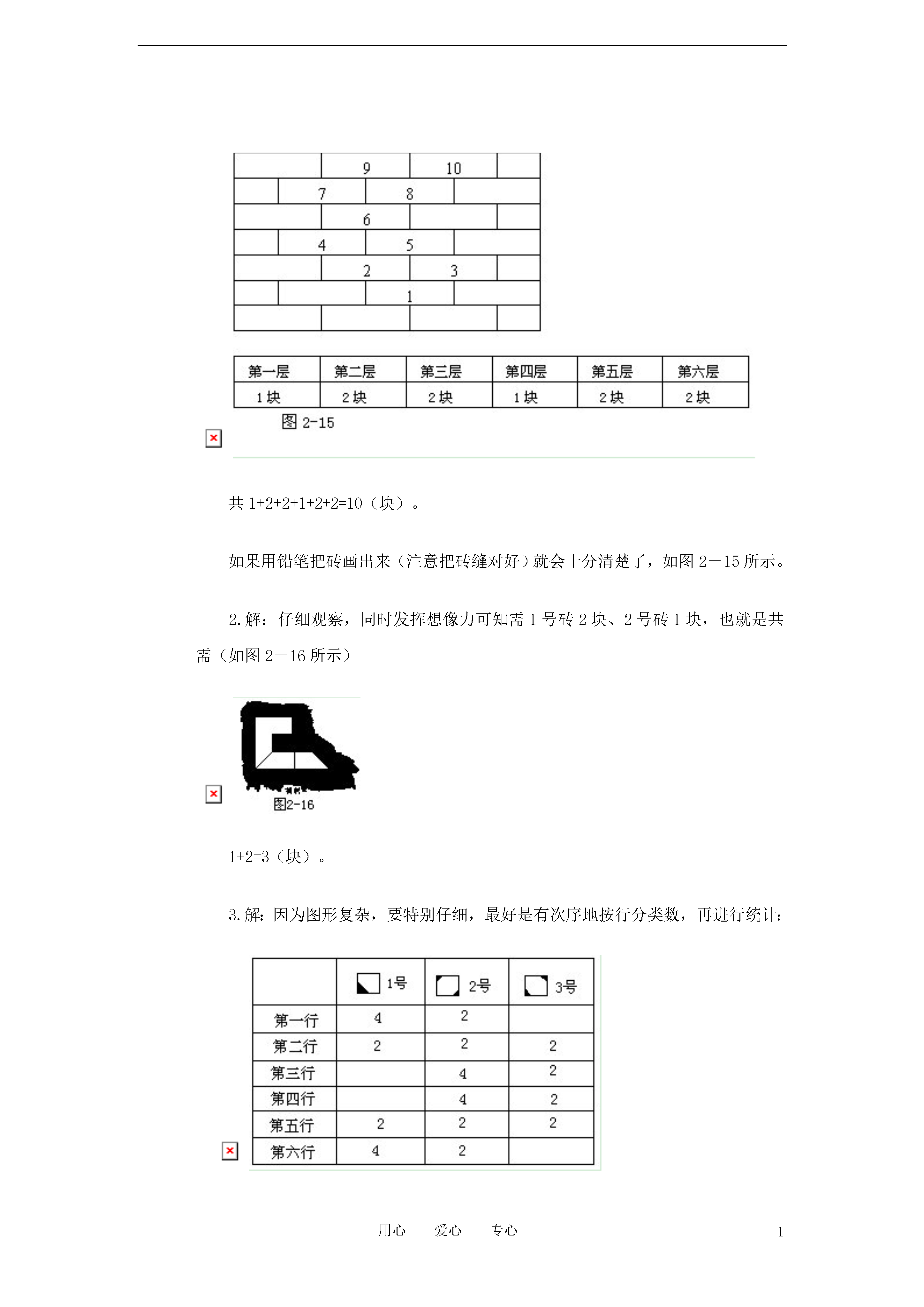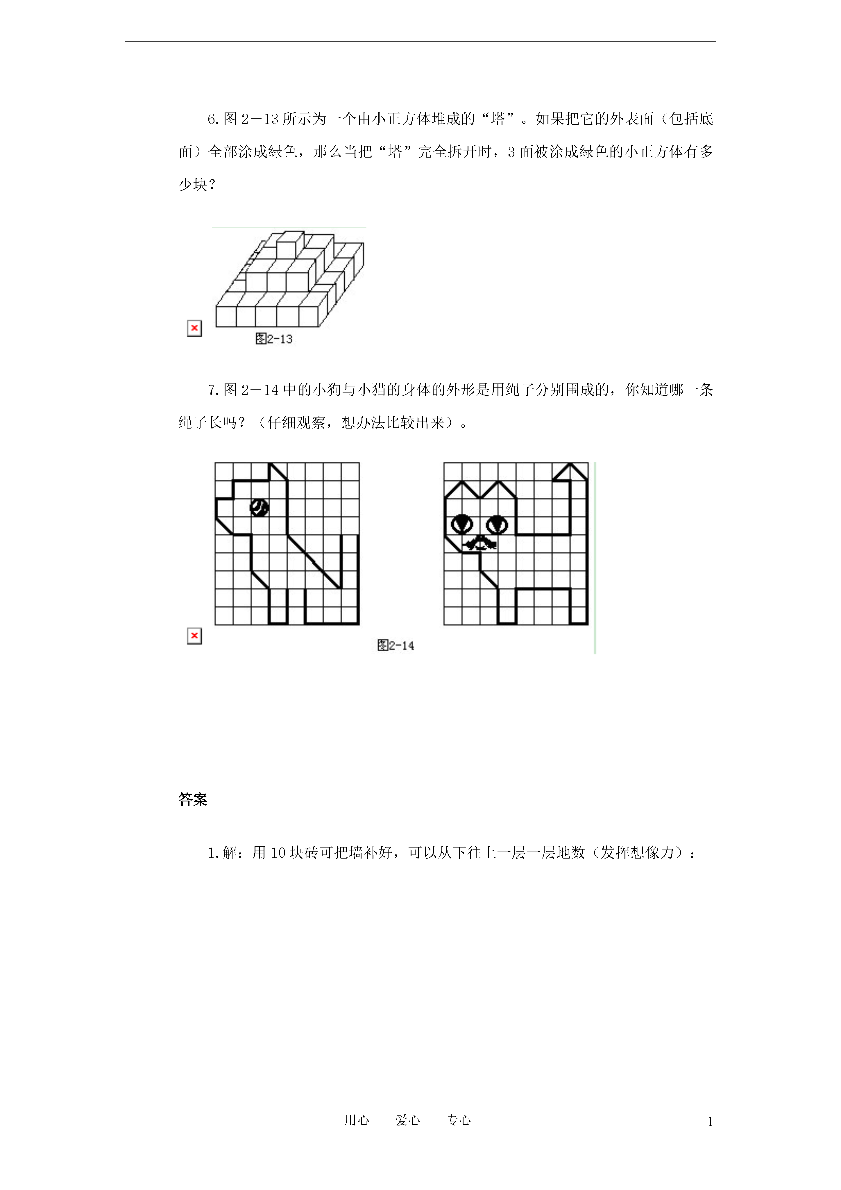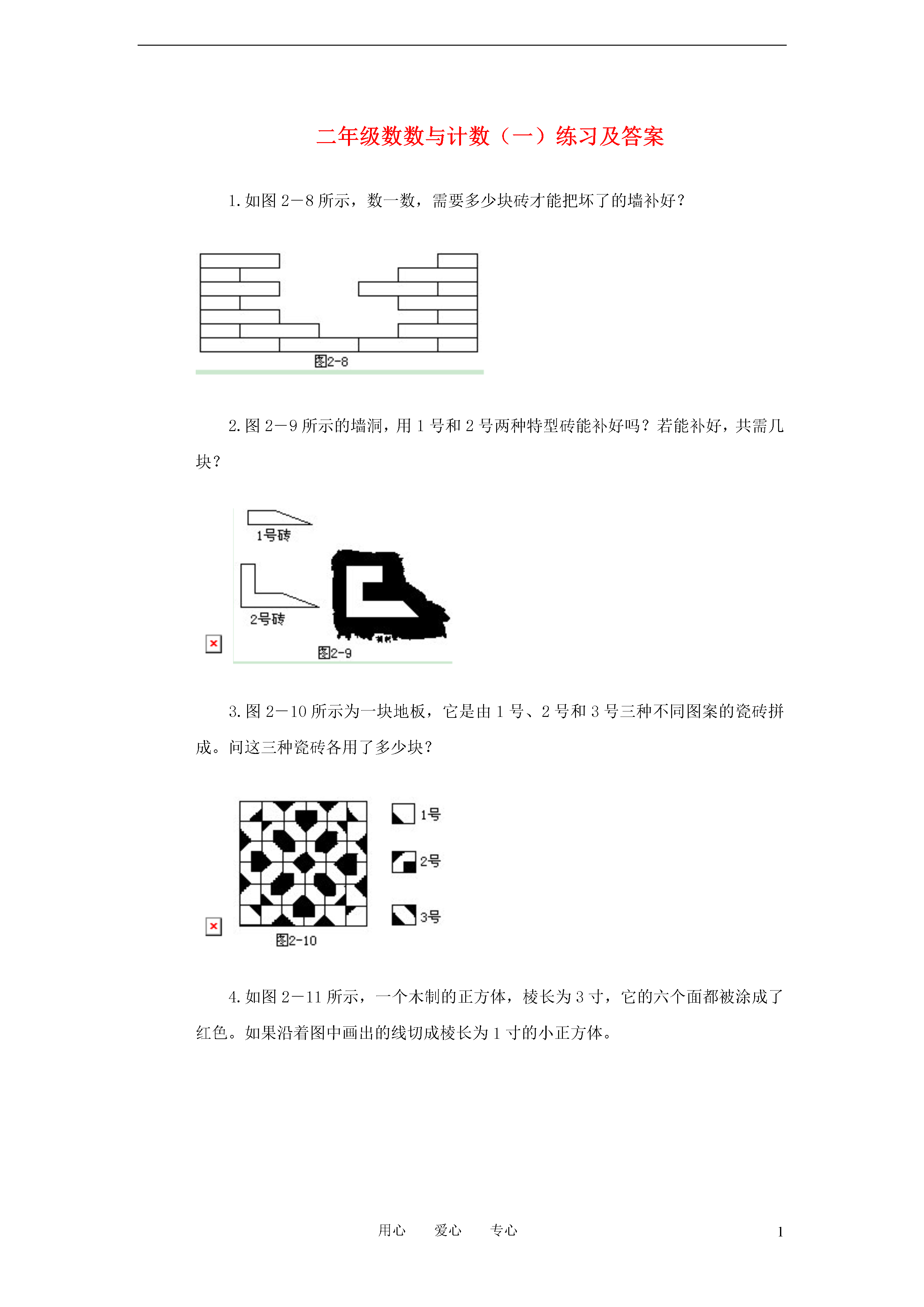 1用心爱心专心二年级数数与计数(一)练习及答案1.如图2-8所示,数一数,需要多少块砖才能把坏了的墙补好?2.图2-9所示的墙洞,用1号和2号两种特型砖能补好吗?若能补好,共需几块?3.图2-10所示为一块地板,它是由1号、2号和3号三种不同图案的瓷砖拼成。问这三种瓷砖各用了多少块?4.如图2-11所示,一个木制的正方体,棱长为3寸,它的六个面都被涂成了红色。如果沿着图中画出的线切成棱长为1寸的小正方体。求:(1)3面涂成红色的有多少块?(2)2面涂成红色的有多少块?(3)1面涂成红色的有多少块?(4)各面都没有涂色的有多少块?(5)切成的小正方体共有多少块?5.图2-12所示为棱长4寸的正方体木块,将它的表面全染成蓝色,然后锯成棱长为1寸的小正方体。问:(1)有3面被染成蓝色的多少块?(2)有2面被染成蓝色的多少块?(3)有1面被染成蓝色的多少块?(4)各面都没有被染色的多少块?(5)锯成的小正方体木块共有多少块?6.图2-13所示为一个由小正方体堆成的“塔”。如果把它的外表面(包括底面)全部涂成绿色,那么当把“塔”完全拆开时,3面被涂成绿色的小正方体有多少块?7.图2-14中的小狗与小猫的身体的外形是用绳子分别围成的,你知道哪一条绳子长吗?(仔细观察,想办法比较出来)。答案1.解:用10块砖可把墙补好,可以从下往上一层一层地数(发挥想像力):共1+2+2+1+2+2=10(块)。如果用铅笔把砖画出来(注意把砖缝对好)就会十分清楚了,如图2-15所示。2.解:仔细观察,同时发挥想像力可知需1号砖2块、2号砖1块,也就是共需(如图2-16所示)1+2=3(块)。3.解:因为图形复杂,要特别仔细,最好是有次序地按行分类数,再进行统计:4.解:(1)3面涂色的有8块:它们是最上层四个角上的4块和最下层四个角上的4块。(2)2面涂色的有12块:它们是上、下两层每边中间的那块共8块和中层四角的4块。(3)1面涂色的有6块:它们是各面(共有6个面)中心的那块。(4)各面都没有涂色的有一块:它是正方体中心的那块。(5)共切成了3×3×3=27(块)。或是如下计算:8+12+6+1=27(块)。5.解:同上题(1)8块;(2)24块;(3)24块;(4)8块;(5)64块。6.解:3面被涂成绿色的小正方体共有16块,就是图2—18中有“点”的那些块(注意最下层有2块看不见)。7.解:分类数一数可知,围成小猫的那条绳子比较长。因为小狗身体的外形是由32条直线段和6条斜线段组成;小猫身体的外形是由32条直线段和8条斜线段组成。