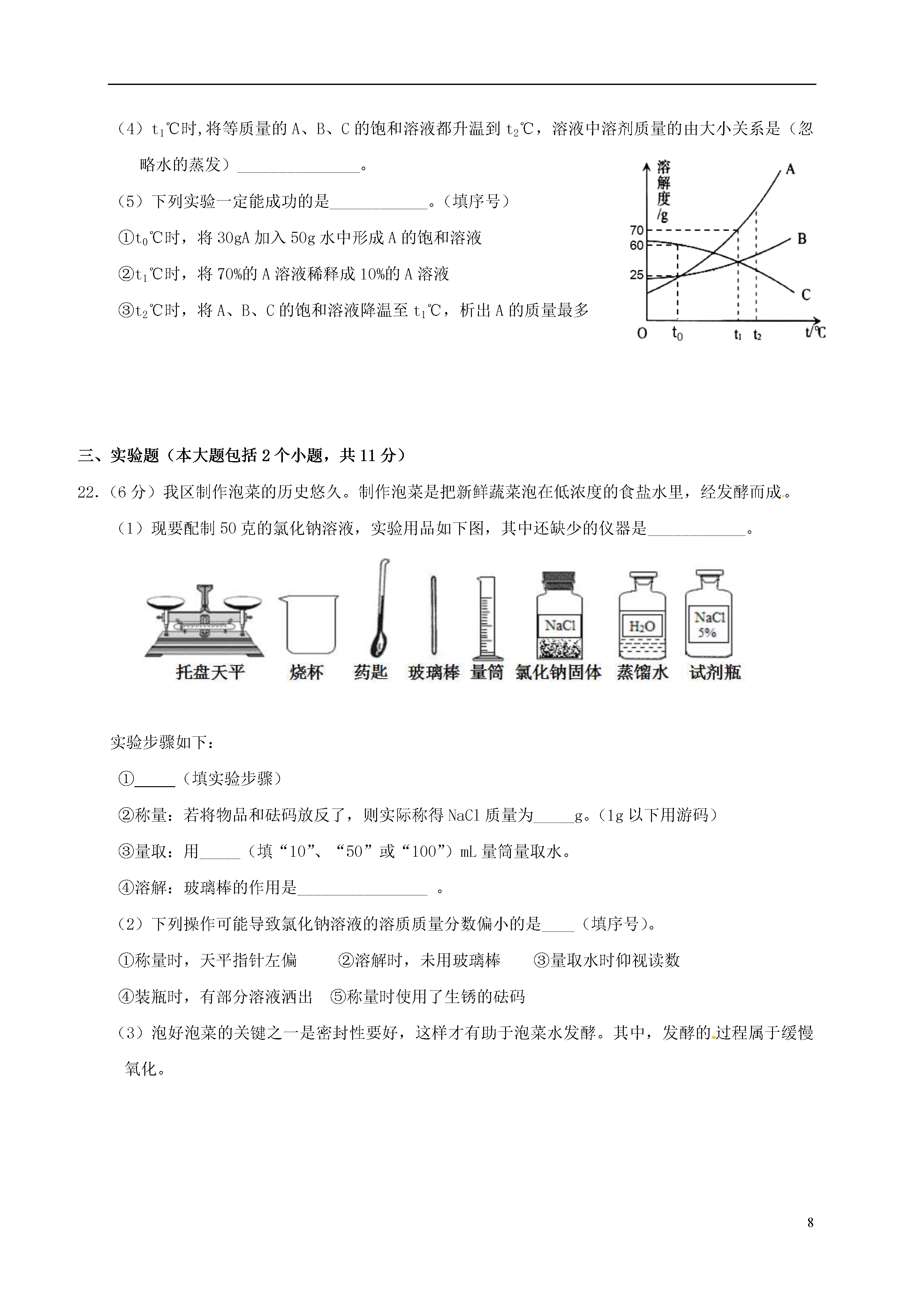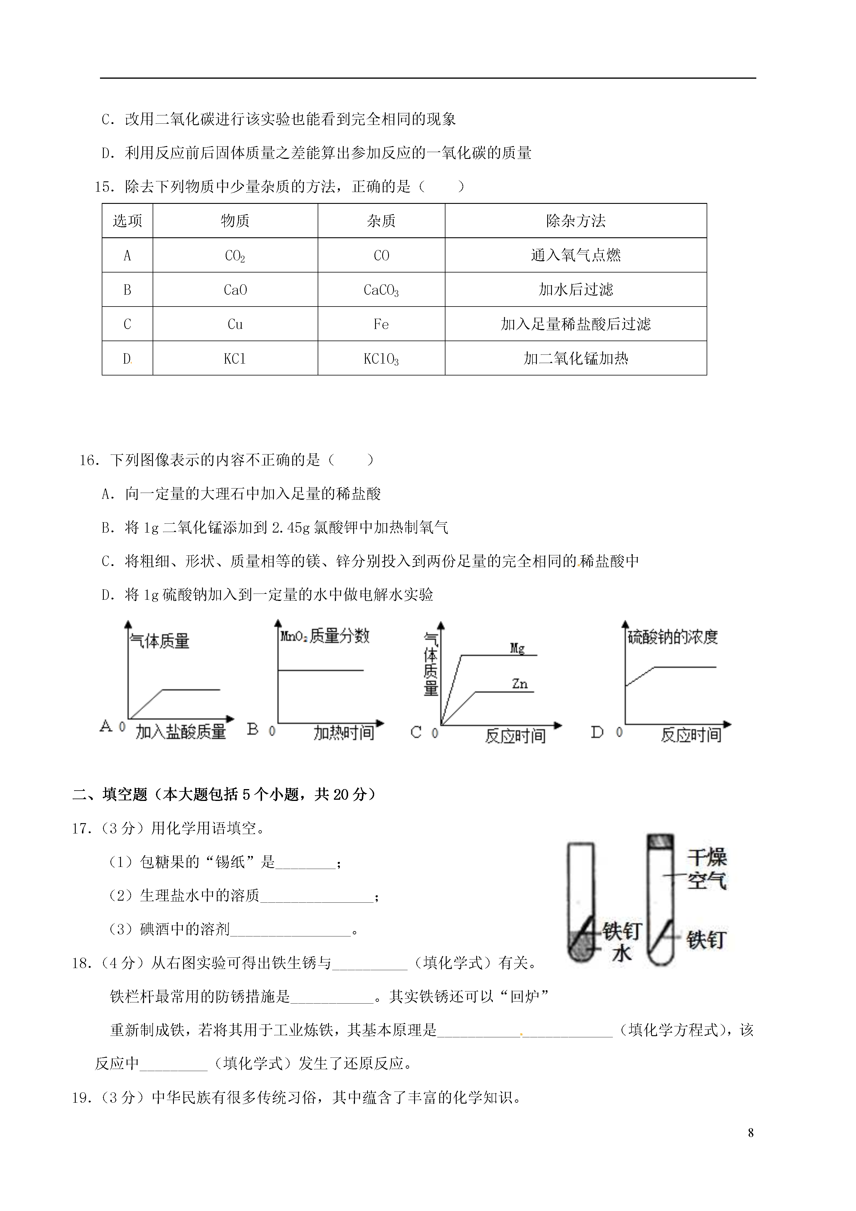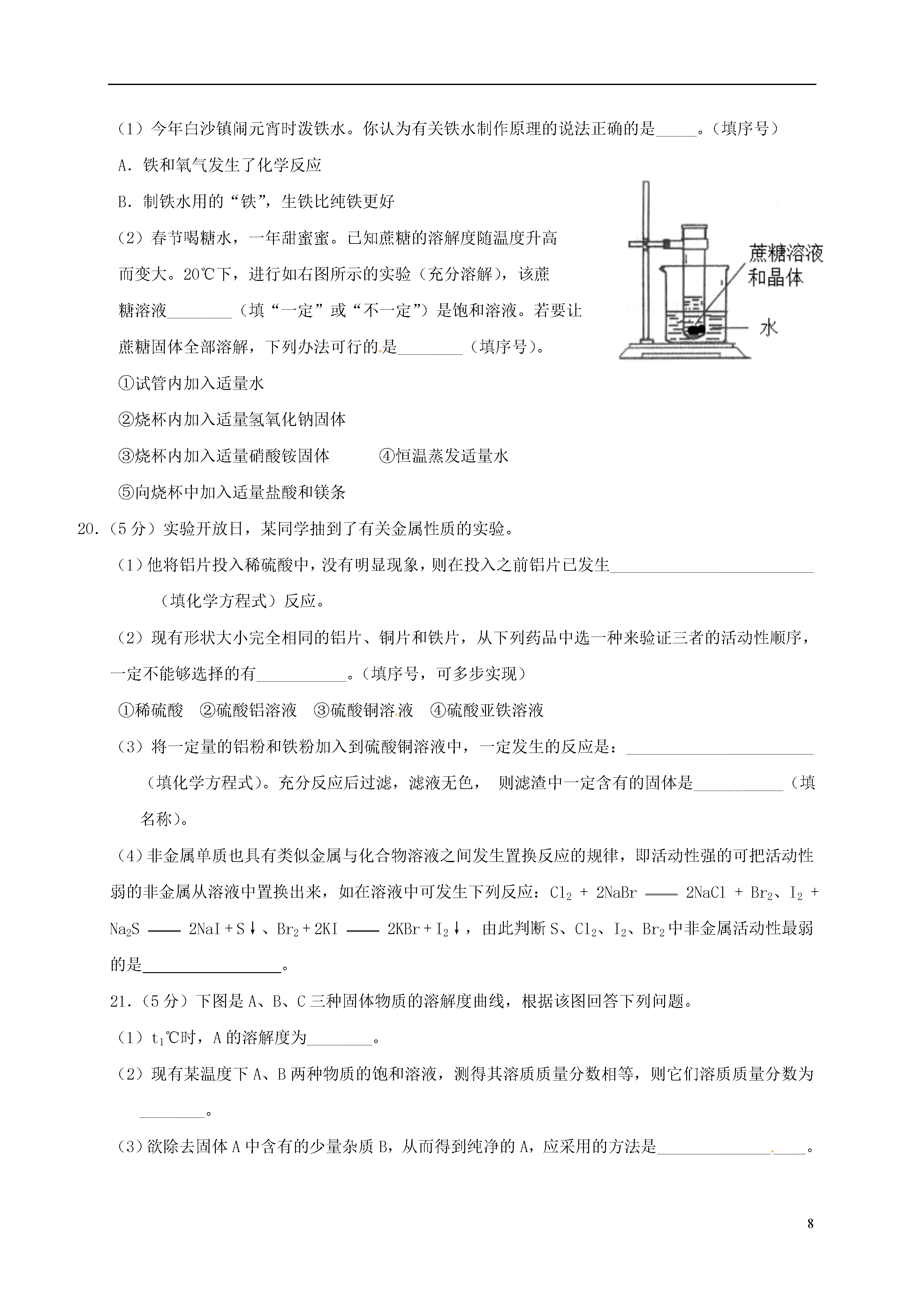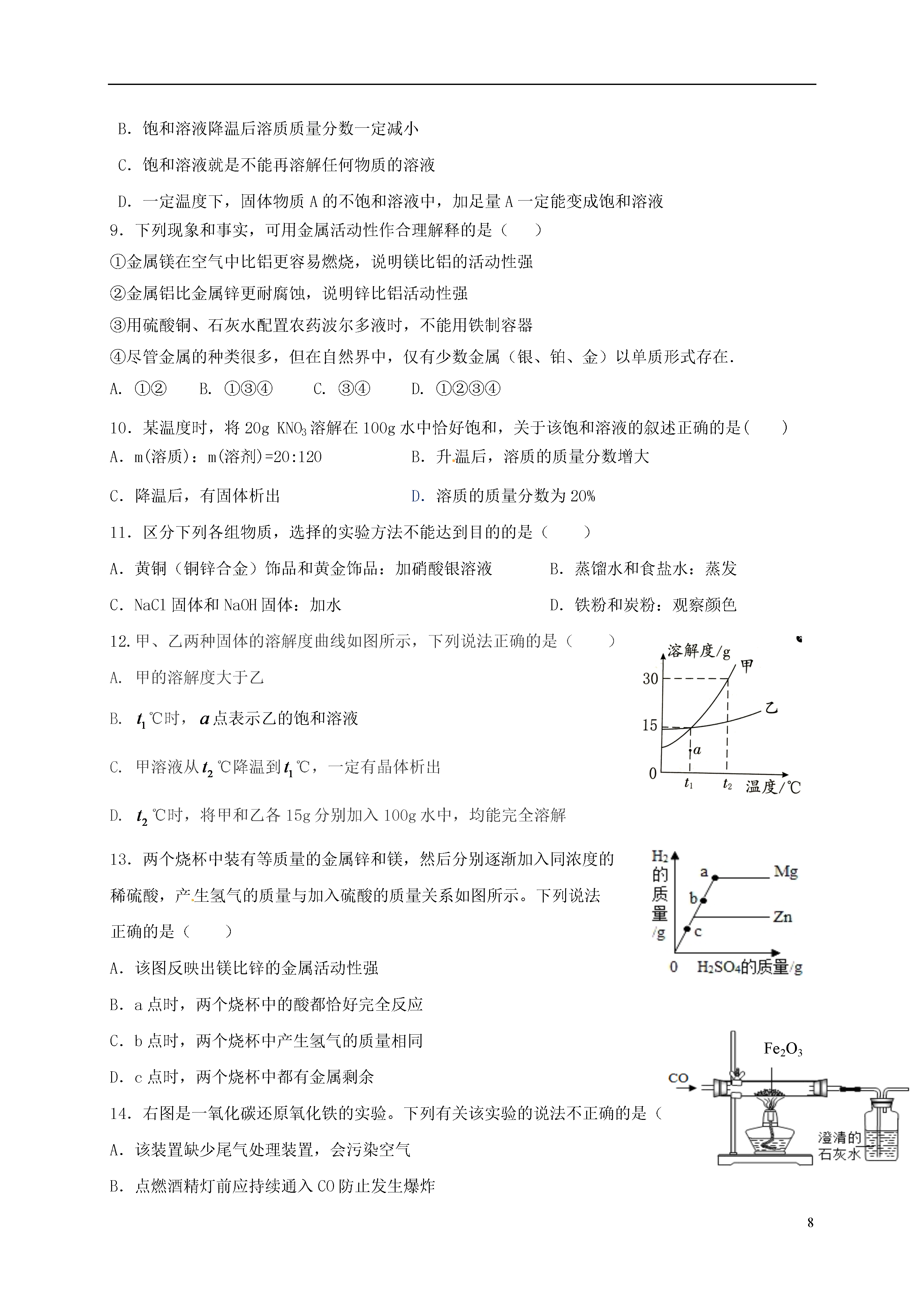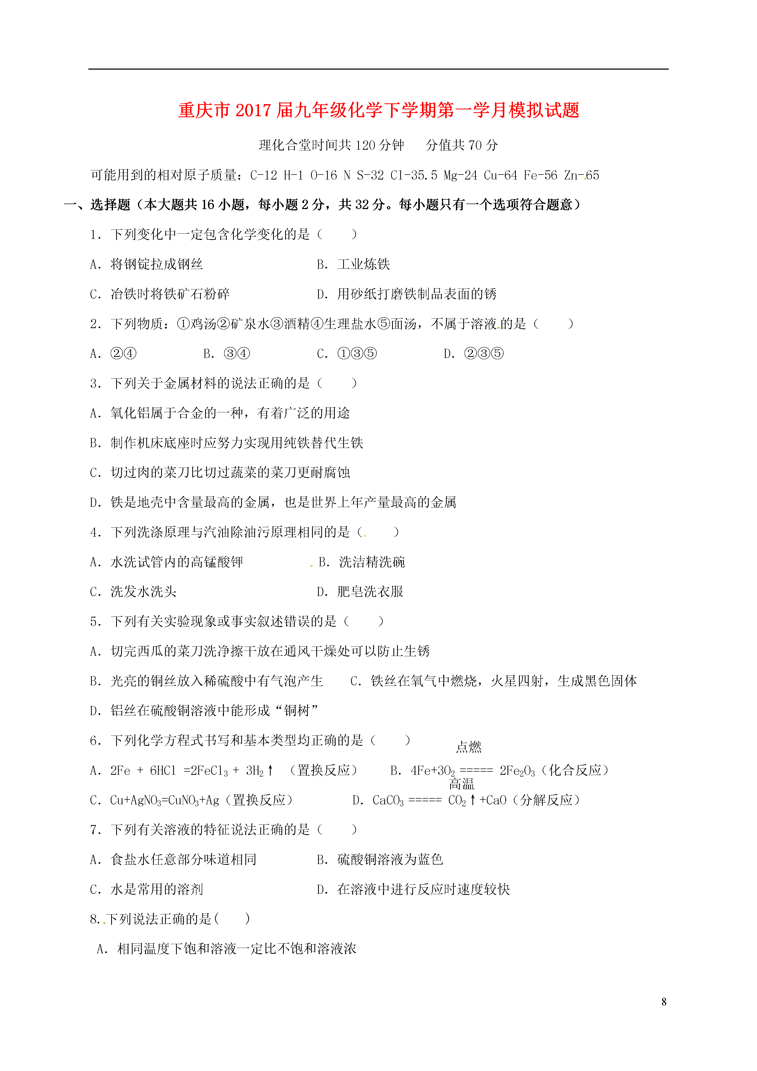 8重庆市2017届九年级化学下学期第一学月模拟试题理化合堂时间共120分钟分值共70分可能用到的相对原子质量:C-12H-1O-16NS-32Cl-35.5Mg-24Cu-64Fe-56Zn-65一、选择题(本大题共16小题,每小题2分,共32分。每小题只有一个选项符合题意)1.下列变化中一定包含化学变化的是()A.将钢锭拉成钢丝B.工业炼铁C.冶铁时将铁矿石粉碎D.用砂纸打磨铁制品表面的锈2.下列物质:①鸡汤②矿泉水③酒精④生理盐水⑤面汤,不属于溶液的是()A.②④B.③④C.①③⑤D.②③⑤3.下列关于金属材料的说法正确的是()A.氧化铝属于合金的一种,有着广泛的用途B.制作机床底座时应努力实现用纯铁替代生铁C.切过肉的菜刀比切过蔬菜的菜刀更耐腐蚀D.铁是地壳中含量最高的金属,也是世界上年产量最高的金属4.下列洗涤原理与汽油除油污原理相同的是()A.水洗试管内的高锰酸钾B.洗洁精洗碗C.洗发水洗头D.肥皂洗衣服5.下列有关实验现象或事实叙述错误的是()A.切完西瓜的菜刀洗净擦干放在通风干燥处可以防止生锈B.光亮的铜丝放入稀硫酸中有气泡产生C.铁丝在氧气中燃烧,火星四射,生成黑色固体D.铝丝在硫酸铜溶液中能形成“铜树”点燃6.下列化学方程式书写和基本类型均正确的是()高温A.2Fe+6HCl=2FeCl3+3H2↑(置换反应)B.4Fe+3O2=====2Fe2O3(化合反应)C.Cu+AgNO3=CuNO3+Ag(置换反应)D.CaCO3=====CO2↑+CaO(分解反应)7.下列有关溶液的特征说法正确的是()A.食盐水任意部分味道相同B.硫酸铜溶液为蓝色C.水是常用的溶剂D.在溶液中进行反应时速度较快8.下列说法正确的是()A.相同温度下饱和溶液一定比不饱和溶液浓B.饱和溶液降温后溶质质量分数一定减小C.饱和溶液就是不能再溶解任何物质的溶液D.一定温度下,固体物质A的不饱和溶液中,加足量A一定能变成饱和溶液9.下列现象和事实,可用金属活动性作合理解释的是()①金属镁在空气中比铝更容易燃烧,说明镁比铝的活动性强②金属铝比金属锌更耐腐蚀,说明锌比铝活动性强③用硫酸铜、石灰水配置农药波尔多液时,不能用铁制容器④尽管金属的种类很多,但在自然界中,仅有少数金属(银、铂、金)以单质形式存在.A.①②B.①③④C.③④D.①②③④10.某温度时,将20gKNO3溶解在100g水中恰好饱和,关于该饱和溶液的叙述正确的是()A.m(溶质):m(溶剂)=20:120B.升温后,溶质的质量分数增大C.降温后,有固体析出D.溶质的质量分数为20%11.区分下列各组物质,选择的实验方法不能达到目的的是()A.黄铜(铜锌合金)饰品和黄金饰品:加硝酸银溶液B.蒸馏水和食盐水:蒸发C.NaCl固体和NaOH固体:加水D.铁粉和炭粉:观察颜色12.甲、乙两种固体的溶解度曲线如图所示,下列说法正确的是()A.甲的溶解度大于乙B.℃时,点表示乙的饱和溶液C.甲溶液从℃降温到℃,一定有晶体析出D.℃时,将甲和乙各15g分别加入100g水中,均能完全溶解13.两个烧杯中装有等质量的金属锌和镁,然后分别逐渐加入同浓度的稀硫酸,产生氢气的质量与加入硫酸的质量关系如图所示。下列说法正确的是()A.该图反映出镁比锌的金属活动性强B.a点时,两个烧杯中的酸都恰好完全反应Fe2O3C.b点时,两个烧杯中产生氢气的质量相同D.c点时,两个烧杯中都有金属剩余14.右图是一氧化碳还原氧化铁的实验。下列有关该实验的说法不正确的是()A.该装置缺少尾气处理装置,会污染空气B.点燃酒精灯前应持续通入CO防止发生爆炸C.改用二氧化碳进行该实验也能看到完全相同的现象D.利用反应前后固体质量之差能算出参加反应的一氧化碳的质量15.除去下列物质中少量杂质的方法,正确的是()选项物质杂质除杂方法ACO2CO通入氧气点燃BCaOCaCO3加水后过滤CCuFe加入足量稀盐酸后过滤DKClKClO3加二氧化锰加热16.下列图像表示的内容不正确的是()A.向一定量的大理石中加入足量的稀盐酸B.将1g二氧化锰添加到2.45g氯酸钾中加热制氧气C.将粗细、形状、质量相等的镁、锌分别投入到两份足量的完全相同的稀盐酸中D.将1g硫酸钠加入到一定量的水中做电解水实验二、填空题(本大题包括5个小题,共20分)17.(3分)用化学用语填空。(1)包糖果的“锡纸”是________;(2)生理盐水中的溶质_______________;(3)碘酒中的溶剂________________。18.(4分)从右图实验可得出铁生锈与__________(填
