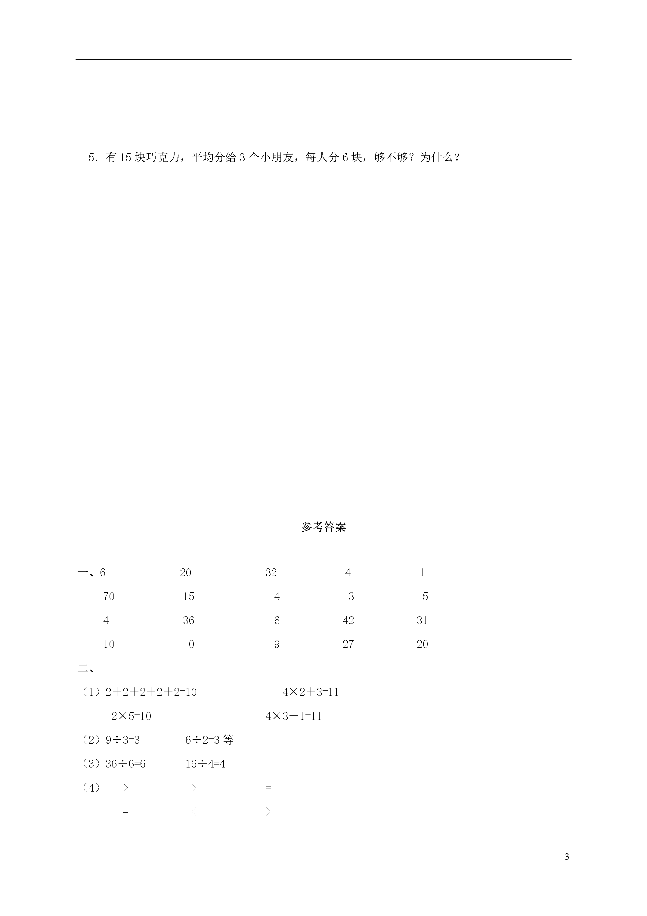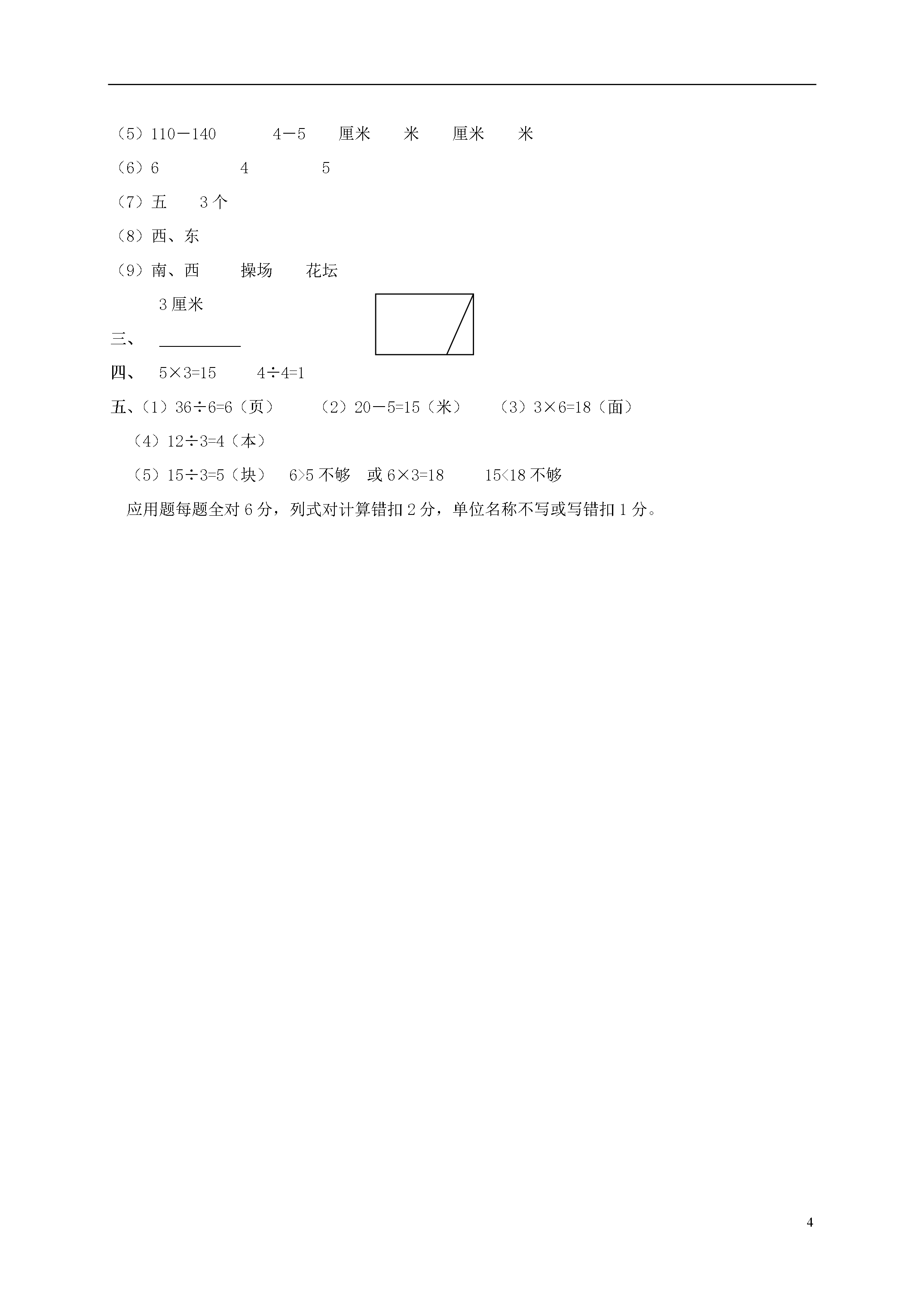 4江苏省南通市海安县南莫小学二年级数学上册期中试卷及答案班级_______姓名_______分数_______一、口算(每题1分,共20分)30÷5=4×5=12+20=4÷1=6÷6=30+40=5×3=8÷2=3×1=20÷4=24÷6=6×6=18÷3=46-4=6+25=3×4-2=25÷5-5=5×2-1=4×6+3=4×4+4=二、填空:(第1、2、3题每个算式2分,其余每空1分,共39分)1.看图写算式:△△△△△△△△△△☆☆☆☆☆☆☆☆☆☆☆加法算式:()×+=.乘法算式:()×+=.2.写出商是3的算式:÷=3÷=33.写出除数和商相等的除法算式:÷=÷=.4.在○里填上>、<或=30÷544065-26100厘米1米12÷43÷15÷558米58厘米5.在□里填上合适的数,在()里填上“米”或“厘米”。我的身高大约厘米公共汽车大约米一支粉笔长约9()一棵大树高约10()手掌宽大约7()跳绳长大约是3()6.()里最大能填几?3×()<2030>6×()5×()<267.左图是一个()边形,把它分成三角形,最少能分成()个。8.地图是按照上北、下南、左()、右()的方向绘制的。9.教学楼在实验楼的()面,在办公楼的()面。实验楼的东面是(),操场在()的西面。三、操作题(6分)1.画一条比5厘米短2厘米的线段。2.在长方形纸上剪下一个三角形,剩下的是一个四边形,怎样剪?四、列式计算(5分)(1)5个3相加是多少?(2)被除数和除数都是4,商是几?五、应用题(30分)1.一本故事书有36页,小芳6天看完,平均每天看多少页?2.把20米长的绳子放到井底,还有5米留在井口外,这口井有多深?3.三个人做小旗,每人做6面,一共做多少面?4.有12本故事书,借给小红、小敏和小杰,每人借到的本数同样多,每个可借到多少本?5.有15块巧克力,平均分给3个小朋友,每人分6块,够不够?为什么?参考答案一、620324170154354366423110092720二、(1)2+2+2+2+2=104×2+3=112×5=104×3-1=11(2)9÷3=36÷2=3等(3)36÷6=616÷4=4(4)>>==<>(5)110-1404-5厘米米厘米米(6)645(7)五3个(8)西、东(9)南、西操场花坛3厘米三、四、5×3=154÷4=1五、(1)36÷6=6(页)(2)20-5=15(米)(3)3×6=18(面)(4)12÷3=4(本)(5)15÷3=5(块)6>5不够或6×3=1815<18不够应用题每题全对6分,列式对计算错扣2分,单位名称不写或写错扣1分。