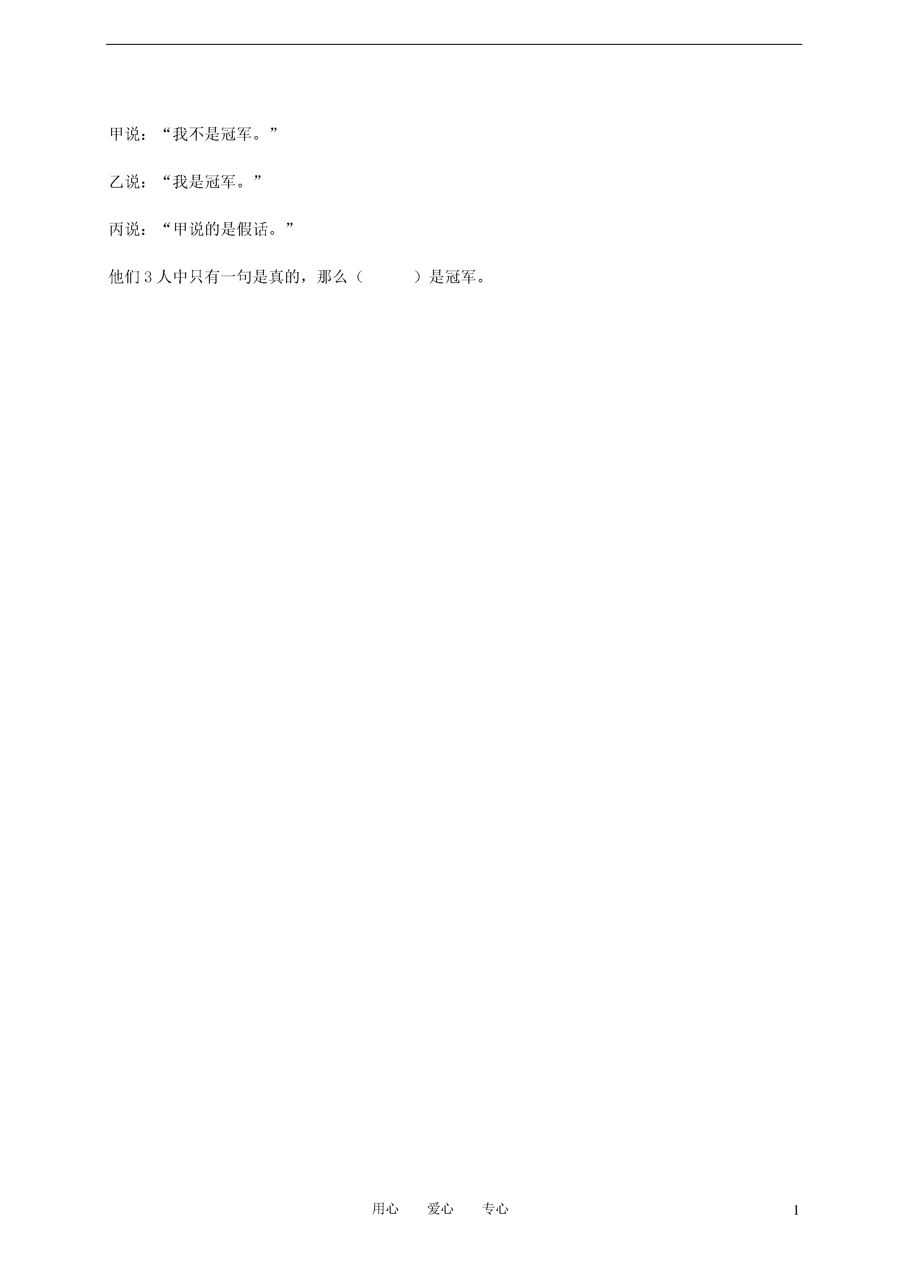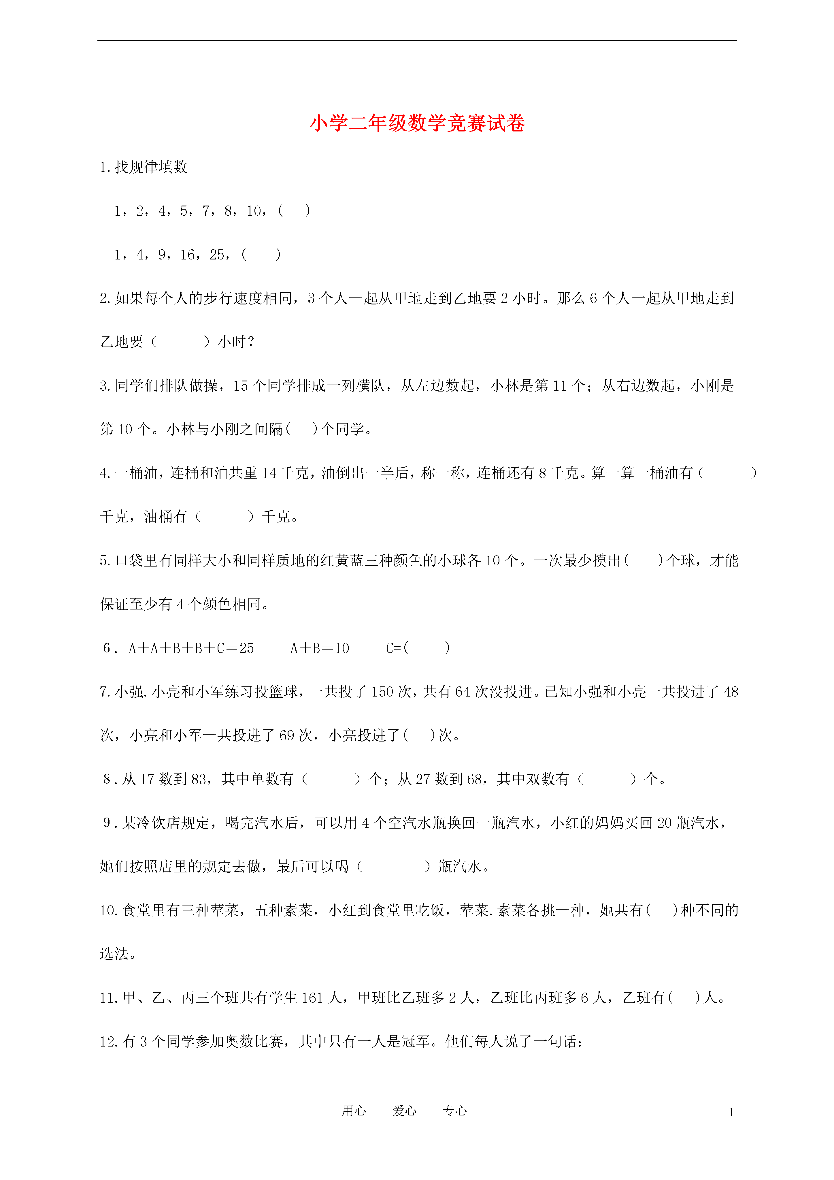 1用心爱心专心小学二年级数学竞赛试卷1.找规律填数1,2,4,5,7,8,10,()1,4,9,16,25,()2.如果每个人的步行速度相同,3个人一起从甲地走到乙地要2小时。那么6个人一起从甲地走到乙地要()小时?3.同学们排队做操,15个同学排成一列横队,从左边数起,小林是第11个;从右边数起,小刚是第10个。小林与小刚之间隔()个同学。4.一桶油,连桶和油共重14千克,油倒出一半后,称一称,连桶还有8千克。算一算一桶油有()千克,油桶有()千克。5.口袋里有同样大小和同样质地的红黄蓝三种颜色的小球各10个。一次最少摸出()个球,才能保证至少有4个颜色相同。6.A+A+B+B+C=25A+B=10C=()7.小强.小亮和小军练习投篮球,一共投了150次,共有64次没投进。已知小强和小亮一共投进了48次,小亮和小军一共投进了69次,小亮投进了()次。8.从17数到83,其中单数有()个;从27数到68,其中双数有()个。9.某冷饮店规定,喝完汽水后,可以用4个空汽水瓶换回一瓶汽水,小红的妈妈买回20瓶汽水,她们按照店里的规定去做,最后可以喝()瓶汽水。10.食堂里有三种荤菜,五种素菜,小红到食堂里吃饭,荤菜.素菜各挑一种,她共有()种不同的选法。11.甲、乙、丙三个班共有学生161人,甲班比乙班多2人,乙班比丙班多6人,乙班有()人。12.有3个同学参加奥数比赛,其中只有一人是冠军。他们每人说了一句话:甲说:“我不是冠军。”乙说:“我是冠军。”丙说:“甲说的是假话。”他们3人中只有一句是真的,那么()是冠军。