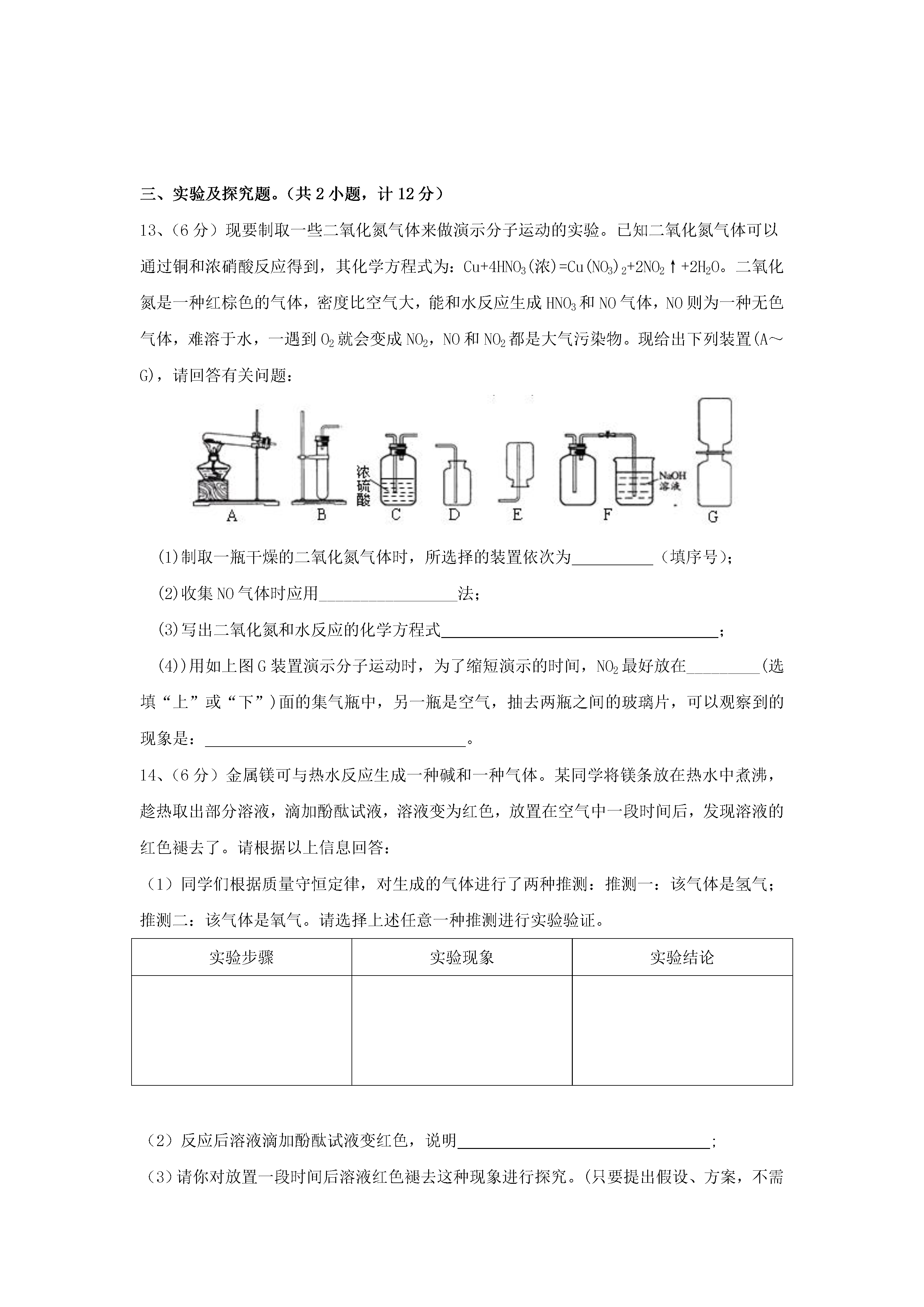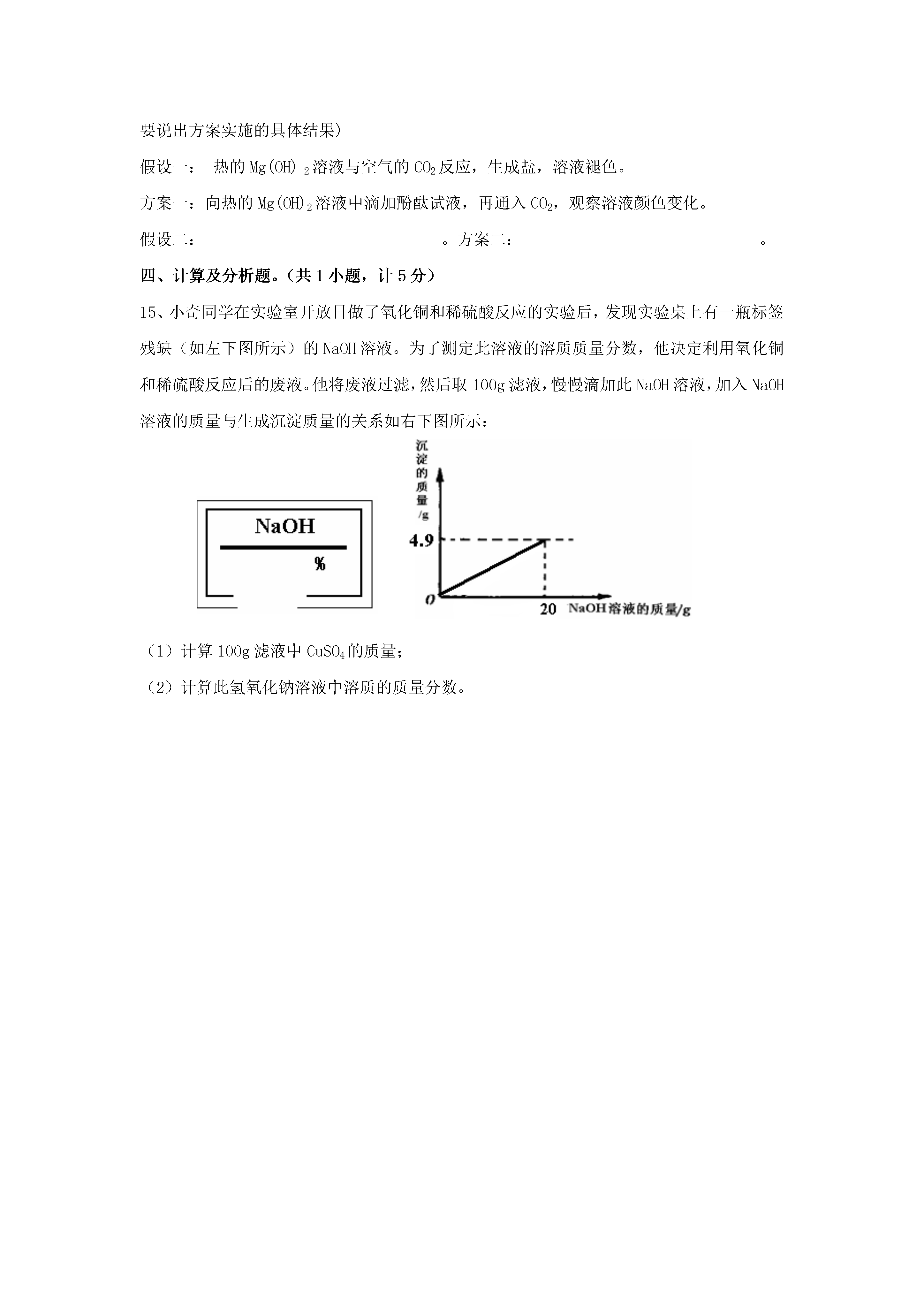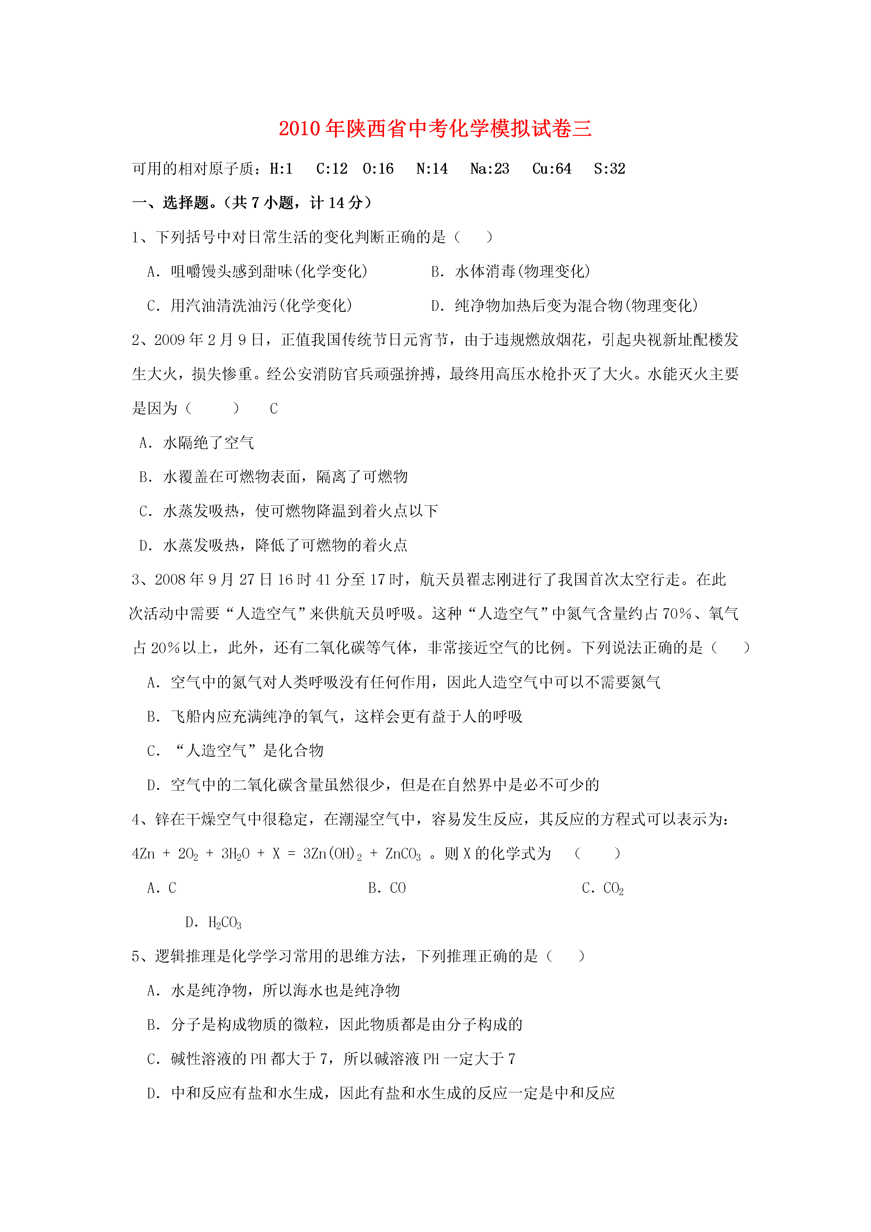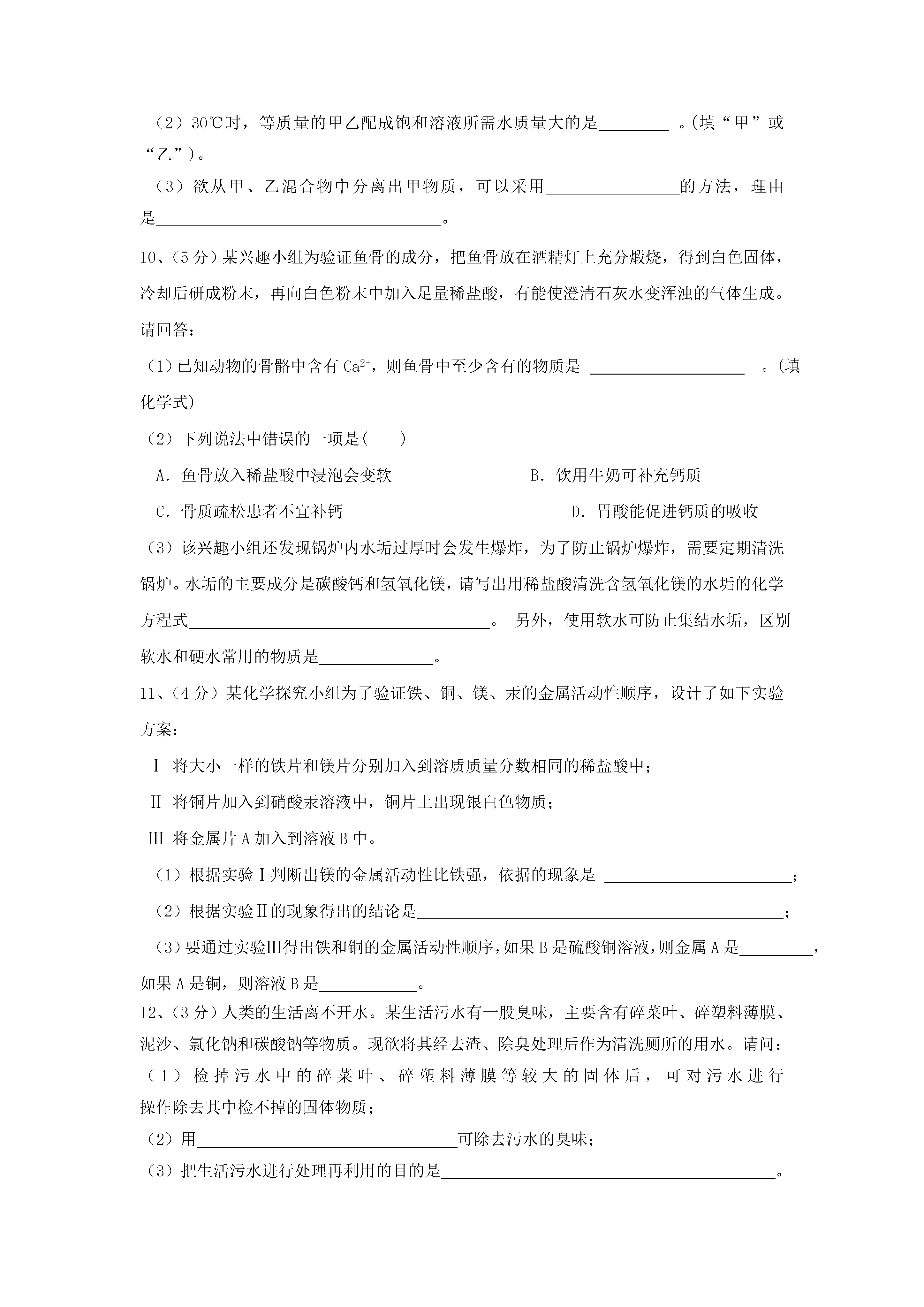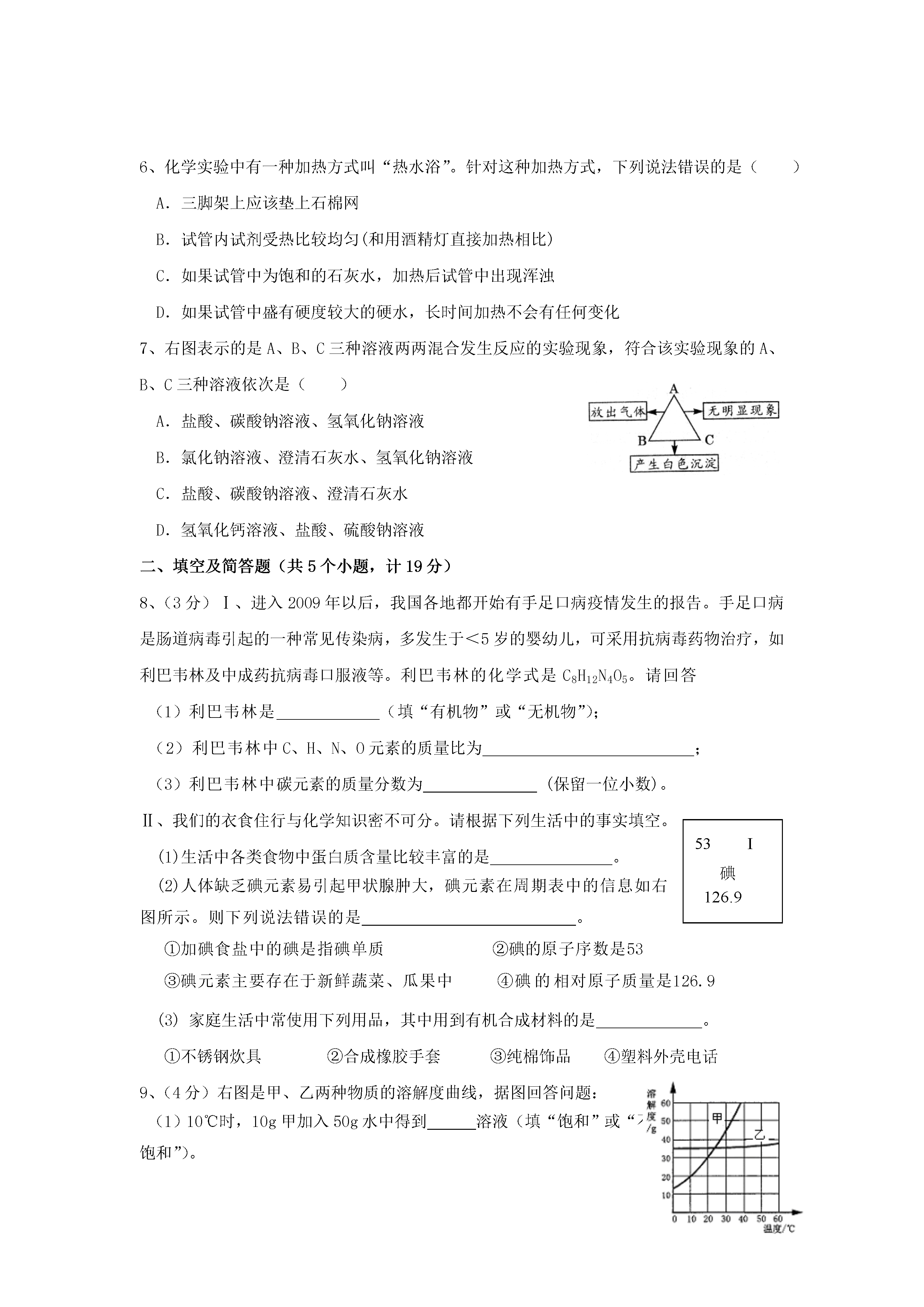 2010年陕西省中考化学模拟试卷三可用的相对原子质:H:1C:12O:16N:14Na:23Cu:64S:32一、选择题。(共7小题,计14分)1、下列括号中对日常生活的变化判断正确的是()A.咀嚼馒头感到甜味(化学变化)B.水体消毒(物理变化)C.用汽油清洗油污(化学变化)D.纯净物加热后变为混合物(物理变化)2、2009年2月9日,正值我国传统节日元宵节,由于违规燃放烟花,引起央视新址配楼发生大火,损失惨重。经公安消防官兵顽强拚搏,最终用高压水枪扑灭了大火。水能灭火主要是因为()CA.水隔绝了空气B.水覆盖在可燃物表面,隔离了可燃物C.水蒸发吸热,使可燃物降温到着火点以下D.水蒸发吸热,降低了可燃物的着火点3、2008年9月27日16时41分至17时,航天员翟志刚进行了我国首次太空行走。在此次活动中需要“人造空气”来供航天员呼吸。这种“人造空气”中氮气含量约占70%、氧气占20%以上,此外,还有二氧化碳等气体,非常接近空气的比例。下列说法正确的是()A.空气中的氮气对人类呼吸没有任何作用,因此人造空气中可以不需要氮气B.飞船内应充满纯净的氧气,这样会更有益于人的呼吸C.“人造空气”是化合物D.空气中的二氧化碳含量虽然很少,但是在自然界中是必不可少的4、锌在干燥空气中很稳定,在潮湿空气中,容易发生反应,其反应的方程式可以表示为:4Zn+2O2+3H2O+X=3Zn(OH)2+ZnCO3。则X的化学式为()A.CB.COC.CO2D.H2CO35、逻辑推理是化学学习常用的思维方法,下列推理正确的是()A.水是纯净物,所以海水也是纯净物B.分子是构成物质的微粒,因此物质都是由分子构成的C.碱性溶液的PH都大于7,所以碱溶液PH一定大于7D.中和反应有盐和水生成,因此有盐和水生成的反应一定是中和反应6、化学实验中有一种加热方式叫“热水浴”。针对这种加热方式,下列说法错误的是()A.三脚架上应该垫上石棉网B.试管内试剂受热比较均匀(和用酒精灯直接加热相比)C.如果试管中为饱和的石灰水,加热后试管中出现浑浊D.如果试管中盛有硬度较大的硬水,长时间加热不会有任何变化7、右图表示的是A、B、C三种溶液两两混合发生反应的实验现象,符合该实验现象的A、B、C三种溶液依次是()A.盐酸、碳酸钠溶液、氢氧化钠溶液B.氯化钠溶液、澄清石灰水、氢氧化钠溶液C.盐酸、碳酸钠溶液、澄清石灰水D.氢氧化钙溶液、盐酸、硫酸钠溶液二、填空及简答题(共5个小题,计19分)8、(3分)Ⅰ、进入2009年以后,我国各地都开始有手足口病疫情发生的报告。手足口病是肠道病毒引起的一种常见传染病,多发生于<5岁的婴幼儿,可采用抗病毒药物治疗,如利巴韦林及中成药抗病毒口服液等。利巴韦林的化学式是C8H12N4O5。请回答(1)利巴韦林是(填“有机物”或“无机物”);(2)利巴韦林中C、H、N、O元素的质量比为;(3)利巴韦林中碳元素的质量分数为(保留一位小数)。53I碘126.9Ⅱ、我们的衣食住行与化学知识密不可分。请根据下列生活中的事实填空。(1)生活中各类食物中蛋白质含量比较丰富的是。(2)人体缺乏碘元素易引起甲状腺肿大,碘元素在周期表中的信息如右图所示。则下列说法错误的是。①加碘食盐中的碘是指碘单质②碘的原子序数是53③碘元素主要存在于新鲜蔬菜、瓜果中④碘的相对原子质量是126.9(3)家庭生活中常使用下列用品,其中用到有机合成材料的是。①不锈钢炊具②合成橡胶手套③纯棉饰品④塑料外壳电话9、(4分)右图是甲、乙两种物质的溶解度曲线,据图回答问题:(1)10℃时,10g甲加入50g水中得到溶液(填“饱和”或“不饱和”)。(2)30℃时,等质量的甲乙配成饱和溶液所需水质量大的是。(填“甲”或“乙”)。(3)欲从甲、乙混合物中分离出甲物质,可以采用的方法,理由是。10、(5分)某兴趣小组为验证鱼骨的成分,把鱼骨放在酒精灯上充分煅烧,得到白色固体,冷却后研成粉末,再向白色粉末中加入足量稀盐酸,有能使澄清石灰水变浑浊的气体生成。请回答:(1)已知动物的骨骼中含有Ca2+,则鱼骨中至少含有的物质是。(填化学式)(2)下列说法中错误的一项是()A.鱼骨放入稀盐酸中浸泡会变软B.饮用牛奶可补充钙质C.骨质疏松患者不宜补钙D.胃酸能促进钙质的吸收(3)该兴趣小组还发现锅炉内水垢过厚时会发生爆炸,为了防止锅炉爆炸,需要定期清洗锅炉。水垢的主要成分是碳酸钙和氢氧化镁,请写出用稀盐酸清洗含氢氧化镁的水垢的化学方程式。另外,使用软水可防止集结水垢,区别软水和硬水常用