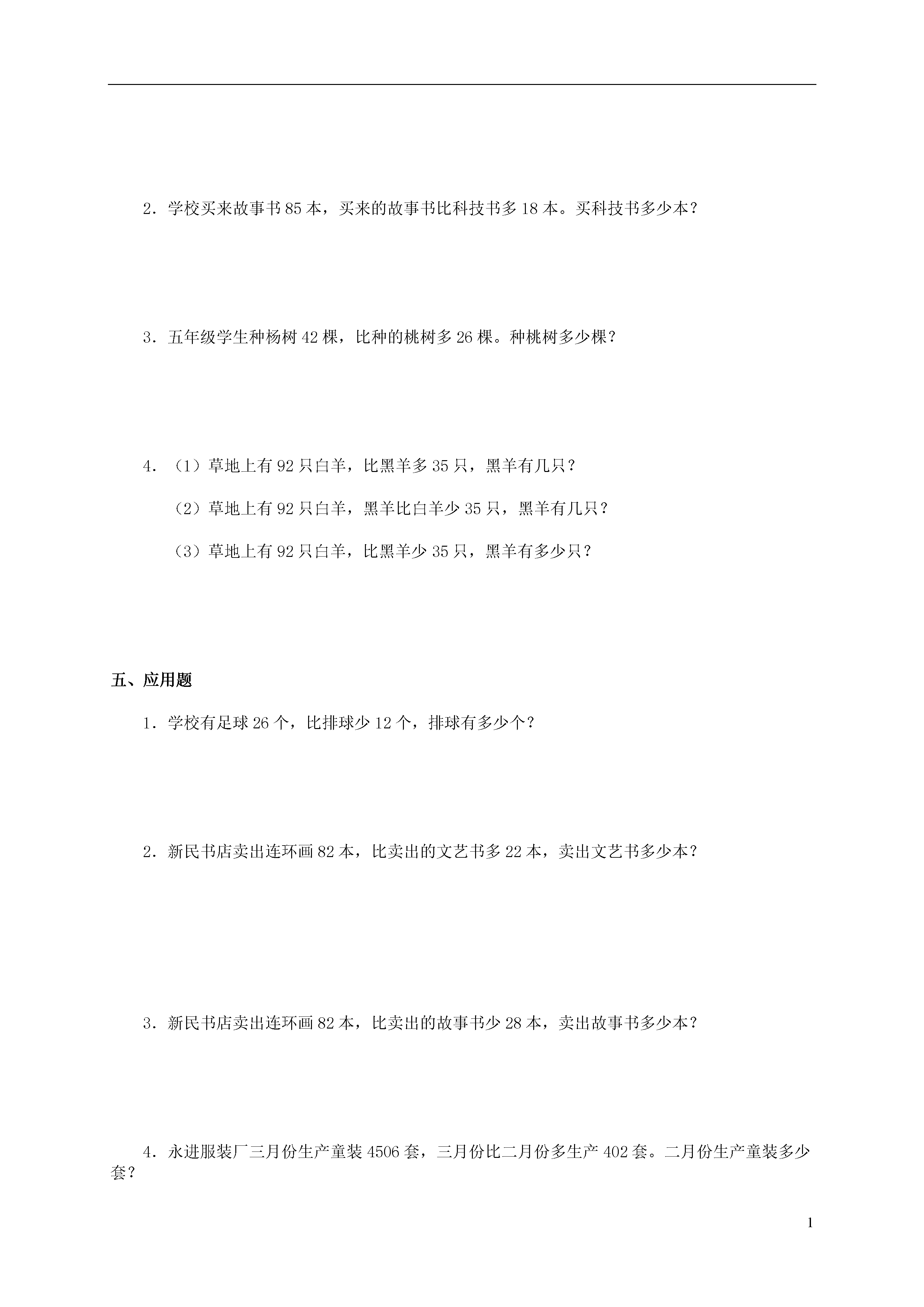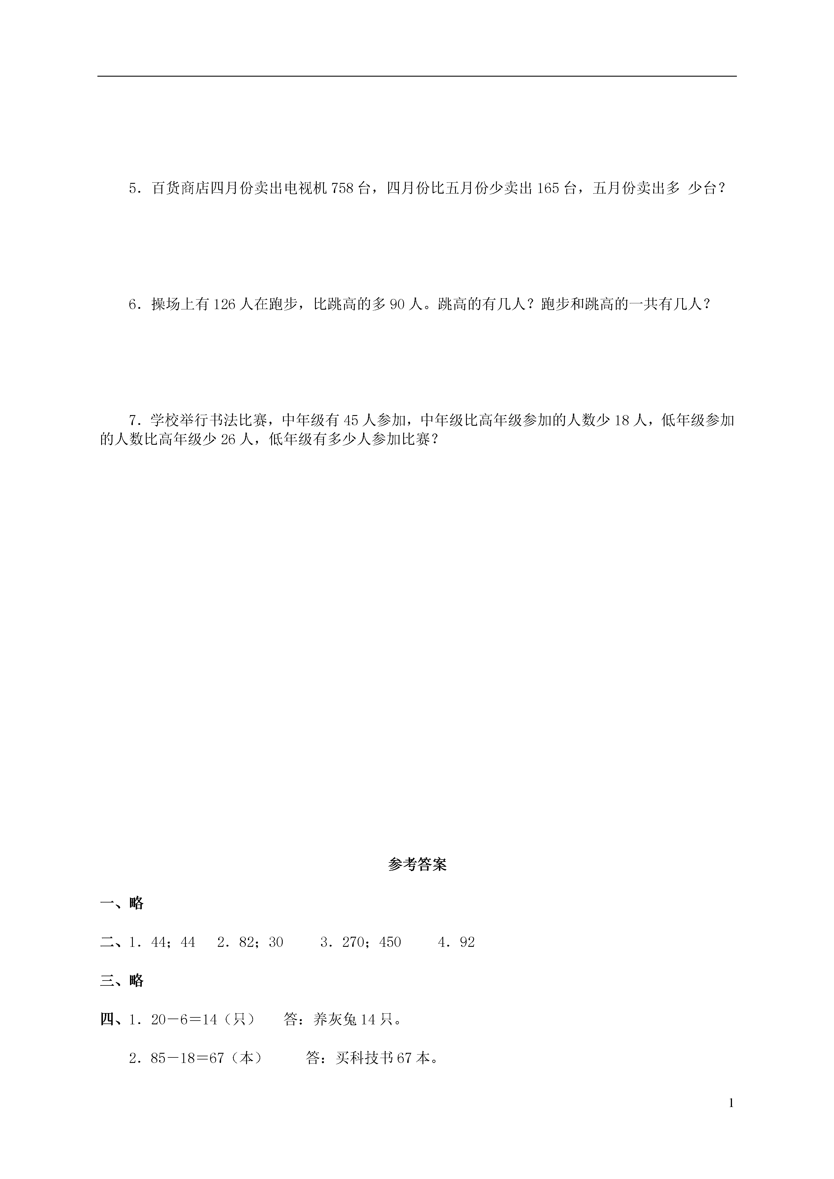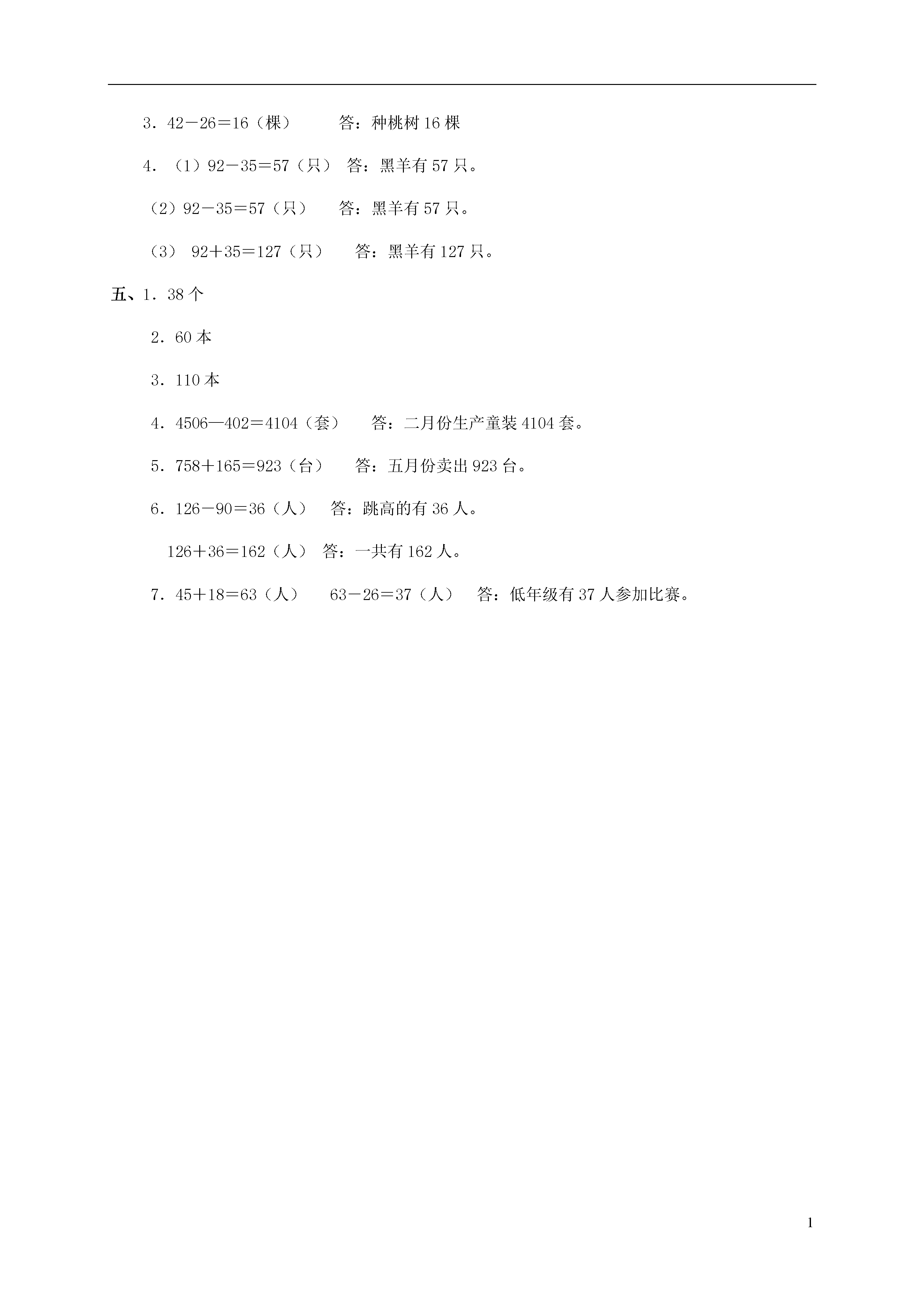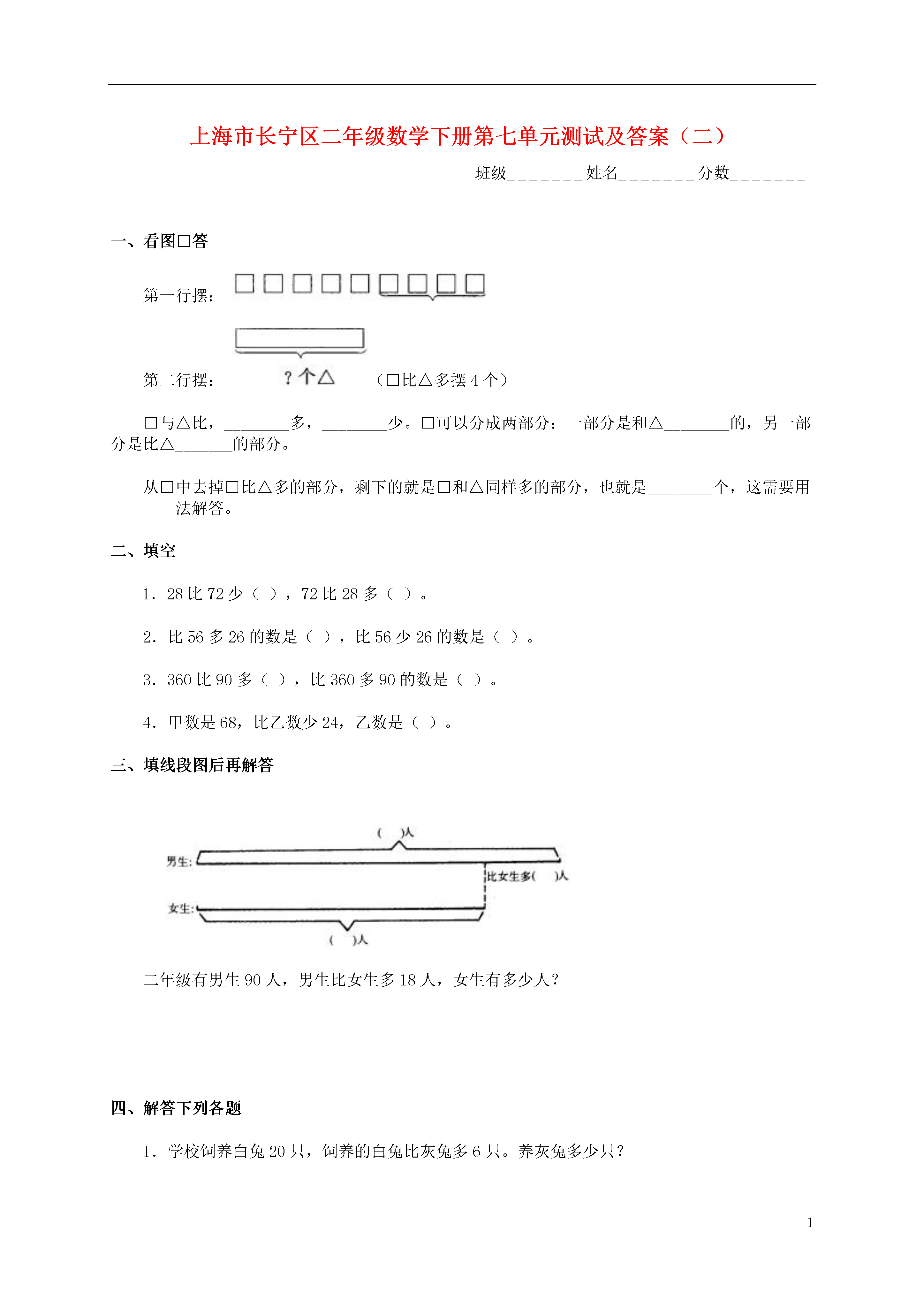 1上海市长宁区二年级数学下册第七单元测试及答案(二)班级_______姓名_______分数_______一、看图□答第一行摆:第二行摆:(□比△多摆4个)□与△比,________多,________少。□可以分成两部分:一部分是和△________的,另一部分是比△_______的部分。从□中去掉□比△多的部分,剩下的就是□和△同样多的部分,也就是________个,这需要用________法解答。二、填空1.28比72少(),72比28多()。2.比56多26的数是(),比56少26的数是()。3.360比90多(),比360多90的数是()。4.甲数是68,比乙数少24,乙数是()。三、填线段图后再解答二年级有男生90人,男生比女生多18人,女生有多少人?四、解答下列各题1.学校饲养白兔20只,饲养的白兔比灰兔多6只。养灰兔多少只?2.学校买来故事书85本,买来的故事书比科技书多18本。买科技书多少本?3.五年级学生种杨树42棵,比种的桃树多26棵。种桃树多少棵?4.(1)草地上有92只白羊,比黑羊多35只,黑羊有几只?(2)草地上有92只白羊,黑羊比白羊少35只,黑羊有几只?(3)草地上有92只白羊,比黑羊少35只,黑羊有多少只?五、应用题1.学校有足球26个,比排球少12个,排球有多少个?2.新民书店卖出连环画82本,比卖出的文艺书多22本,卖出文艺书多少本?3.新民书店卖出连环画82本,比卖出的故事书少28本,卖出故事书多少本?4.永进服装厂三月份生产童装4506套,三月份比二月份多生产402套。二月份生产童装多少套?5.百货商店四月份卖出电视机758台,四月份比五月份少卖出165台,五月份卖出多少台?6.操场上有126人在跑步,比跳高的多90人。跳高的有几人?跑步和跳高的一共有几人?7.学校举行书法比赛,中年级有45人参加,中年级比高年级参加的人数少18人,低年级参加的人数比高年级少26人,低年级有多少人参加比赛?参考答案一、略二、1.44;442.82;303.270;4504.92三、略四、1.20-6=14(只)答:养灰兔14只。2.85-18=67(本)答:买科技书67本。3.42-26=16(棵)答:种桃树16棵4.(1)92-35=57(只)答:黑羊有57只。(2)92-35=57(只)答:黑羊有57只。(3)92+35=127(只)答:黑羊有127只。五、1.38个2.60本3.110本4.4506—402=4104(套)答:二月份生产童装4104套。5.758+165=923(台)答:五月份卖出923台。6.126-90=36(人)答:跳高的有36人。126+36=162(人)答:一共有162人。7.45+18=63(人)63-26=37(人)答:低年级有37人参加比赛。