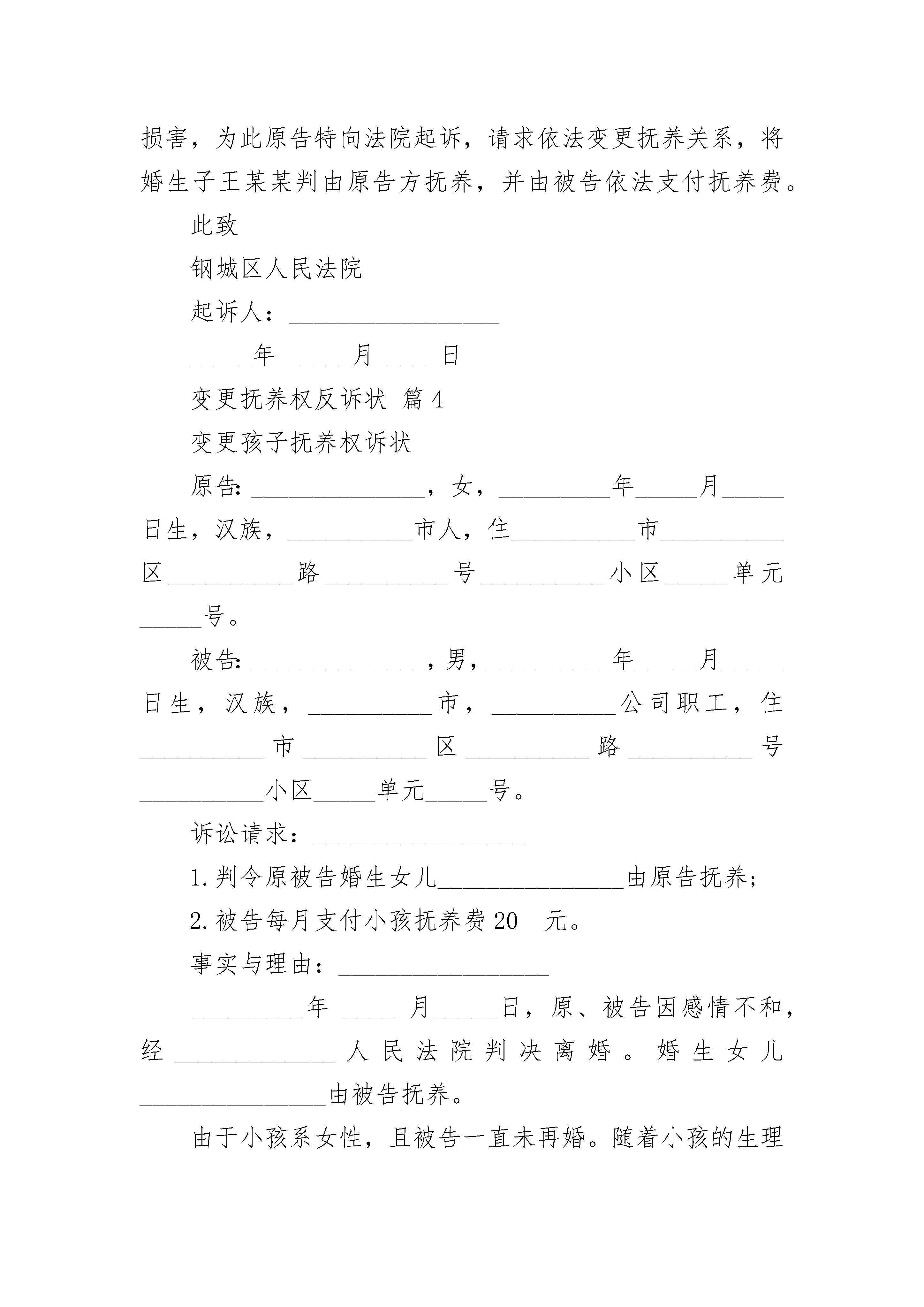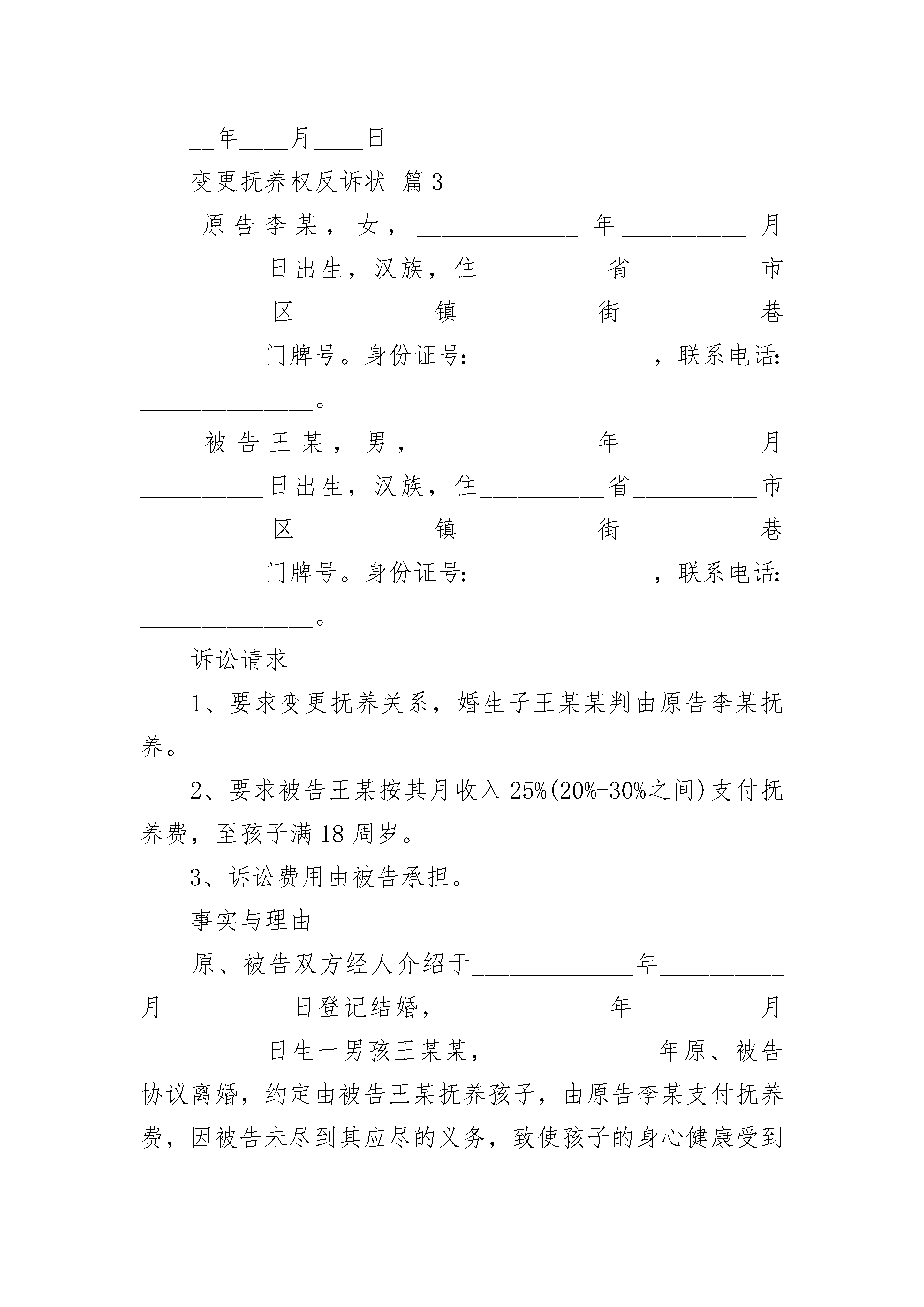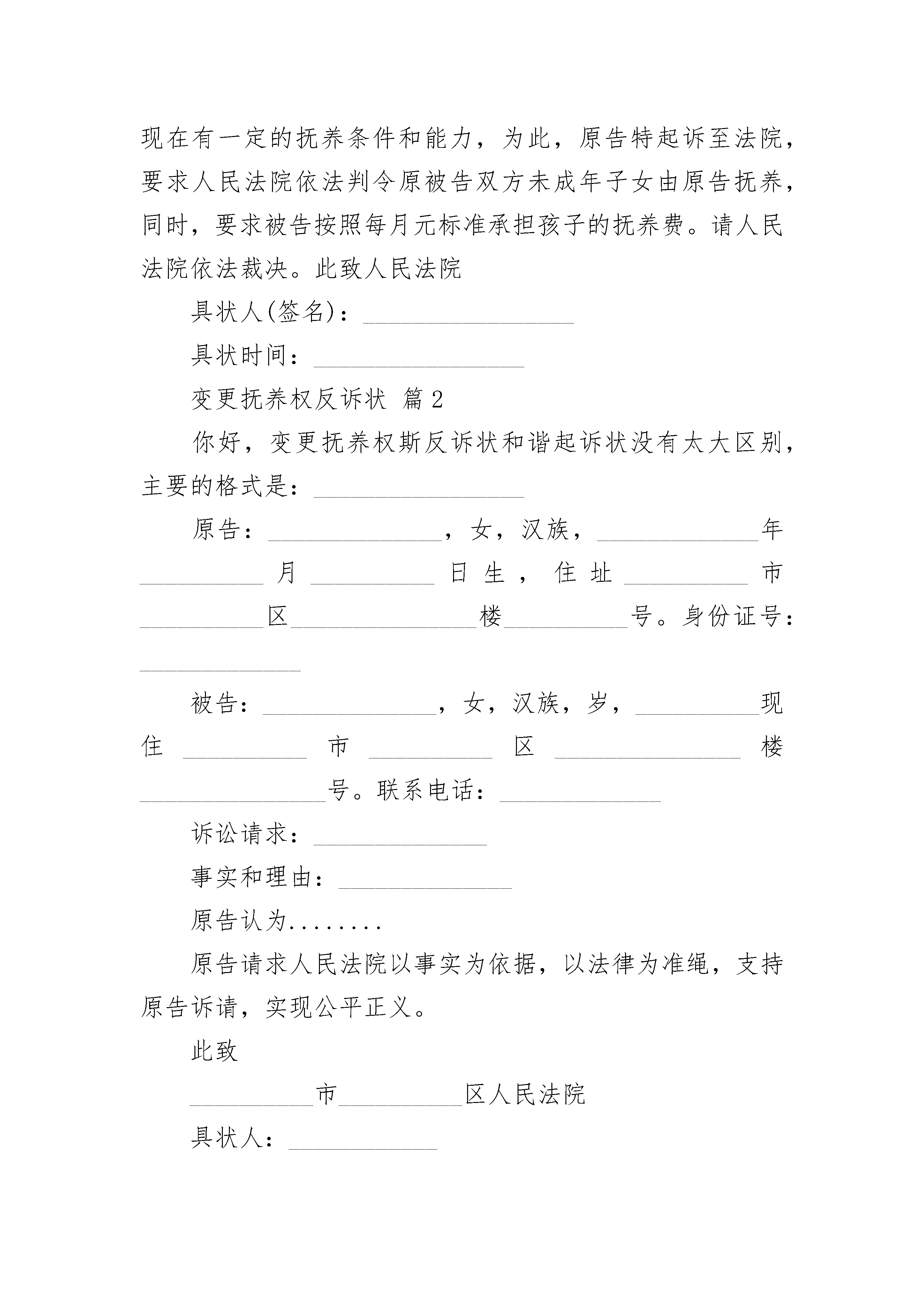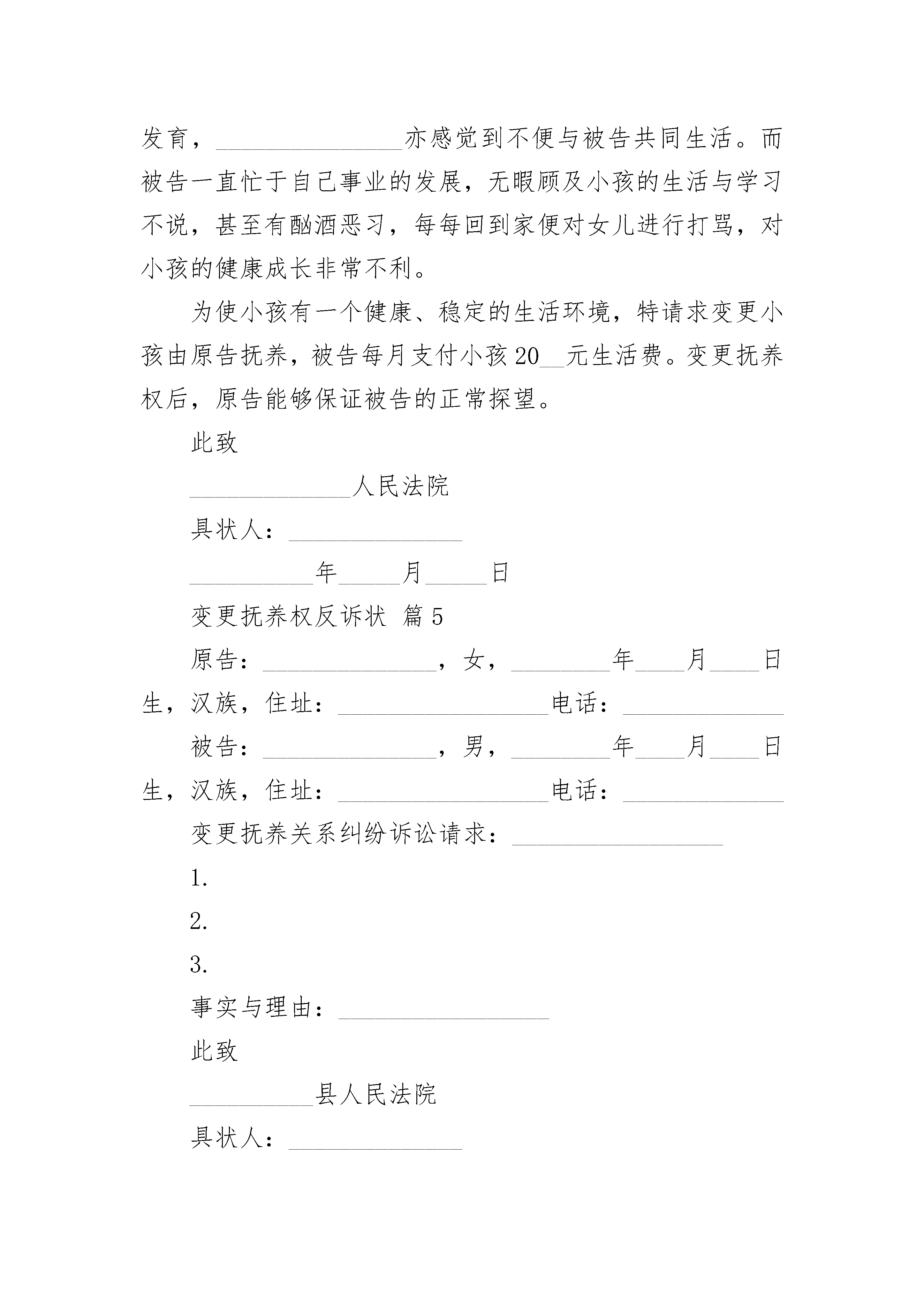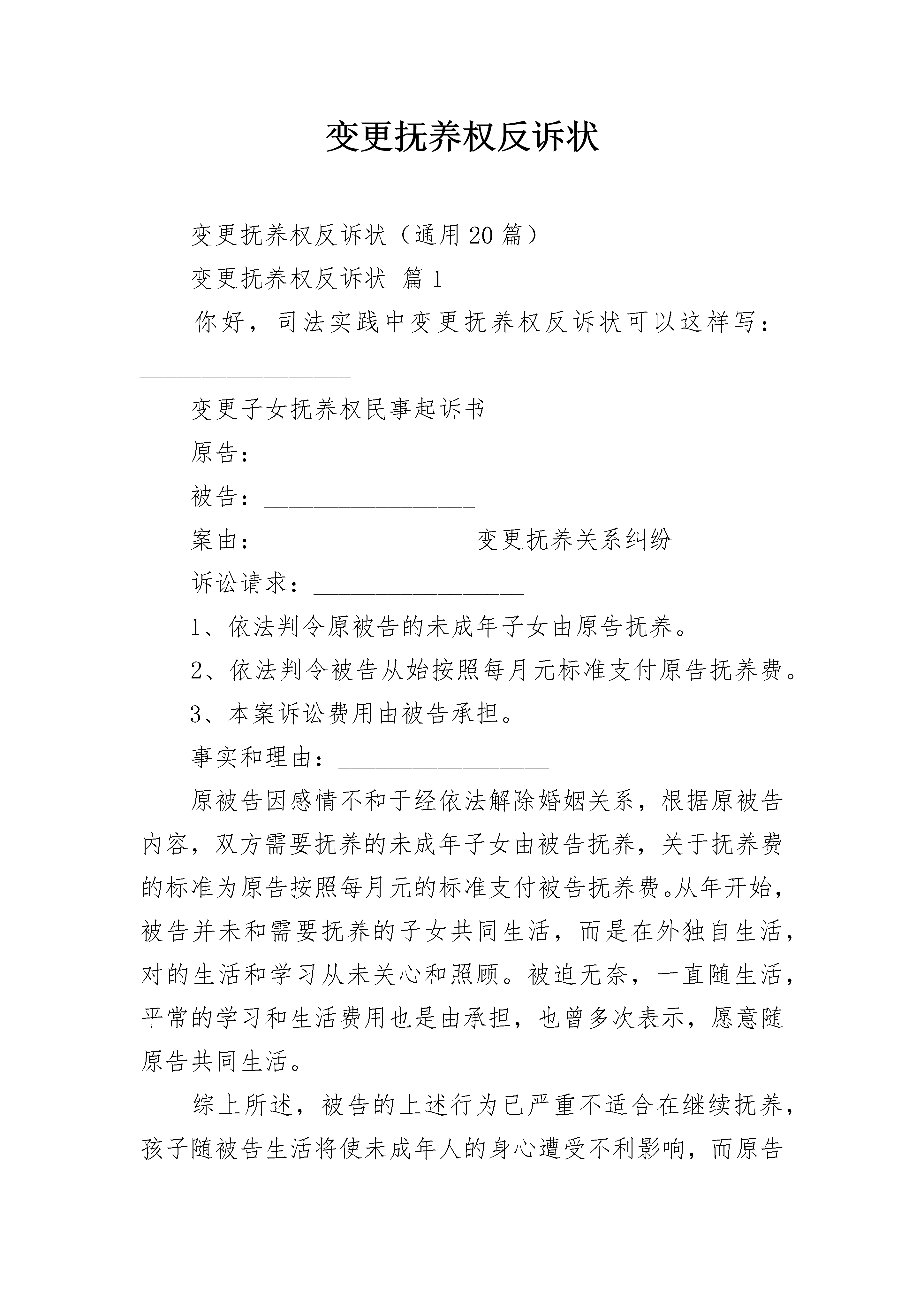 变更抚养权反诉状变更抚养权反诉状(通用20篇)变更抚养权反诉状篇1你好,司法实践中变更抚养权反诉状可以这样写:_________________变更子女抚养权民事起诉书原告:_________________被告:_________________案由:_________________变更抚养关系纠纷诉讼请求:_________________1、依法判令原被告的未成年子女由原告抚养。2、依法判令被告从始按照每月元标准支付原告抚养费。3、本案诉讼费用由被告承担。事实和理由:_________________原被告因感情不和于经依法解除婚姻关系,根据原被告内容,双方需要抚养的未成年子女由被告抚养,关于抚养费的标准为原告按照每月元的标准支付被告抚养费。从年开始,被告并未和需要抚养的子女共同生活,而是在外独自生活,对的生活和学习从未关心和照顾。被迫无奈,一直随生活,平常的学习和生活费用也是由承担,也曾多次表示,愿意随原告共同生活。综上所述,被告的上述行为已严重不适合在继续抚养,孩子随被告生活将使未成年人的身心遭受不利影响,而原告现在有一定的抚养条件和能力,为此,原告特起诉至法院,要求人民法院依法判令原被告双方未成年子女由原告抚养,同时,要求被告按照每月元标准承担孩子的抚养费。请人民法院依法裁决。此致人民法院具状人(签名):_________________具状时间:_________________变更抚养权反诉状篇2你好,变更抚养权斯反诉状和谐起诉状没有太大区别,主要的格式是:_________________原告:______________,女,汉族,_____________年__________月__________日生,住址__________市__________区_______________楼__________号。身份证号:_____________被告:______________,女,汉族,岁,__________现住__________市__________区_______________楼_______________号。联系电话:_____________诉讼请求:______________事实和理由:______________原告认为........原告请求人民法院以事实为依据,以法律为准绳,支持原告诉请,实现公平正义。此致__________市__________区人民法院具状人:______________年____月____日变更抚养权反诉状篇3原告李某,女,_____________年__________月__________日出生,汉族,住__________省__________市__________区__________镇__________街__________巷__________门牌号。身份证号:______________,联系电话:______________。被告王某,男,_____________年__________月__________日出生,汉族,住__________省__________市__________区__________镇__________街__________巷__________门牌号。身份证号:______________,联系电话:______________。诉讼请求1、要求变更抚养关系,婚生子王某某判由原告李某抚养。2、要求被告王某按其月收入25%(20%-30%之间)支付抚养费,至孩子满18周岁。3、诉讼费用由被告承担。事实与理由原、被告双方经人介绍于_____________年__________月__________日登记结婚,_____________年__________月__________日生一男孩王某某,_____________年原、被告协议离婚,约定由被告王某抚养孩子,由原告李某支付抚养费,因被告未尽到其应尽的义务,致使孩子的身心健康受到损害,为此原告特向法院起诉,请求依法变更抚养关系,将婚生子王某某判由原告方抚养,并由被告依法支付抚养费。此致钢城区人民法院起诉人:______________________年_____月____日变更抚养权反诉状篇4变更孩子抚养权诉状原告:______________,女,_________年_____月_____日生,汉族,__________市人,住__________市__________区__________路__________号__________小区_____单元_____号。被告:______________,男,__________年_____月_____日生,汉族,__________市,__________公司职工,住__________市_______