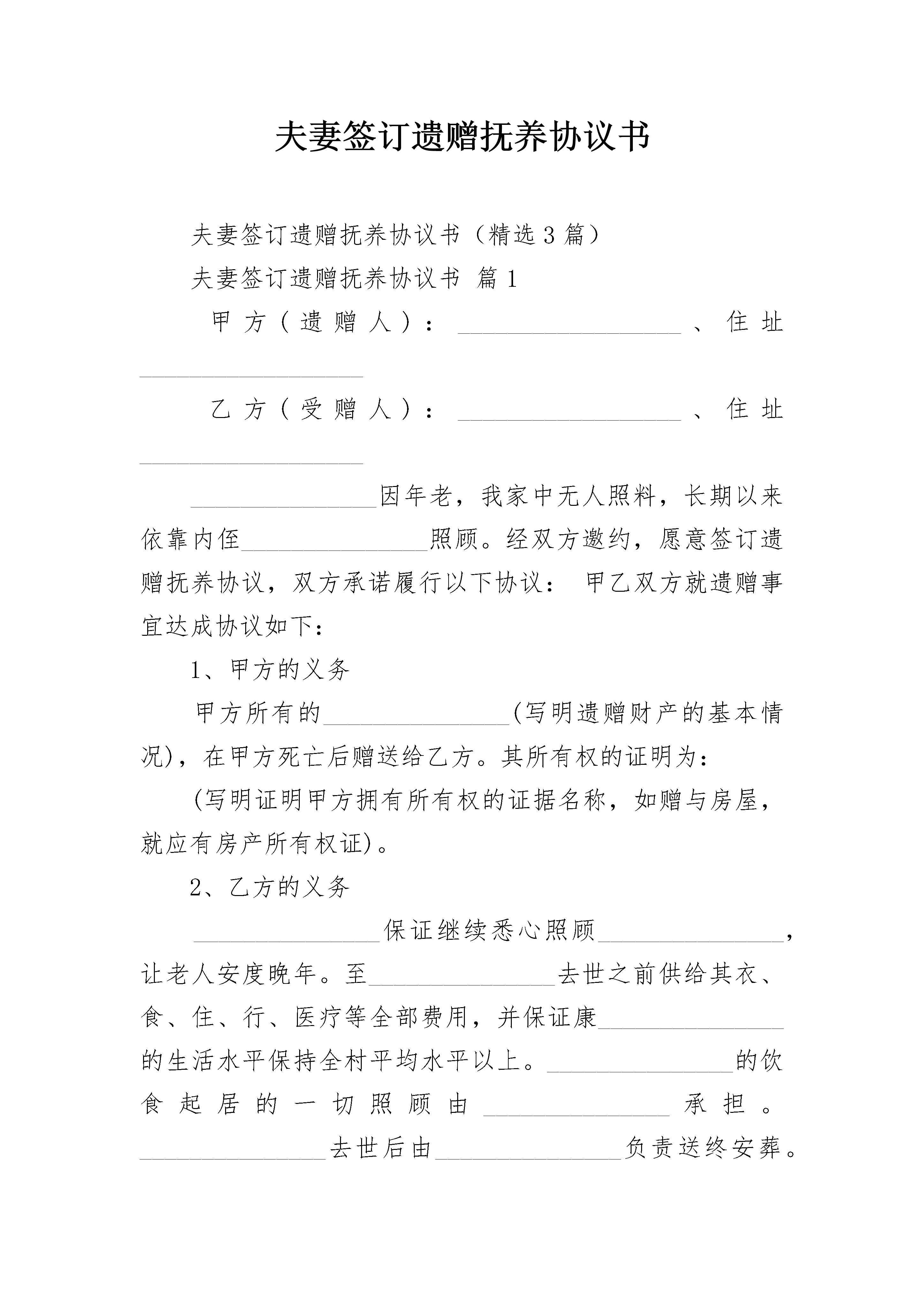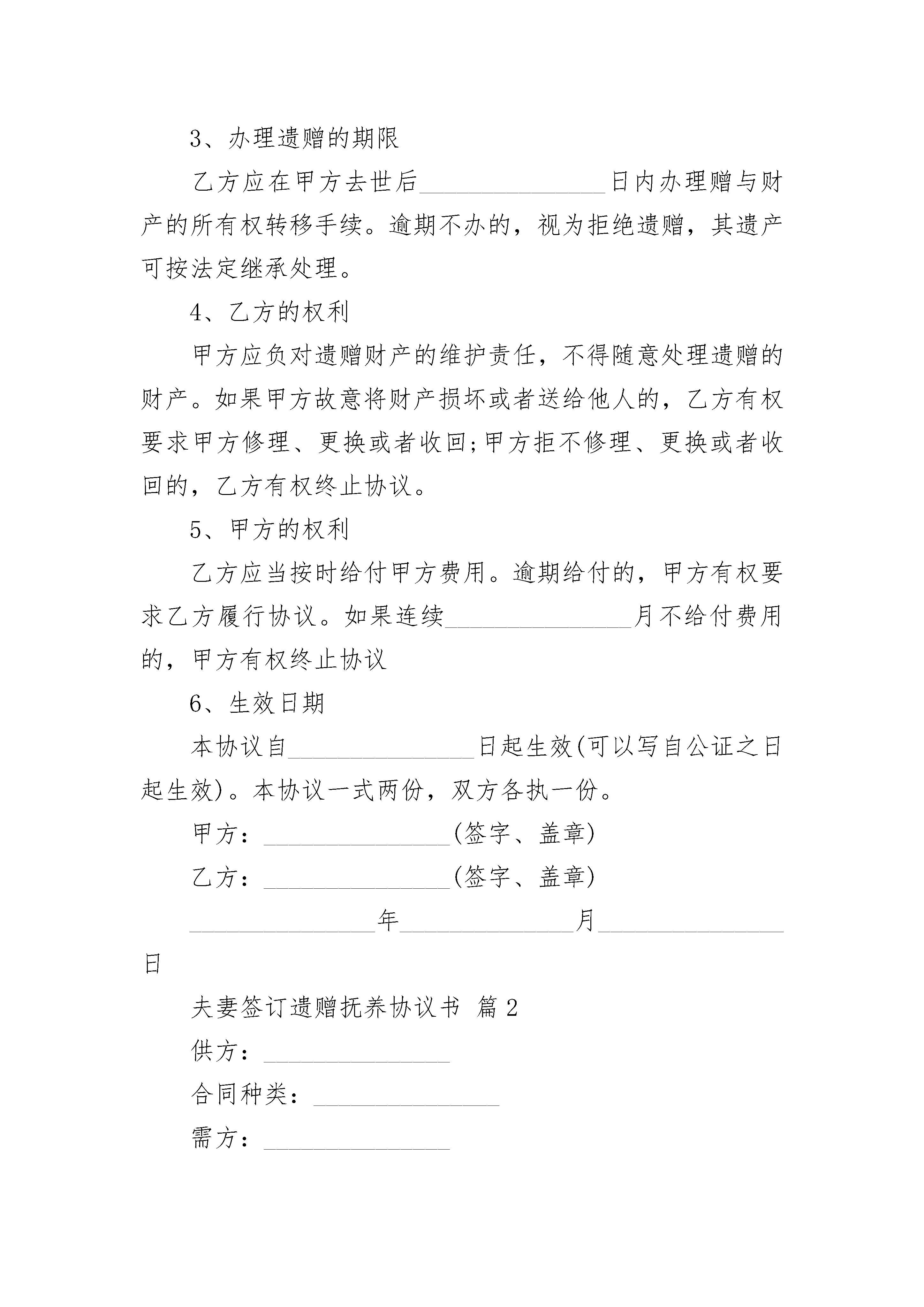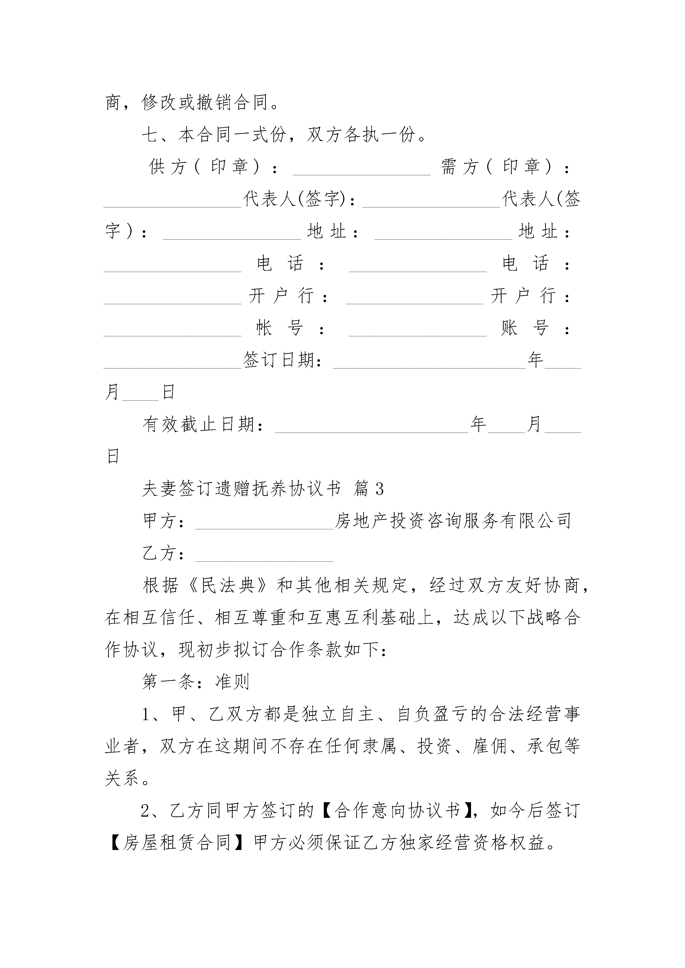夫妻签订遗赠抚养协议书夫妻签订遗赠抚养协议书(精选3篇)夫妻签订遗赠抚养协议书篇1甲方(遗赠人):__________________、住址__________________乙方(受赠人):__________________、住址_________________________________因年老,我家中无人照料,长期以来依靠内侄_______________照顾。经双方邀约,愿意签订遗赠抚养协议,双方承诺履行以下协议:甲乙双方就遗赠事宜达成协议如下:1、甲方的义务甲方所有的_______________(写明遗赠财产的基本情况),在甲方死亡后赠送给乙方。其所有权的证明为:(写明证明甲方拥有所有权的证据名称,如赠与房屋,就应有房产所有权证)。2、乙方的义务_______________保证继续悉心照顾_______________,让老人安度晚年。至_______________去世之前供给其衣、食、住、行、医疗等全部费用,并保证康_______________的生活水平保持全村平均水平以上。_______________的饮食起居的一切照顾由_______________承担。_______________去世后由_______________负责送终安葬。3、办理遗赠的期限乙方应在甲方去世后_______________日内办理赠与财产的所有权转移手续。逾期不办的,视为拒绝遗赠,其遗产可按法定继承处理。4、乙方的权利甲方应负对遗赠财产的维护责任,不得随意处理遗赠的财产。如果甲方故意将财产损坏或者送给他人的,乙方有权要求甲方修理、更换或者收回;甲方拒不修理、更换或者收回的,乙方有权终止协议。5、甲方的权利乙方应当按时给付甲方费用。逾期给付的,甲方有权要求乙方履行协议。如果连续_______________月不给付费用的,甲方有权终止协议6、生效日期本协议自_______________日起生效(可以写自公证之日起生效)。本协议一式两份,双方各执一份。甲方:_______________(签字、盖章)乙方:_______________(签字、盖章)_______________年______________月_______________日夫妻签订遗赠抚养协议书篇2供方:_______________合同种类:_______________需方:_______________合同编号:_______________为了改善生态环境,促进林业发展,响应县委、县政府的号召,确保安塞县绿色长廊工程种苗供应,经双方协商,订立如下条款,以资共同遵守。一、种苗品种;规格;数量;单价金额;交货期______年____月____日至______年____月____日。二、种苗验收方法:由林业局按照种苗规格如地径、高度、土球直径、冠幅等标准验收。三、包装要求:苗木带土球的要用草绳固定土球,不带土球的要求有营养钵。四、合同履行地点:安塞县。期限:______年____月____日至______年____月____日。方式:_双方共同履行合同的权义,按要求交货付款。五、违约责任:1、供方必须在合同规定的交货期将种苗送到需方指定的定点,如不能按时送到,造成的经济损失由供方承担。2、供方的种苗规格达不到标准要求的,需方有权不予接收,并不承担经济责任。3、需方要按合同签定的种苗数量验收供方的苗木。4、在供方运输种苗过程中发生的任何意外事件需方不承担责任。5、需方要按合同规定的时间支付供方的种木款。六、本合同自签订之日起生效,在合同履行过程中,如有县里计划的变更或人力不可抗拒的意外变化时,应双方协商,修改或撤销合同。七、本合同一式份,双方各执一份。供方(印章):_______________需方(印章):_______________代表人(签字):_______________代表人(签字):_______________地址:_______________地址:_______________电话:_______________电话:_______________开户行:_______________开户行:_______________帐号:_______________账号:_______________签订日期:_____________________年____月____日有效截止日期:_____________________年____月____日夫妻签订遗赠抚养协议书篇3甲方:_______________房地产投资咨询服务有限公司乙方:_______________根据《民法典》和其他相关规定,经过双方友好协商,在相互信任、相互尊重和互惠互利基础上,达成以下战略合作协议,现初步拟订合作条款如下:第一条:准则1、甲、乙双方都是独
