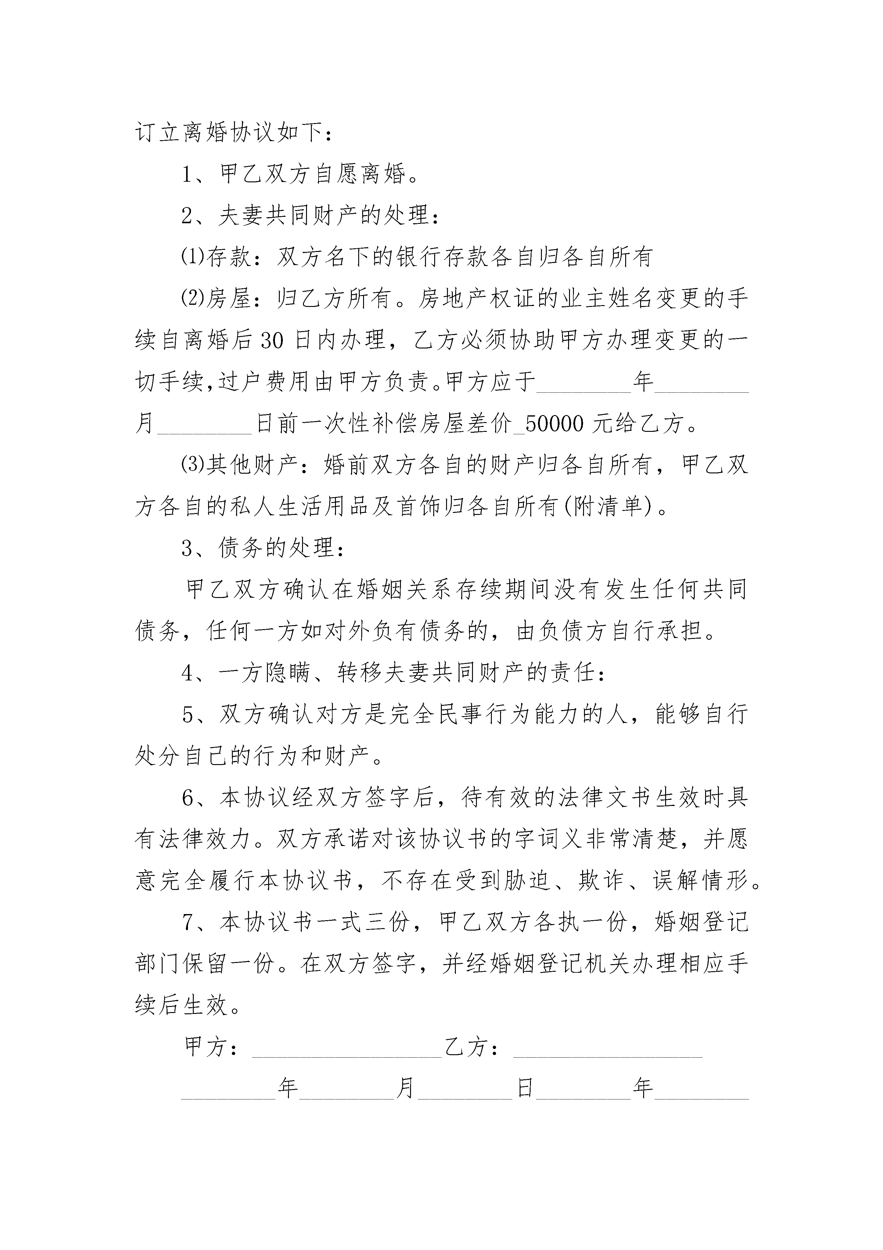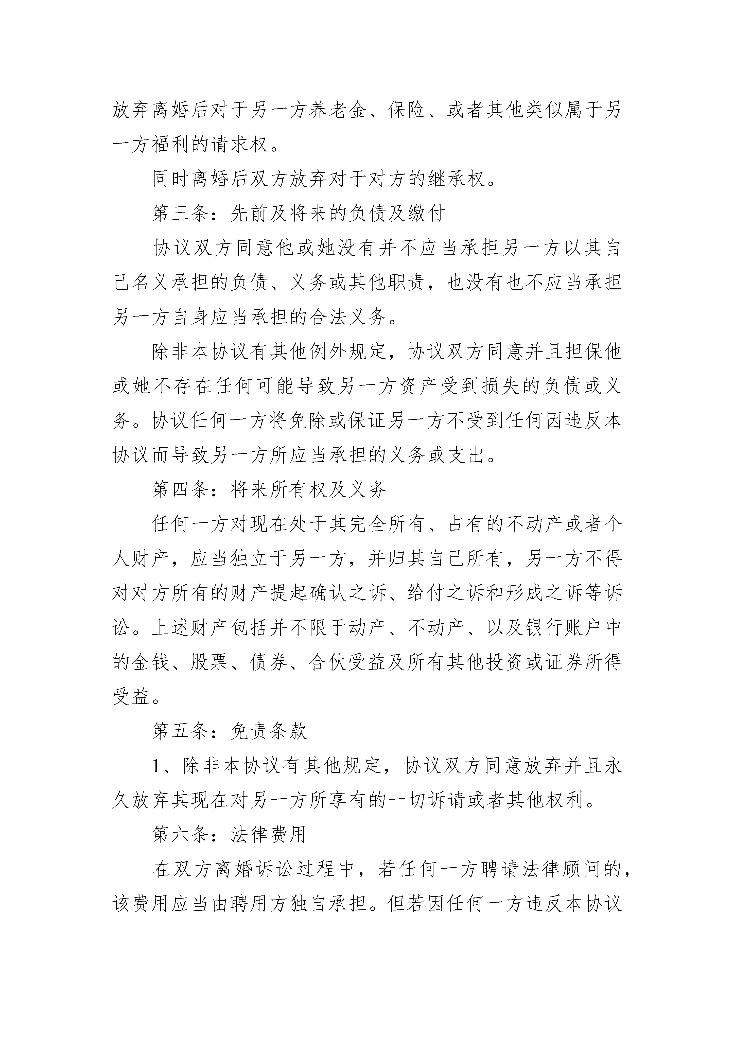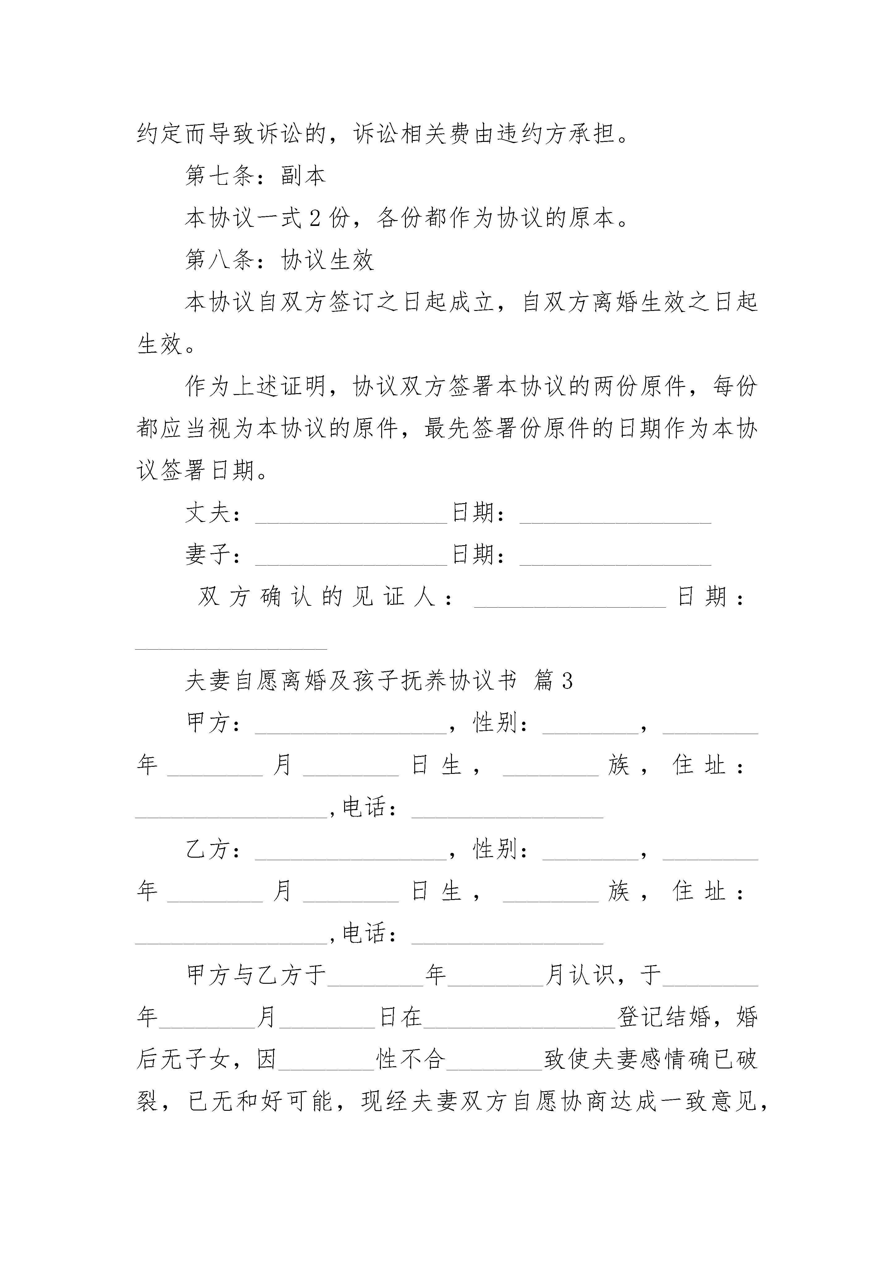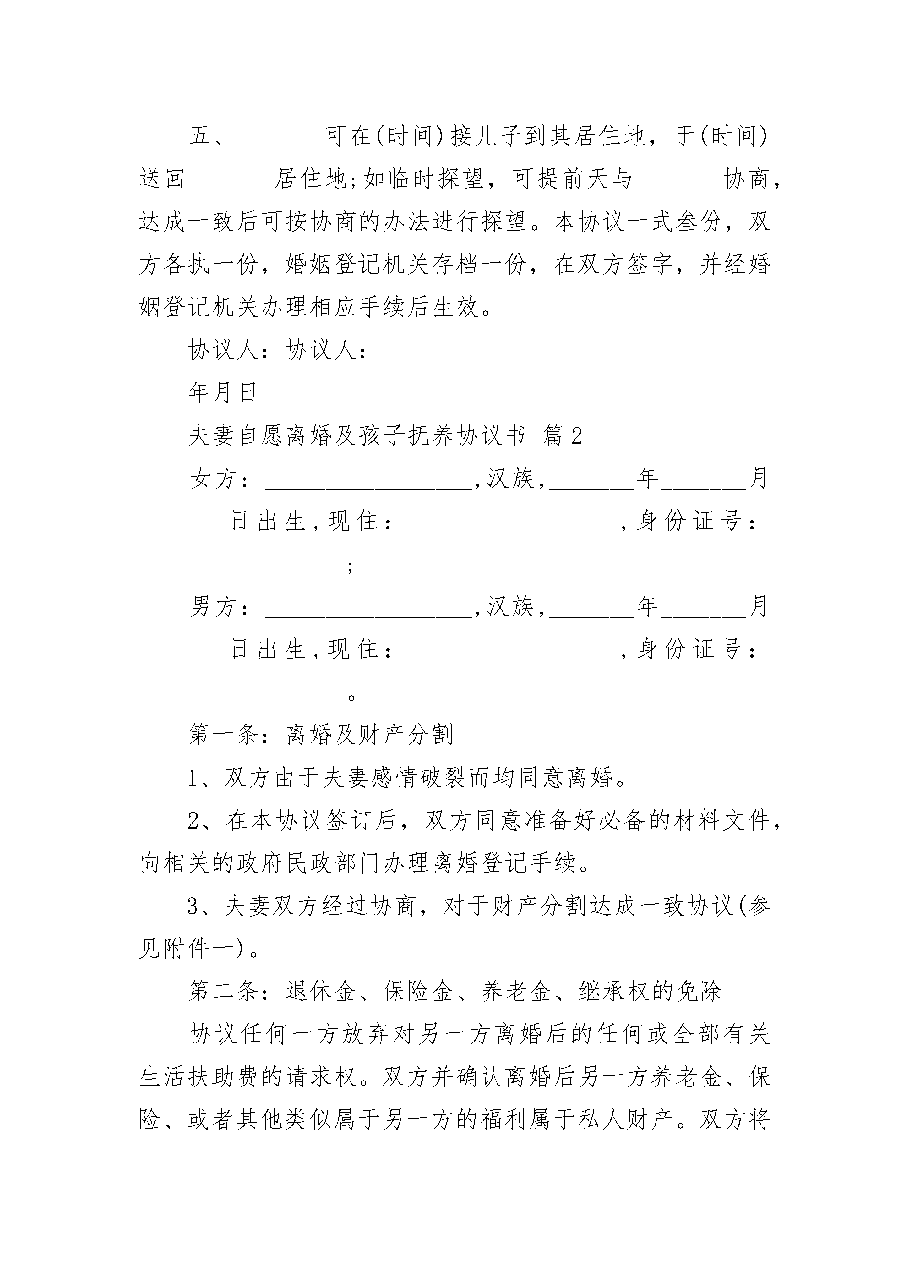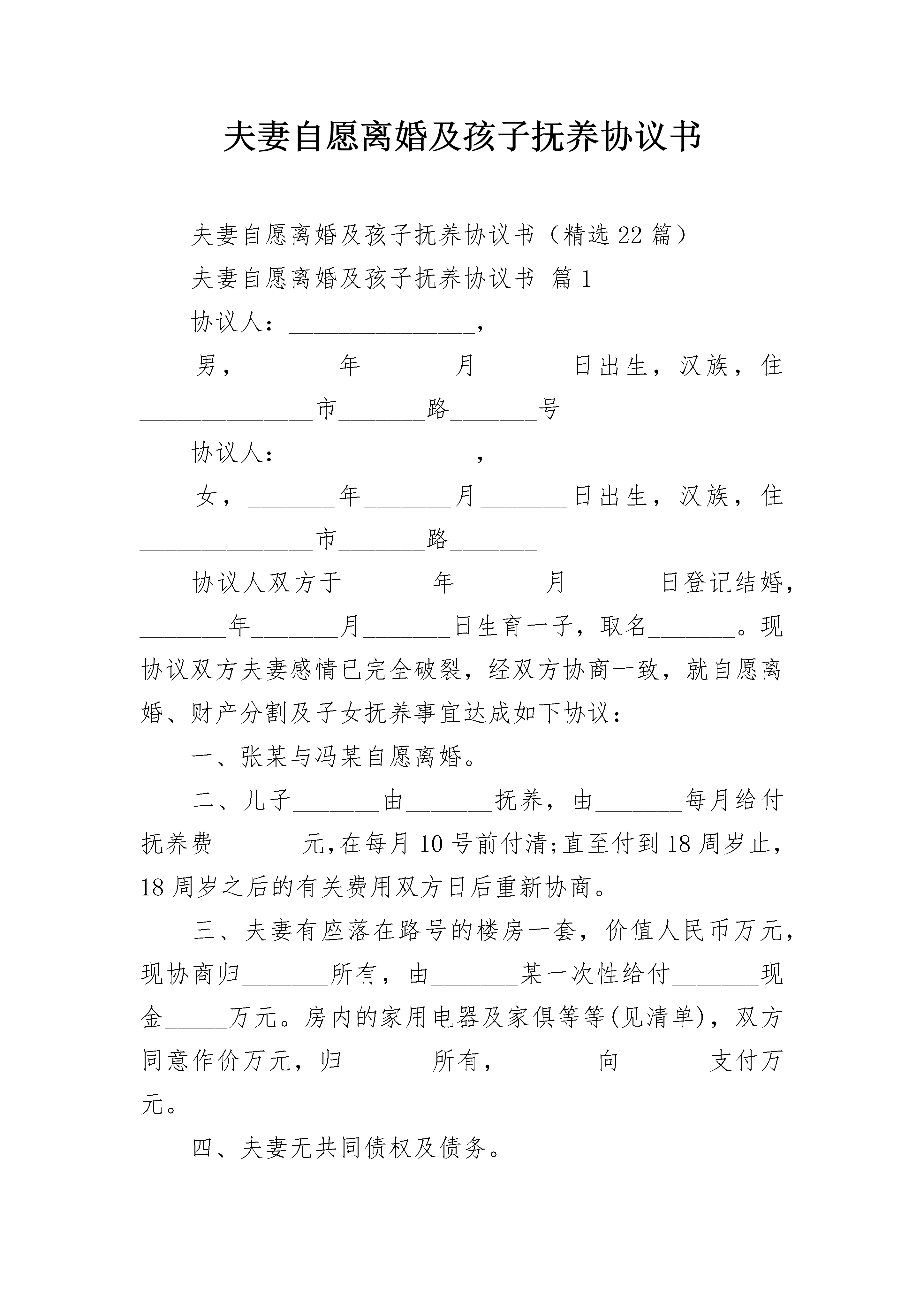 夫妻自愿离婚及孩子抚养协议书夫妻自愿离婚及孩子抚养协议书(精选22篇)夫妻自愿离婚及孩子抚养协议书篇1协议人:_______________,男,_______年_______月_______日出生,汉族,住______________市_______路_______号协议人:_______________,女,_______年_______月_______日出生,汉族,住______________市_______路_______协议人双方于_______年_______月_______日登记结婚,_______年_______月_______日生育一子,取名_______。现协议双方夫妻感情已完全破裂,经双方协商一致,就自愿离婚、财产分割及子女抚养事宜达成如下协议:一、张某与冯某自愿离婚。二、儿子_______由_______抚养,由_______每月给付抚养费_______元,在每月10号前付清;直至付到18周岁止,18周岁之后的有关费用双方日后重新协商。三、夫妻有座落在路号的楼房一套,价值人民币万元,现协商归_______所有,由_______某一次性给付_______现金_____万元。房内的家用电器及家俱等等(见清单),双方同意作价万元,归_______所有,_______向_______支付万元。四、夫妻无共同债权及债务。五、_______可在(时间)接儿子到其居住地,于(时间)送回_______居住地;如临时探望,可提前天与_______协商,达成一致后可按协商的办法进行探望。本协议一式叁份,双方各执一份,婚姻登记机关存档一份,在双方签字,并经婚姻登记机关办理相应手续后生效。协议人:协议人:年月日夫妻自愿离婚及孩子抚养协议书篇2女方:_________________,汉族,_______年_______月_______日出生,现住:_________________,身份证号:_________________;男方:_________________,汉族,_______年_______月_______日出生,现住:_________________,身份证号:_________________。第一条:离婚及财产分割1、双方由于夫妻感情破裂而均同意离婚。2、在本协议签订后,双方同意准备好必备的材料文件,向相关的政府民政部门办理离婚登记手续。3、夫妻双方经过协商,对于财产分割达成一致协议(参见附件一)。第二条:退休金、保险金、养老金、继承权的免除协议任何一方放弃对另一方离婚后的任何或全部有关生活扶助费的请求权。双方并确认离婚后另一方养老金、保险、或者其他类似属于另一方的福利属于私人财产。双方将放弃离婚后对于另一方养老金、保险、或者其他类似属于另一方福利的请求权。同时离婚后双方放弃对于对方的继承权。第三条:先前及将来的负债及缴付协议双方同意他或她没有并不应当承担另一方以其自己名义承担的负债、义务或其他职责,也没有也不应当承担另一方自身应当承担的合法义务。除非本协议有其他例外规定,协议双方同意并且担保他或她不存在任何可能导致另一方资产受到损失的负债或义务。协议任何一方将免除或保证另一方不受到任何因违反本协议而导致另一方所应当承担的义务或支出。第四条:将来所有权及义务任何一方对现在处于其完全所有、占有的不动产或者个人财产,应当独立于另一方,并归其自己所有,另一方不得对对方所有的财产提起确认之诉、给付之诉和形成之诉等诉讼。上述财产包括并不限于动产、不动产、以及银行账户中的金钱、股票、债券、合伙受益及所有其他投资或证券所得受益。第五条:免责条款1、除非本协议有其他规定,协议双方同意放弃并且永久放弃其现在对另一方所享有的一切诉请或者其他权利。第六条:法律费用在双方离婚诉讼过程中,若任何一方聘请法律顾问的,该费用应当由聘用方独自承担。但若因任何一方违反本协议约定而导致诉讼的,诉讼相关费由违约方承担。第七条:副本本协议一式2份,各份都作为协议的原本。第八条:协议生效本协议自双方签订之日起成立,自双方离婚生效之日起生效。作为上述证明,协议双方签署本协议的两份原件,每份都应当视为本协议的原件,最先签署份原件的日期作为本协议签署日期。丈夫:________________日期:________________妻子:________________日期:________________双方确认的见证人:________________日期:________________夫妻自愿离婚及孩子抚养协议书篇3甲方:________________,性别:________,________年________月________日生,________族,住址:________________,电话:________________乙方:_