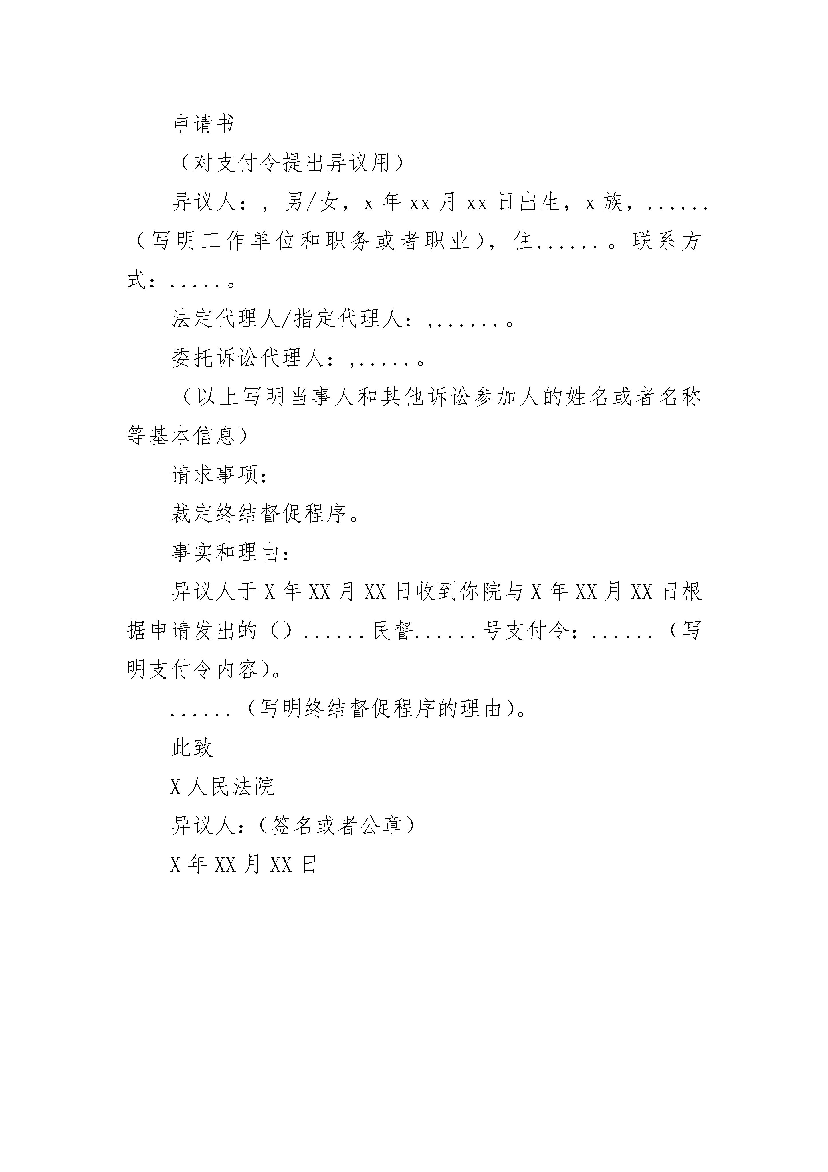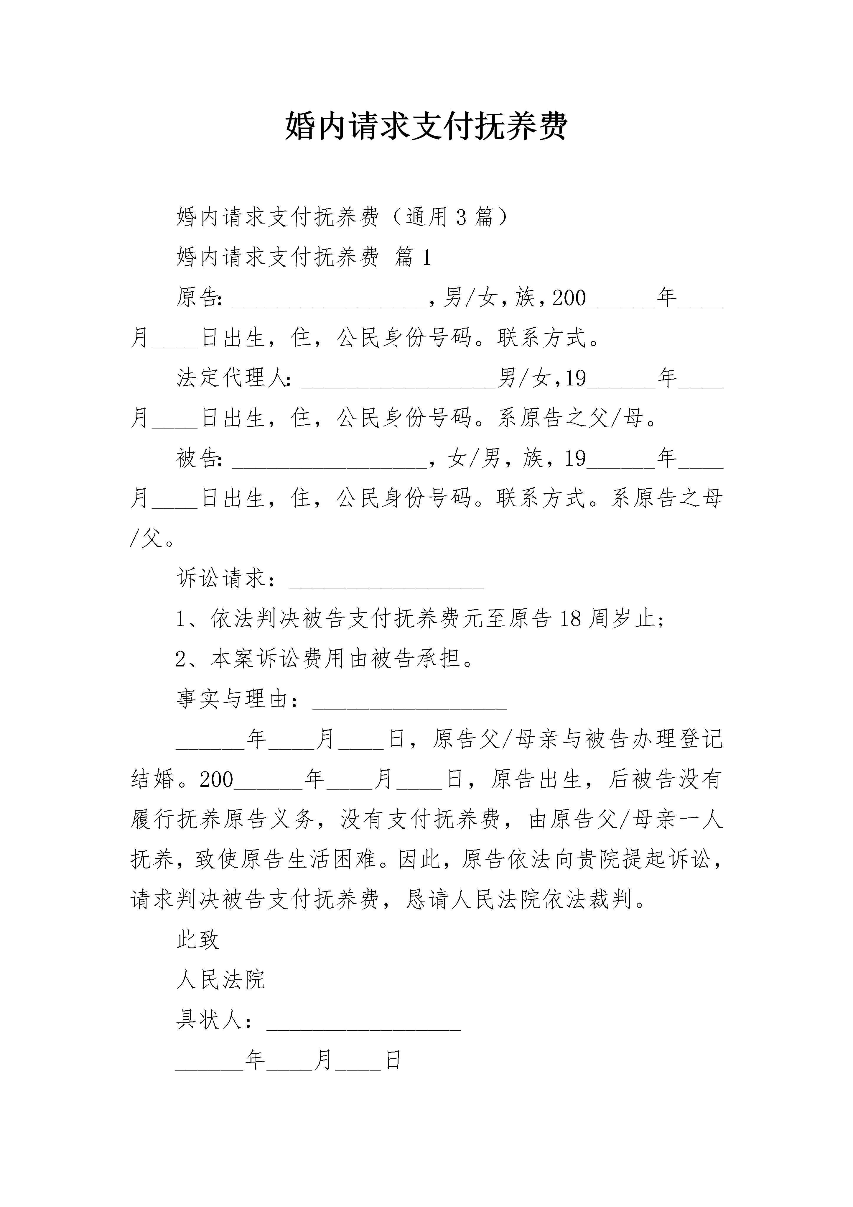 婚内请求支付抚养费婚内请求支付抚养费(通用3篇)婚内请求支付抚养费篇1原告:_________________,男/女,族,200______年____月____日出生,住,公民身份号码。联系方式。法定代理人:_________________男/女,19______年____月____日出生,住,公民身份号码。系原告之父/母。被告:_________________,女/男,族,19______年____月____日出生,住,公民身份号码。联系方式。系原告之母/父。诉讼请求:_________________1、依法判决被告支付抚养费元至原告18周岁止;2、本案诉讼费用由被告承担。事实与理由:_______________________年____月____日,原告父/母亲与被告办理登记结婚。200______年____月____日,原告出生,后被告没有履行抚养原告义务,没有支付抚养费,由原告父/母亲一人抚养,致使原告生活困难。因此,原告依法向贵院提起诉讼,请求判决被告支付抚养费,恳请人民法院依法裁判。此致人民法院具状人:_______________________年____月____日婚内请求支付抚养费篇2_____________人民法院民事裁定书(_____________)……民督……号申请人:______________,……。……被申请人:______________,……。……(以上写明申请人、被申请人及其代理人的姓名或者名称等基本信息)申请人_______________于_____________年__________月__________日向本院提出支付令申请。本院于_____________年__________月__________日受理后,经审查认为,……(写明申请不成立的理由)。依照《中华人民共和国民事诉讼法》第二百一十六条第一款、《最高人民法院关于适用〈中华人民共和国民事诉讼法〉的解释》第四百三十条规定,裁定如下:驳回_______________的支付令申请。本裁定为终审裁定。审判员____________________________年__________月__________日(院印)书记员_______________婚内请求支付抚养费篇3申请书(对支付令提出异议用)异议人:,男/女,x年xx月xx日出生,x族,......(写明工作单位和职务或者职业),住......。联系方式:.....。法定代理人/指定代理人:,......。委托诉讼代理人:,.....。(以上写明当事人和其他诉讼参加人的姓名或者名称等基本信息)请求事项:裁定终结督促程序。事实和理由:异议人于X年XX月XX日收到你院与X年XX月XX日根据申请发出的()......民督......号支付令:......(写明支付令内容)。......(写明终结督促程序的理由)。此致X人民法院异议人:(签名或者公章)X年XX月XX日