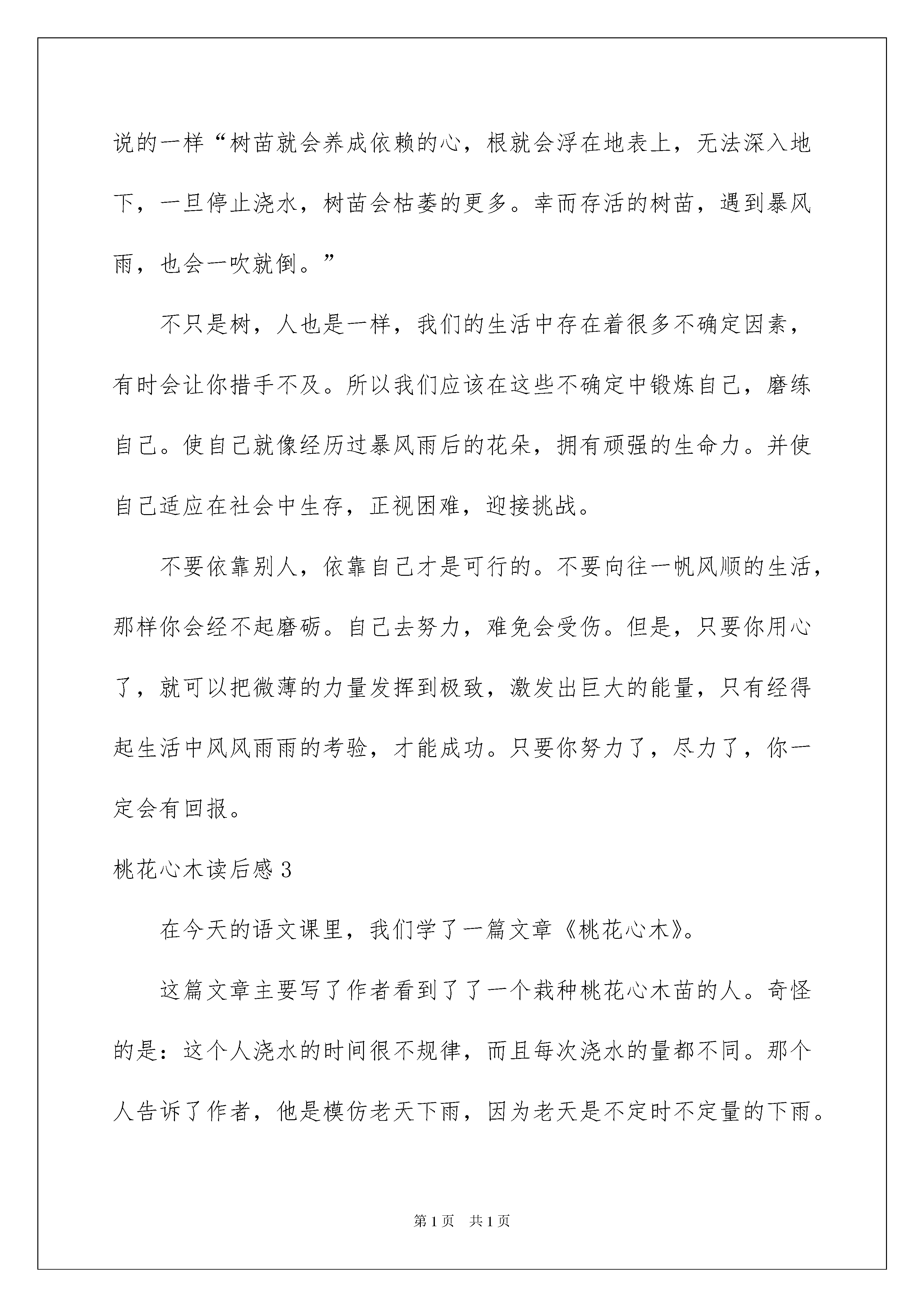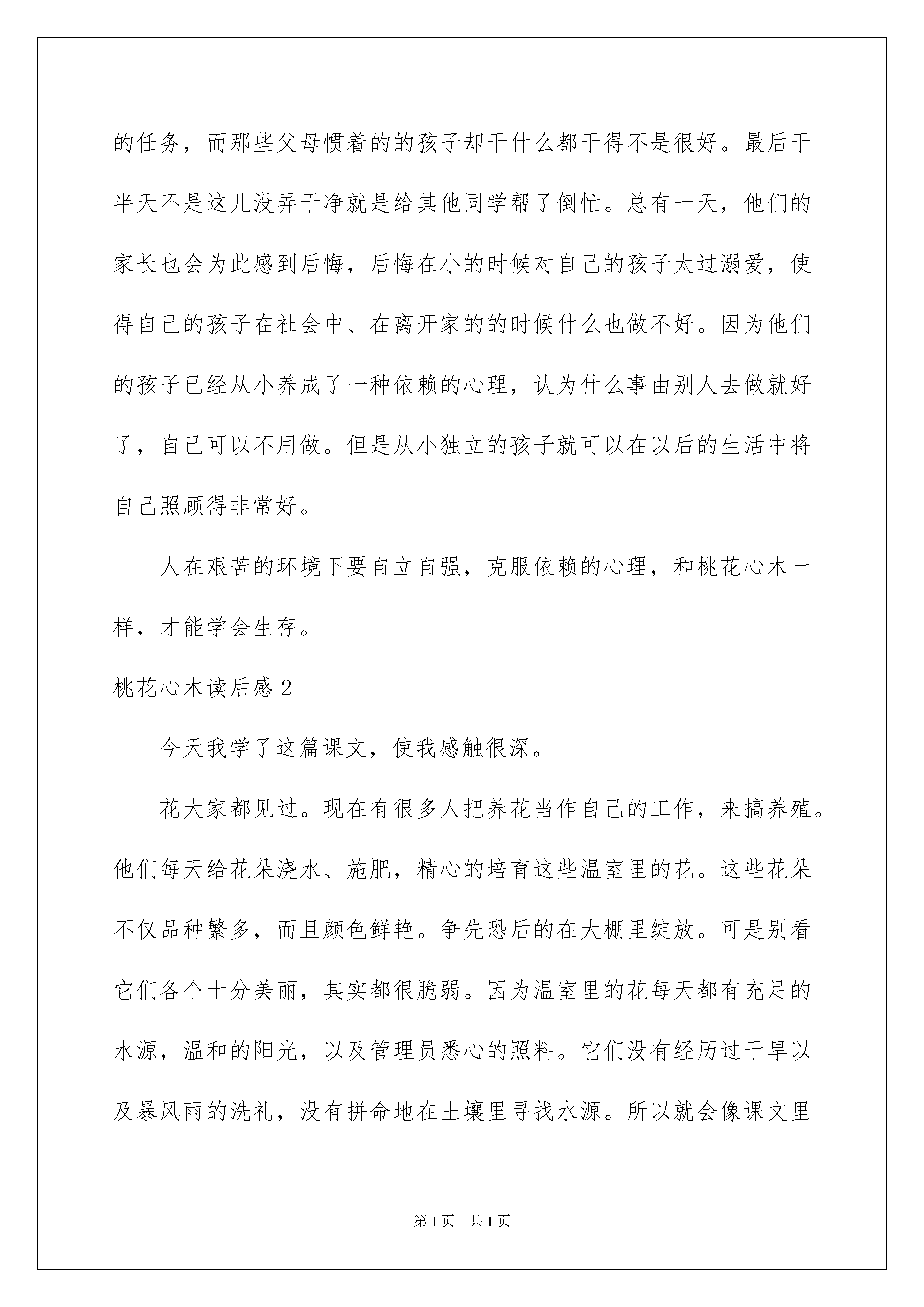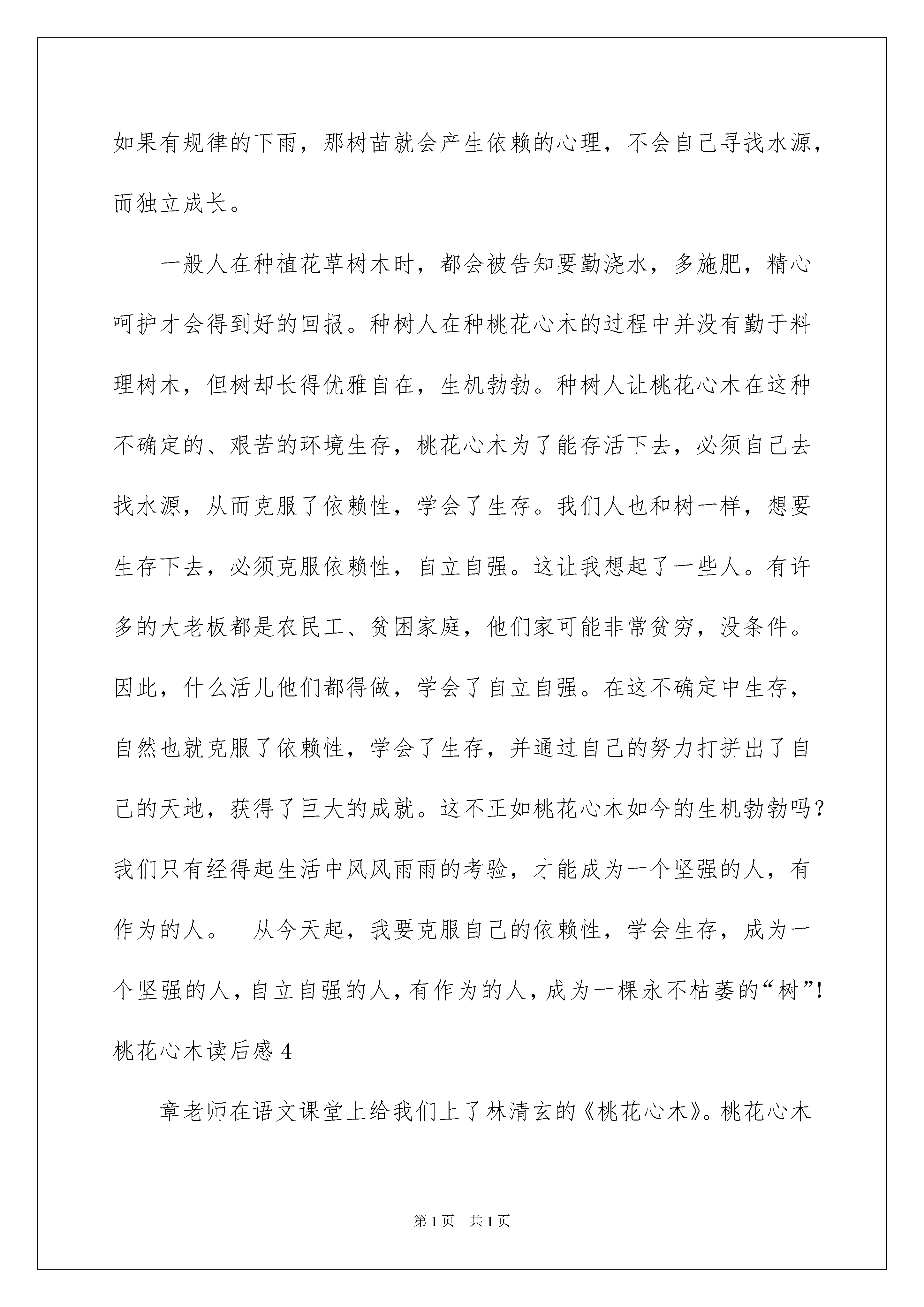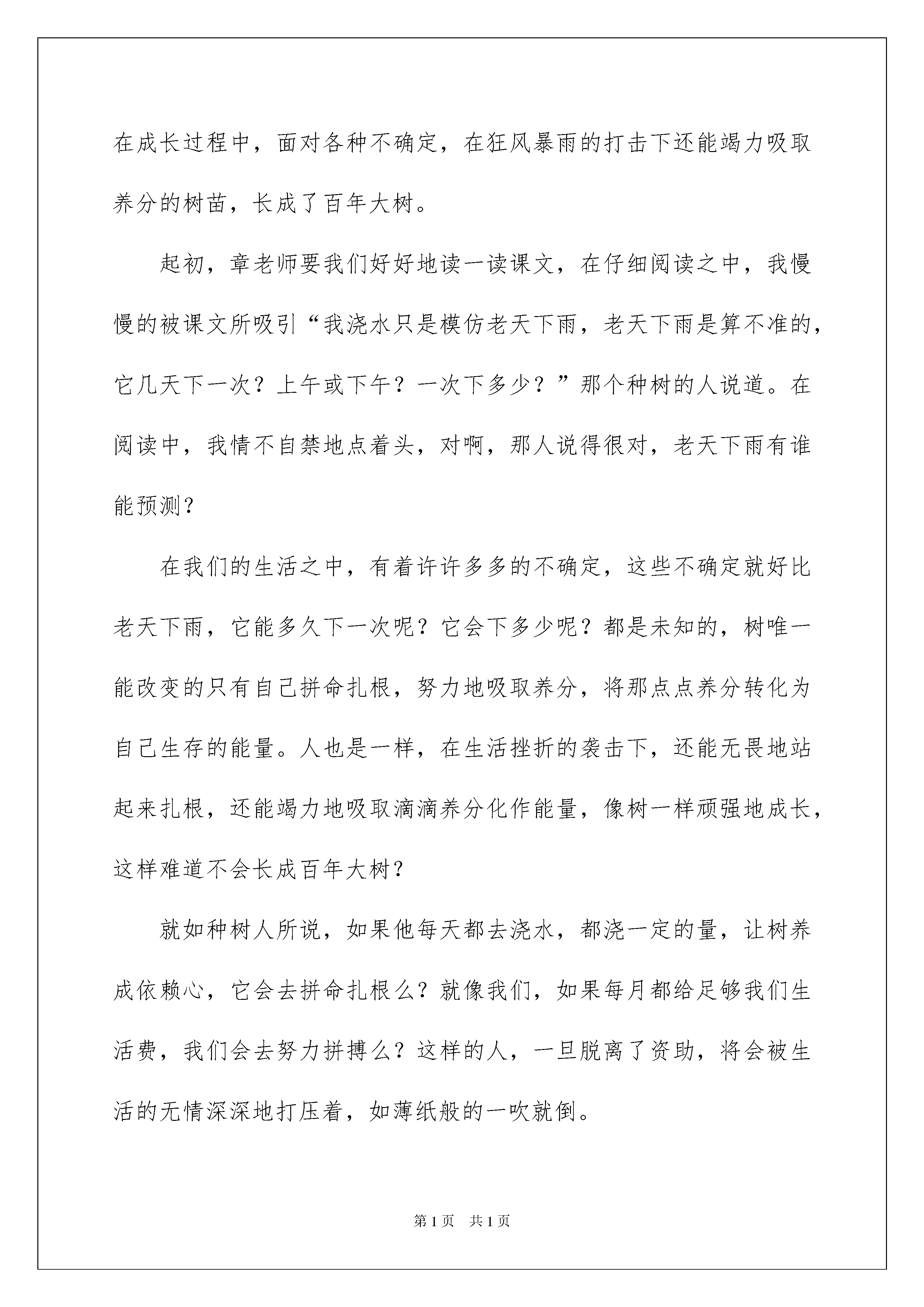 2022桃花心木读后感桃花心木读后感读完一本书以后,你有什么体会呢?此时需要认真地做好记录,写写读后感了。可能你现在毫无头绪吧,下面是我帮大家整理的桃花心木读后感,欢迎大家分享。桃花心木读后感1“不确定的生活中勤加磨炼,适应自然就能学会生存。”这是我从《桃花心木》一文中得到的启示。我其实也算一个温室里的花朵。父母是精心的的呵护。虽然还没到“捧到手里怕摔了,含到嘴里怕化了”的地步,但我从这篇意思浅显的课文中感受到了许多许多……读了这篇文章,我十分感动。树木想要茁壮生长必须先学会在无规律中找到可以让自己成活的养份,人要想成长、成才也必须经得起生活的考验。的确,在现实生活中,这难道不是真理吗?大家都说:“穷人的孩子早当家。”在学校的生活中,那些娇生惯养的同学,在家几乎什么都不做,让父母为他们服务,自己却舒服地享受着父母的“服侍”。学校打扫卫生时,有些同学利利索索、非常迅速地就能完成自己的任务,而那些父母惯着的的孩子却干什么都干得不是很好。最后干半天不是这儿没弄干净就是给其他同学帮了倒忙。总有一天,他们的家长也会为此感到后悔,后悔在小的时候对自己的孩子太过溺爱,使得自己的孩子在社会中、在离开家的的时候什么也做不好。因为他们的孩子已经从小养成了一种依赖的心理,认为什么事由别人去做就好了,自己可以不用做。但是从小独立的孩子就可以在以后的生活中将自己照顾得非常好。人在艰苦的环境下要自立自强,克服依赖的心理,和桃花心木一样,才能学会生存。桃花心木读后感2今天我学了这篇课文,使我感触很深。花大家都见过。现在有很多人把养花当作自己的工作,来搞养殖。他们每天给花朵浇水、施肥,精心的培育这些温室里的花。这些花朵不仅品种繁多,而且颜色鲜艳。争先恐后的在大棚里绽放。可是别看它们各个十分美丽,其实都很脆弱。因为温室里的花每天都有充足的水源,温和的阳光,以及管理员悉心的照料。它们没有经历过干旱以及暴风雨的洗礼,没有拼命地在土壤里寻找水源。所以就会像课文里说的一样“树苗就会养成依赖的心,根就会浮在地表上,无法深入地下,一旦停止浇水,树苗会枯萎的更多。幸而存活的树苗,遇到暴风雨,也会一吹就倒。”不只是树,人也是一样,我们的生活中存在着很多不确定因素,有时会让你措手不及。所以我们应该在这些不确定中锻炼自己,磨练自己。使自己就像经历过暴风雨后的花朵,拥有顽强的生命力。并使自己适应在社会中生存,正视困难,迎接挑战。不要依靠别人,依靠自己才是可行的。不要向往一帆风顺的生活,那样你会经不起磨砺。自己去努力,难免会受伤。但是,只要你用心了,就可以把微薄的力量发挥到极致,激发出巨大的能量,只有经得起生活中风风雨雨的考验,才能成功。只要你努力了,尽力了,你一定会有回报。桃花心木读后感3在今天的语文课里,我们学了一篇文章《桃花心木》。这篇文章主要写了作者看到了了一个栽种桃花心木苗的人。奇怪的是:这个人浇水的时间很不规律,而且每次浇水的量都不同。那个人告诉了作者,他是模仿老天下雨,因为老天是不定时不定量的下雨。如果有规律的下雨,那树苗就会产生依赖的心理,不会自己寻找水源,而独立成长。一般人在种植花草树木时,都会被告知要勤浇水,多施肥,精心呵护才会得到好的回报。种树人在种桃花心木的过程中并没有勤于料理树木,但树却长得优雅自在,生机勃勃。种树人让桃花心木在这种不确定的、艰苦的环境生存,桃花心木为了能存活下去,必须自己去找水源,从而克服了依赖性,学会了生存。我们人也和树一样,想要生存下去,必须克服依赖性,自立自强。这让我想起了一些人。有许多的大老板都是农民工、贫困家庭,他们家可能非常贫穷,没条件。因此,什么活儿他们都得做,学会了自立自强。在这不确定中生存,自然也就克服了依赖性,学会了生存,并通过自己的努力打拼出了自己的天地,获得了巨大的成就。这不正如桃花心木如今的生机勃勃吗?我们只有经得起生活中风风雨雨的考验,才能成为一个坚强的人,有作为的人。从今天起,我要克服自己的依赖性,学会生存,成为一个坚强的人,自立自强的人,有作为的人,成为一棵永不枯萎的“树”!桃花心木读后感4章老师在语文课堂上给我们上了林清玄的《桃花心木》。桃花心木在成长过程中,面对各种不确定,在狂风暴雨的打击下还能竭力吸取养分的树苗,长成了百年大树。起初,章老师要我们好好地读一读课文,在仔细阅读之中,我慢慢的被课文所吸引“我浇水只是模仿老天下雨,老天下雨是算不准的,它几天下一次?上午或下午?一次下多少?”那个种树的人说道。在阅读中,我情不自禁地点着头,对啊,那人说得很对,老天下雨有谁能预测?在我们的生活之中,有着许许多多的不确定,这些不确定就好比老天下雨,它能多久下一次