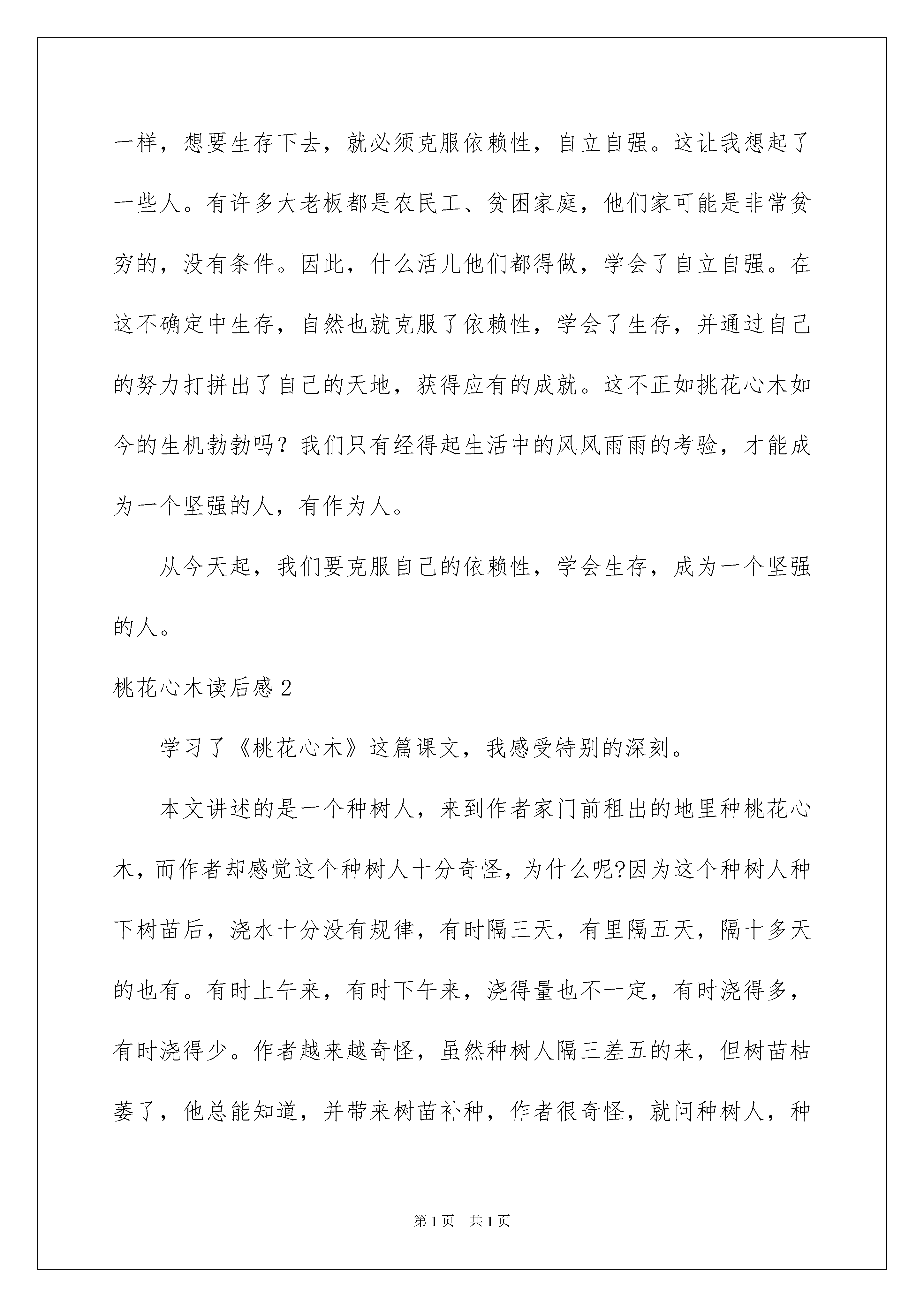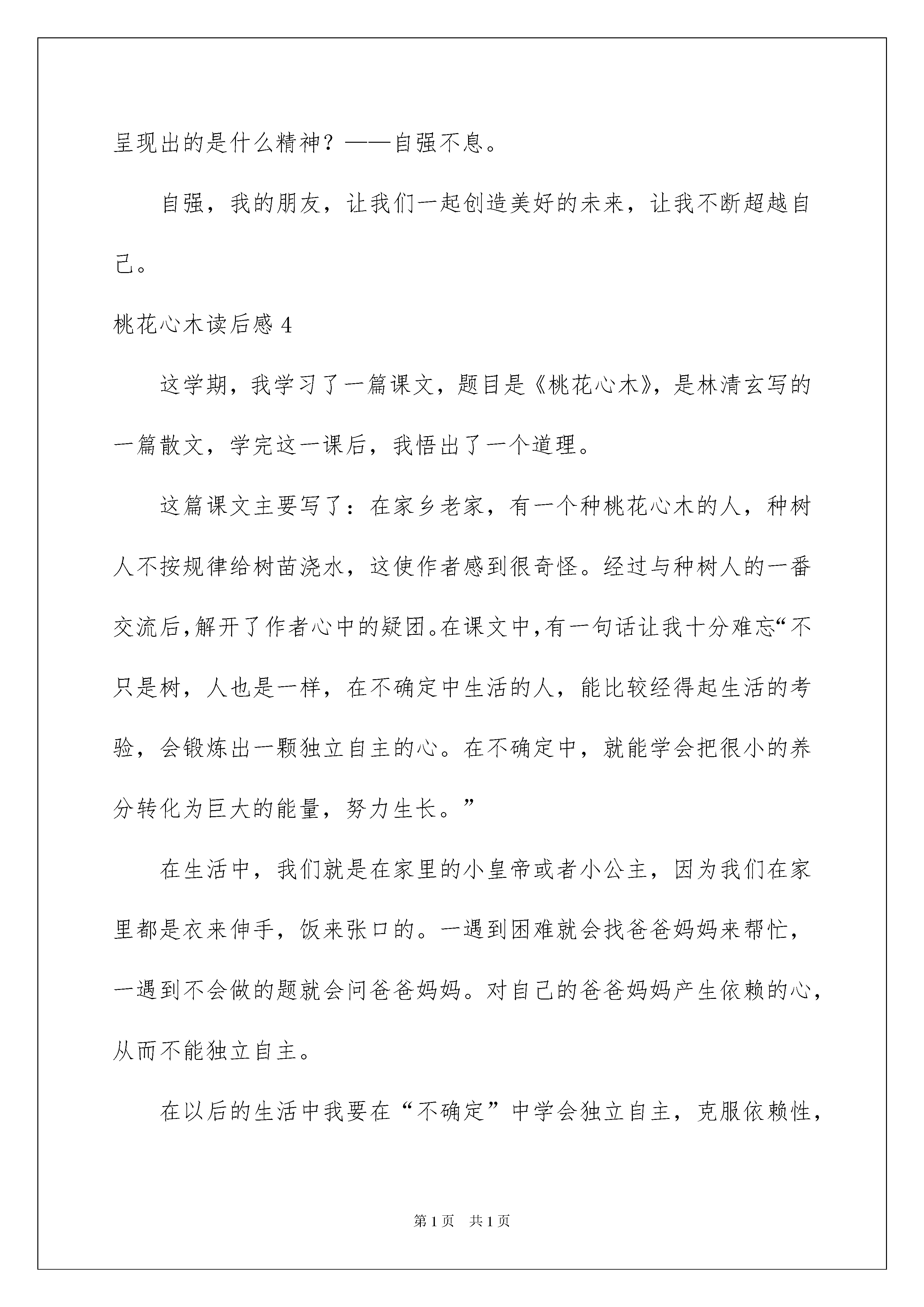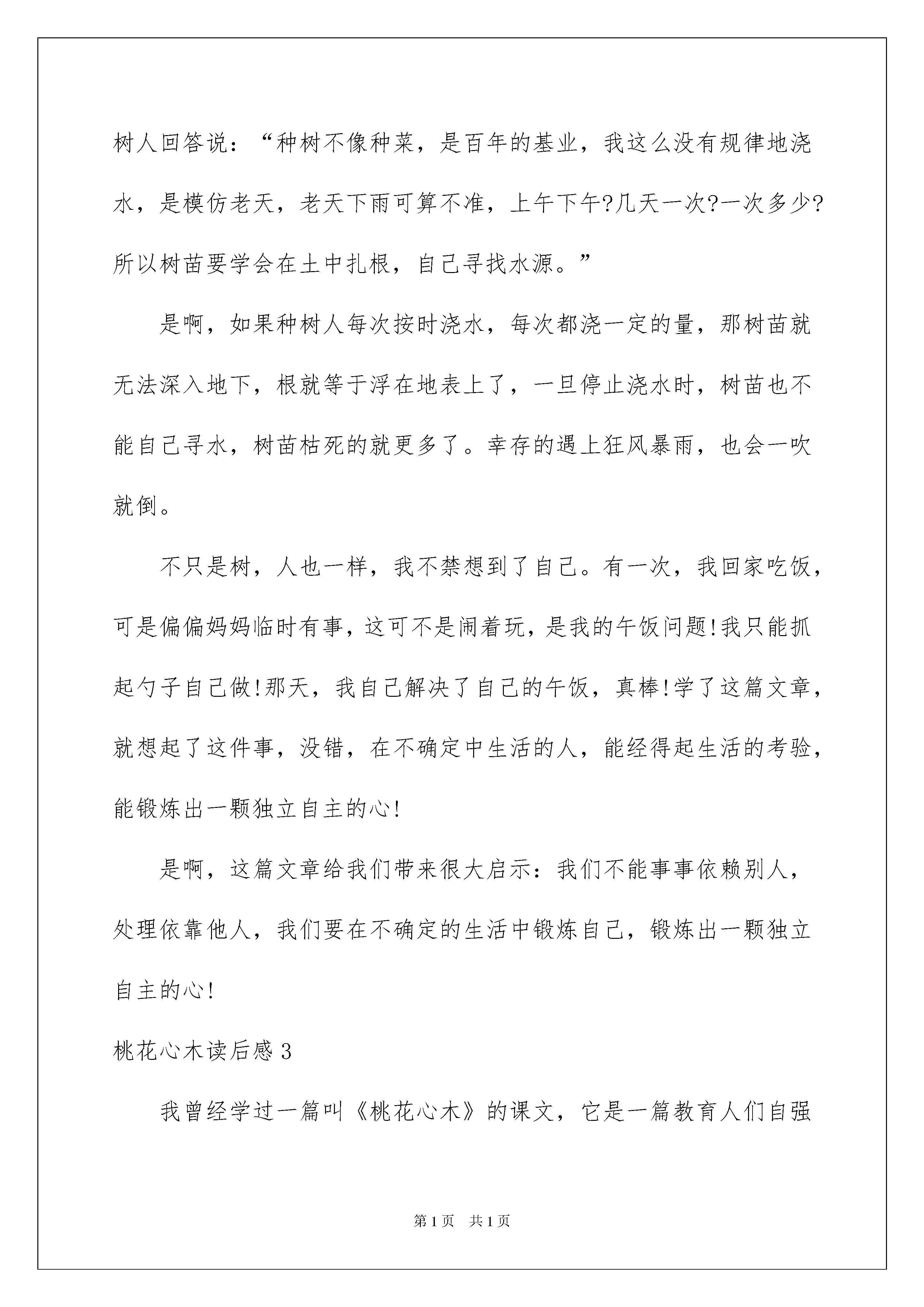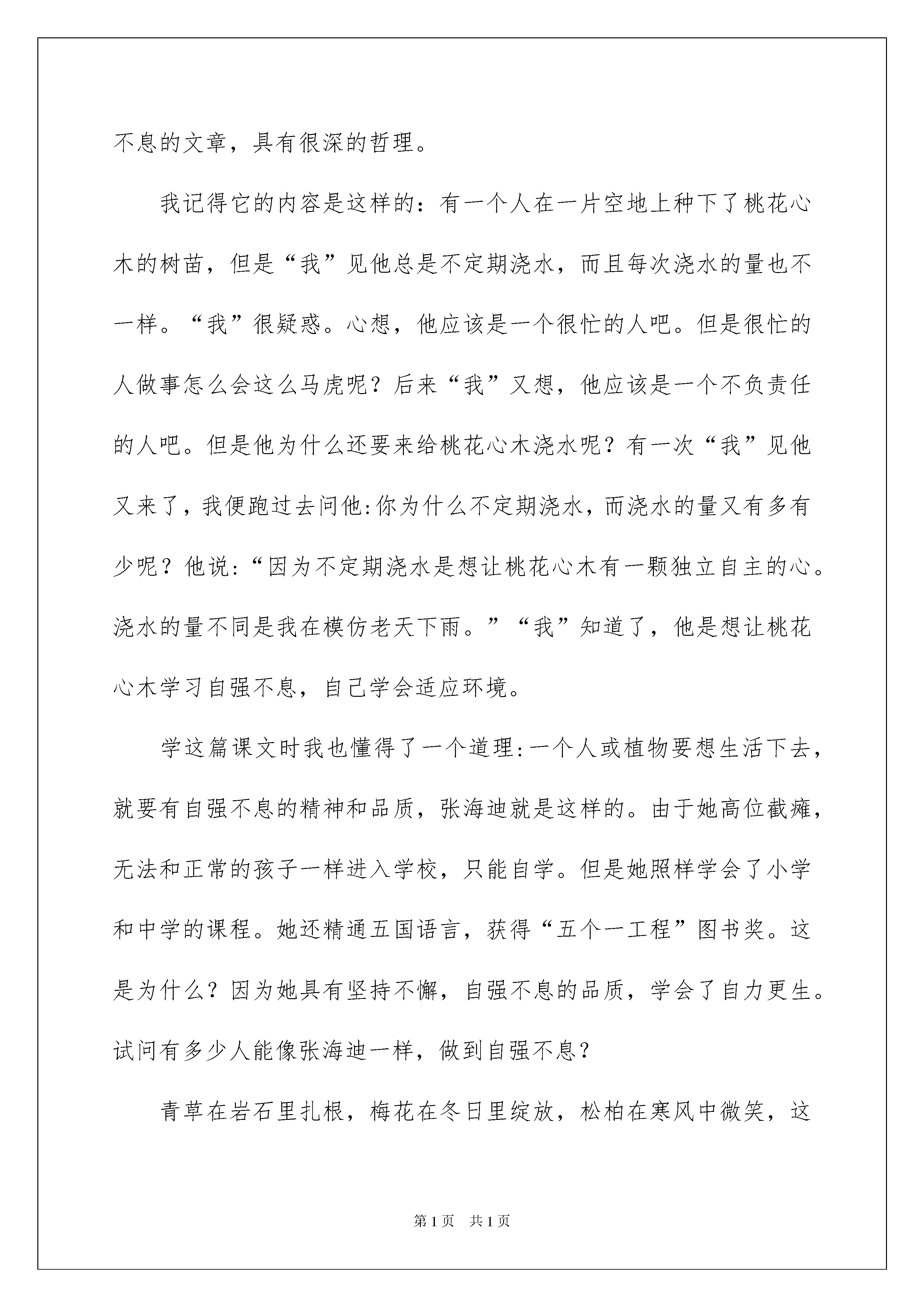 2022桃花心木读后感15篇桃花心木读后感15篇当品味完一本著作后,相信大家都有很多值得分享的东西,让我们好好写份读后感,把你的收获和感想记录下来吧。千万不能认为读后感随便应付就可以,以下是我收集整理的桃花心木读后感,欢迎大家分享。桃花心木读后感1这学期,我们学习了一篇课文,课文的题目叫做《挑花心木》,学完了这篇课文,我悟出了一个道理。这篇课文主要讲了作者发现种挑花心木的人没有按规律浇水,感到很奇怪,种树人说的一番话使作者明白了一个道理。一般人在种植花草树木时,都会被告知要勤浇水,多施肥,精心呵护才会得到好的回报。种树人在种挑花心木的过程中并没有勤于料理树木,但树却长得优雅自在,生机勃勃。种树人让挑花心木在这种不确定的、艰苦的环境生存,挑花心木为了能存活下去,必须自己去寻找水源,从而克服了依赖性,学会了生存,我们人也要和挑花心木一样,想要生存下去,就必须克服依赖性,自立自强。这让我想起了一些人。有许多大老板都是农民工、贫困家庭,他们家可能是非常贫穷的,没有条件。因此,什么活儿他们都得做,学会了自立自强。在这不确定中生存,自然也就克服了依赖性,学会了生存,并通过自己的努力打拼出了自己的天地,获得应有的成就。这不正如挑花心木如今的生机勃勃吗?我们只有经得起生活中的风风雨雨的考验,才能成为一个坚强的人,有作为人。从今天起,我们要克服自己的依赖性,学会生存,成为一个坚强的人。桃花心木读后感2学习了《桃花心木》这篇课文,我感受特别的深刻。本文讲述的是一个种树人,来到作者家门前租出的地里种桃花心木,而作者却感觉这个种树人十分奇怪,为什么呢?因为这个种树人种下树苗后,浇水十分没有规律,有时隔三天,有里隔五天,隔十多天的也有。有时上午来,有时下午来,浇得量也不一定,有时浇得多,有时浇得少。作者越来越奇怪,虽然种树人隔三差五的来,但树苗枯萎了,他总能知道,并带来树苗补种,作者很奇怪,就问种树人,种树人回答说:“种树不像种菜,是百年的基业,我这么没有规律地浇水,是模仿老天,老天下雨可算不准,上午下午?几天一次?一次多少?所以树苗要学会在土中扎根,自己寻找水源。”是啊,如果种树人每次按时浇水,每次都浇一定的量,那树苗就无法深入地下,根就等于浮在地表上了,一旦停止浇水时,树苗也不能自己寻水,树苗枯死的就更多了。幸存的遇上狂风暴雨,也会一吹就倒。不只是树,人也一样,我不禁想到了自己。有一次,我回家吃饭,可是偏偏妈妈临时有事,这可不是闹着玩,是我的午饭问题!我只能抓起勺子自己做!那天,我自己解决了自己的午饭,真棒!学了这篇文章,就想起了这件事,没错,在不确定中生活的人,能经得起生活的考验,能锻炼出一颗独立自主的心!是啊,这篇文章给我们带来很大启示:我们不能事事依赖别人,处理依靠他人,我们要在不确定的生活中锻炼自己,锻炼出一颗独立自主的心!桃花心木读后感3我曾经学过一篇叫《桃花心木》的课文,它是一篇教育人们自强不息的文章,具有很深的哲理。我记得它的内容是这样的:有一个人在一片空地上种下了桃花心木的树苗,但是“我”见他总是不定期浇水,而且每次浇水的量也不一样。“我”很疑惑。心想,他应该是一个很忙的人吧。但是很忙的人做事怎么会这么马虎呢?后来“我”又想,他应该是一个不负责任的人吧。但是他为什么还要来给桃花心木浇水呢?有一次“我”见他又来了,我便跑过去问他:你为什么不定期浇水,而浇水的量又有多有少呢?他说:“因为不定期浇水是想让桃花心木有一颗独立自主的心。浇水的量不同是我在模仿老天下雨。”“我”知道了,他是想让桃花心木学习自强不息,自己学会适应环境。学这篇课文时我也懂得了一个道理:一个人或植物要想生活下去,就要有自强不息的精神和品质,张海迪就是这样的。由于她高位截瘫,无法和正常的孩子一样进入学校,只能自学。但是她照样学会了小学和中学的课程。她还精通五国语言,获得“五个一工程”图书奖。这是为什么?因为她具有坚持不懈,自强不息的品质,学会了自力更生。试问有多少人能像张海迪一样,做到自强不息?青草在岩石里扎根,梅花在冬日里绽放,松柏在寒风中微笑,这呈现出的是什么精神?——自强不息。自强,我的朋友,让我们一起创造美好的未来,让我不断超越自己。桃花心木读后感4这学期,我学习了一篇课文,题目是《桃花心木》,是林清玄写的一篇散文,学完这一课后,我悟出了一个道理。这篇课文主要写了:在家乡老家,有一个种桃花心木的人,种树人不按规律给树苗浇水,这使作者感到很奇怪。经过与种树人的一番交流后,解开了作者心中的疑团。在课文中,有一句话让我十分难忘“不只是树,人也是一样,在不确定中生活的人,能比较经得起生活的考验,会锻炼出一颗独立自主