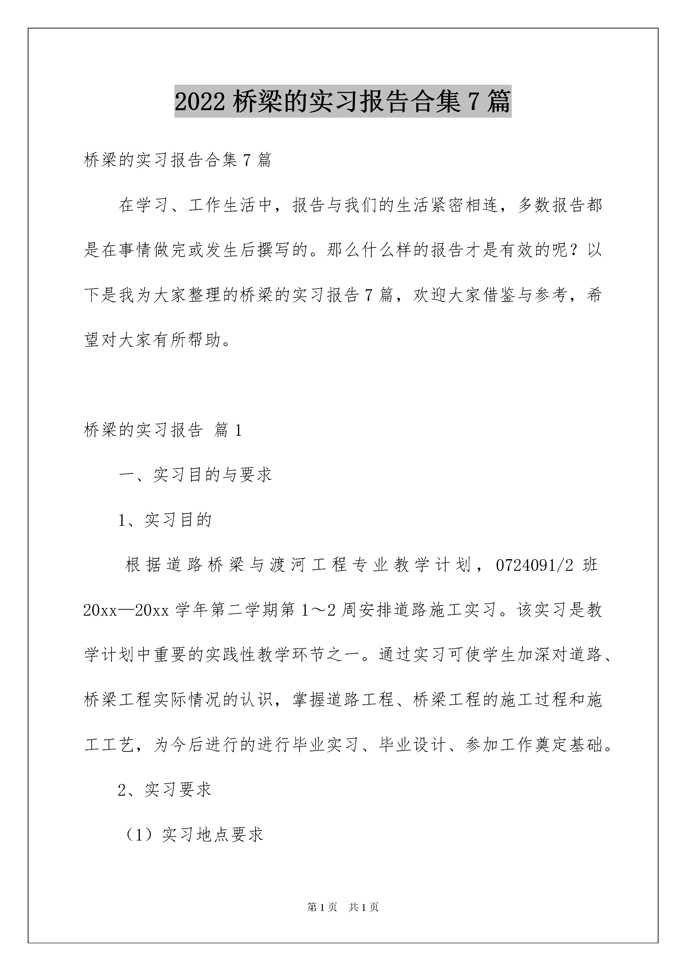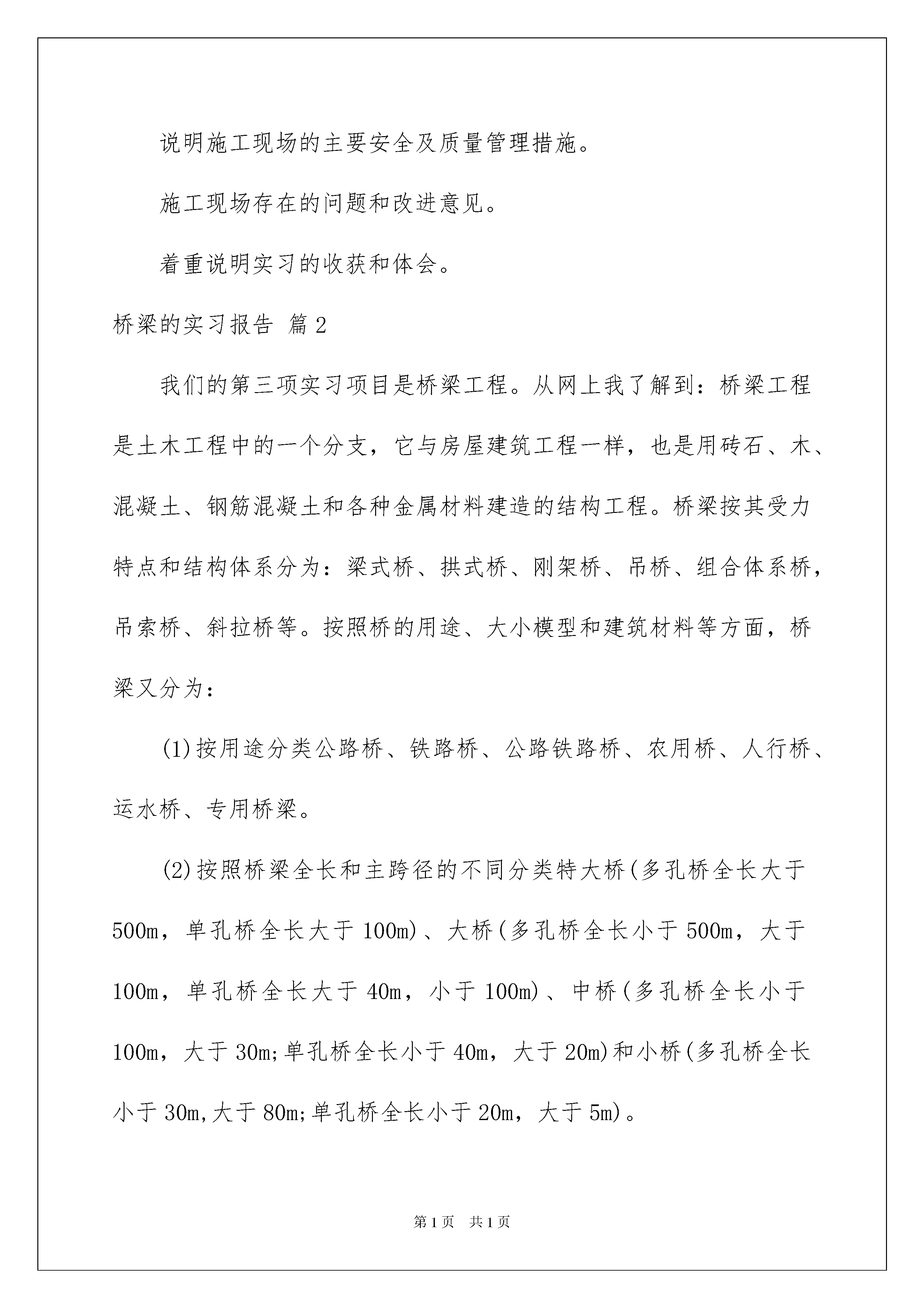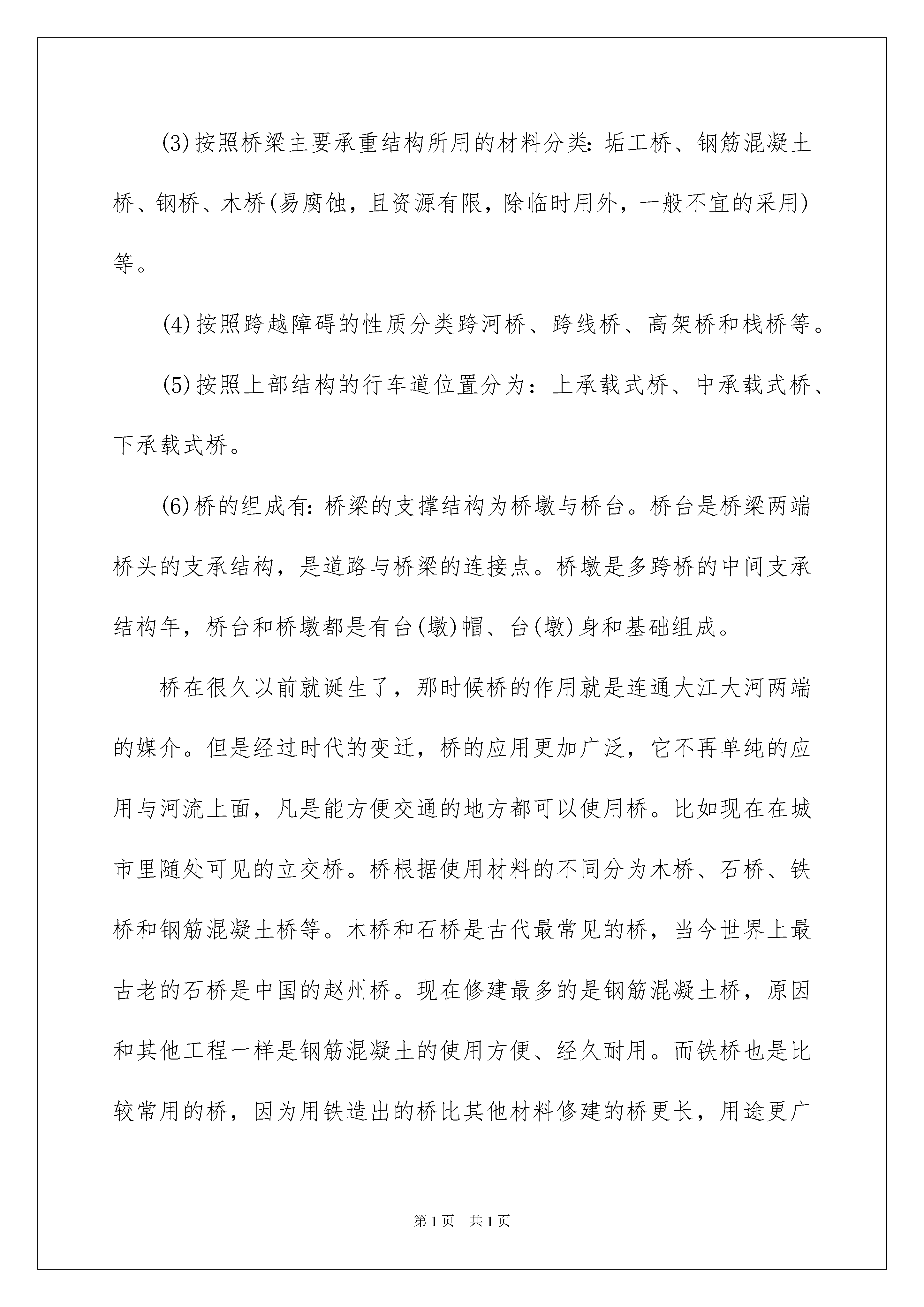 2022桥梁的实习报告合集7篇桥梁的实习报告合集7篇在学习、工作生活中,报告与我们的生活紧密相连,多数报告都是在事情做完或发生后撰写的。那么什么样的报告才是有效的呢?以下是我为大家整理的桥梁的实习报告7篇,欢迎大家借鉴与参考,希望对大家有所帮助。桥梁的实习报告篇1一、实习目的与要求1、实习目的根据道路桥梁与渡河工程专业教学计划,0724091/2班20xx—20xx学年第二学期第1~2周安排道路施工实习。该实习是教学计划中重要的实践性教学环节之一。通过实习可使学生加深对道路、桥梁工程实际情况的认识,掌握道路工程、桥梁工程的施工过程和施工工艺,为今后进行的进行毕业实习、毕业设计、参加工作奠定基础。2、实习要求(1)实习地点要求实习地点的选择是学生完成实习任务的重要条件之一,是顺利开展实习工作的前提。因此学生必须把这项工作当做大事来做。①按实习大纲要求选择确定实习单位和实习项目。②选择实习项目时应注意工程进度的情况,尽可能地选择在工程进度处于路基开挖、路基压实、路面摊铺压实等,尽可能地选择在工程进度处于施工的高峰期。③选择的工程项目必须是一个大、中型道路桥梁施工企业(可选用高速公路、一级、二级公路或城市主干道)。④其余学生由教师组织在平顶山路桥工地集中实习。(2)其他要求实习成果报告是学生对实习工作的全面总结、综合反映了学生在实习中掌握生产实践知识的广度和深度及对工程实际问题的分析、归纳、创新的能力,也是综合评定实习的主要依据。实习成果报告由实习日志、实习总结报告、项目施工组织设计、专题调研报告等组成,撰写整理时应满足以下要求:①实习日志从实习的第一天开始直到实习结束的最后一天为止,逐日记录,不得间断、后补。实习第一篇日志必须详细记录实习动员会的内容及接受安全教育(包括学校及工地的安全教育)的情况。记录见闻和劳动情况,出现的问题和收获体会,摘抄必要技术资料,生产会议记录及施工关键部位建筑结构的处理方法,工程质量要求等其它记录。重点记录自己每天亲手做了哪些工作,如何做的,过程要详细,内容要丰富、做到图文并茂(除文字外,还须有必要的插图或表格)。应注明日期、气象、字迹工整、文字简炼、条目分明、图表清楚(不得徒手画),不能记成流水帐,要区别于生活日记。不得抄袭施工技术人员施工日志和无内容实习日志(如:今天下雨,停工)实习日志为原始资料,不得重新抄写。②实习总结报告(不得少于3000字,可以附相关照片)实习总结报告是全面反映学生实习情况和收获体会的综合,学生应认真思考,根据自己在实习中的主要内容,深刻而精炼地描述生产实习的成果,报告内容与要求如下:介绍工程概况、施工现场平面图绘制;说明现场采用的主要设备、材料、技术、工艺。说明施工现场的主要安全及质量管理措施。施工现场存在的问题和改进意见。着重说明实习的收获和体会。桥梁的实习报告篇2我们的第三项实习项目是桥梁工程。从网上我了解到:桥梁工程是土木工程中的一个分支,它与房屋建筑工程一样,也是用砖石、木、混凝土、钢筋混凝土和各种金属材料建造的结构工程。桥梁按其受力特点和结构体系分为:梁式桥、拱式桥、刚架桥、吊桥、组合体系桥,吊索桥、斜拉桥等。按照桥的用途、大小模型和建筑材料等方面,桥梁又分为:(1)按用途分类公路桥、铁路桥、公路铁路桥、农用桥、人行桥、运水桥、专用桥梁。(2)按照桥梁全长和主跨径的不同分类特大桥(多孔桥全长大于500m,单孔桥全长大于100m)、大桥(多孔桥全长小于500m,大于100m,单孔桥全长大于40m,小于100m)、中桥(多孔桥全长小于100m,大于30m;单孔桥全长小于40m,大于20m)和小桥(多孔桥全长小于30m,大于80m;单孔桥全长小于20m,大于5m)。(3)按照桥梁主要承重结构所用的材料分类:垢工桥、钢筋混凝土桥、钢桥、木桥(易腐蚀,且资源有限,除临时用外,一般不宜的采用)等。(4)按照跨越障碍的性质分类跨河桥、跨线桥、高架桥和栈桥等。(5)按照上部结构的行车道位置分为:上承载式桥、中承载式桥、下承载式桥。(6)桥的组成有:桥梁的支撑结构为桥墩与桥台。桥台是桥梁两端桥头的支承结构,是道路与桥梁的连接点。桥墩是多跨桥的中间支承结构年,桥台和桥墩都是有台(墩)帽、台(墩)身和基础组成。桥在很久以前就诞生了,那时候桥的作用就是连通大江大河两端的媒介。但是经过时代的变迁,桥的应用更加广泛,它不再单纯的应用与河流上面,凡是能方便交通的地方都可以使用桥。比如现在在城市里随处可见的立交桥。桥根据使用材料的不同分为木桥、石桥、铁桥和钢筋混凝土桥等。木桥和石桥是古代最常见的桥,当今世界上最古老的石桥是中国的赵州桥。现在