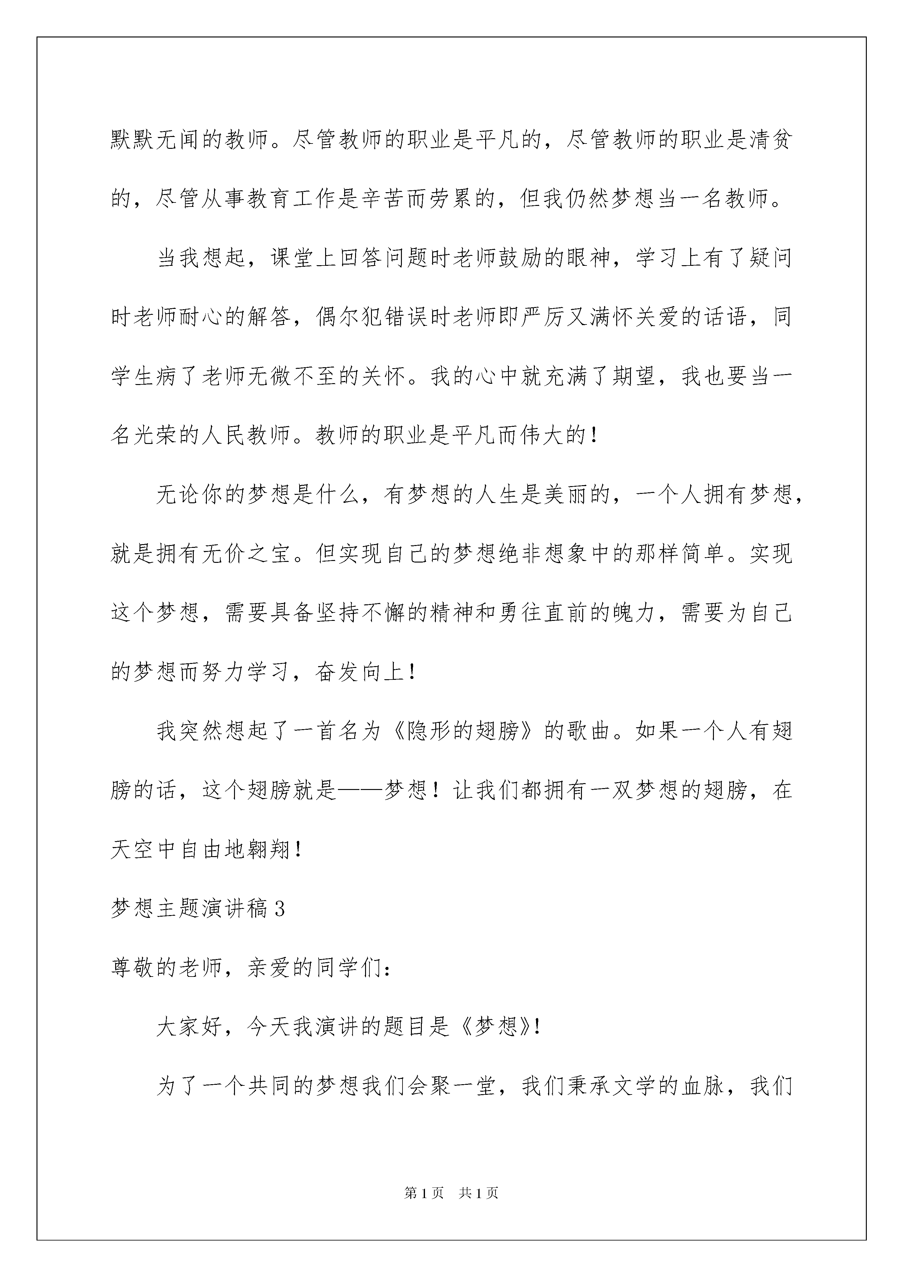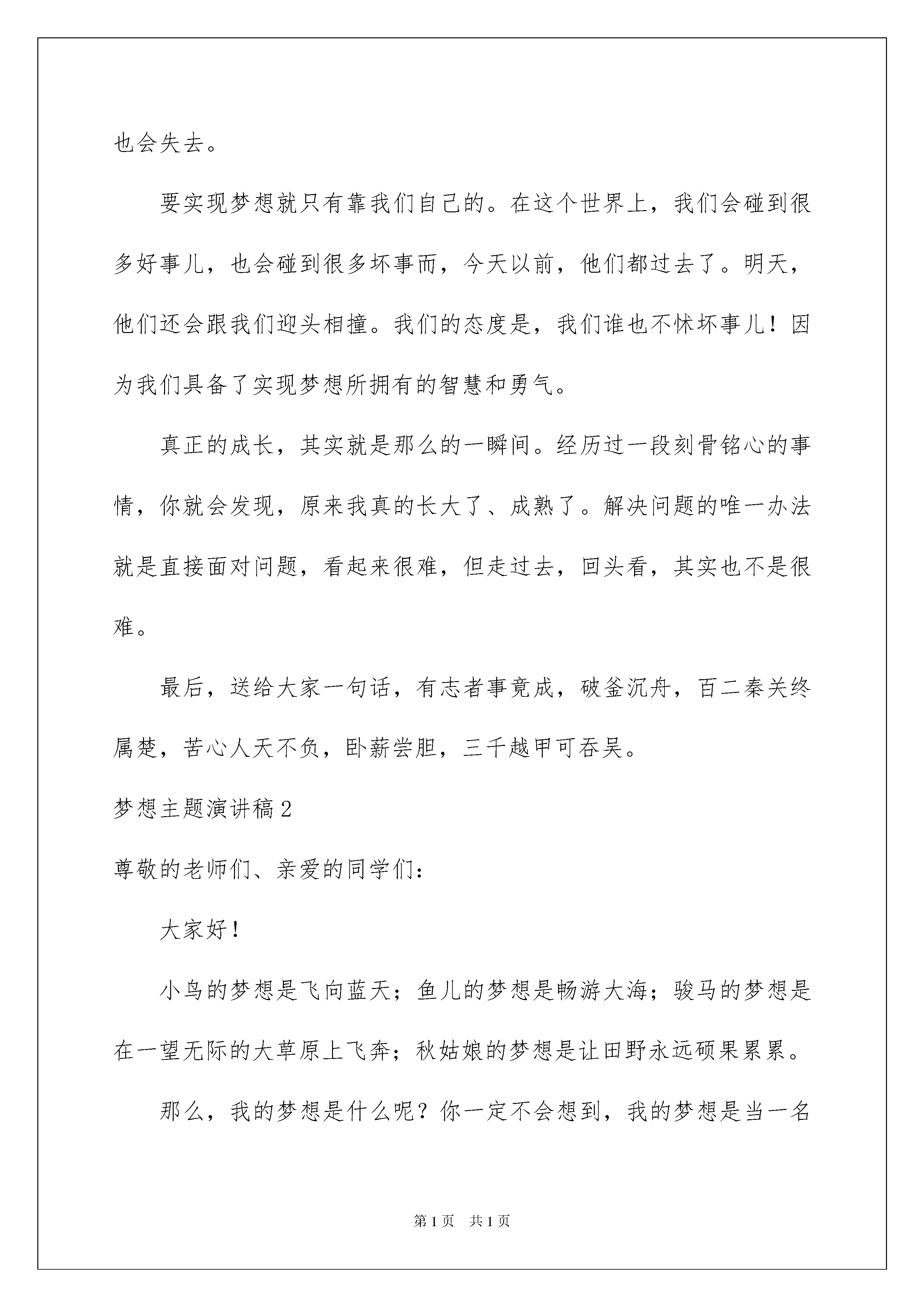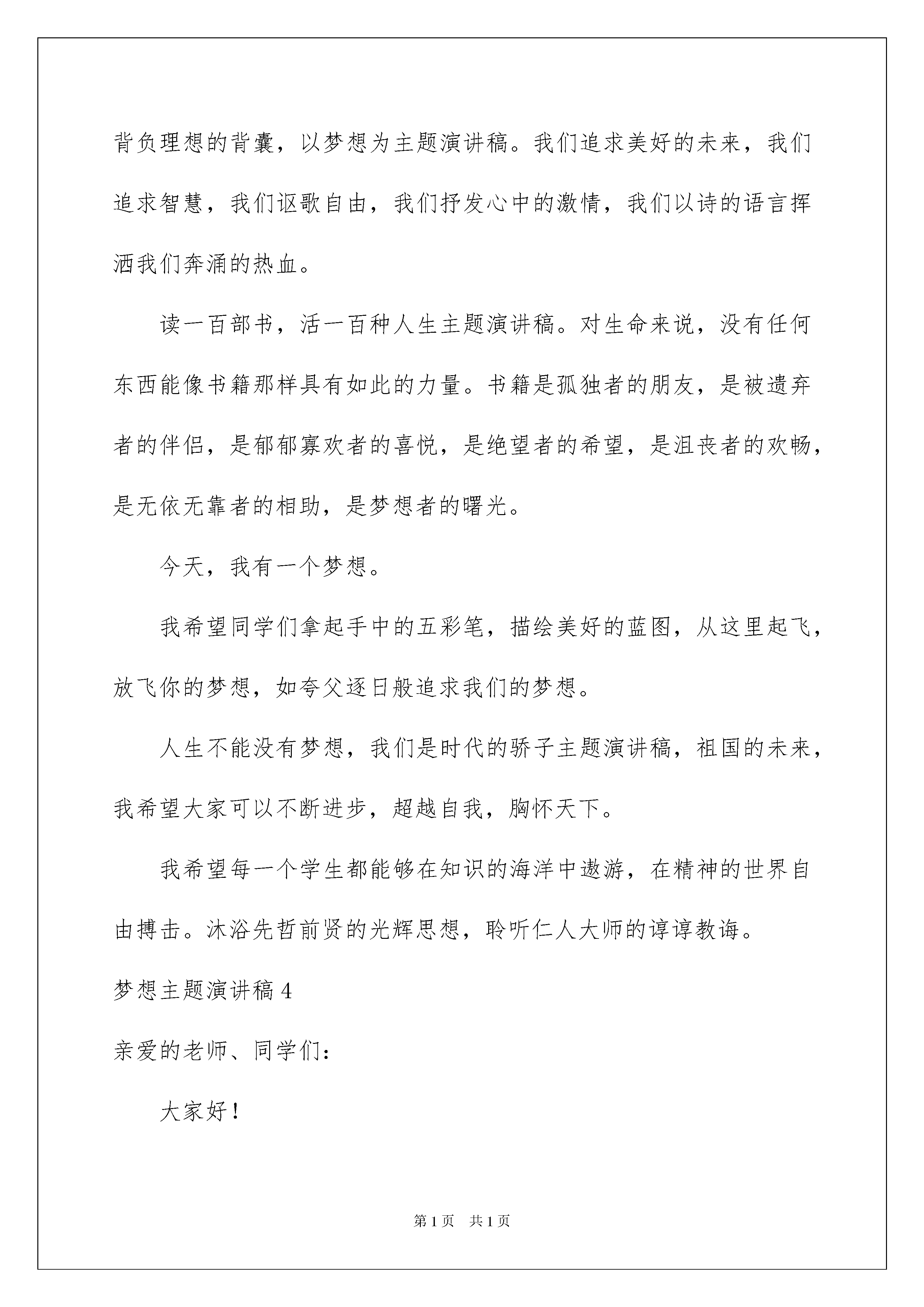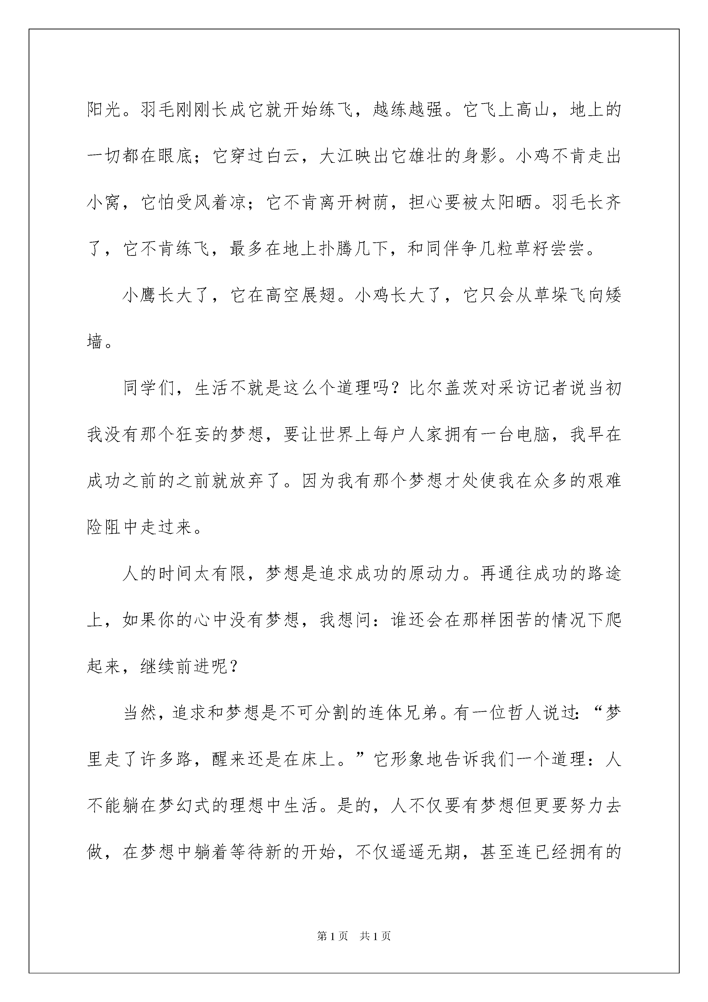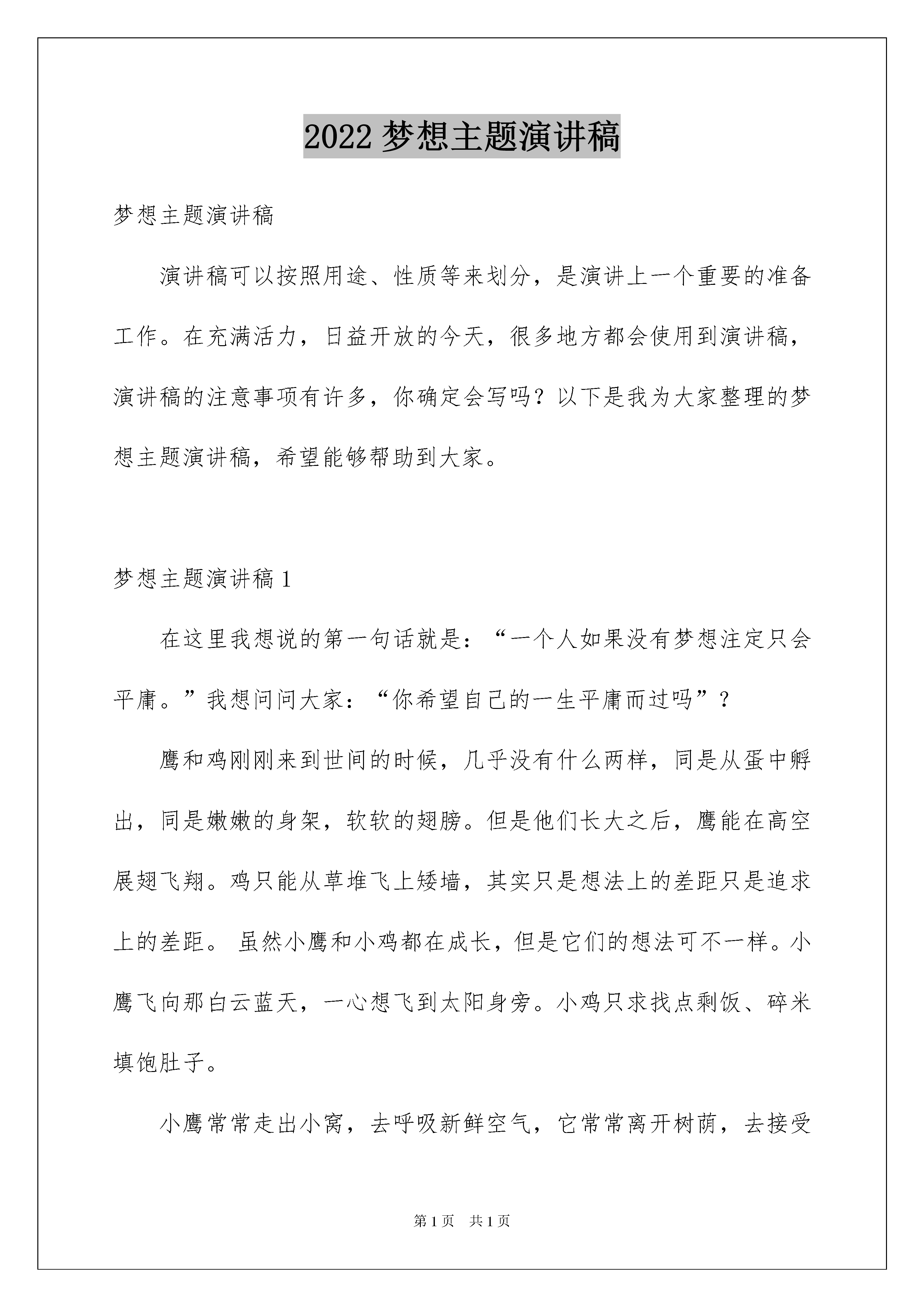 2022梦想主题演讲稿梦想主题演讲稿演讲稿可以按照用途、性质等来划分,是演讲上一个重要的准备工作。在充满活力,日益开放的今天,很多地方都会使用到演讲稿,演讲稿的注意事项有许多,你确定会写吗?以下是我为大家整理的梦想主题演讲稿,希望能够帮助到大家。梦想主题演讲稿1在这里我想说的第一句话就是:“一个人如果没有梦想注定只会平庸。”我想问问大家:“你希望自己的一生平庸而过吗”?鹰和鸡刚刚来到世间的时候,几乎没有什么两样,同是从蛋中孵出,同是嫩嫩的身架,软软的翅膀。但是他们长大之后,鹰能在高空展翅飞翔。鸡只能从草堆飞上矮墙,其实只是想法上的差距只是追求上的差距。虽然小鹰和小鸡都在成长,但是它们的想法可不一样。小鹰飞向那白云蓝天,一心想飞到太阳身旁。小鸡只求找点剩饭、碎米填饱肚子。小鹰常常走出小窝,去呼吸新鲜空气,它常常离开树荫,去接受阳光。羽毛刚刚长成它就开始练飞,越练越强。它飞上高山,地上的一切都在眼底;它穿过白云,大江映出它雄壮的身影。小鸡不肯走出小窝,它怕受风着凉;它不肯离开树荫,担心要被太阳晒。羽毛长齐了,它不肯练飞,最多在地上扑腾几下,和同伴争几粒草籽尝尝。小鹰长大了,它在高空展翅。小鸡长大了,它只会从草垛飞向矮墙。同学们,生活不就是这么个道理吗?比尔盖茨对采访记者说当初我没有那个狂妄的梦想,要让世界上每户人家拥有一台电脑,我早在成功之前的之前就放弃了。因为我有那个梦想才处使我在众多的艰难险阻中走过来。人的时间太有限,梦想是追求成功的原动力。再通往成功的路途上,如果你的心中没有梦想,我想问:谁还会在那样困苦的情况下爬起来,继续前进呢?当然,追求和梦想是不可分割的连体兄弟。有一位哲人说过:“梦里走了许多路,醒来还是在床上。”它形象地告诉我们一个道理:人不能躺在梦幻式的理想中生活。是的,人不仅要有梦想但更要努力去做,在梦想中躺着等待新的开始,不仅遥遥无期,甚至连已经拥有的也会失去。要实现梦想就只有靠我们自己的。在这个世界上,我们会碰到很多好事儿,也会碰到很多坏事而,今天以前,他们都过去了。明天,他们还会跟我们迎头相撞。我们的态度是,我们谁也不怵坏事儿!因为我们具备了实现梦想所拥有的智慧和勇气。真正的成长,其实就是那么的一瞬间。经历过一段刻骨铭心的事情,你就会发现,原来我真的长大了、成熟了。解决问题的唯一办法就是直接面对问题,看起来很难,但走过去,回头看,其实也不是很难。最后,送给大家一句话,有志者事竟成,破釜沉舟,百二秦关终属楚,苦心人天不负,卧薪尝胆,三千越甲可吞吴。梦想主题演讲稿2尊敬的老师们、亲爱的同学们:大家好!小鸟的梦想是飞向蓝天;鱼儿的梦想是畅游大海;骏马的梦想是在一望无际的大草原上飞奔;秋姑娘的梦想是让田野永远硕果累累。那么,我的梦想是什么呢?你一定不会想到,我的梦想是当一名默默无闻的教师。尽管教师的职业是平凡的,尽管教师的职业是清贫的,尽管从事教育工作是辛苦而劳累的,但我仍然梦想当一名教师。当我想起,课堂上回答问题时老师鼓励的眼神,学习上有了疑问时老师耐心的解答,偶尔犯错误时老师即严厉又满怀关爱的话语,同学生病了老师无微不至的关怀。我的心中就充满了期望,我也要当一名光荣的人民教师。教师的职业是平凡而伟大的!无论你的梦想是什么,有梦想的人生是美丽的,一个人拥有梦想,就是拥有无价之宝。但实现自己的梦想绝非想象中的那样简单。实现这个梦想,需要具备坚持不懈的精神和勇往直前的魄力,需要为自己的梦想而努力学习,奋发向上!我突然想起了一首名为《隐形的翅膀》的歌曲。如果一个人有翅膀的话,这个翅膀就是——梦想!让我们都拥有一双梦想的翅膀,在天空中自由地翱翔!梦想主题演讲稿3尊敬的老师,亲爱的同学们:大家好,今天我演讲的题目是《梦想》!为了一个共同的梦想我们会聚一堂,我们秉承文学的血脉,我们背负理想的背囊,以梦想为主题演讲稿。我们追求美好的未来,我们追求智慧,我们讴歌自由,我们抒发心中的激情,我们以诗的语言挥洒我们奔涌的热血。读一百部书,活一百种人生主题演讲稿。对生命来说,没有任何东西能像书籍那样具有如此的力量。书籍是孤独者的朋友,是被遗弃者的伴侣,是郁郁寡欢者的喜悦,是绝望者的希望,是沮丧者的欢畅,是无依无靠者的相助,是梦想者的曙光。今天,我有一个梦想。我希望同学们拿起手中的五彩笔,描绘美好的蓝图,从这里起飞,放飞你的梦想,如夸父逐日般追求我们的梦想。人生不能没有梦想,我们是时代的骄子主题演讲稿,祖国的未来,我希望大家可以不断进步,超越自我,胸怀天下。我希望每一个学生都能够在知识的海洋中遨游,在精神的世界自由搏击。沐浴先哲前贤的光辉思想,聆听仁人大师的谆谆教诲。梦想主题演讲稿4