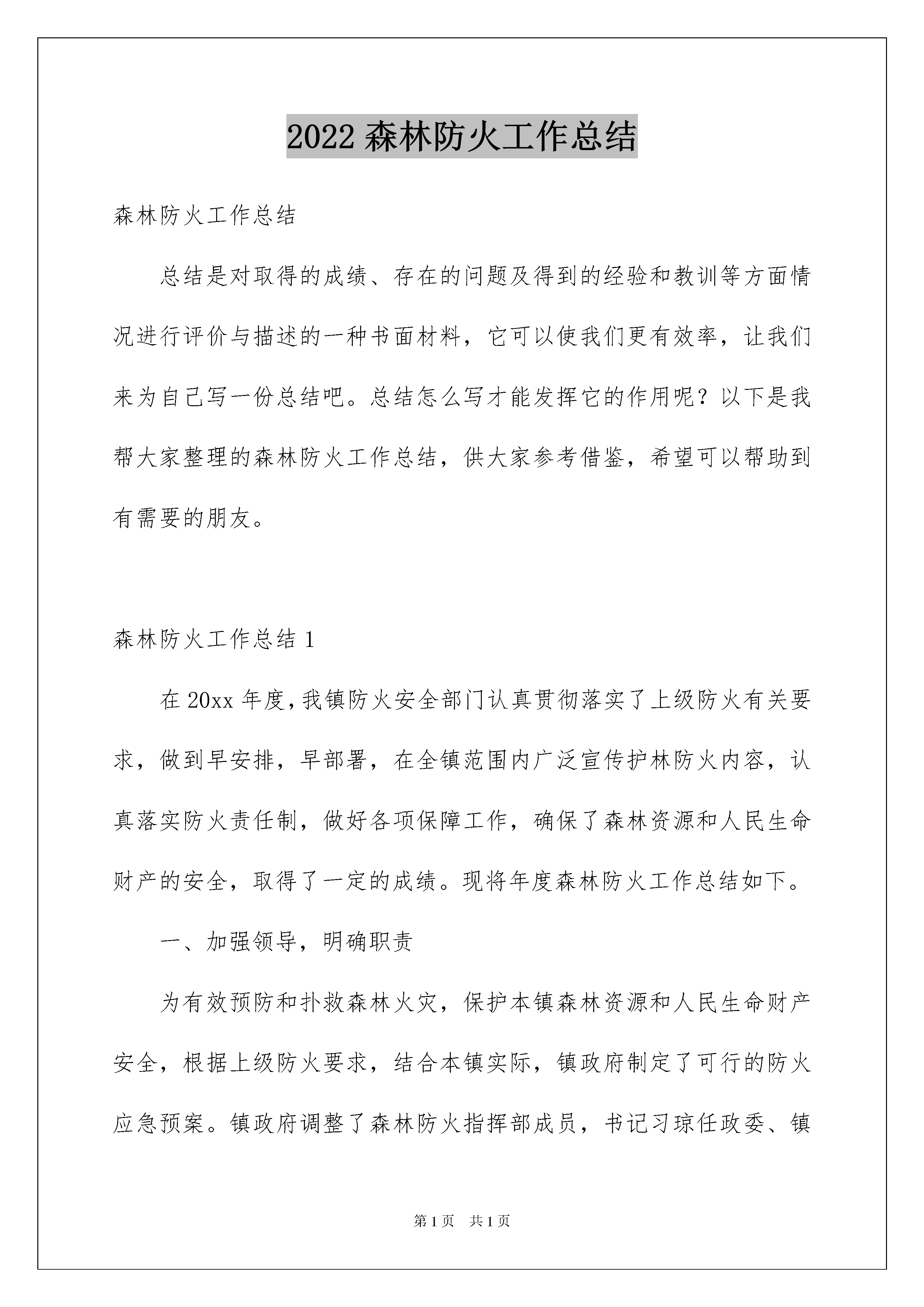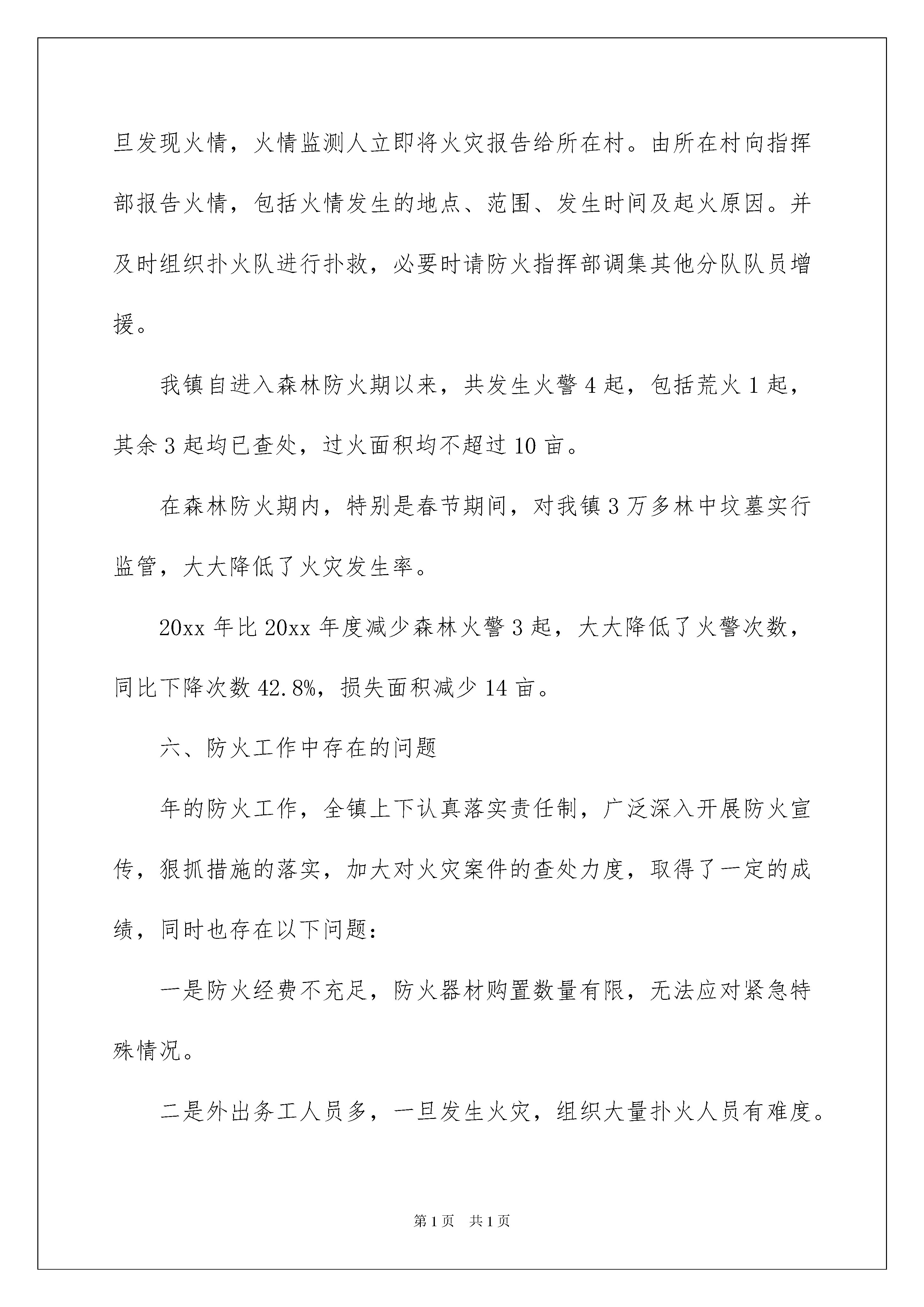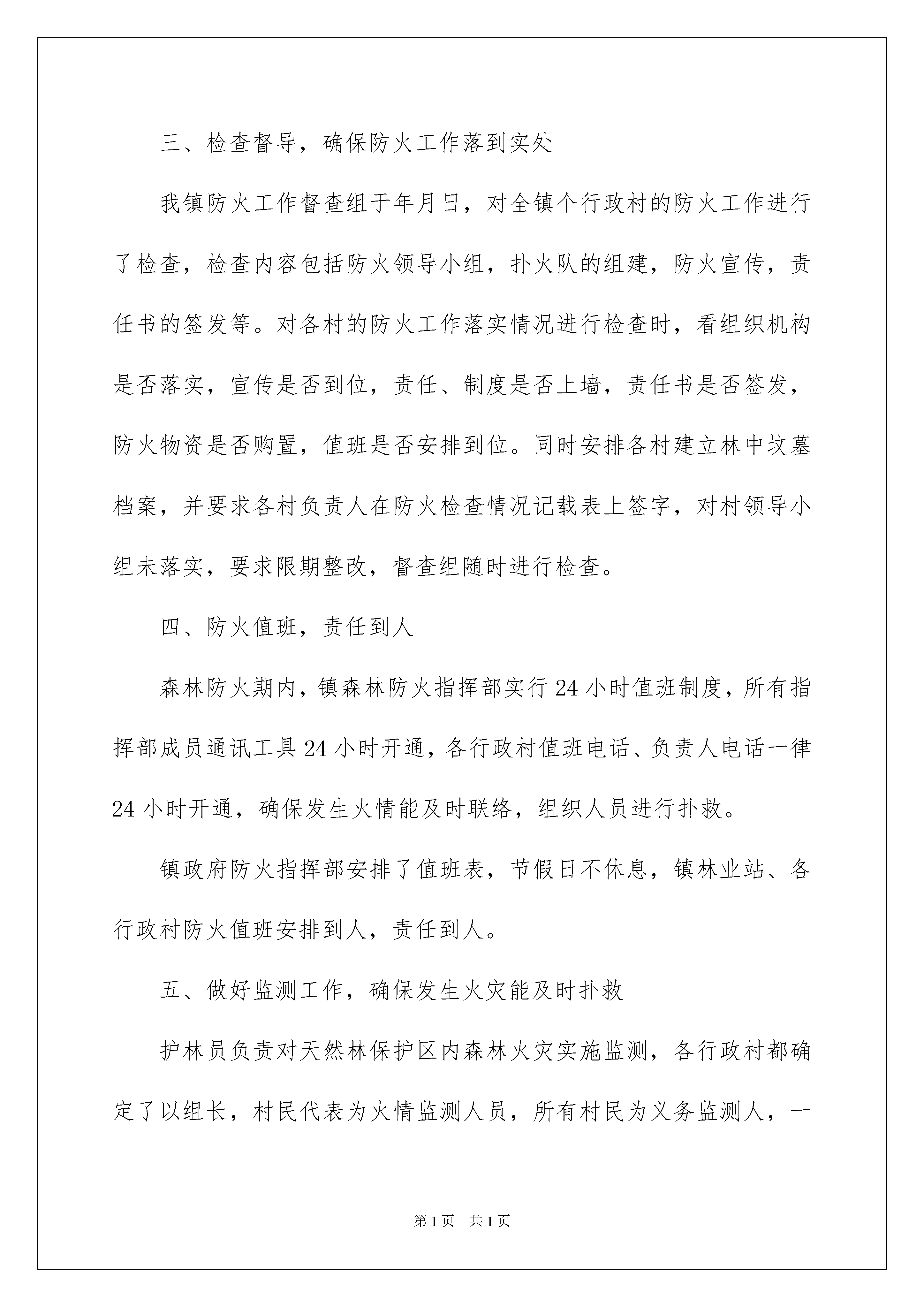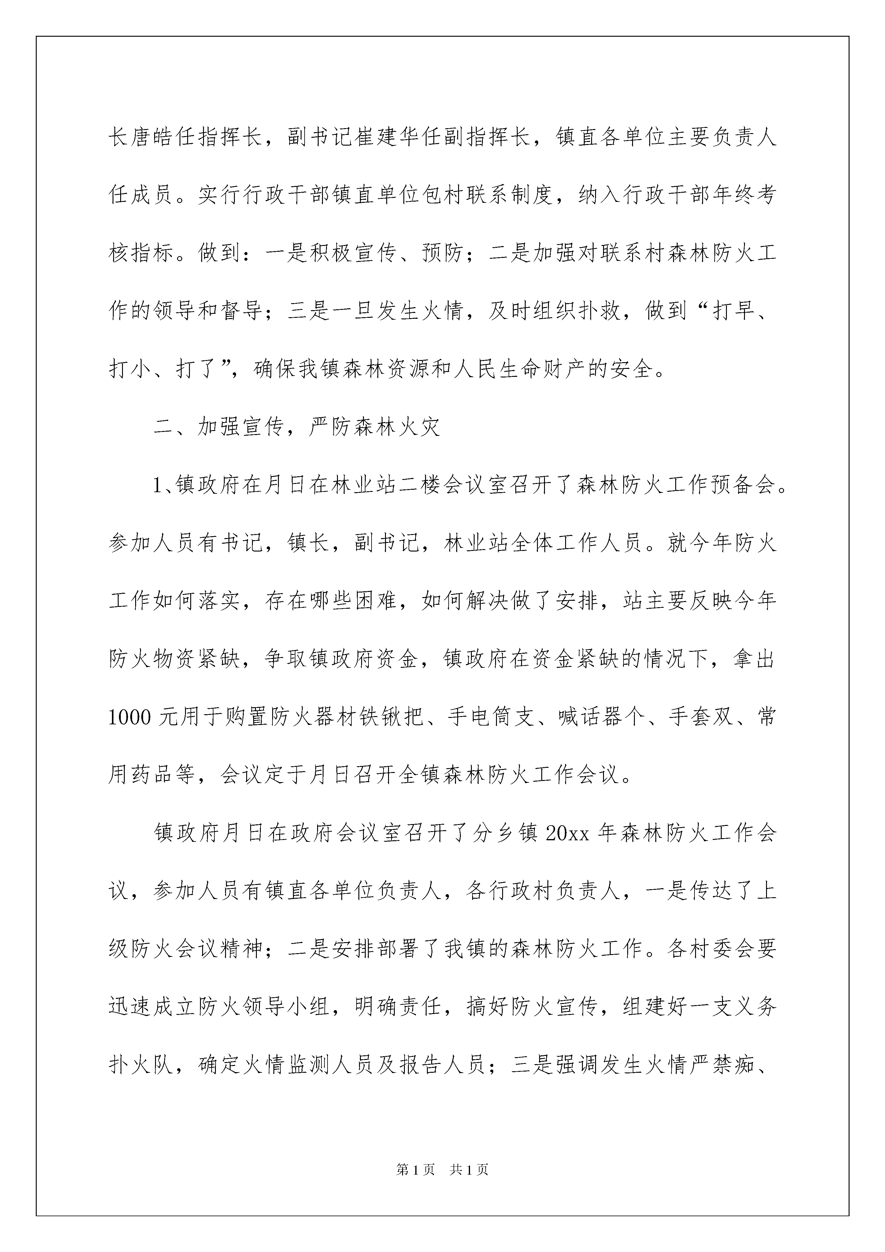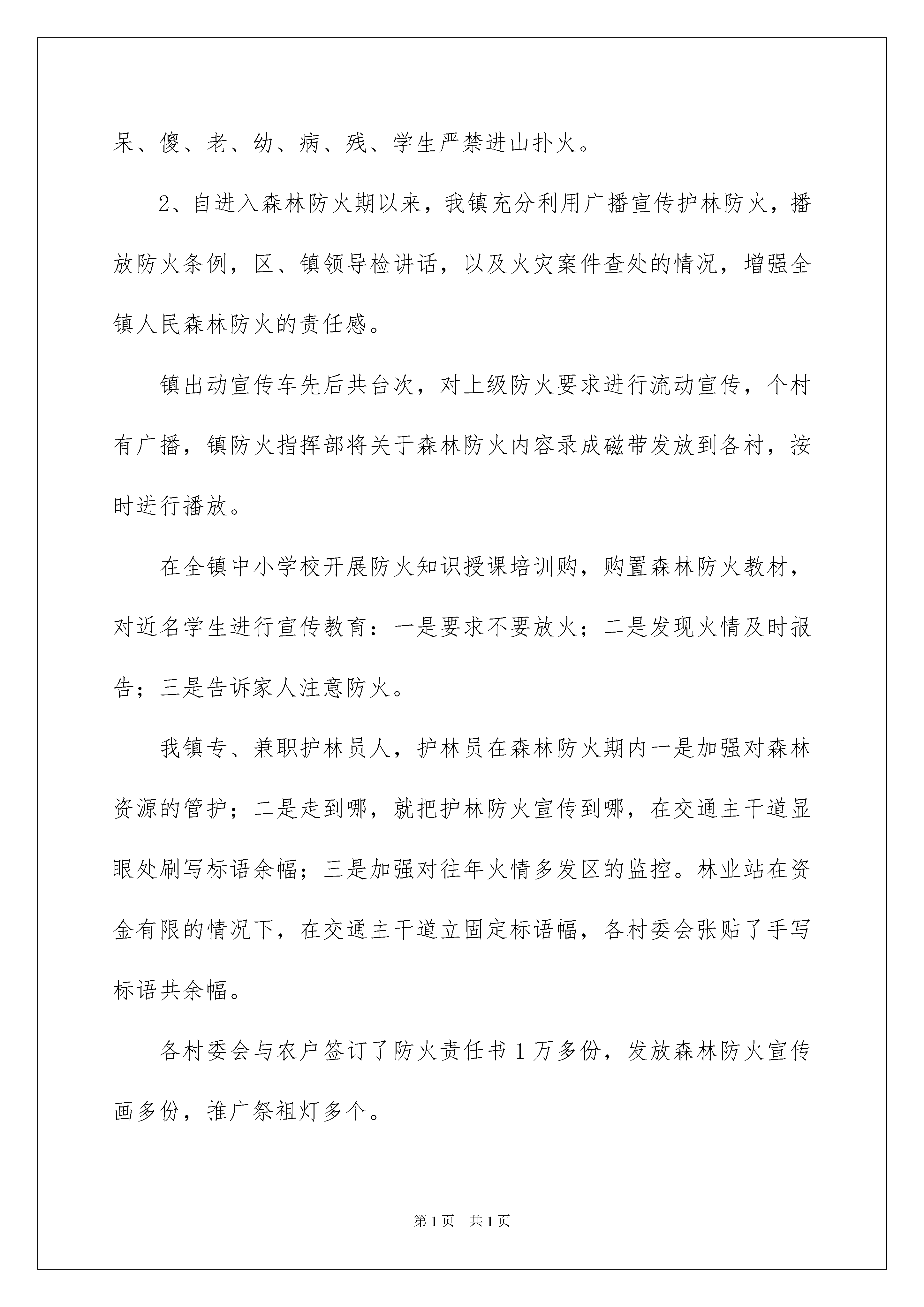 2022森林防火工作总结森林防火工作总结总结是对取得的成绩、存在的问题及得到的经验和教训等方面情况进行评价与描述的一种书面材料,它可以使我们更有效率,让我们来为自己写一份总结吧。总结怎么写才能发挥它的作用呢?以下是我帮大家整理的森林防火工作总结,供大家参考借鉴,希望可以帮助到有需要的朋友。森林防火工作总结1在20xx年度,我镇防火安全部门认真贯彻落实了上级防火有关要求,做到早安排,早部署,在全镇范围内广泛宣传护林防火内容,认真落实防火责任制,做好各项保障工作,确保了森林资源和人民生命财产的安全,取得了一定的成绩。现将年度森林防火工作总结如下。一、加强领导,明确职责为有效预防和扑救森林火灾,保护本镇森林资源和人民生命财产安全,根据上级防火要求,结合本镇实际,镇政府制定了可行的防火应急预案。镇政府调整了森林防火指挥部成员,书记习琼任政委、镇长唐皓任指挥长,副书记崔建华任副指挥长,镇直各单位主要负责人任成员。实行行政干部镇直单位包村联系制度,纳入行政干部年终考核指标。做到:一是积极宣传、预防;二是加强对联系村森林防火工作的领导和督导;三是一旦发生火情,及时组织扑救,做到“打早、打小、打了”,确保我镇森林资源和人民生命财产的安全。二、加强宣传,严防森林火灾1、镇政府在月日在林业站二楼会议室召开了森林防火工作预备会。参加人员有书记,镇长,副书记,林业站全体工作人员。就今年防火工作如何落实,存在哪些困难,如何解决做了安排,站主要反映今年防火物资紧缺,争取镇政府资金,镇政府在资金紧缺的情况下,拿出1000元用于购置防火器材铁锹把、手电筒支、喊话器个、手套双、常用药品等,会议定于月日召开全镇森林防火工作会议。镇政府月日在政府会议室召开了分乡镇20xx年森林防火工作会议,参加人员有镇直各单位负责人,各行政村负责人,一是传达了上级防火会议精神;二是安排部署了我镇的森林防火工作。各村委会要迅速成立防火领导小组,明确责任,搞好防火宣传,组建好一支义务扑火队,确定火情监测人员及报告人员;三是强调发生火情严禁痴、呆、傻、老、幼、病、残、学生严禁进山扑火。2、自进入森林防火期以来,我镇充分利用广播宣传护林防火,播放防火条例,区、镇领导检讲话,以及火灾案件查处的情况,增强全镇人民森林防火的责任感。镇出动宣传车先后共台次,对上级防火要求进行流动宣传,个村有广播,镇防火指挥部将关于森林防火内容录成磁带发放到各村,按时进行播放。在全镇中小学校开展防火知识授课培训购,购置森林防火教材,对近名学生进行宣传教育:一是要求不要放火;二是发现火情及时报告;三是告诉家人注意防火。我镇专、兼职护林员人,护林员在森林防火期内一是加强对森林资源的管护;二是走到哪,就把护林防火宣传到哪,在交通主干道显眼处刷写标语余幅;三是加强对往年火情多发区的监控。林业站在资金有限的情况下,在交通主干道立固定标语幅,各村委会张贴了手写标语共余幅。各村委会与农户签订了防火责任书1万多份,发放森林防火宣传画多份,推广祭祖灯多个。三、检查督导,确保防火工作落到实处我镇防火工作督查组于年月日,对全镇个行政村的防火工作进行了检查,检查内容包括防火领导小组,扑火队的组建,防火宣传,责任书的签发等。对各村的防火工作落实情况进行检查时,看组织机构是否落实,宣传是否到位,责任、制度是否上墙,责任书是否签发,防火物资是否购置,值班是否安排到位。同时安排各村建立林中坟墓档案,并要求各村负责人在防火检查情况记载表上签字,对村领导小组未落实,要求限期整改,督查组随时进行检查。四、防火值班,责任到人森林防火期内,镇森林防火指挥部实行24小时值班制度,所有指挥部成员通讯工具24小时开通,各行政村值班电话、负责人电话一律24小时开通,确保发生火情能及时联络,组织人员进行扑救。镇政府防火指挥部安排了值班表,节假日不休息,镇林业站、各行政村防火值班安排到人,责任到人。五、做好监测工作,确保发生火灾能及时扑救护林员负责对天然林保护区内森林火灾实施监测,各行政村都确定了以组长,村民代表为火情监测人员,所有村民为义务监测人,一旦发现火情,火情监测人立即将火灾报告给所在村。由所在村向指挥部报告火情,包括火情发生的地点、范围、发生时间及起火原因。并及时组织扑火队进行扑救,必要时请防火指挥部调集其他分队队员增援。我镇自进入森林防火期以来,共发生火警4起,包括荒火1起,其余3起均已查处,过火面积均不超过10亩。在森林防火期内,特别是春节期间,对我镇3万多林中坟墓实行监管,大大降低了火灾发生率。20xx年比20xx年度减少森林火警3起,大大降低了火警次数,同比下降次数42.8%,损失面积减少14