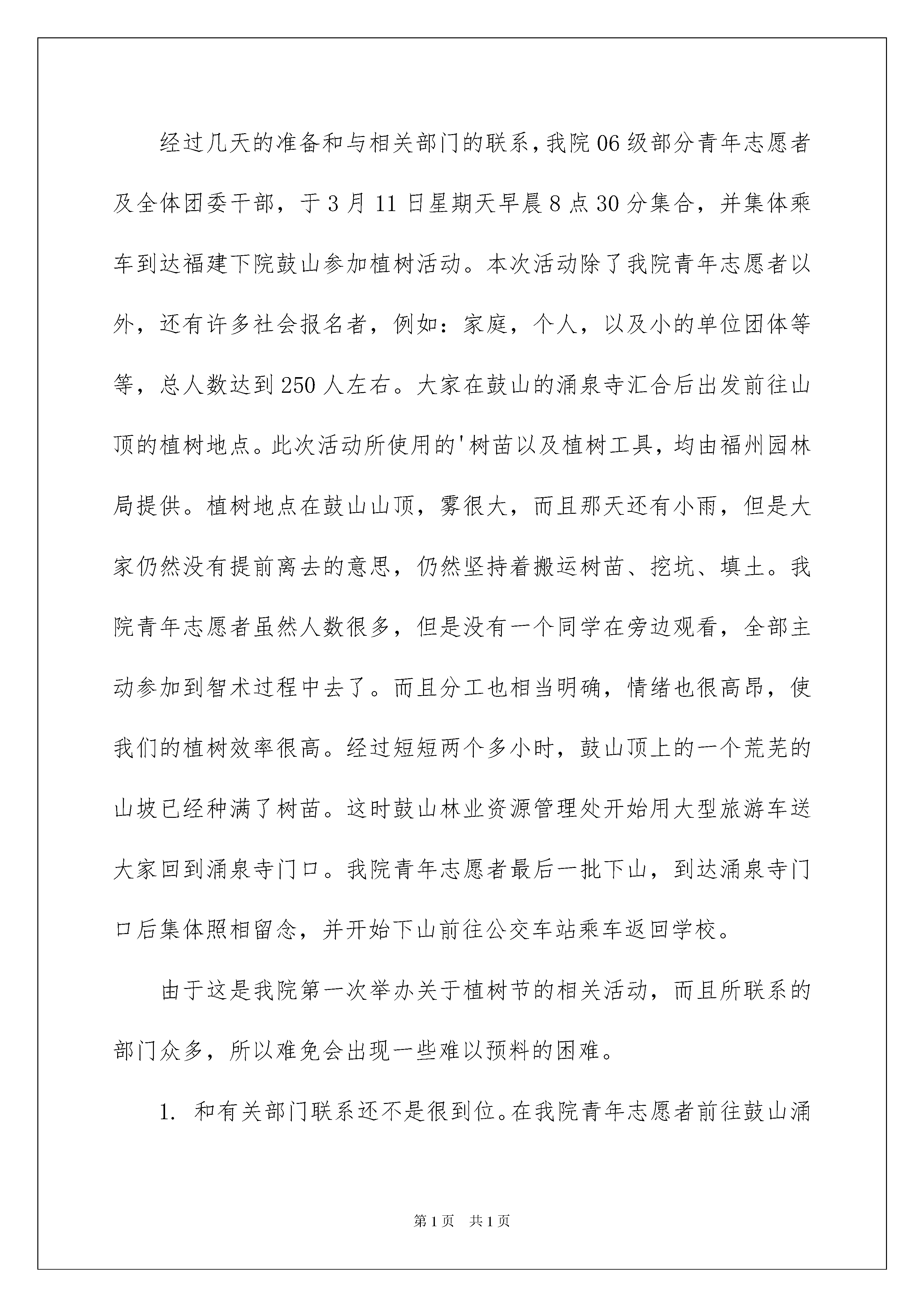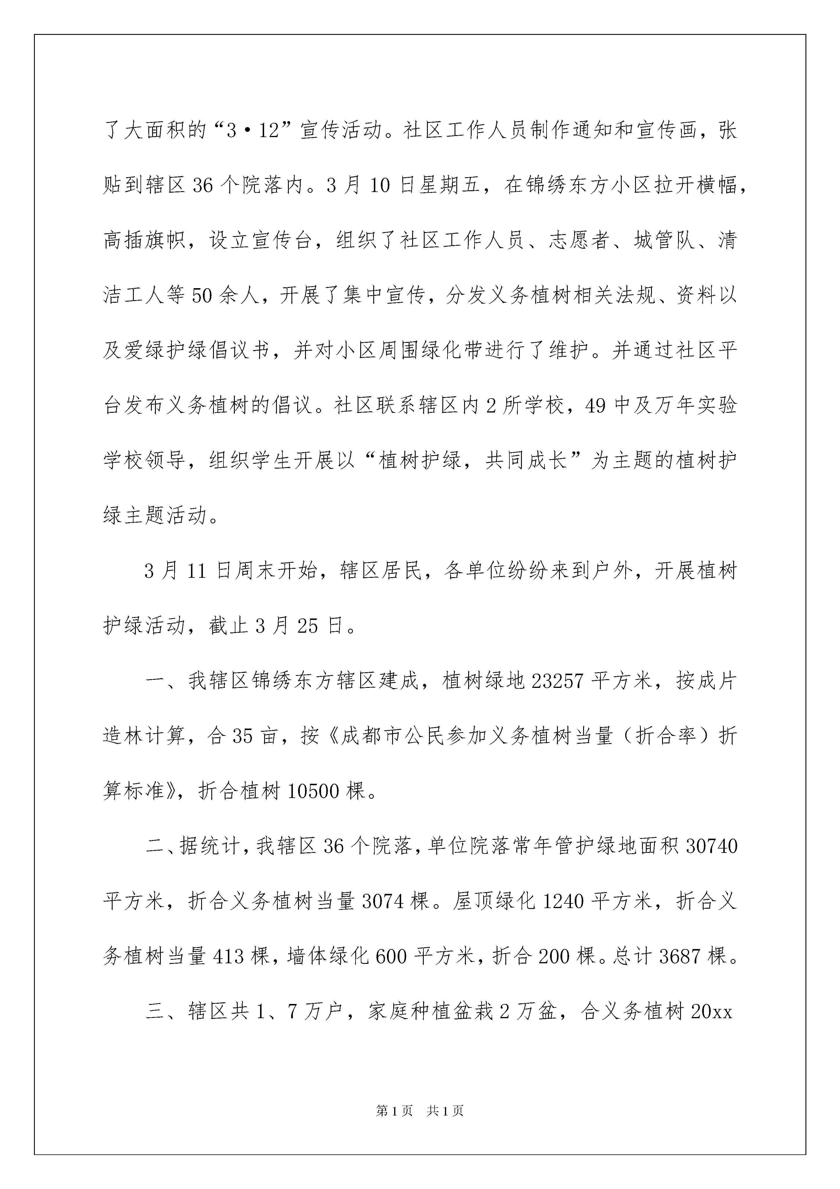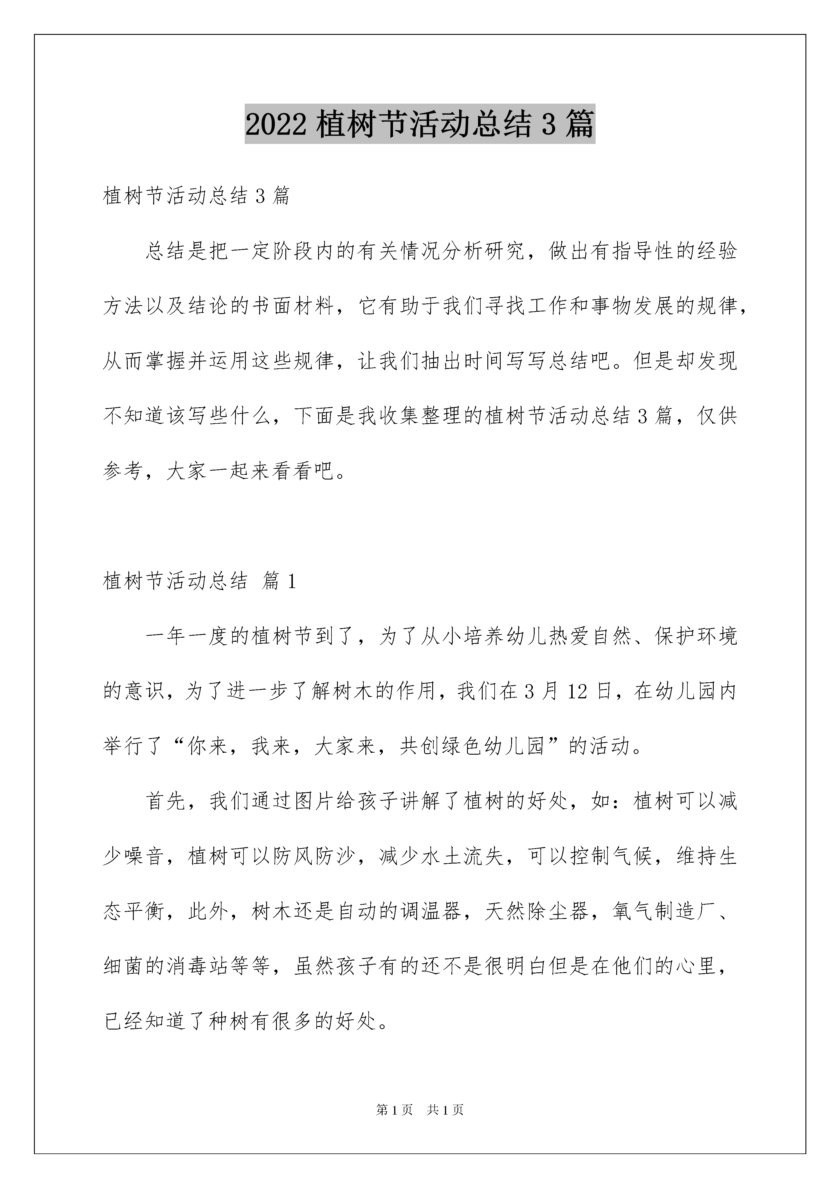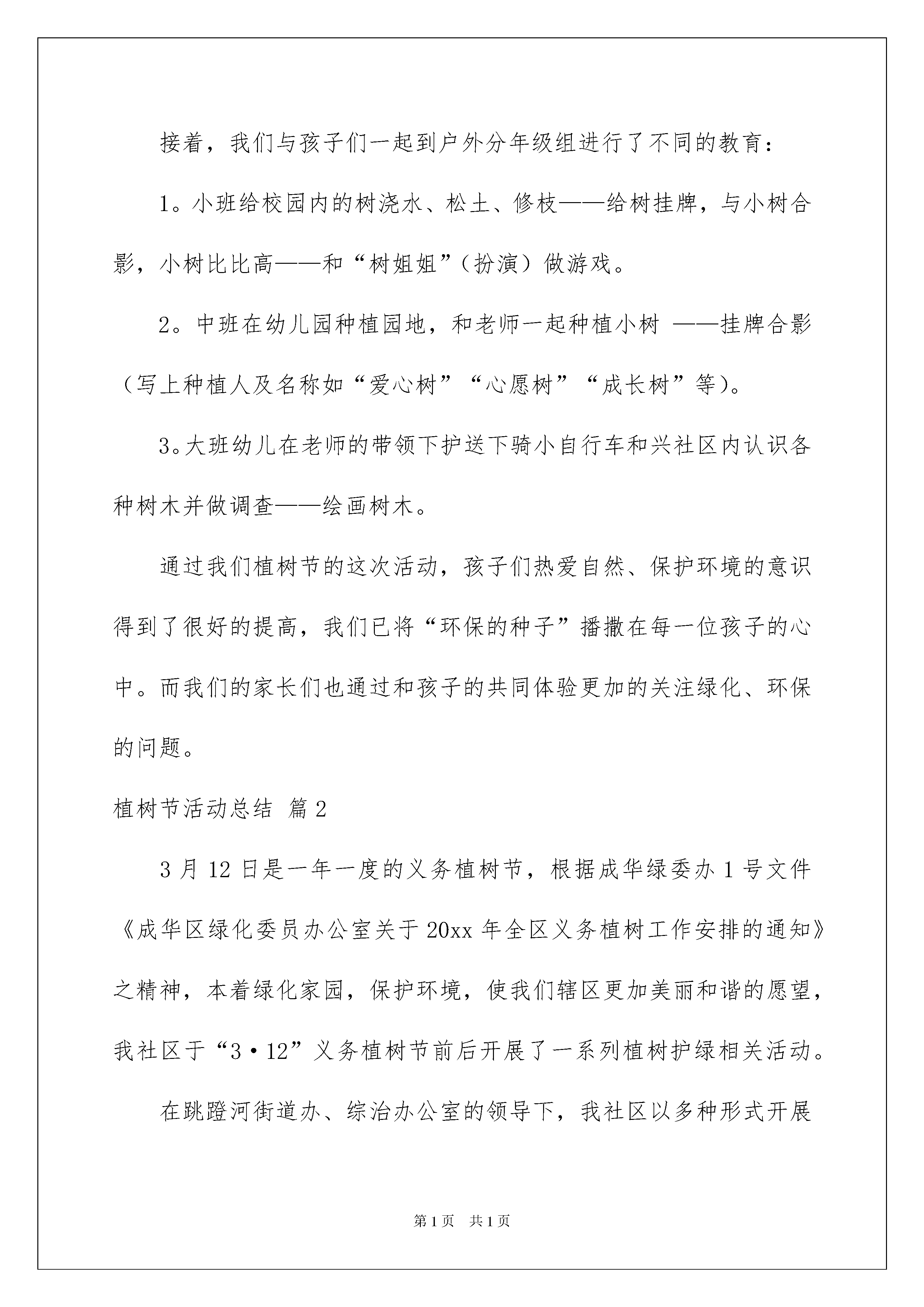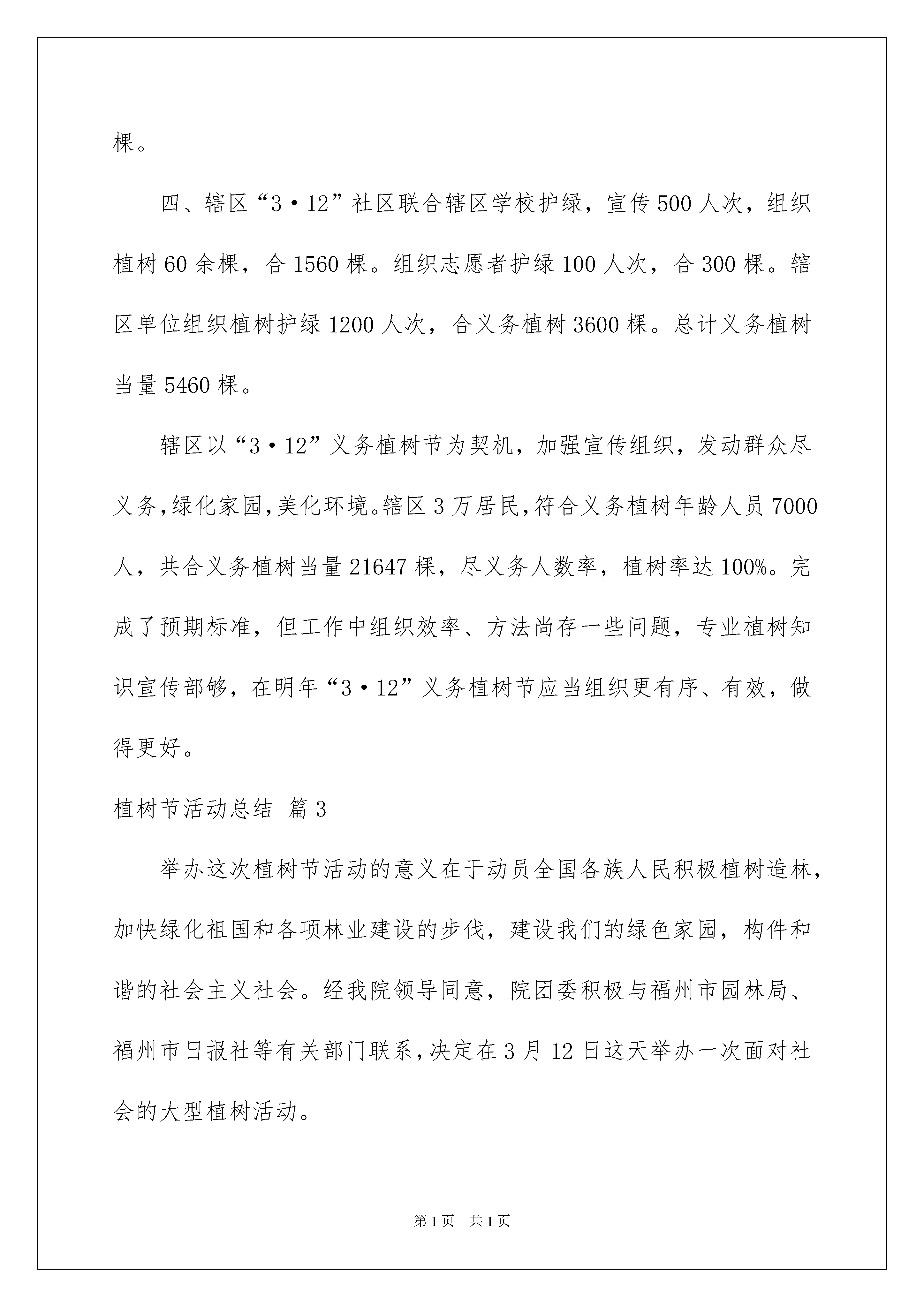 2022植树节活动总结3篇植树节活动总结3篇总结是把一定阶段内的有关情况分析研究,做出有指导性的经验方法以及结论的书面材料,它有助于我们寻找工作和事物发展的规律,从而掌握并运用这些规律,让我们抽出时间写写总结吧。但是却发现不知道该写些什么,下面是我收集整理的植树节活动总结3篇,仅供参考,大家一起来看看吧。植树节活动总结篇1一年一度的植树节到了,为了从小培养幼儿热爱自然、保护环境的意识,为了进一步了解树木的作用,我们在3月12日,在幼儿园内举行了“你来,我来,大家来,共创绿色幼儿园”的活动。首先,我们通过图片给孩子讲解了植树的好处,如:植树可以减少噪音,植树可以防风防沙,减少水土流失,可以控制气候,维持生态平衡,此外,树木还是自动的调温器,天然除尘器,氧气制造厂、细菌的消毒站等等,虽然孩子有的还不是很明白但是在他们的心里,已经知道了种树有很多的好处。接着,我们与孩子们一起到户外分年级组进行了不同的教育:1。小班给校园内的树浇水、松土、修枝——给树挂牌,与小树合影,小树比比高——和“树姐姐”(扮演)做游戏。2。中班在幼儿园种植园地,和老师一起种植小树——挂牌合影(写上种植人及名称如“爱心树”“心愿树”“成长树”等)。3。大班幼儿在老师的带领下护送下骑小自行车和兴社区内认识各种树木并做调查——绘画树木。通过我们植树节的这次活动,孩子们热爱自然、保护环境的意识得到了很好的提高,我们已将“环保的种子”播撒在每一位孩子的心中。而我们的家长们也通过和孩子的共同体验更加的关注绿化、环保的问题。植树节活动总结篇23月12日是一年一度的义务植树节,根据成华绿委办1号文件《成华区绿化委员办公室关于20xx年全区义务植树工作安排的通知》之精神,本着绿化家园,保护环境,使我们辖区更加美丽和谐的愿望,我社区于“3·12”义务植树节前后开展了一系列植树护绿相关活动。在跳蹬河街道办、综治办公室的领导下,我社区以多种形式开展了大面积的“3·12”宣传活动。社区工作人员制作通知和宣传画,张贴到辖区36个院落内。3月10日星期五,在锦绣东方小区拉开横幅,高插旗帜,设立宣传台,组织了社区工作人员、志愿者、城管队、清洁工人等50余人,开展了集中宣传,分发义务植树相关法规、资料以及爱绿护绿倡议书,并对小区周围绿化带进行了维护。并通过社区平台发布义务植树的倡议。社区联系辖区内2所学校,49中及万年实验学校领导,组织学生开展以“植树护绿,共同成长”为主题的植树护绿主题活动。3月11日周末开始,辖区居民,各单位纷纷来到户外,开展植树护绿活动,截止3月25日。一、我辖区锦绣东方辖区建成,植树绿地23257平方米,按成片造林计算,合35亩,按《成都市公民参加义务植树当量(折合率)折算标准》,折合植树10500棵。二、据统计,我辖区36个院落,单位院落常年管护绿地面积30740平方米,折合义务植树当量3074棵。屋顶绿化1240平方米,折合义务植树当量413棵,墙体绿化600平方米,折合200棵。总计3687棵。三、辖区共1、7万户,家庭种植盆栽2万盆,合义务植树20xx棵。四、辖区“3·12”社区联合辖区学校护绿,宣传500人次,组织植树60余棵,合1560棵。组织志愿者护绿100人次,合300棵。辖区单位组织植树护绿1200人次,合义务植树3600棵。总计义务植树当量5460棵。辖区以“3·12”义务植树节为契机,加强宣传组织,发动群众尽义务,绿化家园,美化环境。辖区3万居民,符合义务植树年龄人员7000人,共合义务植树当量21647棵,尽义务人数率,植树率达100%。完成了预期标准,但工作中组织效率、方法尚存一些问题,专业植树知识宣传部够,在明年“3·12”义务植树节应当组织更有序、有效,做得更好。植树节活动总结篇3举办这次植树节活动的意义在于动员全国各族人民积极植树造林,加快绿化祖国和各项林业建设的步伐,建设我们的绿色家园,构件和谐的社会主义社会。经我院领导同意,院团委积极与福州市园林局、福州市日报社等有关部门联系,决定在3月12日这天举办一次面对社会的大型植树活动。经过几天的准备和与相关部门的联系,我院06级部分青年志愿者及全体团委干部,于3月11日星期天早晨8点30分集合,并集体乘车到达福建下院鼓山参加植树活动。本次活动除了我院青年志愿者以外,还有许多社会报名者,例如:家庭,个人,以及小的单位团体等等,总人数达到250人左右。大家在鼓山的涌泉寺汇合后出发前往山顶的植树地点。此次活动所使用的'树苗以及植树工具,均由福州园林局提供。植树地点在鼓山山顶,雾很大,而且那天还有小雨,但是大家仍然没有提前离去的意思,仍然坚持着