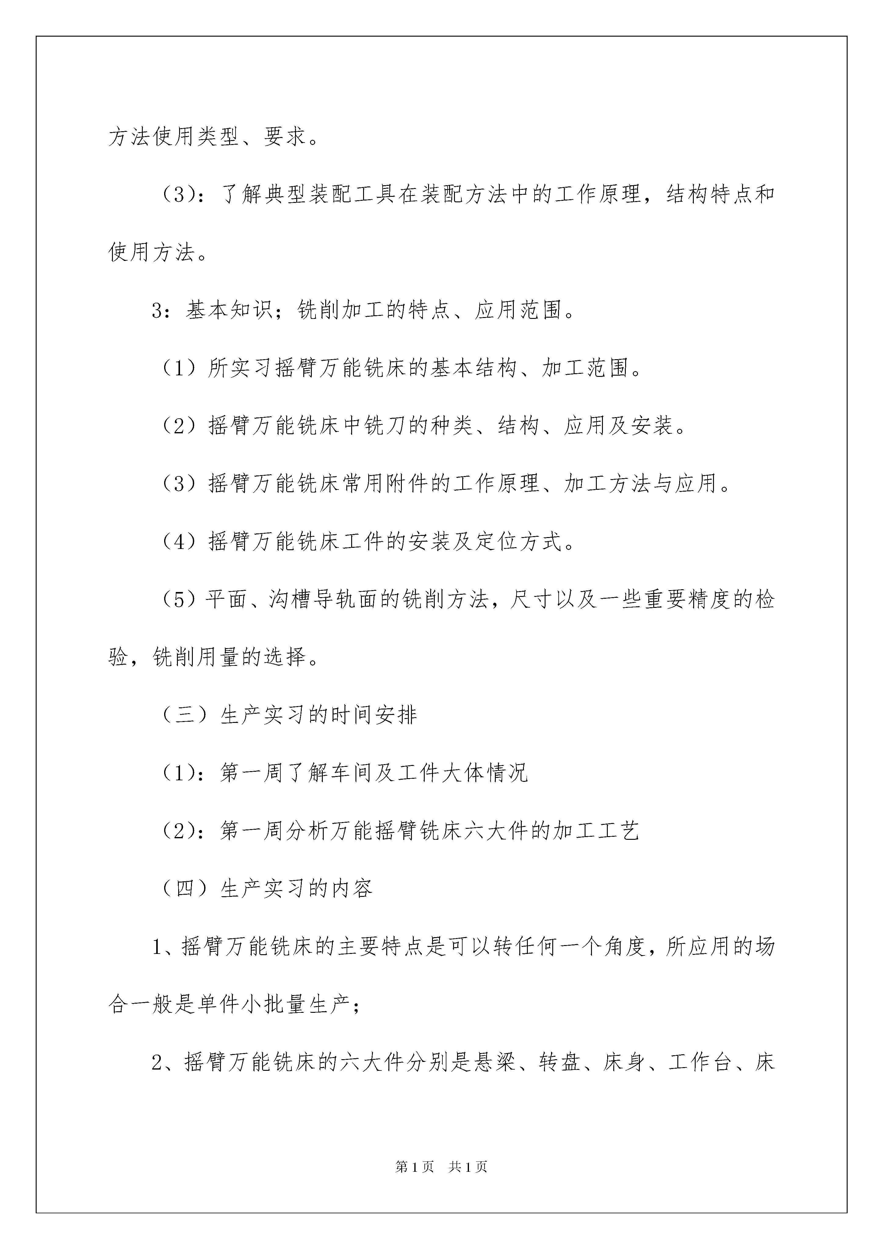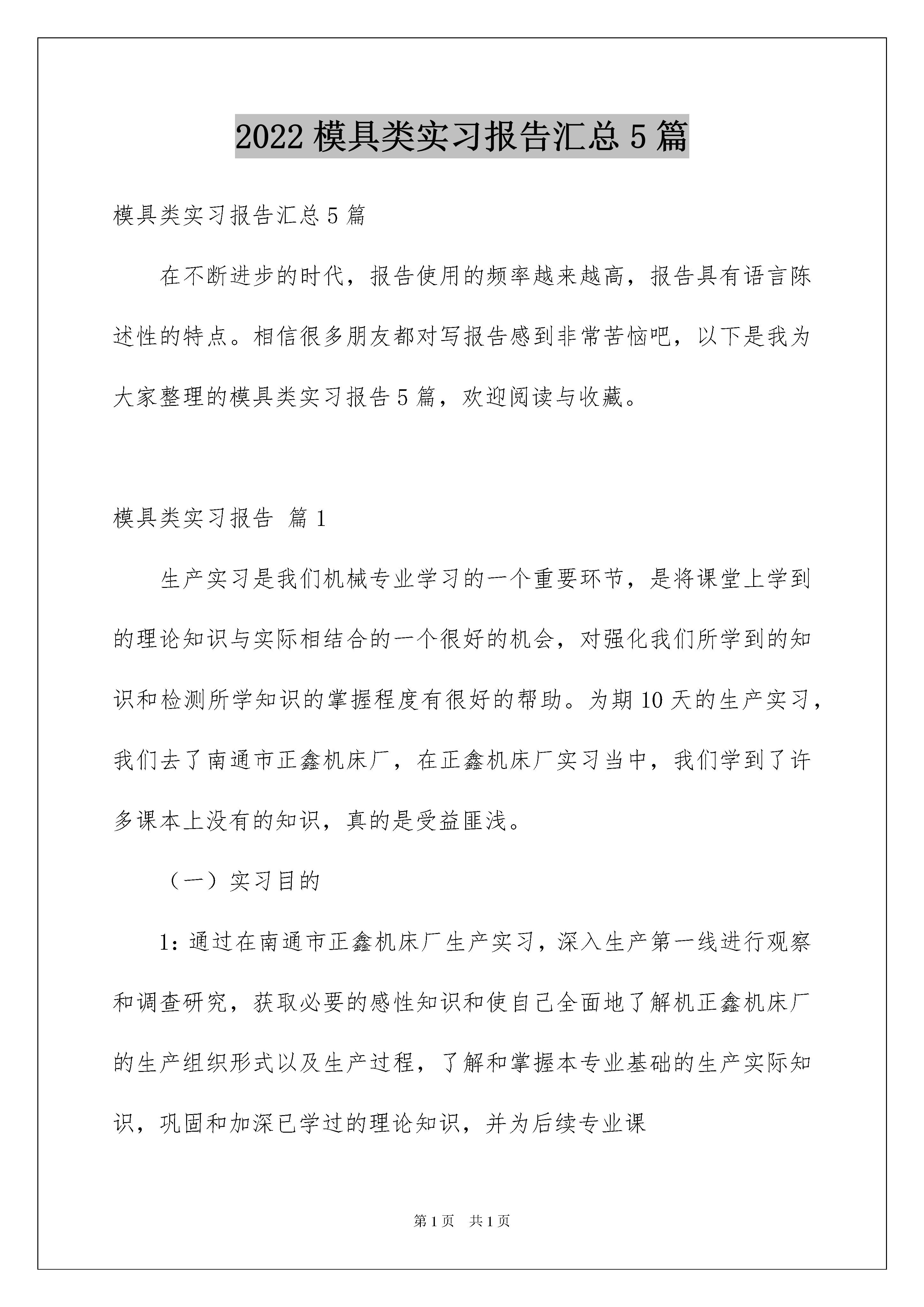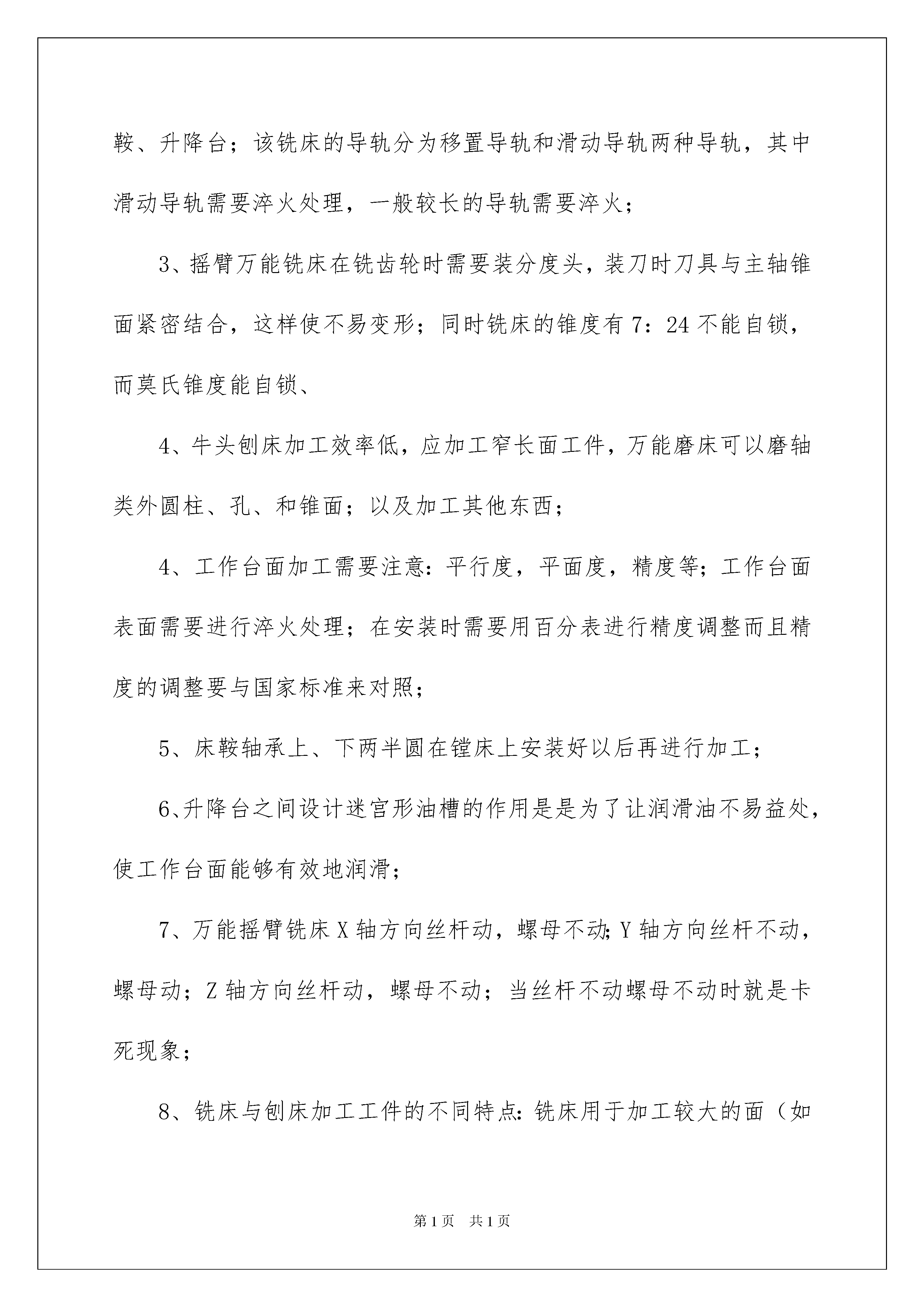 2022模具类实习报告汇总5篇模具类实习报告汇总5篇在不断进步的时代,报告使用的频率越来越高,报告具有语言陈述性的特点。相信很多朋友都对写报告感到非常苦恼吧,以下是我为大家整理的模具类实习报告5篇,欢迎阅读与收藏。模具类实习报告篇1生产实习是我们机械专业学习的一个重要环节,是将课堂上学到的理论知识与实际相结合的一个很好的机会,对强化我们所学到的知识和检测所学知识的掌握程度有很好的帮助。为期10天的生产实习,我们去了南通市正鑫机床厂,在正鑫机床厂实习当中,我们学到了许多课本上没有的知识,真的是受益匪浅。(一)实习目的1:通过在南通市正鑫机床厂生产实习,深入生产第一线进行观察和调查研究,获取必要的感性知识和使自己全面地了解机正鑫机床厂的生产组织形式以及生产过程,了解和掌握本专业基础的生产实际知识,巩固和加深已学过的理论知识,并为后续专业课的教学,课程设计,>毕业设计打下坚实的基础。2:在实习期间,通过对典型零件机械加工工艺的分析,以及零件加工过程中所用的机床,夹具、量具等工艺装备,把理论知识和实践相结合起来,让我们的考察,分析和解决问题的工作能力得到有效的提高。3:通过实习,广泛接触工人和听工人技术人员的专题报告,学习他们的好的增产经验,技术革新和成果,实践中的经验,学习他们在机械行中的无私贡献精神。4:通过参观南通市正鑫机床厂,掌握一台机床从毛坯到产品的整个生产过程,组织管理,设备选择和车间布置等方面的知识,扩大知识面,开阔了视野。5:通过记实习日记,写实习报告,锻炼与培养我们的观察,分析问题以及搜集和整理技术资料等方面的能力。(二)生产实习的要求为了达到上述实习目的,生产实习的内容和要求有:1:机械零件的加工根据实习工厂的产品,选定几种典型零件作为实习对象,通过对典型零件机械加工工艺的学习,掌握各类机器零件加工工艺的特点,了解工艺在工厂中所用的机床,刀具,夹具的工作原理和机构以及定位方式,在此基础上指定其中几个典型的零件进行重点的分析研究,要求如下:(1):阅读和查阅典型零件的零件图及其加工图,了解该零件在机床中的功用及工作条件,零件的结构特点及要求,分析此零件的加工工序、工艺。(2):大致了解毛坯的制造工艺过程,找出铸(锻)件、型材的分型(模)面。(3):深入了解零件的制造工艺过程以及零件的制造前所需要的哪些处理,找出现场加工工艺情况;(4):对主要零件加工工序、工艺做进一步的分析,并做好工序卡片、工艺卡片。2:装配工艺(1):了解机械的装配组织形式和装配工艺方法和装配工艺所需要注意的精度、平行度、垂直度的要求。(2):了解个中装配方法中的优、缺点,如何避免缺点;及装配方法使用类型、要求。(3):了解典型装配工具在装配方法中的工作原理,结构特点和使用方法。3:基本知识;铣削加工的特点、应用范围。(1)所实习摇臂万能铣床的基本结构、加工范围。(2)摇臂万能铣床中铣刀的种类、结构、应用及安装。(3)摇臂万能铣床常用附件的工作原理、加工方法与应用。(4)摇臂万能铣床工件的安装及定位方式。(5)平面、沟槽导轨面的铣削方法,尺寸以及一些重要精度的检验,铣削用量的选择。(三)生产实习的时间安排(1):第一周了解车间及工件大体情况(2):第一周分析万能摇臂铣床六大件的加工工艺(四)生产实习的内容1、摇臂万能铣床的主要特点是可以转任何一个角度,所应用的场合一般是单件小批量生产;2、摇臂万能铣床的六大件分别是悬梁、转盘、床身、工作台、床鞍、升降台;该铣床的导轨分为移置导轨和滑动导轨两种导轨,其中滑动导轨需要淬火处理,一般较长的导轨需要淬火;3、摇臂万能铣床在铣齿轮时需要装分度头,装刀时刀具与主轴锥面紧密结合,这样使不易变形;同时铣床的锥度有7:24不能自锁,而莫氏锥度能自锁、4、牛头刨床加工效率低,应加工窄长面工件,万能磨床可以磨轴类外圆柱、孔、和锥面;以及加工其他东西;4、工作台面加工需要注意:平行度,平面度,精度等;工作台面表面需要进行淬火处理;在安装时需要用百分表进行精度调整而且精度的调整要与国家标准来对照;5、床鞍轴承上、下两半圆在镗床上安装好以后再进行加工;6、升降台之间设计迷宫形油槽的作用是是为了让润滑油不易益处,使工作台面能够有效地润滑;7、万能摇臂铣床X轴方向丝杆动,螺母不动;Y轴方向丝杆不动,螺母动;Z轴方向丝杆动,螺母不动;当丝杆不动螺母不动时就是卡死现象;8、铣床与刨床加工工件的不同特点:铣床用于加工较大的面(如底面),加工效率较高;而刨床加工T形槽和窄长面(如导轨面);9、粗磨与精磨得基准是统一的,定位时与百分表接触,如果机床本身精度有问题需要人工进行精度的调整;