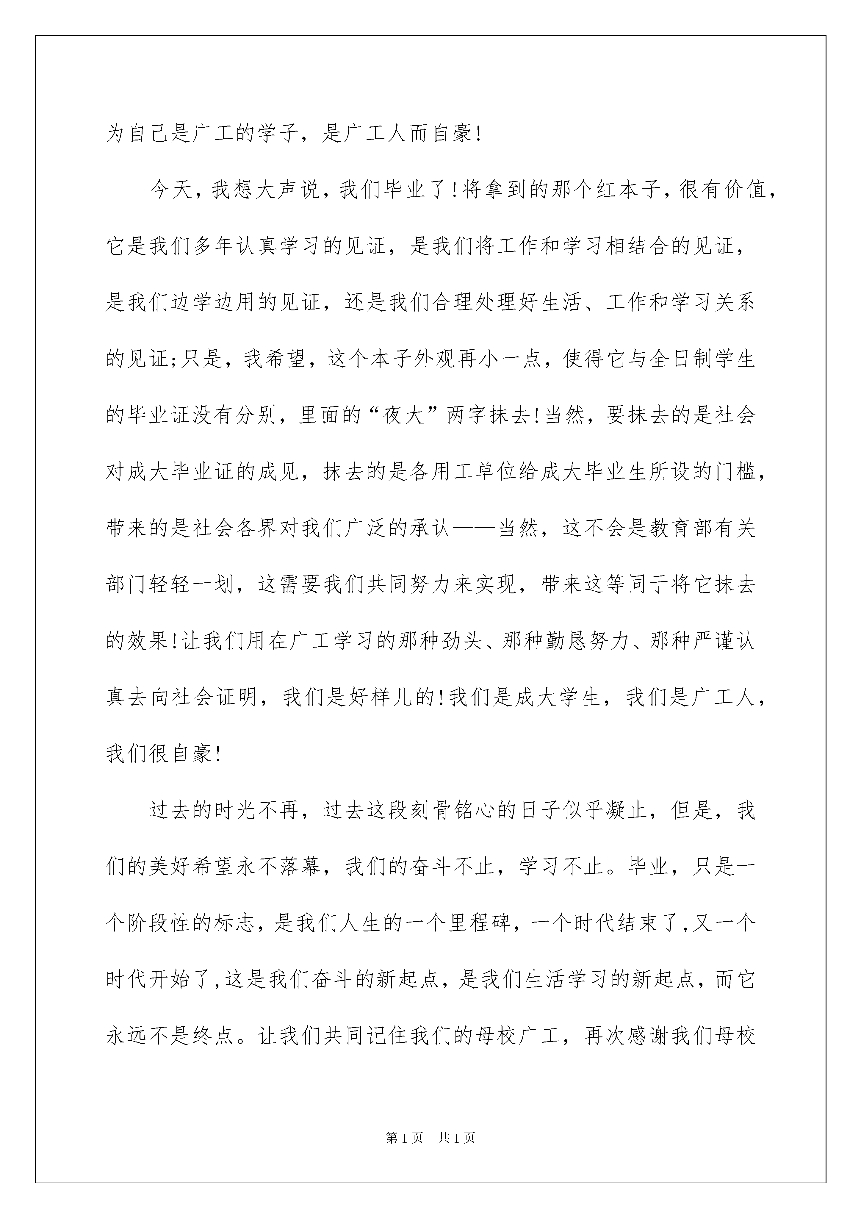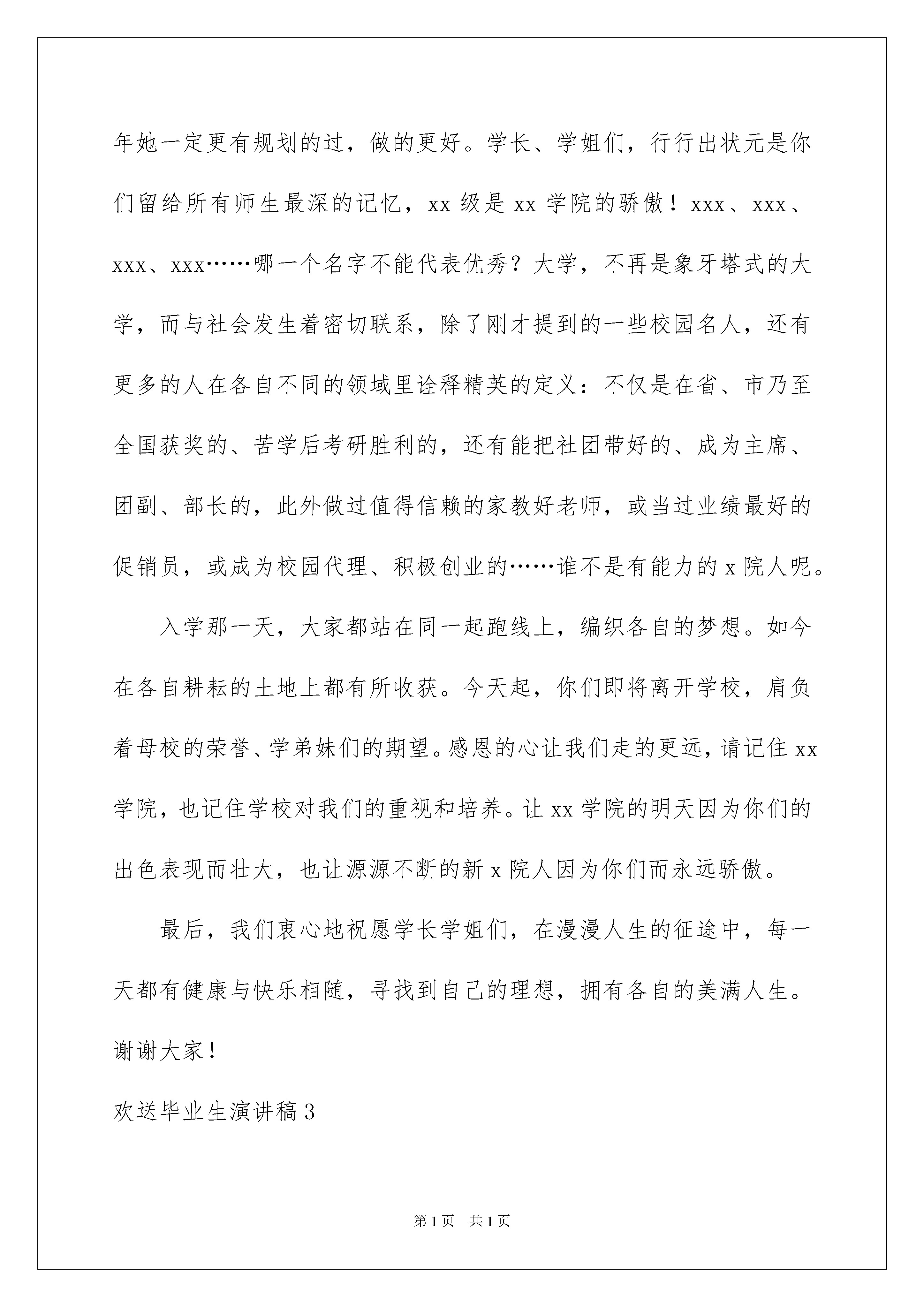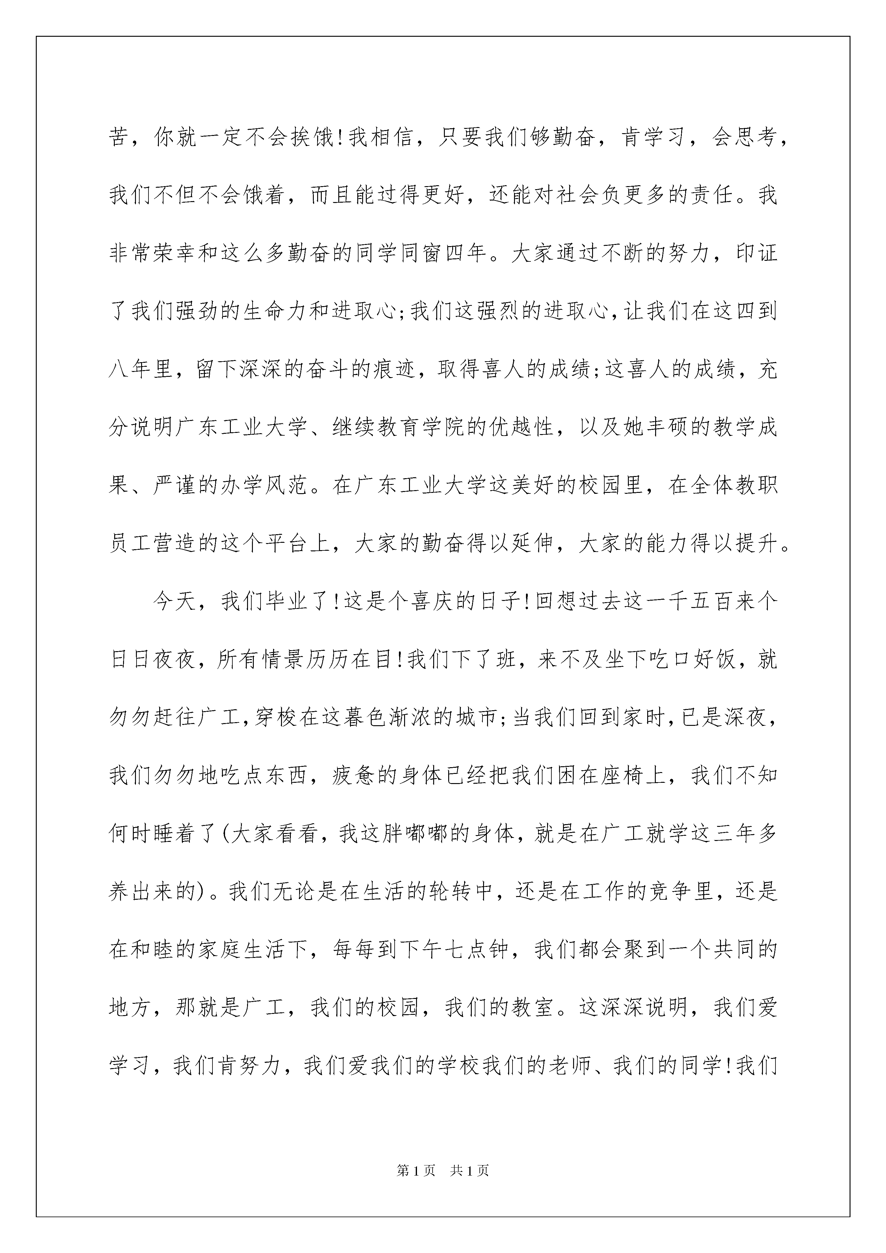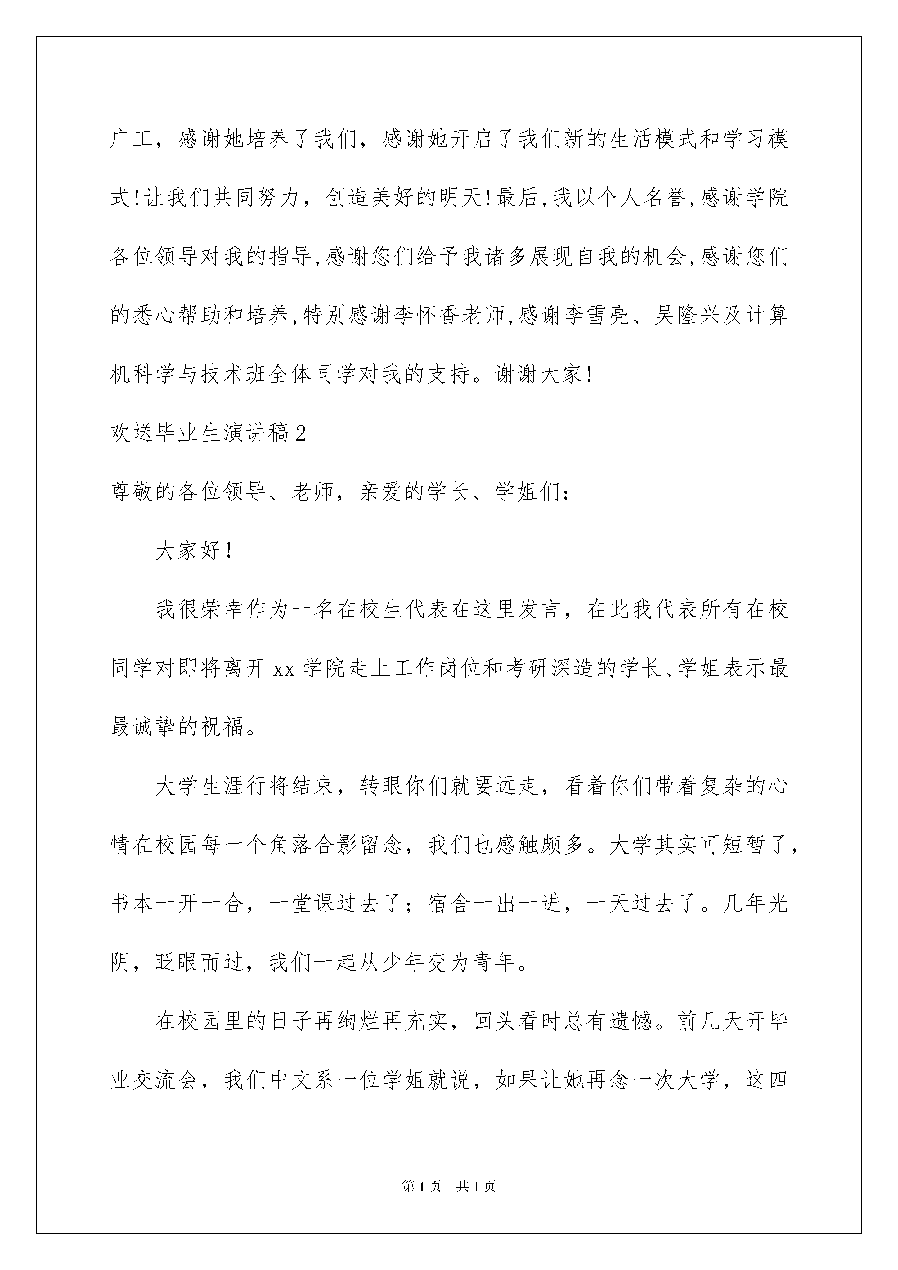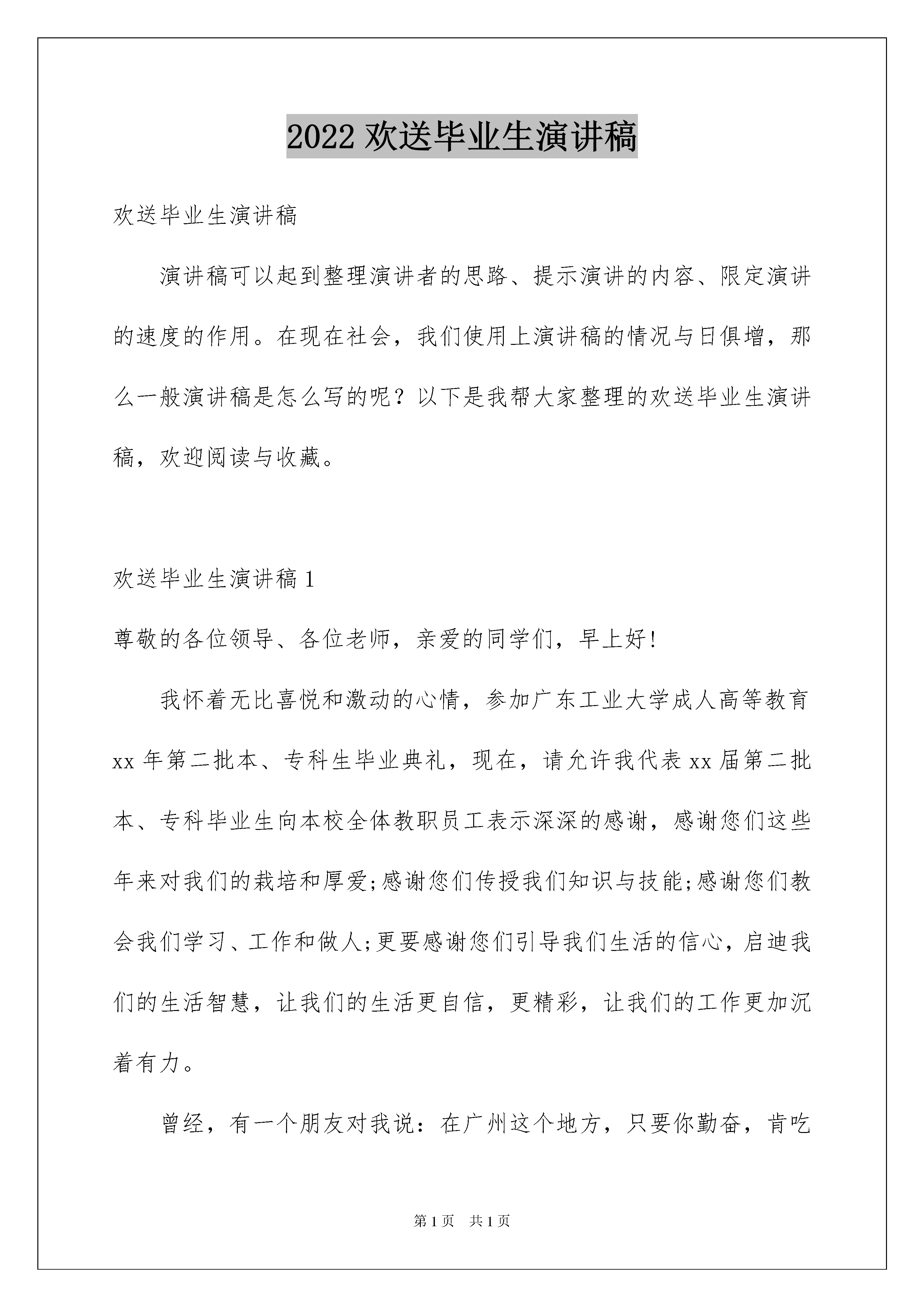 2022欢送毕业生演讲稿欢送毕业生演讲稿演讲稿可以起到整理演讲者的思路、提示演讲的内容、限定演讲的速度的作用。在现在社会,我们使用上演讲稿的情况与日俱增,那么一般演讲稿是怎么写的呢?以下是我帮大家整理的欢送毕业生演讲稿,欢迎阅读与收藏。欢送毕业生演讲稿1尊敬的各位领导、各位老师,亲爱的同学们,早上好!我怀着无比喜悦和激动的心情,参加广东工业大学成人高等教育xx年第二批本、专科生毕业典礼,现在,请允许我代表xx届第二批本、专科毕业生向本校全体教职员工表示深深的感谢,感谢您们这些年来对我们的栽培和厚爱;感谢您们传授我们知识与技能;感谢您们教会我们学习、工作和做人;更要感谢您们引导我们生活的信心,启迪我们的生活智慧,让我们的生活更自信,更精彩,让我们的工作更加沉着有力。曾经,有一个朋友对我说:在广州这个地方,只要你勤奋,肯吃苦,你就一定不会挨饿!我相信,只要我们够勤奋,肯学习,会思考,我们不但不会饿着,而且能过得更好,还能对社会负更多的责任。我非常荣幸和这么多勤奋的同学同窗四年。大家通过不断的努力,印证了我们强劲的生命力和进取心;我们这强烈的进取心,让我们在这四到八年里,留下深深的奋斗的痕迹,取得喜人的成绩;这喜人的成绩,充分说明广东工业大学、继续教育学院的优越性,以及她丰硕的教学成果、严谨的办学风范。在广东工业大学这美好的校园里,在全体教职员工营造的这个平台上,大家的勤奋得以延伸,大家的能力得以提升。今天,我们毕业了!这是个喜庆的日子!回想过去这一千五百来个日日夜夜,所有情景历历在目!我们下了班,来不及坐下吃口好饭,就勿勿赶往广工,穿梭在这暮色渐浓的城市;当我们回到家时,已是深夜,我们勿勿地吃点东西,疲惫的身体已经把我们困在座椅上,我们不知何时睡着了(大家看看,我这胖嘟嘟的身体,就是在广工就学这三年多养出来的)。我们无论是在生活的轮转中,还是在工作的竞争里,还是在和睦的家庭生活下,每每到下午七点钟,我们都会聚到一个共同的地方,那就是广工,我们的校园,我们的教室。这深深说明,我们爱学习,我们肯努力,我们爱我们的学校我们的老师、我们的同学!我们为自己是广工的学子,是广工人而自豪!今天,我想大声说,我们毕业了!将拿到的那个红本子,很有价值,它是我们多年认真学习的见证,是我们将工作和学习相结合的见证,是我们边学边用的见证,还是我们合理处理好生活、工作和学习关系的见证;只是,我希望,这个本子外观再小一点,使得它与全日制学生的毕业证没有分别,里面的“夜大”两字抹去!当然,要抹去的是社会对成大毕业证的成见,抹去的是各用工单位给成大毕业生所设的门槛,带来的是社会各界对我们广泛的承认——当然,这不会是教育部有关部门轻轻一划,这需要我们共同努力来实现,带来这等同于将它抹去的效果!让我们用在广工学习的那种劲头、那种勤恳努力、那种严谨认真去向社会证明,我们是好样儿的!我们是成大学生,我们是广工人,我们很自豪!过去的时光不再,过去这段刻骨铭心的日子似乎凝止,但是,我们的美好希望永不落幕,我们的奋斗不止,学习不止。毕业,只是一个阶段性的标志,是我们人生的一个里程碑,一个时代结束了,又一个时代开始了,这是我们奋斗的新起点,是我们生活学习的新起点,而它永远不是终点。让我们共同记住我们的母校广工,再次感谢我们母校广工,感谢她培养了我们,感谢她开启了我们新的生活模式和学习模式!让我们共同努力,创造美好的明天!最后,我以个人名誉,感谢学院各位领导对我的指导,感谢您们给予我诸多展现自我的机会,感谢您们的悉心帮助和培养,特别感谢李怀香老师,感谢李雪亮、吴隆兴及计算机科学与技术班全体同学对我的支持。谢谢大家!欢送毕业生演讲稿2尊敬的各位领导、老师,亲爱的学长、学姐们:大家好!我很荣幸作为一名在校生代表在这里发言,在此我代表所有在校同学对即将离开xx学院走上工作岗位和考研深造的学长、学姐表示最最诚挚的祝福。大学生涯行将结束,转眼你们就要远走,看着你们带着复杂的心情在校园每一个角落合影留念,我们也感触颇多。大学其实可短暂了,书本一开一合,一堂课过去了;宿舍一出一进,一天过去了。几年光阴,眨眼而过,我们一起从少年变为青年。在校园里的日子再绚烂再充实,回头看时总有遗憾。前几天开毕业交流会,我们中文系一位学姐就说,如果让她再念一次大学,这四年她一定更有规划的过,做的更好。学长、学姐们,行行出状元是你们留给所有师生最深的记忆,xx级是xx学院的骄傲!xxx、xxx、xxx、xxx……哪一个名字不能代表优秀?大学,不再是象牙塔式的大学,而与社会发生着密切联系,除了刚才提到的一些校园名人,还有更多的人在各自不同的领域里诠释精英的定义: