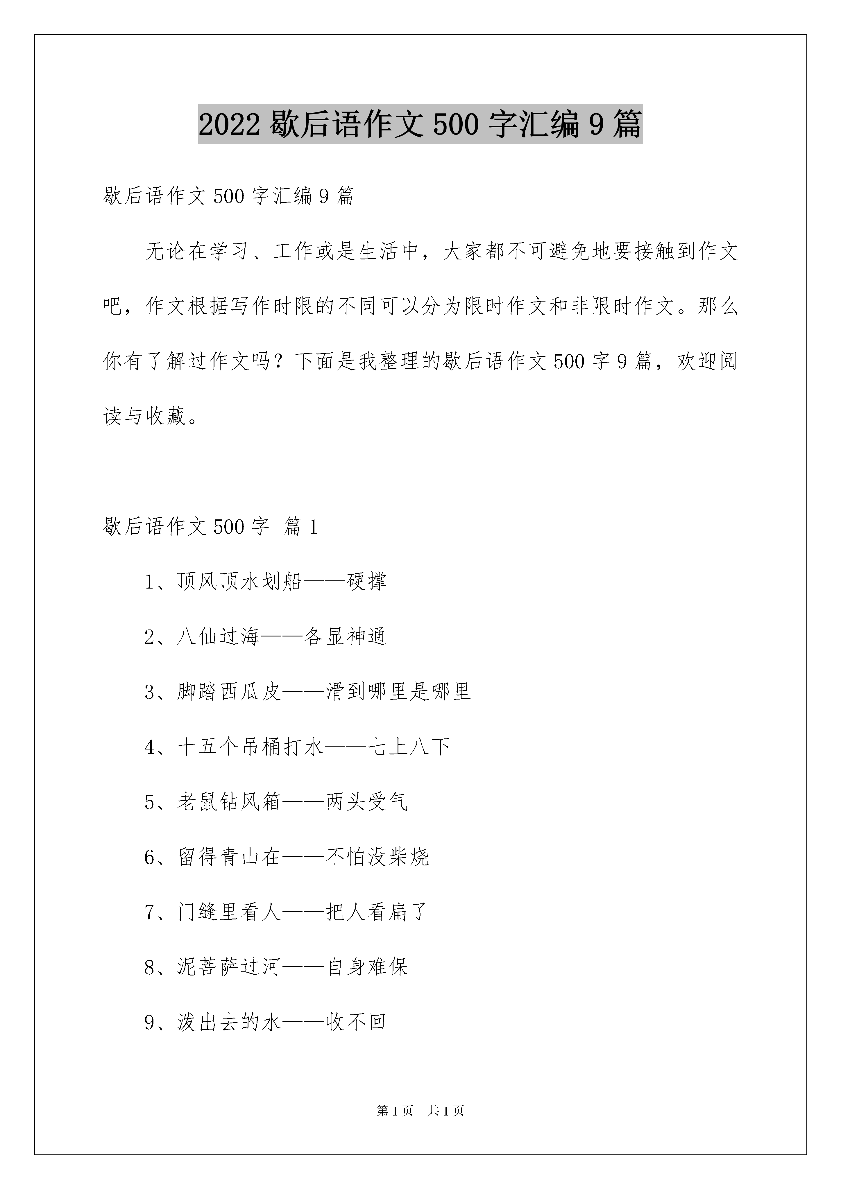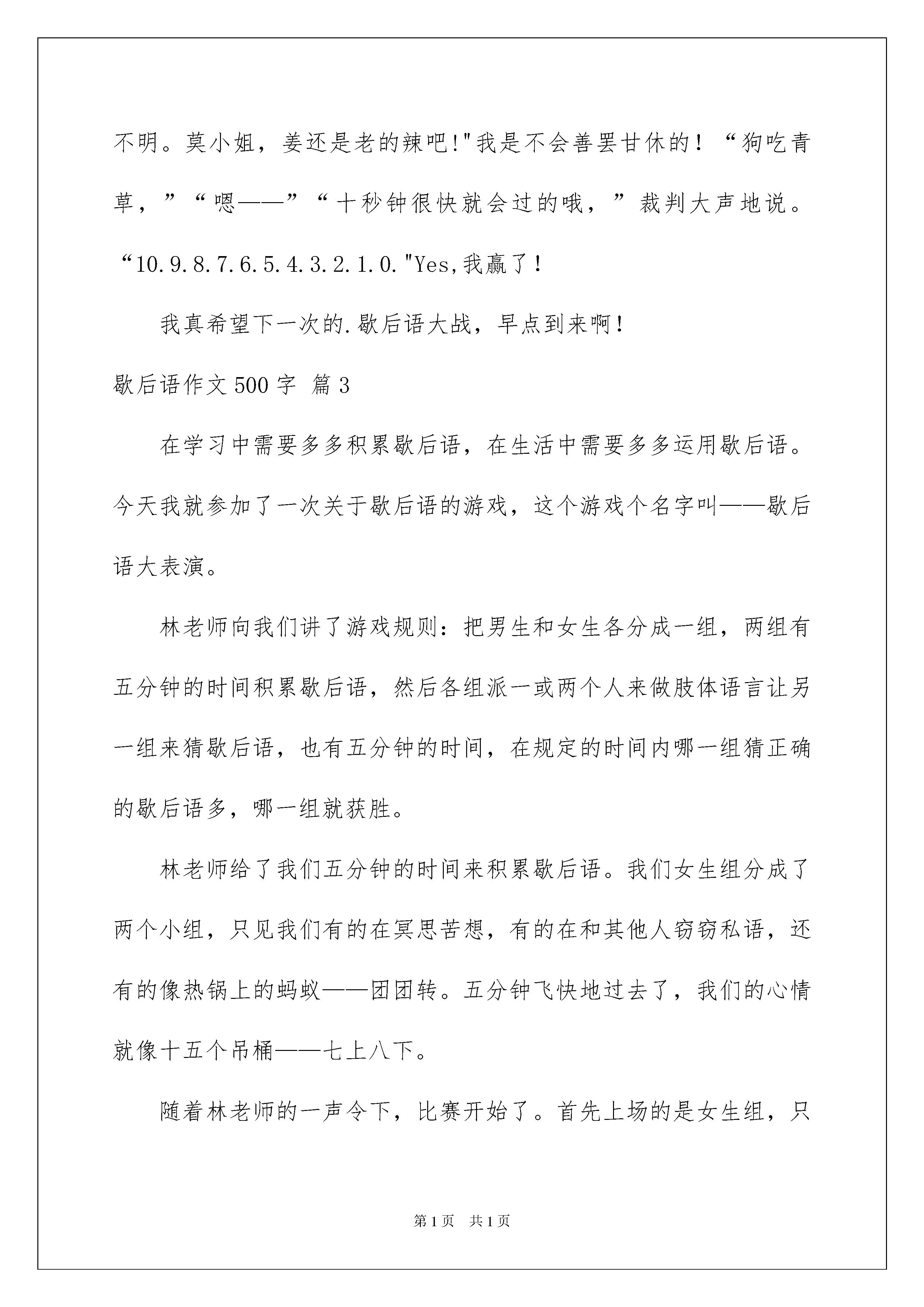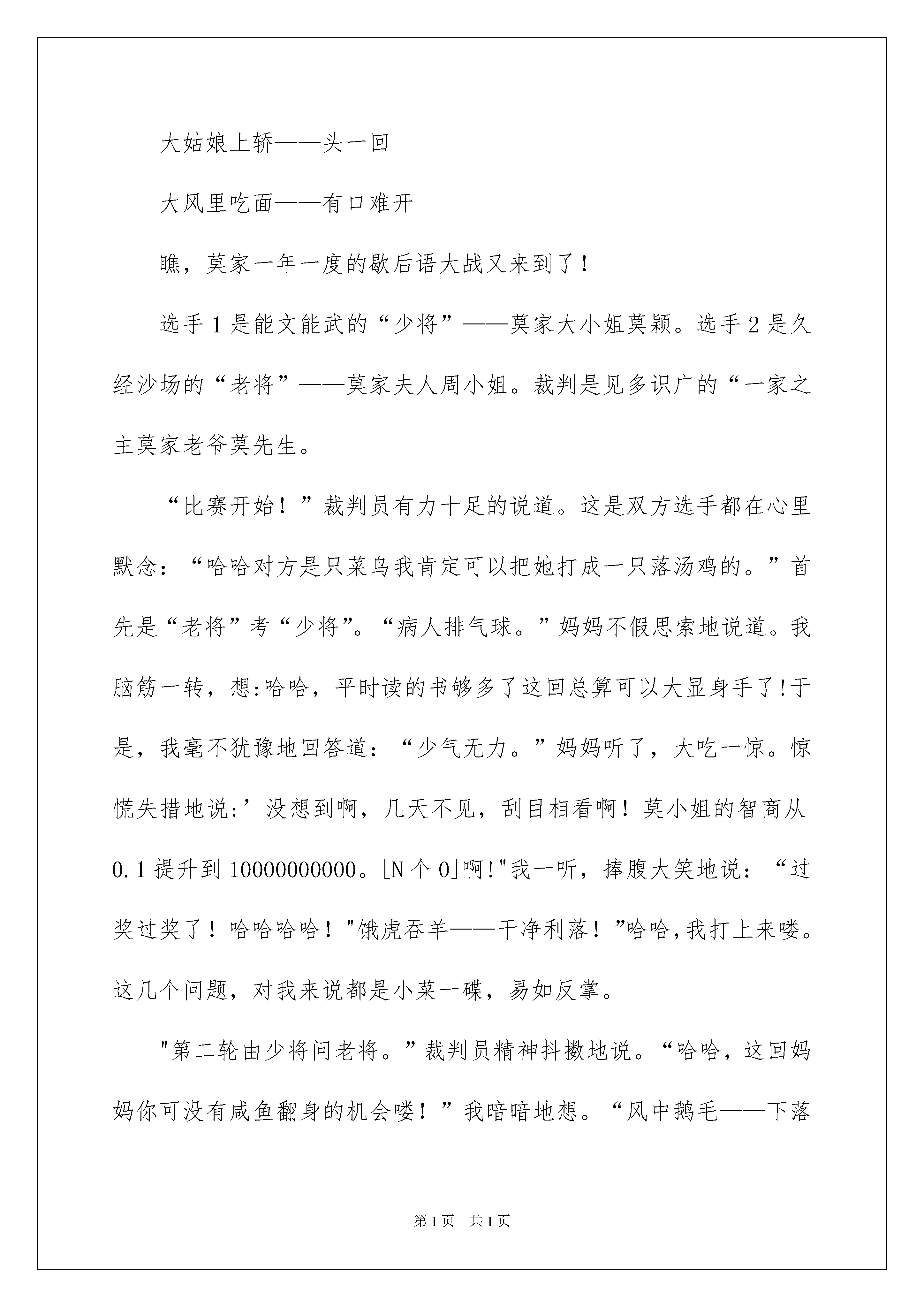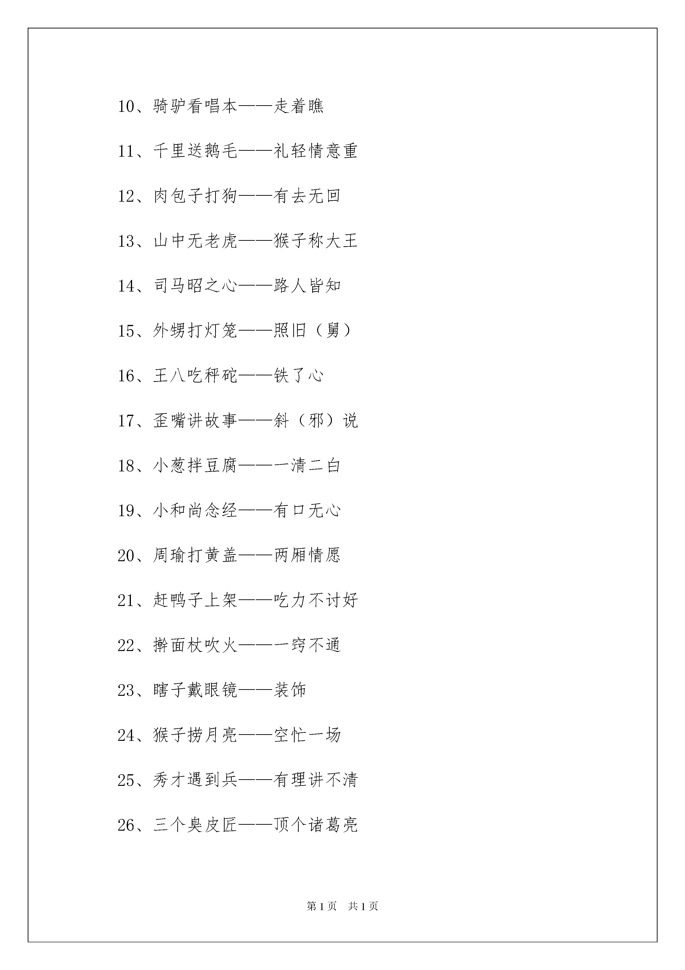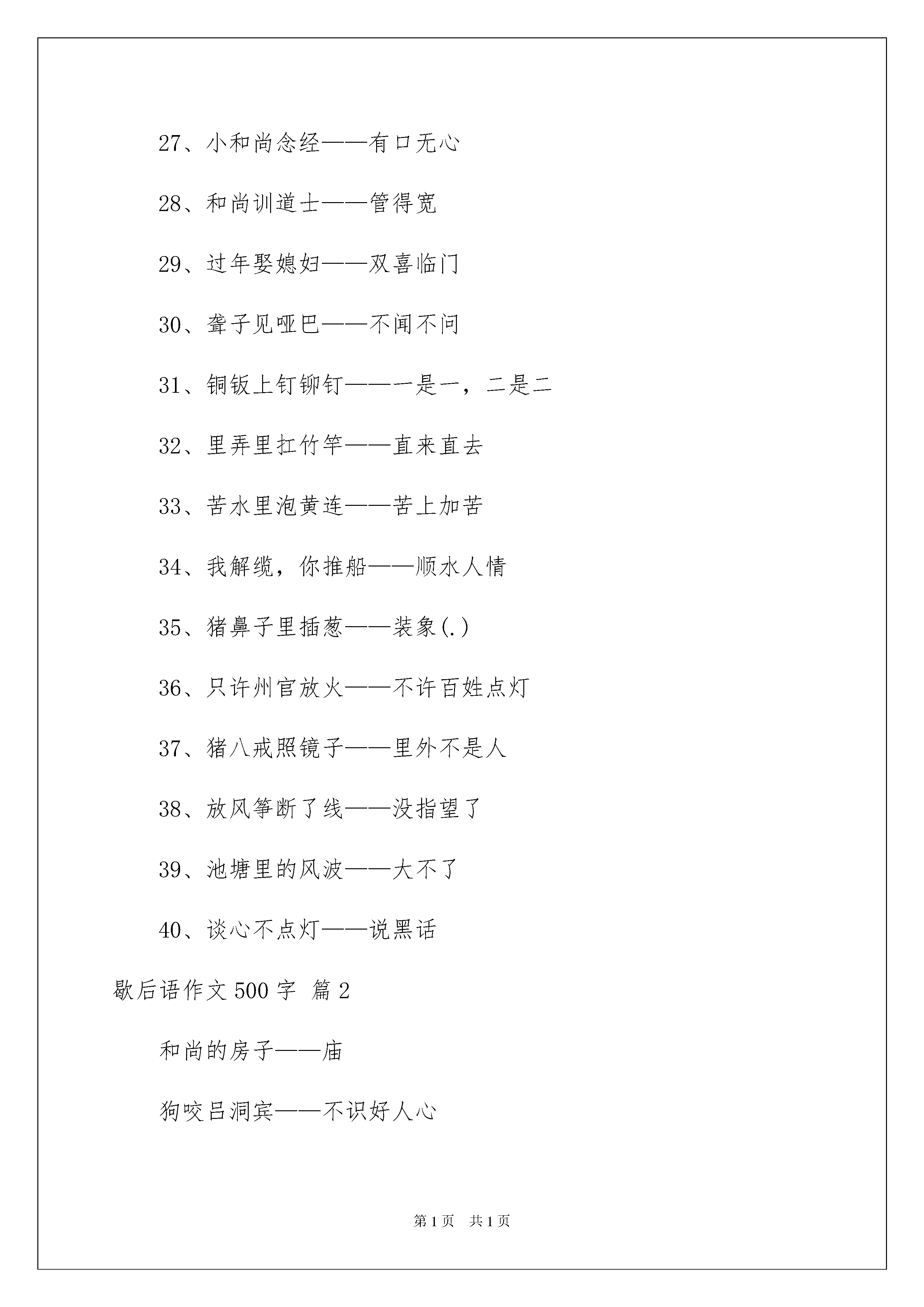 2022歇后语作文500字汇编9篇歇后语作文500字汇编9篇无论在学习、工作或是生活中,大家都不可避免地要接触到作文吧,作文根据写作时限的不同可以分为限时作文和非限时作文。那么你有了解过作文吗?下面是我整理的歇后语作文500字9篇,欢迎阅读与收藏。歇后语作文500字篇11、顶风顶水划船——硬撑2、八仙过海——各显神通3、脚踏西瓜皮——滑到哪里是哪里4、十五个吊桶打水——七上八下5、老鼠钻风箱——两头受气6、留得青山在——不怕没柴烧7、门缝里看人——把人看扁了8、泥菩萨过河——自身难保9、泼出去的水——收不回10、骑驴看唱本——走着瞧11、千里送鹅毛——礼轻情意重12、肉包子打狗——有去无回13、山中无老虎——猴子称大王14、司马昭之心——路人皆知15、外甥打灯笼——照旧(舅)16、王八吃秤砣——铁了心17、歪嘴讲故事——斜(邪)说18、小葱拌豆腐——一清二白19、小和尚念经——有口无心20、周瑜打黄盖——两厢情愿21、赶鸭子上架——吃力不讨好22、擀面杖吹火——一窍不通23、瞎子戴眼镜——装饰24、猴子捞月亮——空忙一场25、秀才遇到兵——有理讲不清26、三个臭皮匠——顶个诸葛亮27、小和尚念经——有口无心28、和尚训道士——管得宽29、过年娶媳妇——双喜临门30、聋子见哑巴——不闻不问31、铜钣上钉铆钉——一是一,二是二32、里弄里扛竹竿——直来直去33、苦水里泡黄连——苦上加苦34、我解缆,你推船——顺水人情35、猪鼻子里插葱——装象(.)36、只许州官放火——不许百姓点灯37、猪八戒照镜子——里外不是人38、放风筝断了线——没指望了39、池塘里的风波——大不了40、谈心不点灯——说黑话歇后语作文500字篇2和尚的房子——庙狗咬吕洞宾——不识好人心大姑娘上轿——头一回大风里吃面——有口难开瞧,莫家一年一度的歇后语大战又来到了!选手1是能文能武的“少将”——莫家大小姐莫颖。选手2是久经沙场的“老将”——莫家夫人周小姐。裁判是见多识广的“一家之主莫家老爷莫先生。“比赛开始!”裁判员有力十足的说道。这是双方选手都在心里默念:“哈哈对方是只菜鸟我肯定可以把她打成一只落汤鸡的。”首先是“老将”考“少将”。“病人排气球。”妈妈不假思索地说道。我脑筋一转,想:哈哈,平时读的书够多了这回总算可以大显身手了!于是,我毫不犹豫地回答道:“少气无力。”妈妈听了,大吃一惊。惊慌失措地说:’没想到啊,几天不见,刮目相看啊!莫小姐的智商从0.1提升到10000000000。[N个0]啊!"我一听,捧腹大笑地说:“过奖过奖了!哈哈哈哈!"饿虎吞羊——干净利落!”哈哈,我打上来喽。这几个问题,对我来说都是小菜一碟,易如反掌。"第二轮由少将问老将。”裁判员精神抖擞地说。“哈哈,这回妈妈你可没有咸鱼翻身的机会喽!”我暗暗地想。“风中鹅毛——下落不明。莫小姐,姜还是老的辣吧!"我是不会善罢甘休的!“狗吃青草,”“嗯——”“十秒钟很快就会过的哦,”裁判大声地说。“10.9.8.7.6.5.4.3.2.1.0."Yes,我赢了!我真希望下一次的.歇后语大战,早点到来啊!歇后语作文500字篇3在学习中需要多多积累歇后语,在生活中需要多多运用歇后语。今天我就参加了一次关于歇后语的游戏,这个游戏个名字叫——歇后语大表演。林老师向我们讲了游戏规则:把男生和女生各分成一组,两组有五分钟的时间积累歇后语,然后各组派一或两个人来做肢体语言让另一组来猜歇后语,也有五分钟的时间,在规定的时间内哪一组猜正确的歇后语多,哪一组就获胜。林老师给了我们五分钟的时间来积累歇后语。我们女生组分成了两个小组,只见我们有的在冥思苦想,有的在和其他人窃窃私语,还有的像热锅上的蚂蚁——团团转。五分钟飞快地过去了,我们的心情就像十五个吊桶——七上八下。随着林老师的一声令下,比赛开始了。首先上场的是女生组,只见缪春莹信心十足地上了台。缪春莹挥动着双手,然后扑倒桌子上,最后倒在了地上。接着就是男生们一阵又一阵幸灾乐祸的笑声,缪春莹脸红了起来。最后男生只好说跳过;缪春莹又用手把鼻子推了上去,让男生们猜,没有想到的是,男生脱口而出“猪八戒照镜子——里外不是人”,猜对了。时间一分一秒地过去了,时间到了,男生一共猜出了六个歇后语,我们女生都为自己组捏了把汗。轮到男生组了,只见郭邵博撒了一把东西在周博伦的头上,我们女生都丈二和尚——摸不着头脑。后来,我心急如焚,脑子里一片空白。最后,男生说答案是“到火神庙求雨——找错了门”。我们顿时心灰意冷,情绪一落千丈。时间飞快地过去了,游戏结束了。我们一共猜中了四个歇后语。男生组获胜了,女生组输了,我们都叹了一口气。这一次的