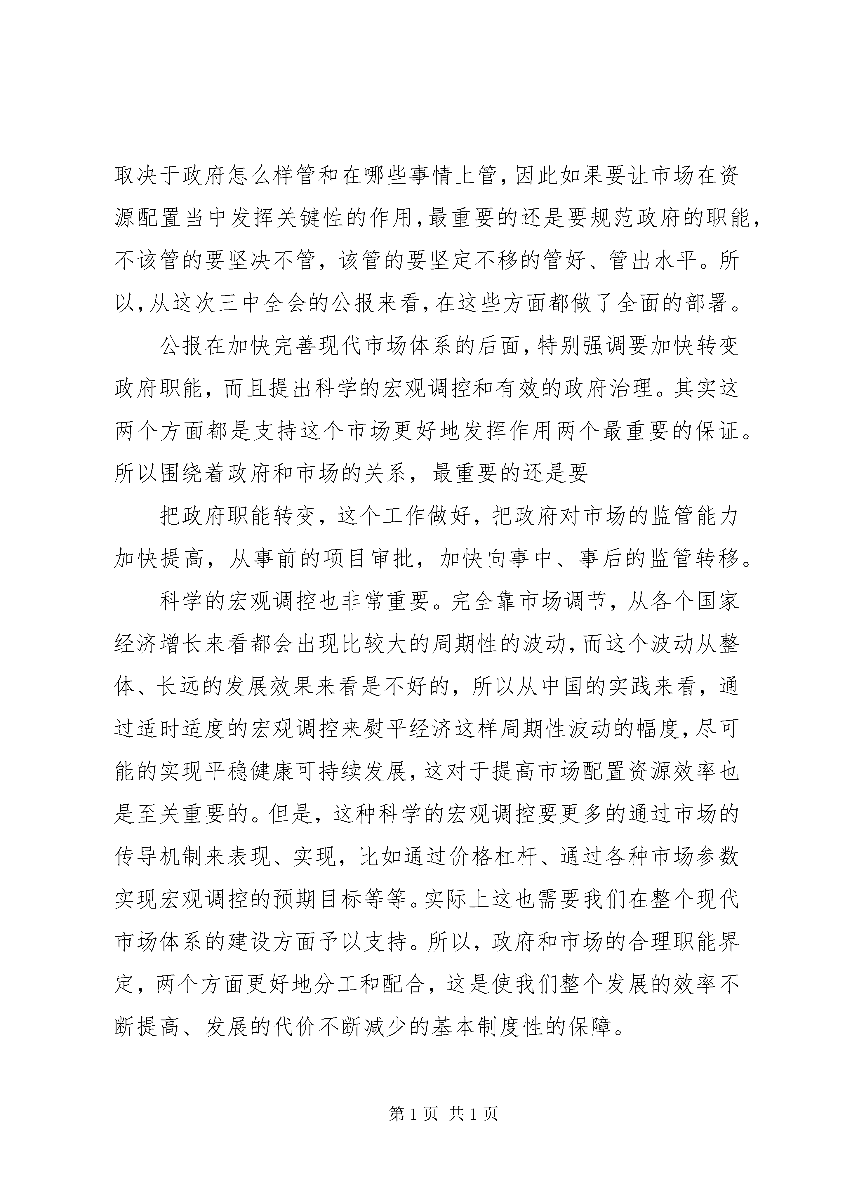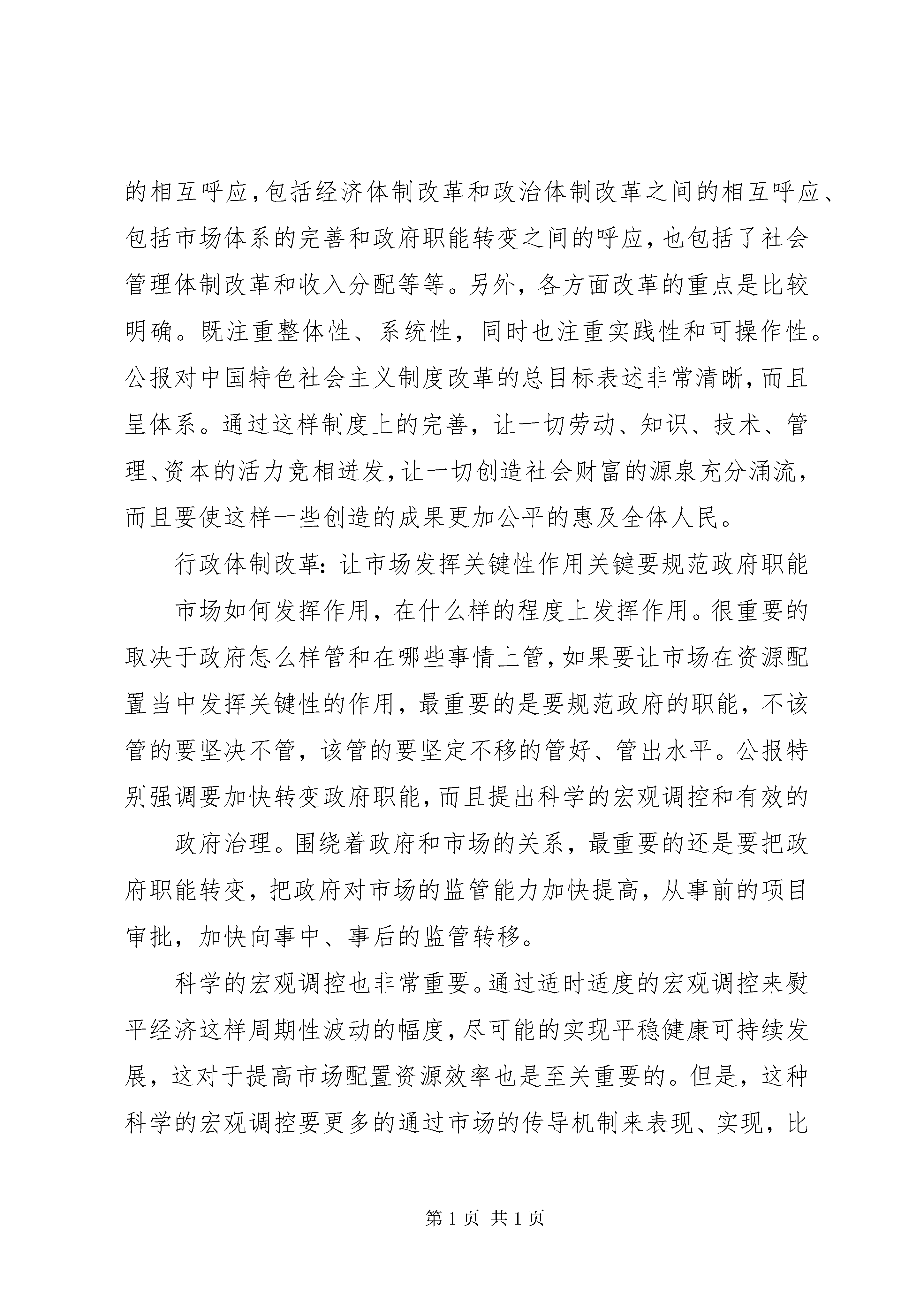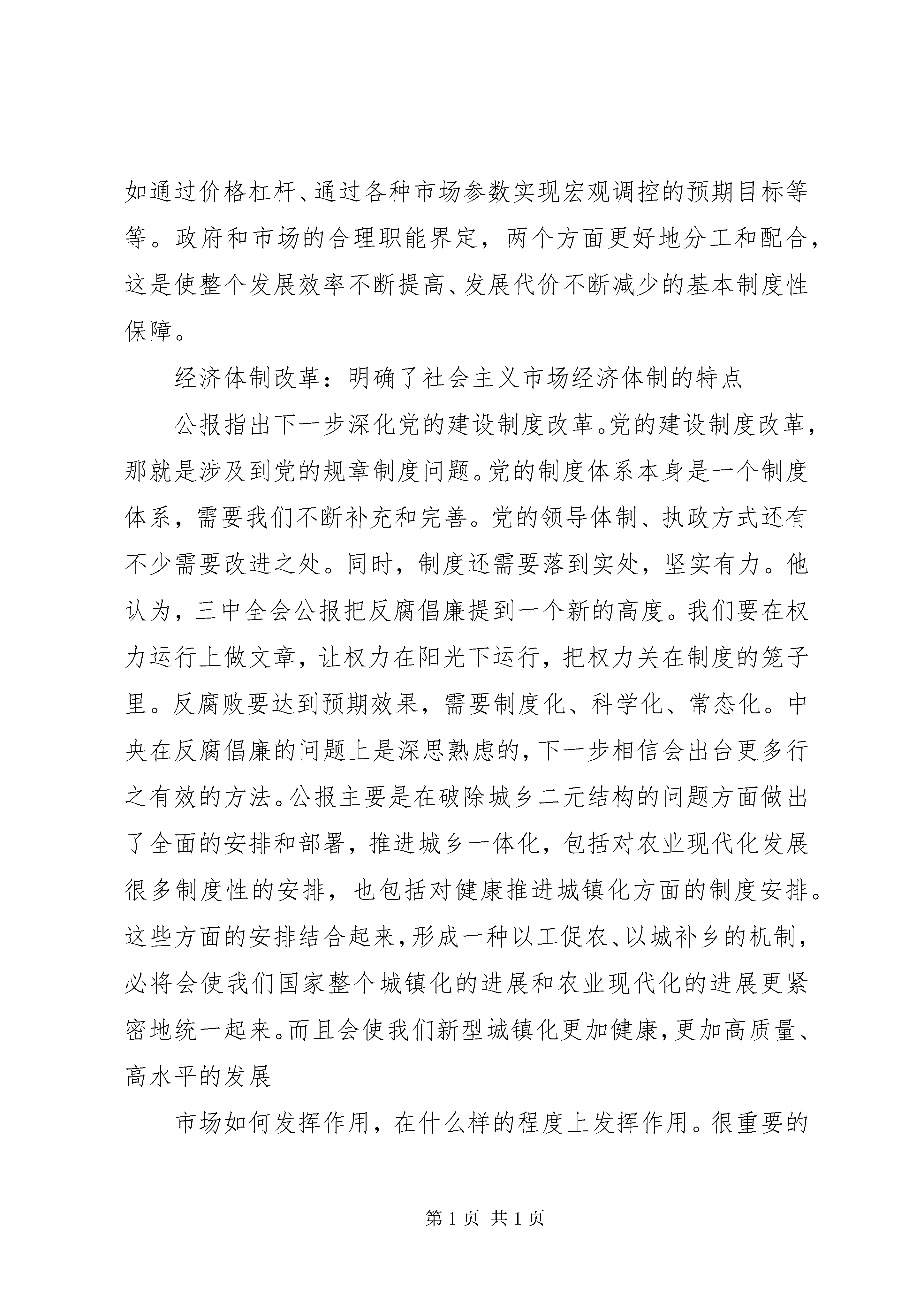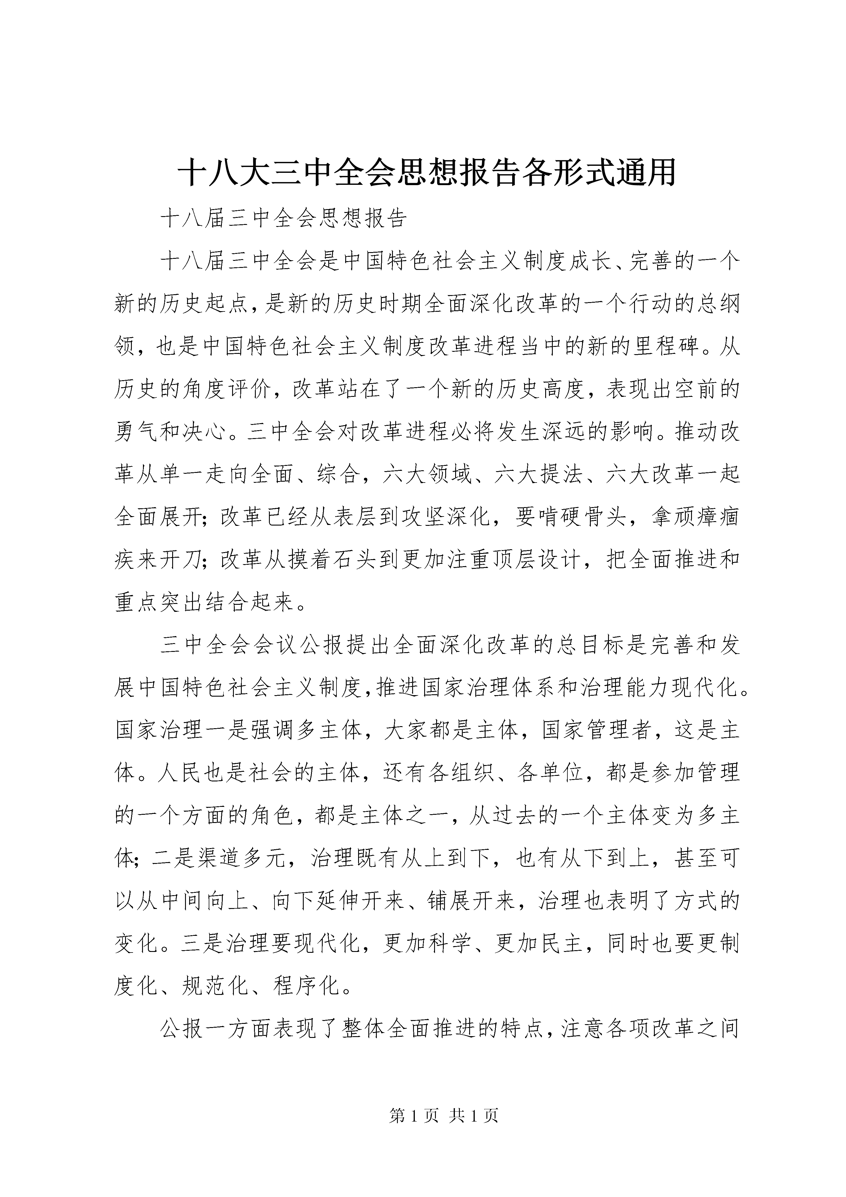 十八大三中全会思想报告各形式通用十八届三中全会思想报告十八届三中全会是中国特色社会主义制度成长、完善的一个新的历史起点,是新的历史时期全面深化改革的一个行动的总纲领,也是中国特色社会主义制度改革进程当中的新的里程碑。从历史的角度评价,改革站在了一个新的历史高度,表现出空前的勇气和决心。三中全会对改革进程必将发生深远的影响。推动改革从单一走向全面、综合,六大领域、六大提法、六大改革一起全面展开;改革已经从表层到攻坚深化,要啃硬骨头,拿顽瘴痼疾来开刀;改革从摸着石头到更加注重顶层设计,把全面推进和重点突出结合起来。三中全会会议公报提出全面深化改革的总目标是完善和发展中国特色社会主义制度,推进国家治理体系和治理能力现代化。国家治理一是强调多主体,大家都是主体,国家管理者,这是主体。人民也是社会的主体,还有各组织、各单位,都是参加管理的一个方面的角色,都是主体之一,从过去的一个主体变为多主体;二是渠道多元,治理既有从上到下,也有从下到上,甚至可以从中间向上、向下延伸开来、铺展开来,治理也表明了方式的变化。三是治理要现代化,更加科学、更加民主,同时也要更制度化、规范化、程序化。公报一方面表现了整体全面推进的特点,注意各项改革之间的相互呼应,包括经济体制改革和政治体制改革之间的相互呼应、包括市场体系的完善和政府职能转变之间的呼应,也包括了社会管理体制改革和收入分配等等。另外,各方面改革的重点是比较明确。既注重整体性、系统性,同时也注重实践性和可操作性。公报对中国特色社会主义制度改革的总目标表述非常清晰,而且呈体系。通过这样制度上的完善,让一切劳动、知识、技术、管理、资本的活力竞相迸发,让一切创造社会财富的源泉充分涌流,而且要使这样一些创造的成果更加公平的惠及全体人民。行政体制改革:让市场发挥关键性作用关键要规范政府职能市场如何发挥作用,在什么样的程度上发挥作用。很重要的取决于政府怎么样管和在哪些事情上管,如果要让市场在资源配置当中发挥关键性的作用,最重要的是要规范政府的职能,不该管的要坚决不管,该管的要坚定不移的管好、管出水平。公报特别强调要加快转变政府职能,而且提出科学的宏观调控和有效的政府治理。围绕着政府和市场的关系,最重要的还是要把政府职能转变,把政府对市场的监管能力加快提高,从事前的项目审批,加快向事中、事后的监管转移。科学的宏观调控也非常重要。通过适时适度的宏观调控来熨平经济这样周期性波动的幅度,尽可能的实现平稳健康可持续发展,这对于提高市场配置资源效率也是至关重要的。但是,这种科学的宏观调控要更多的通过市场的传导机制来表现、实现,比如通过价格杠杆、通过各种市场参数实现宏观调控的预期目标等等。政府和市场的合理职能界定,两个方面更好地分工和配合,这是使整个发展效率不断提高、发展代价不断减少的基本制度性保障。经济体制改革:明确了社会主义市场经济体制的特点公报指出下一步深化党的建设制度改革。党的建设制度改革,那就是涉及到党的规章制度问题。党的制度体系本身是一个制度体系,需要我们不断补充和完善。党的领导体制、执政方式还有不少需要改进之处。同时,制度还需要落到实处,坚实有力。他认为,三中全会公报把反腐倡廉提到一个新的高度。我们要在权力运行上做文章,让权力在阳光下运行,把权力关在制度的笼子里。反腐败要达到预期效果,需要制度化、科学化、常态化。中央在反腐倡廉的问题上是深思熟虑的,下一步相信会出台更多行之有效的方法。公报主要是在破除城乡二元结构的问题方面做出了全面的安排和部署,推进城乡一体化,包括对农业现代化发展很多制度性的安排,也包括对健康推进城镇化方面的制度安排。这些方面的安排结合起来,形成一种以工促农、以城补乡的机制,必将会使我们国家整个城镇化的进展和农业现代化的进展更紧密地统一起来。而且会使我们新型城镇化更加健康,更加高质量、高水平的发展市场如何发挥作用,在什么样的程度上发挥作用。很重要的取决于政府怎么样管和在哪些事情上管,因此如果要让市场在资源配置当中发挥关键性的作用,最重要的还是要规范政府的职能,不该管的要坚决不管,该管的要坚定不移的管好、管出水平。所以,从这次三中全会的公报来看,在这些方面都做了全面的部署。公报在加快完善现代市场体系的后面,特别强调要加快转变政府职能,而且提出科学的宏观调控和有效的政府治理。其实这两个方面都是支持这个市场更好地发挥作用两个最重要的保证。所以围绕着政府和市场的关系,最重要的还是要把政府职能转变,这个工作做好,把政府对市场的监管能力加快提高,从事前的项目审批,加快向事中、事后的监管转移。科学的宏观调控也非常重要。完全靠市场调节,从各个国家经济增长来看都会出现比较大的周期性的波动,而这个波动从整体、长远的发展效果来看是不好的,所以从中国的实践来看,通过适时适度的宏观调控来熨平经济